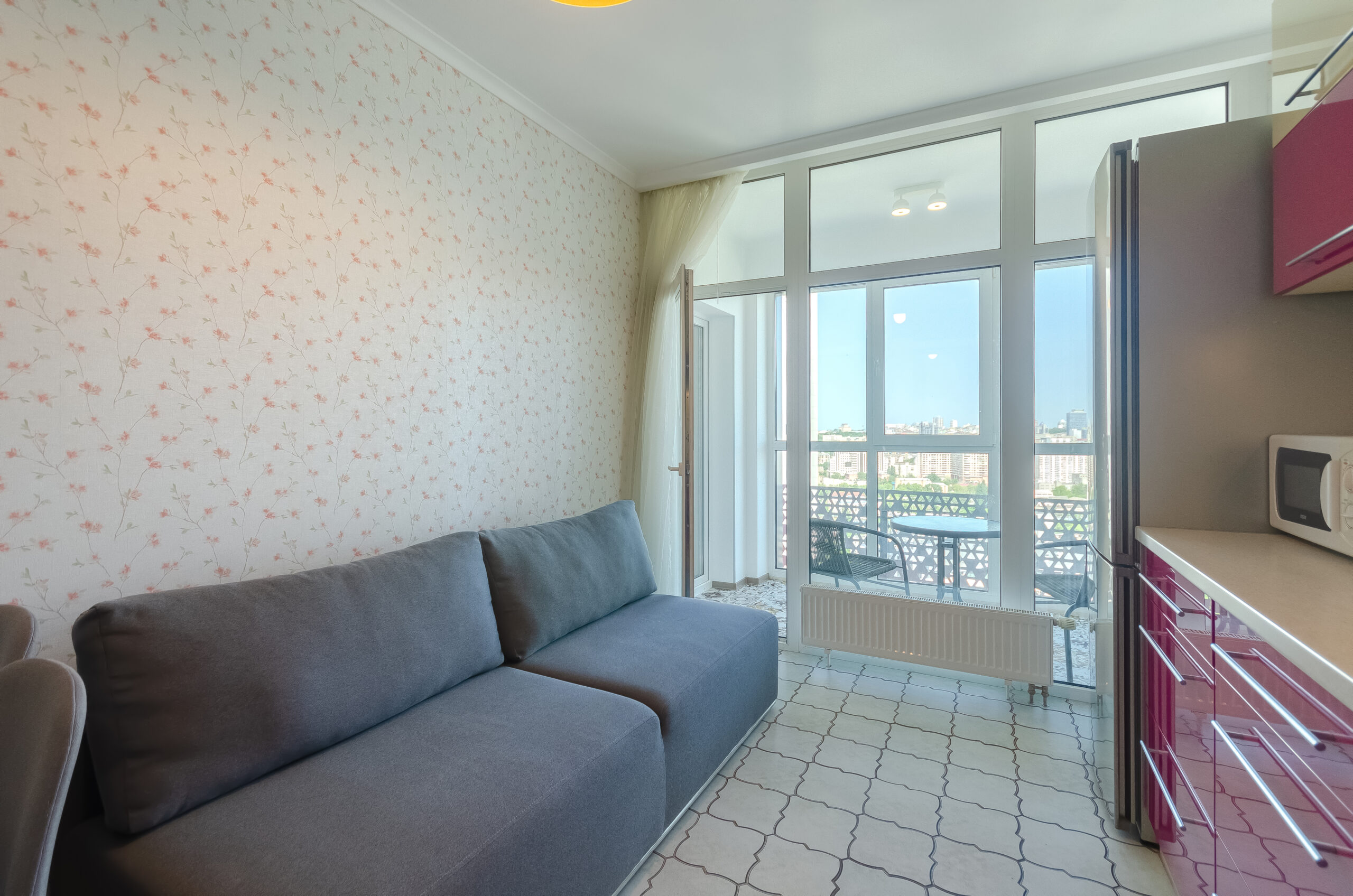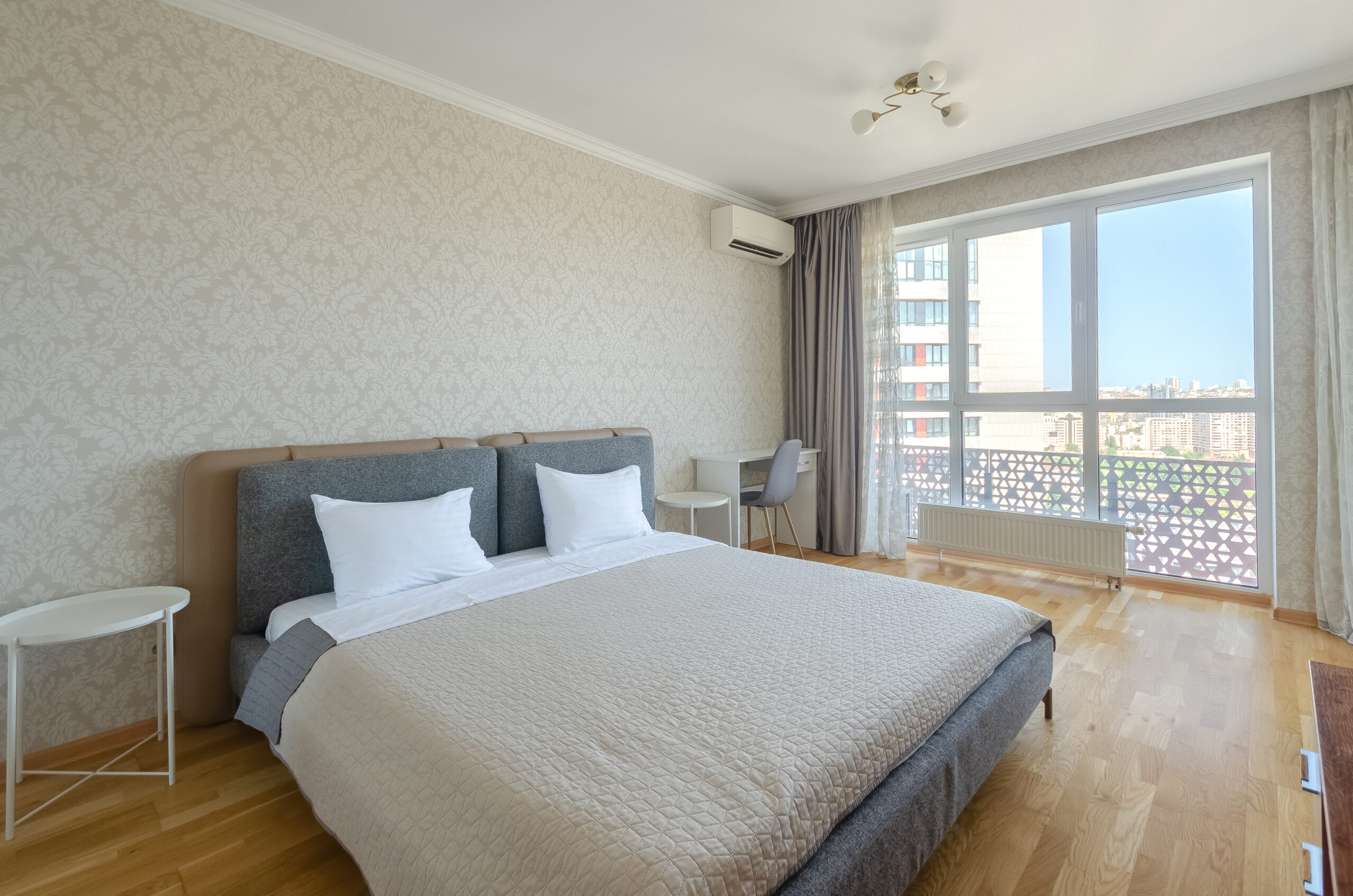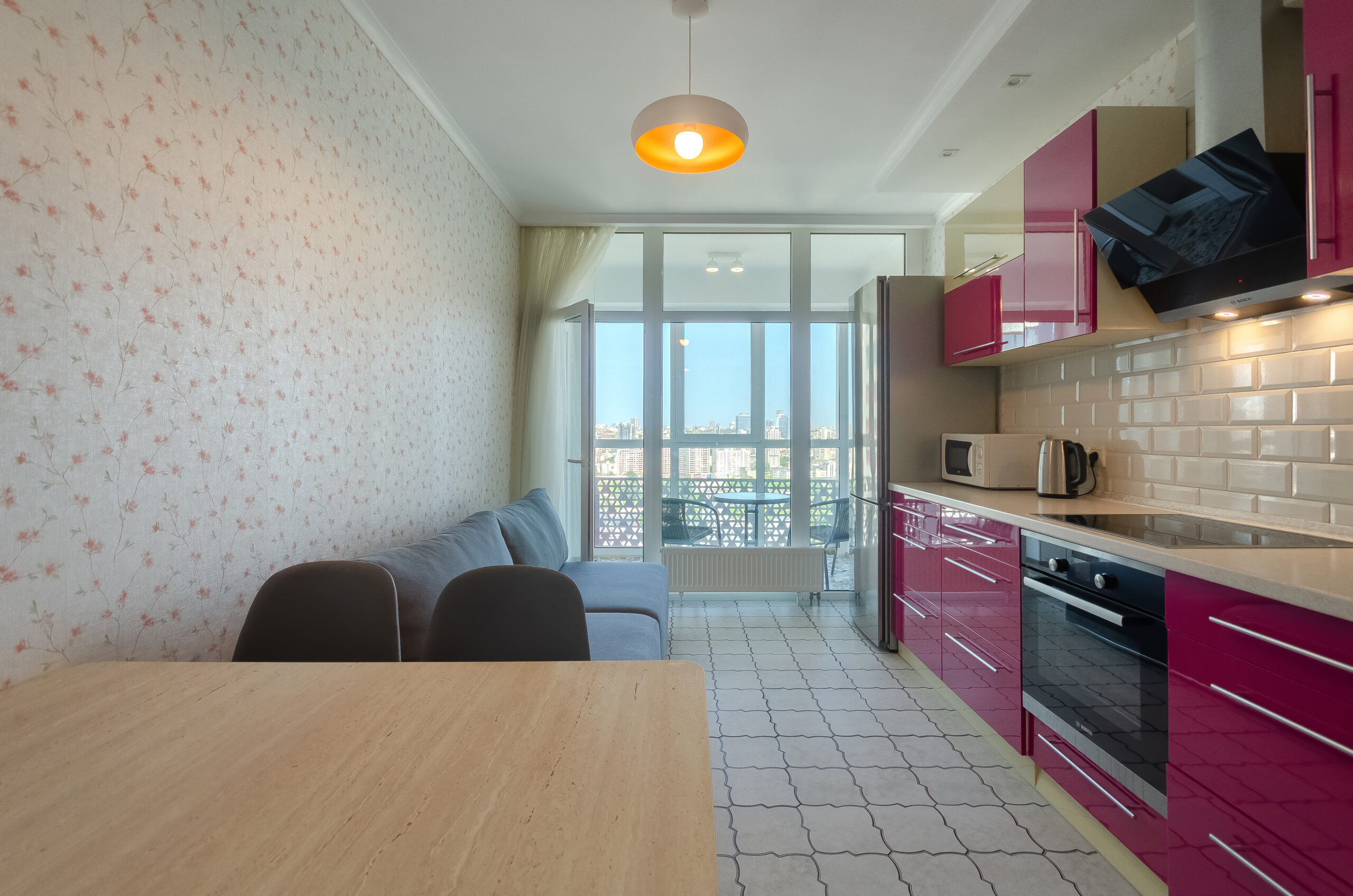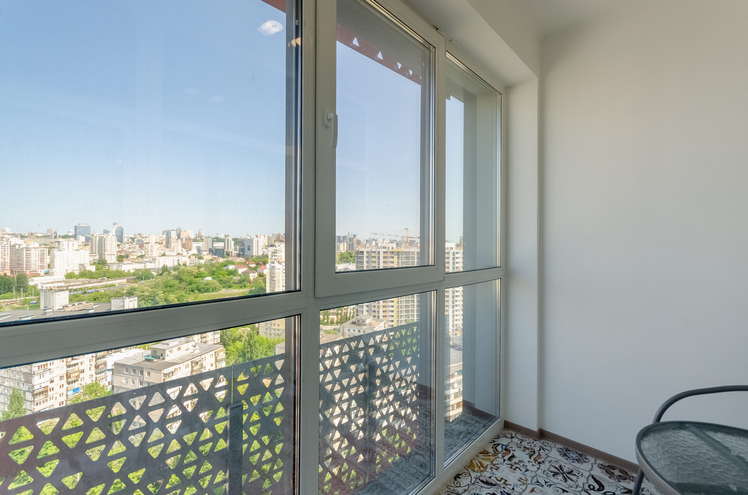 The apartment is located on the 18th floor, the area is 45m2, it has a separate bedroom with a wide bed 180*200, a stylish living room – kitchen with a view of Kyiv and a bathroom. The apartment is fully equipped with everything necessary for a comfortable stay for any period.