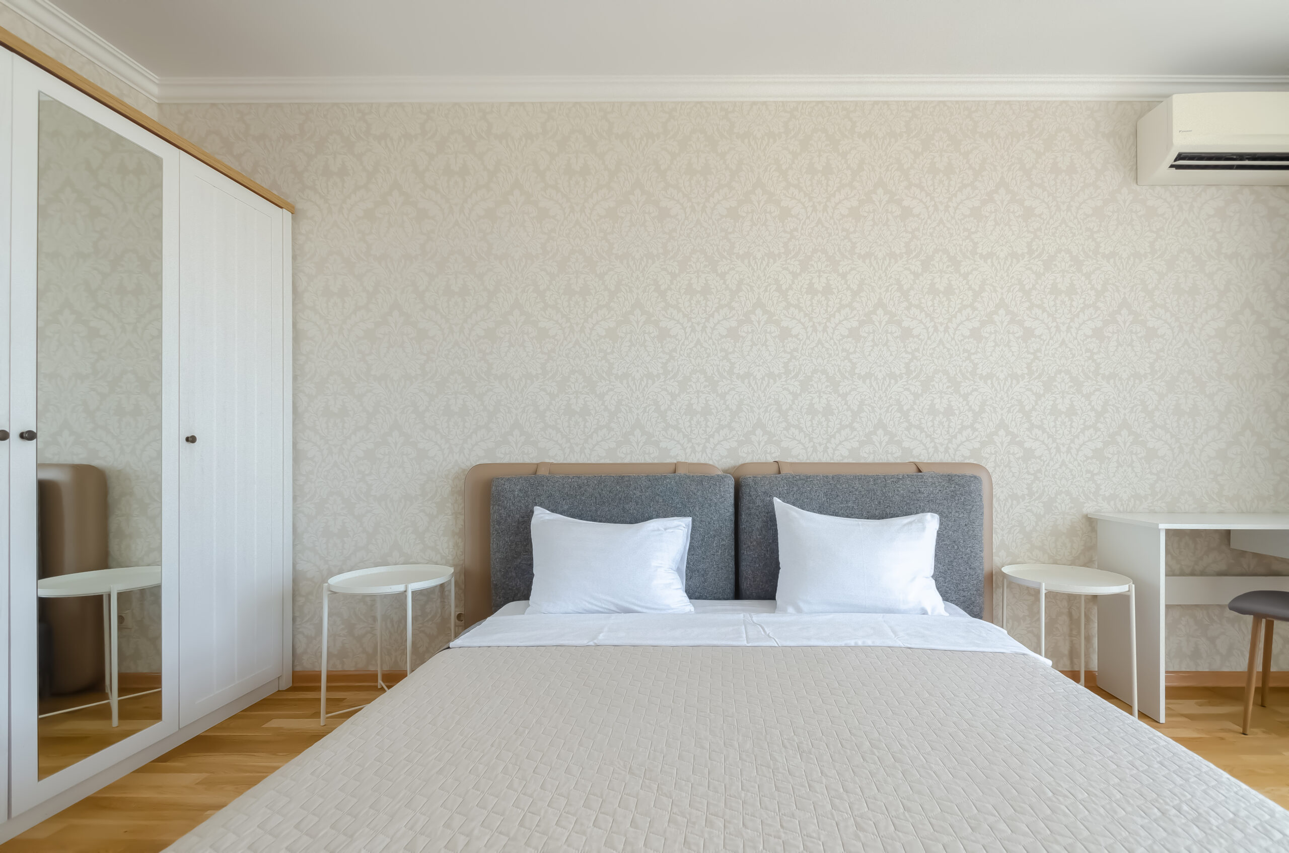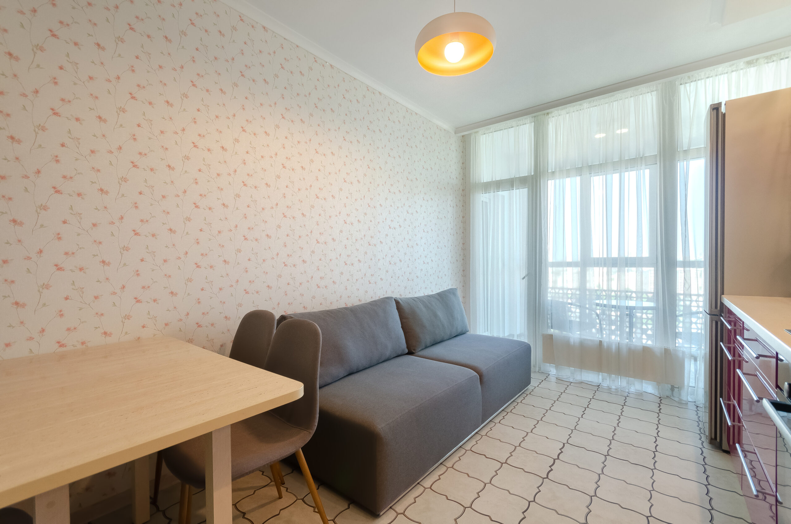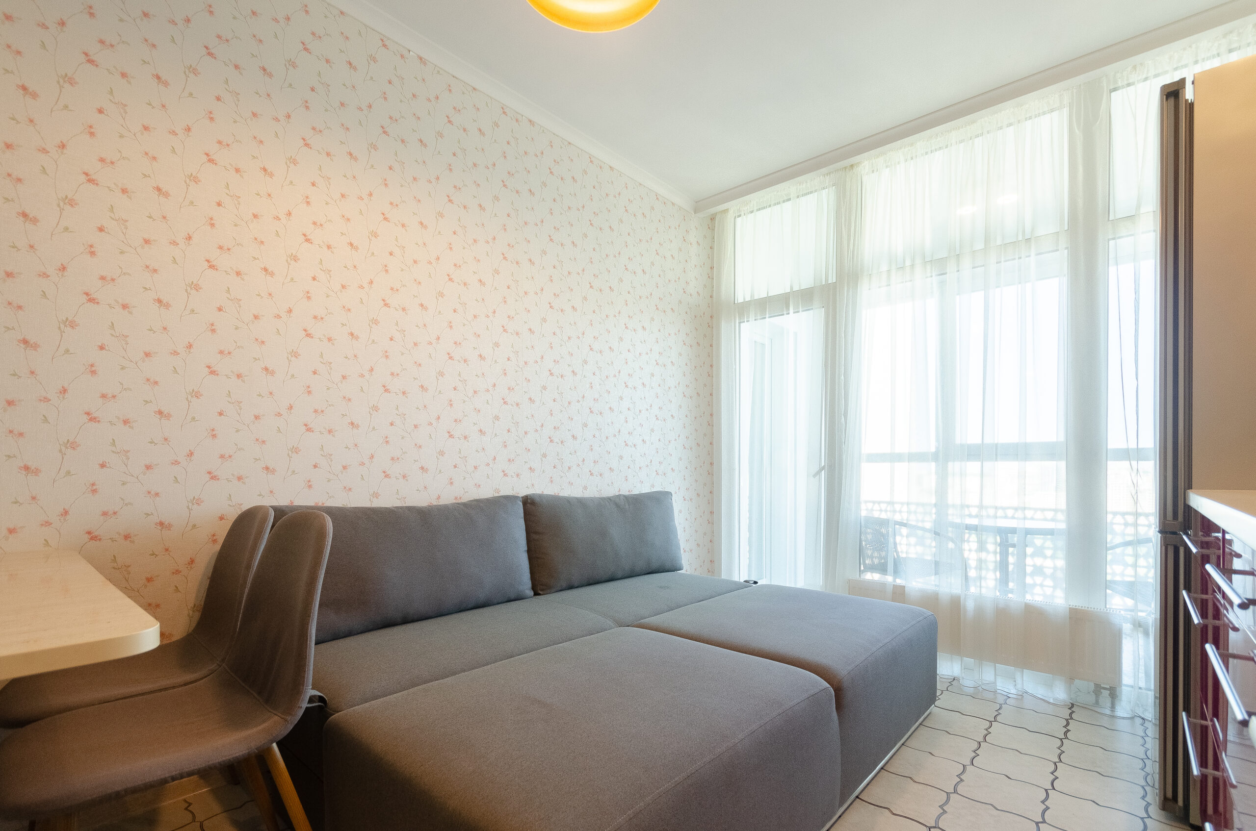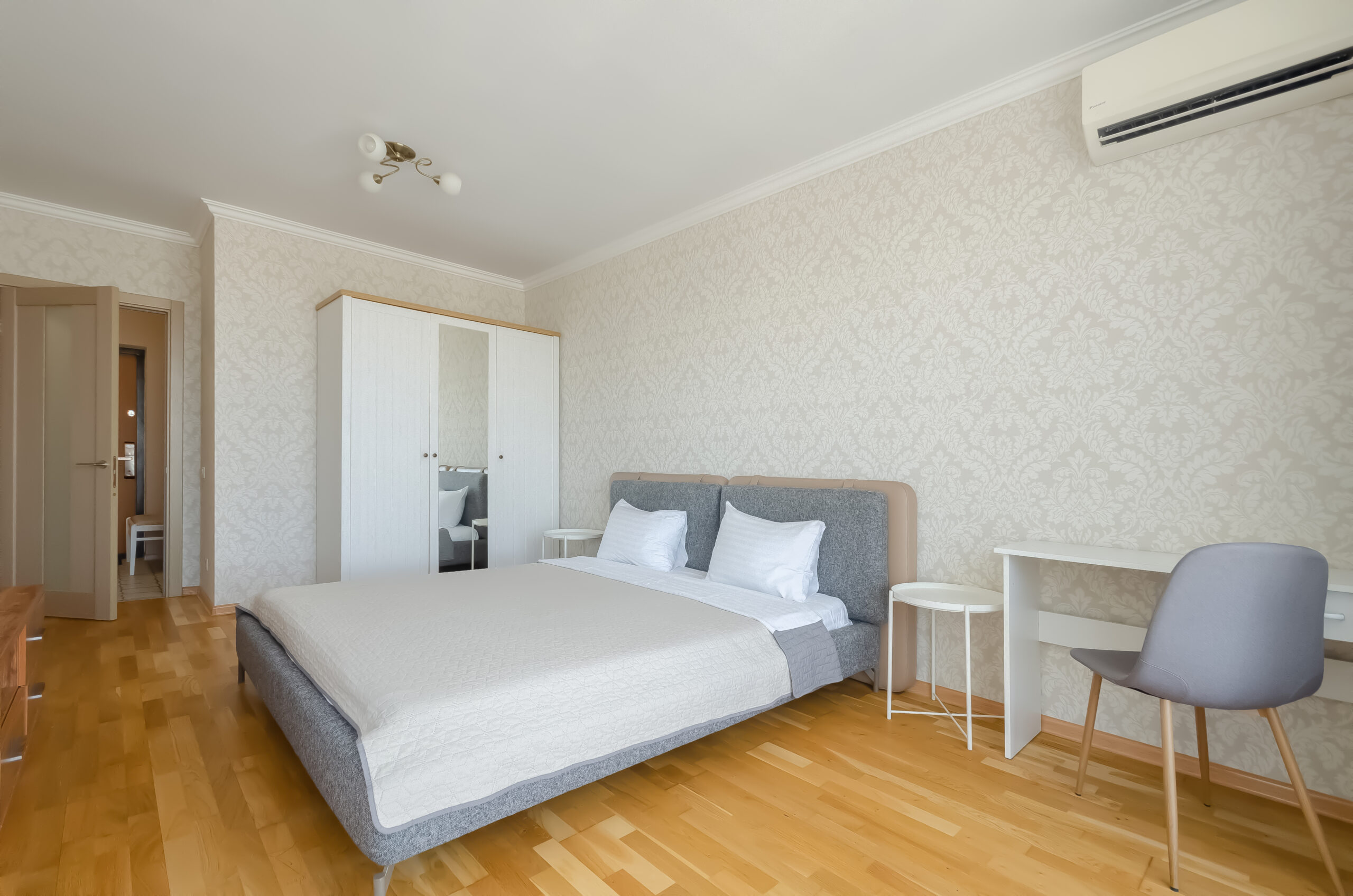 The apartment is located on the 18th floor, the area is 45m2, it has a separate bedroom with a wide bed 180*200, a stylish living room – kitchen with a view of Kyiv and a bathroom. The apartment is fully equipped with everything necessary for a comfortable stay for any period.