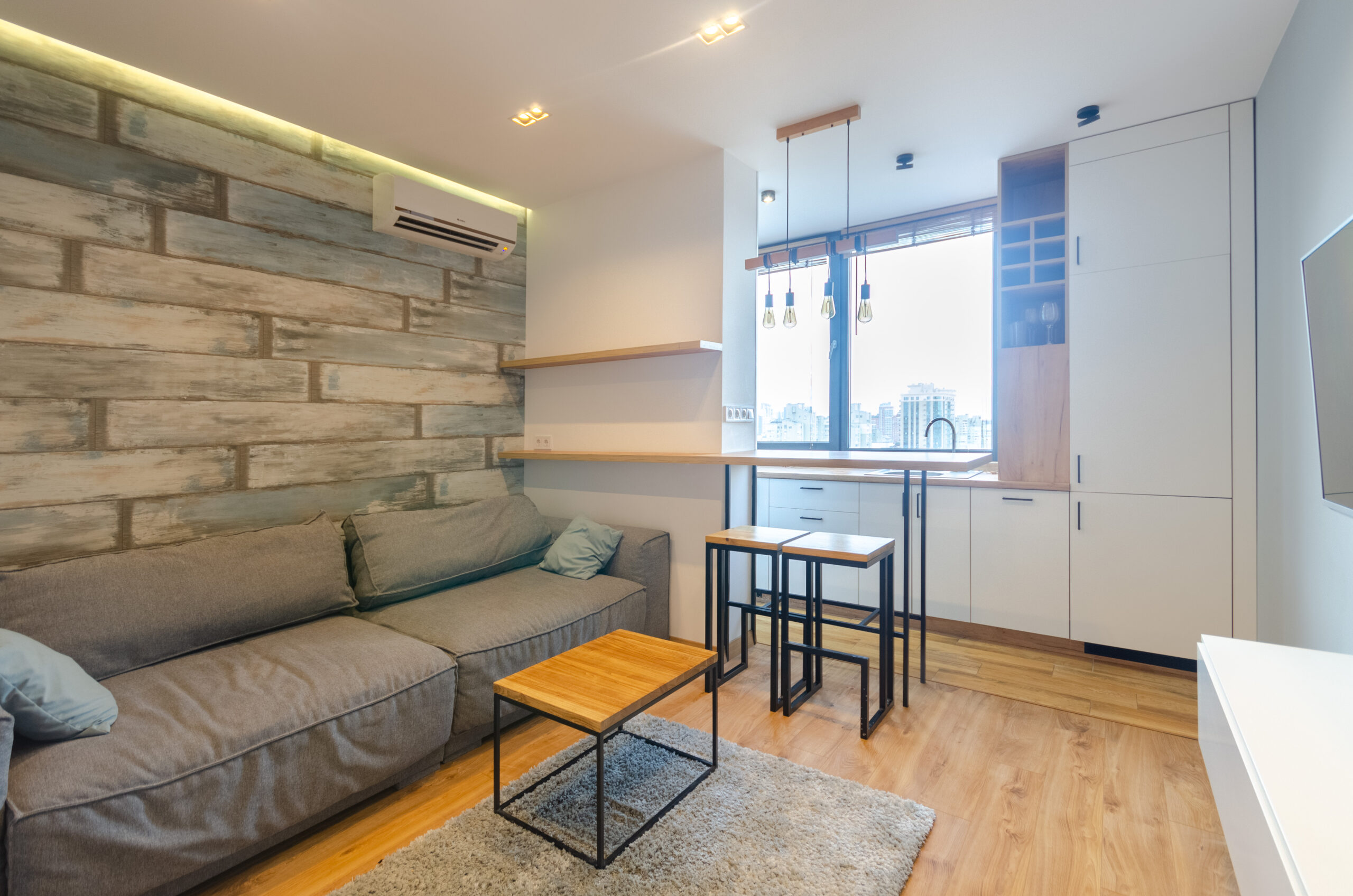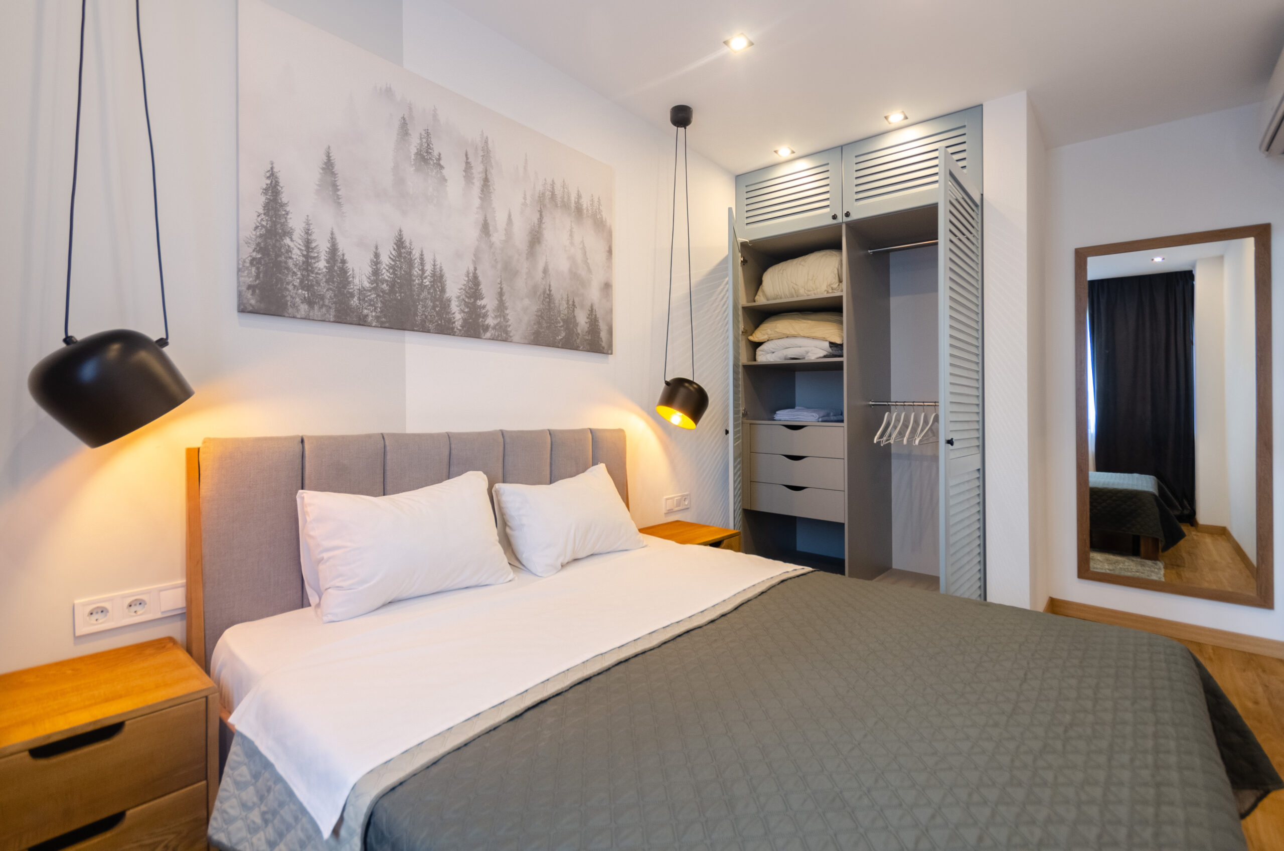 The apartment is located on the 19th floor, the total area is 45 m2, a living room with a small kitchen, a separate bedroom, a bathroom. The apartment is equipped with everything necessary for a comfortable stay.