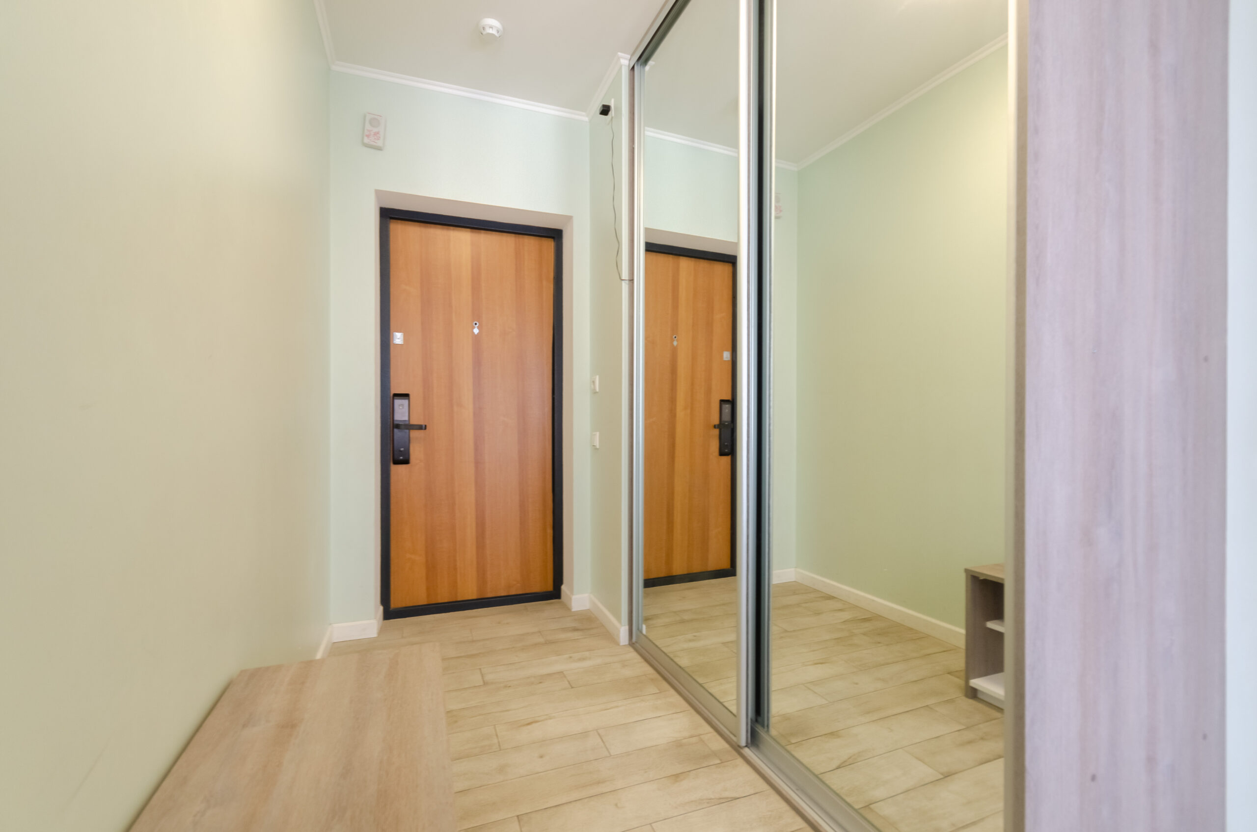 The apartment is located on the 21st floor of 55m2, has a separate bright bedroom, living room – kitchen with a panoramic view of the city and a bathroom.