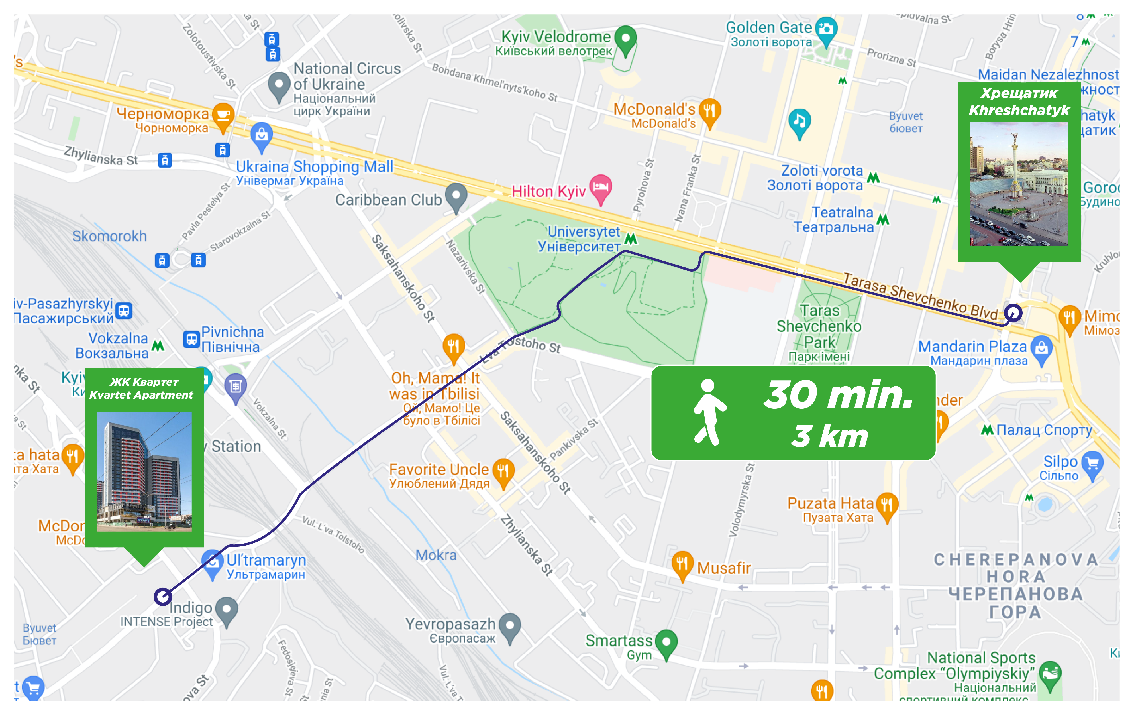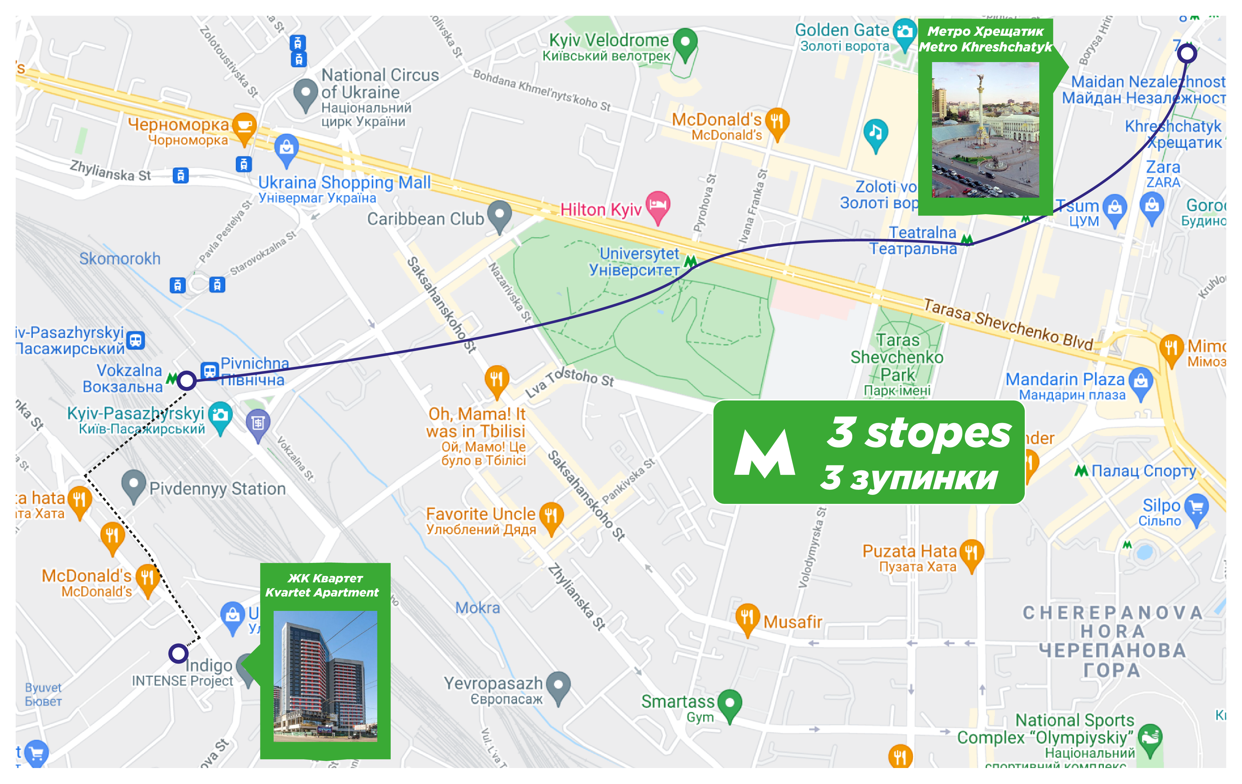 Within walking distance are the railway station, Leva Tolstoy, Zhilyanska, Ultramarin shopping center, 101 Tower, Stadium, Kudryashova, Saksaganskogo, Solomyansky park, Novus supermarket, KFC, McDonald’s, Velyka Kishenya.
