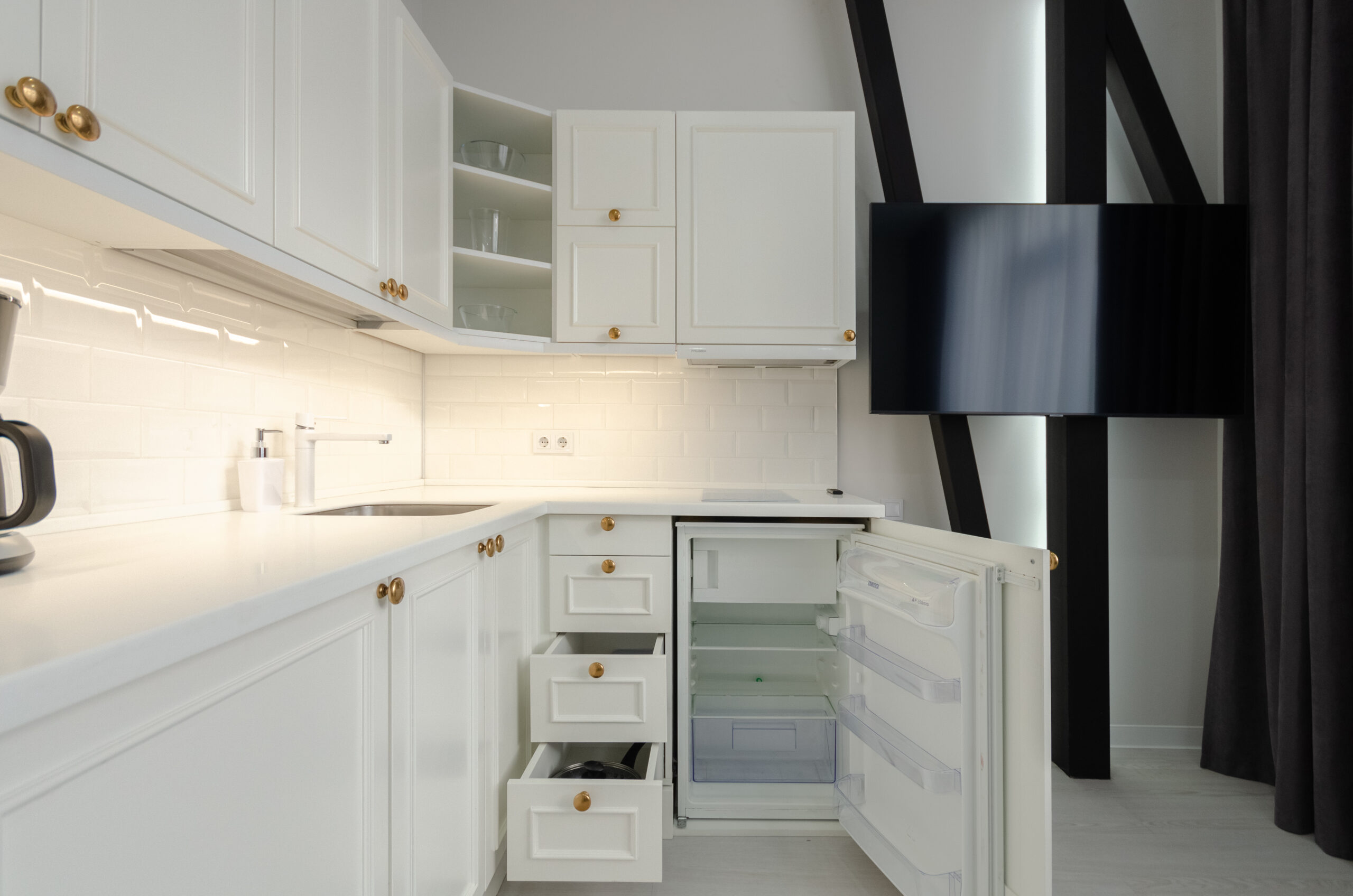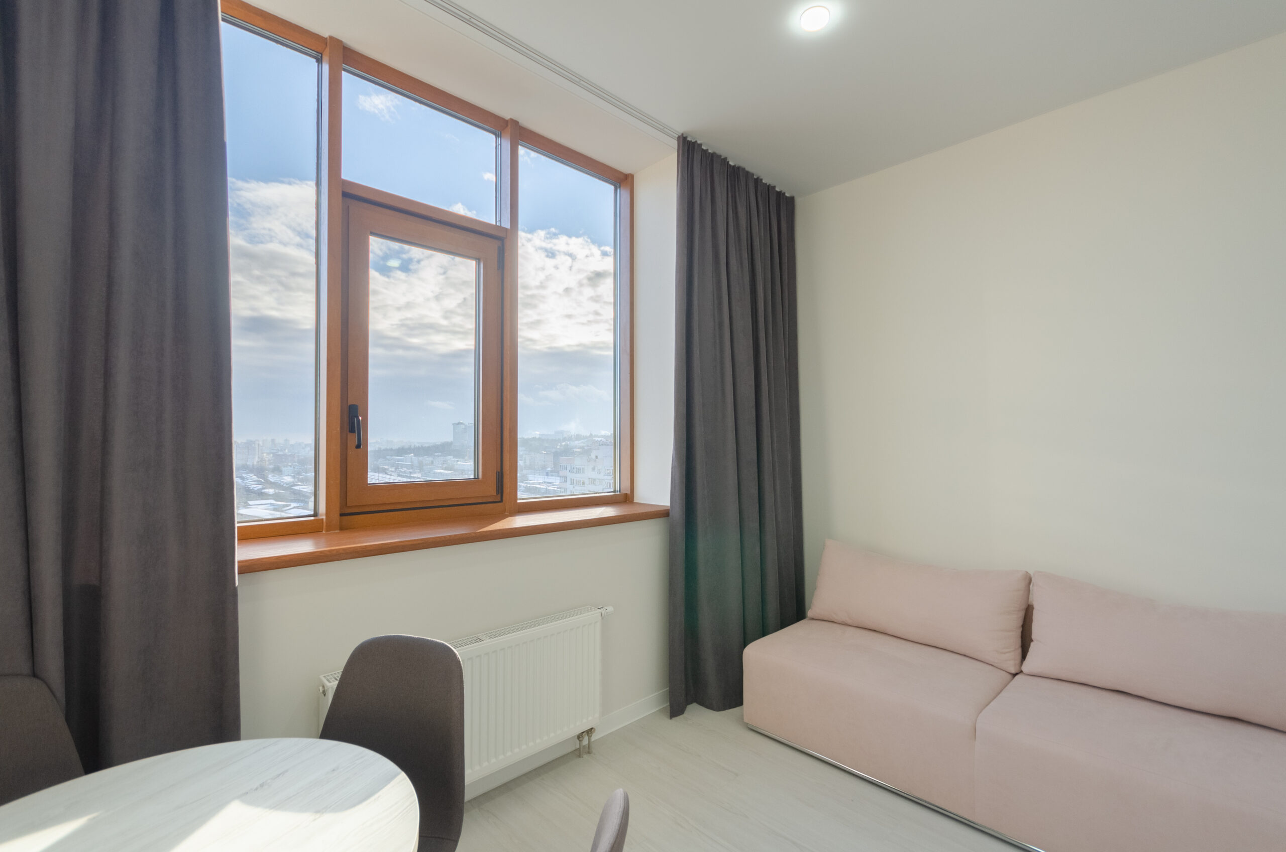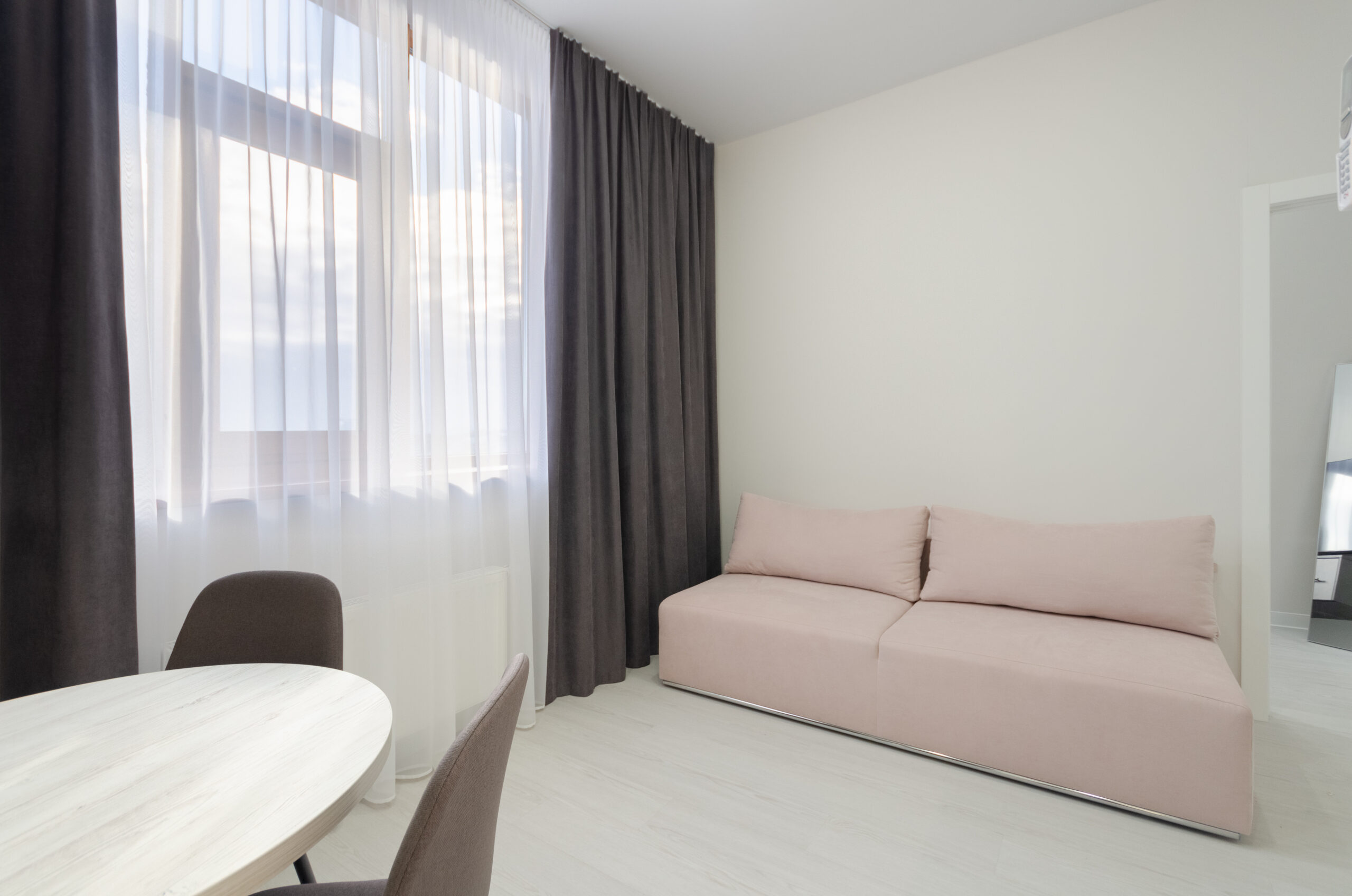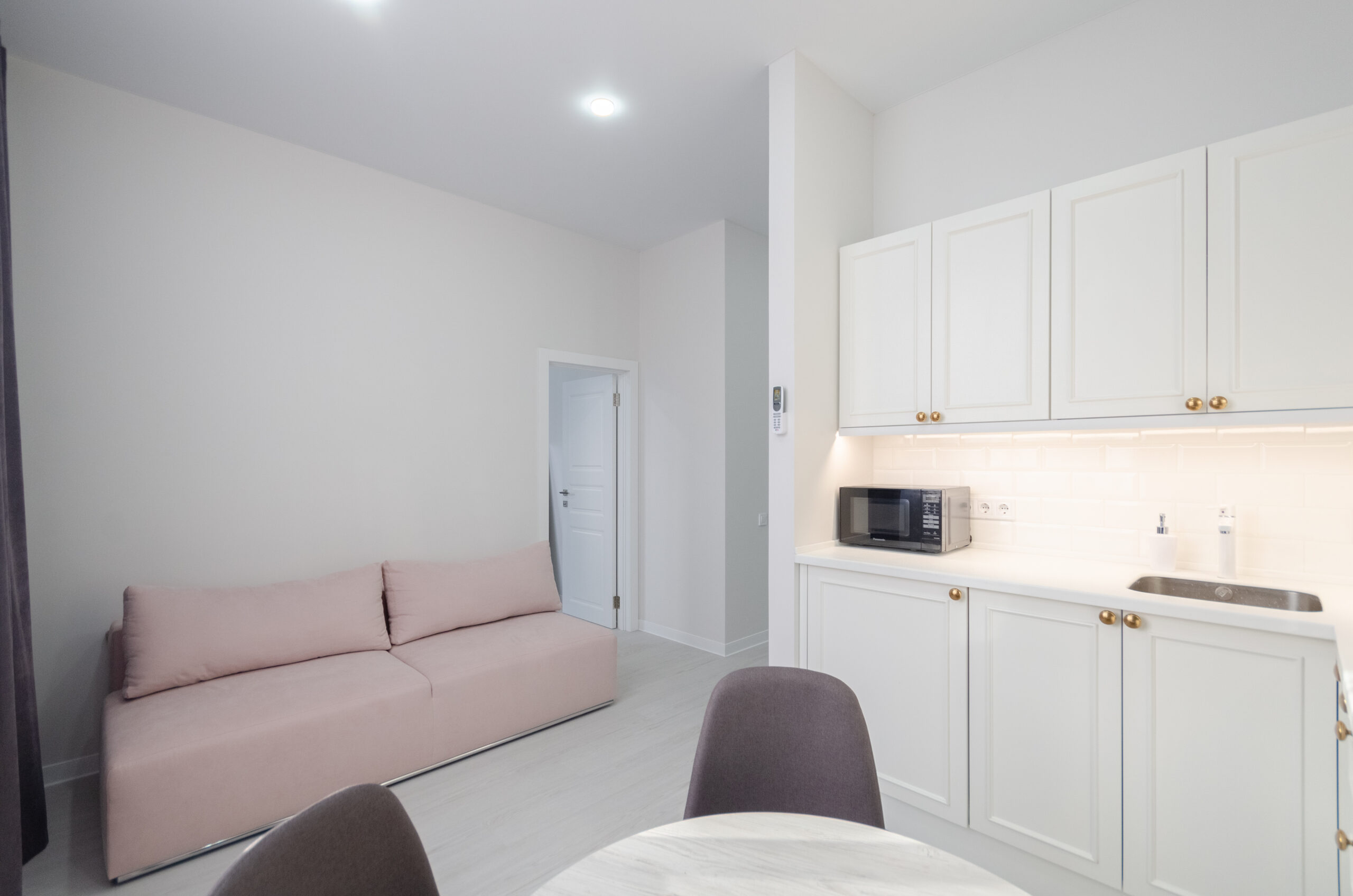 – living room (divided into zones, includes a kitchen): double sofa 160 * 200 cm, flat-screen TV, Smart-TV, kitchen (refrigerator, washing machine, microwave, kettle, electric stove, oven, pots, pans, all necessary utensils, cups, glasses, dining table.
