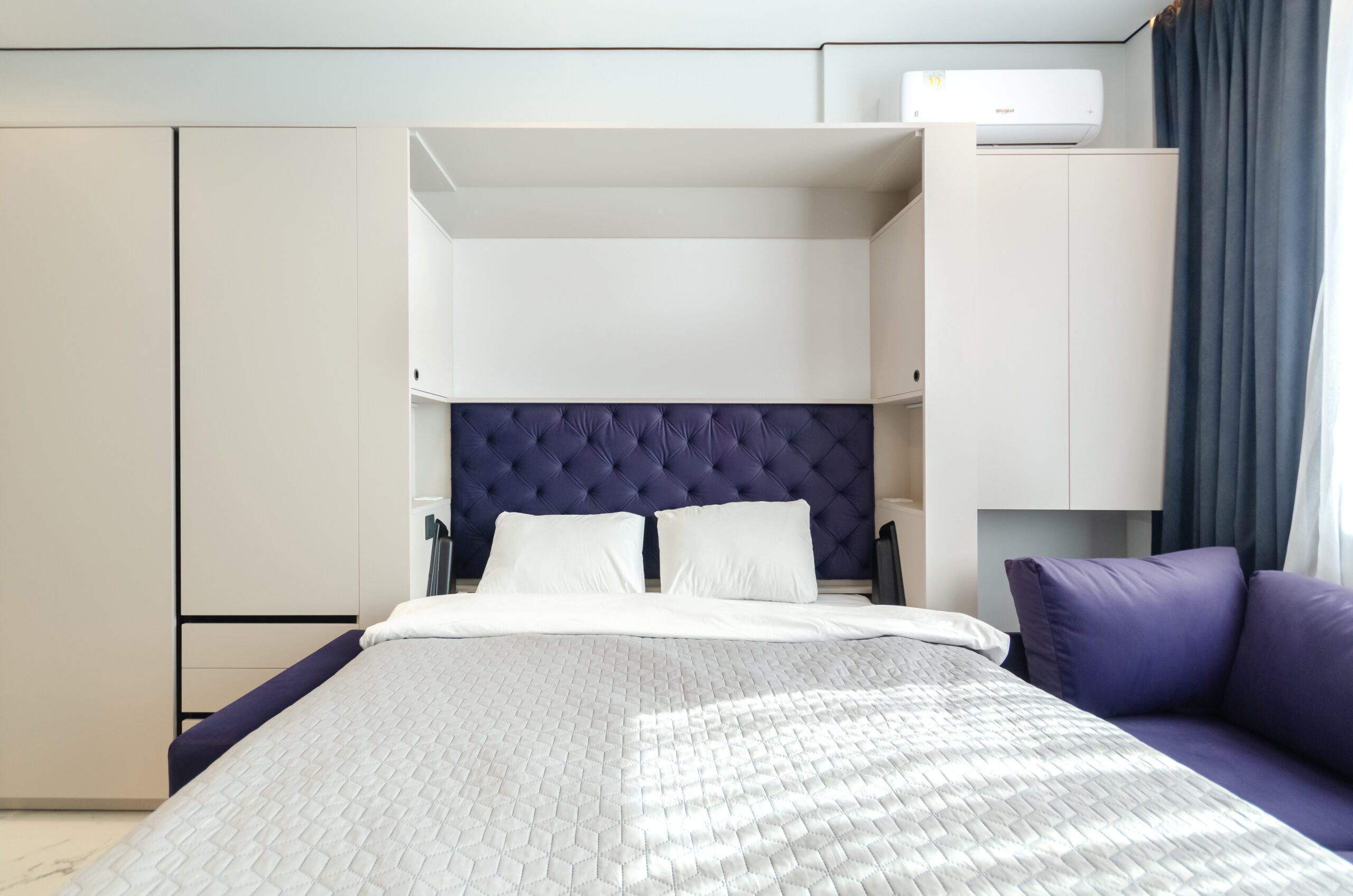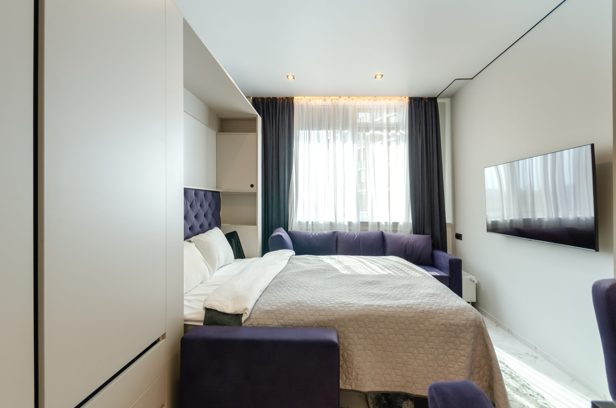 *living room area: sofa, which transforms into a bed 1600 x 2000 mm, also to the left of the bed at a distance of 12 cm there is a non-folding part of this sofa measuring 660 mm by 2100 mm, air conditioner, smart TV, wardrobe;