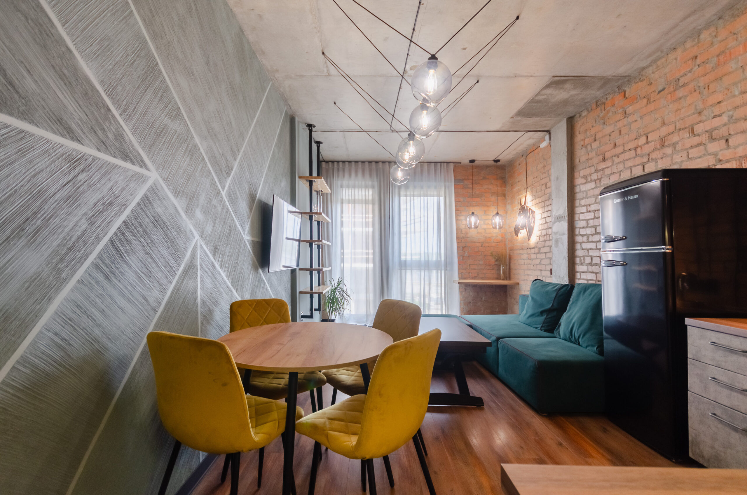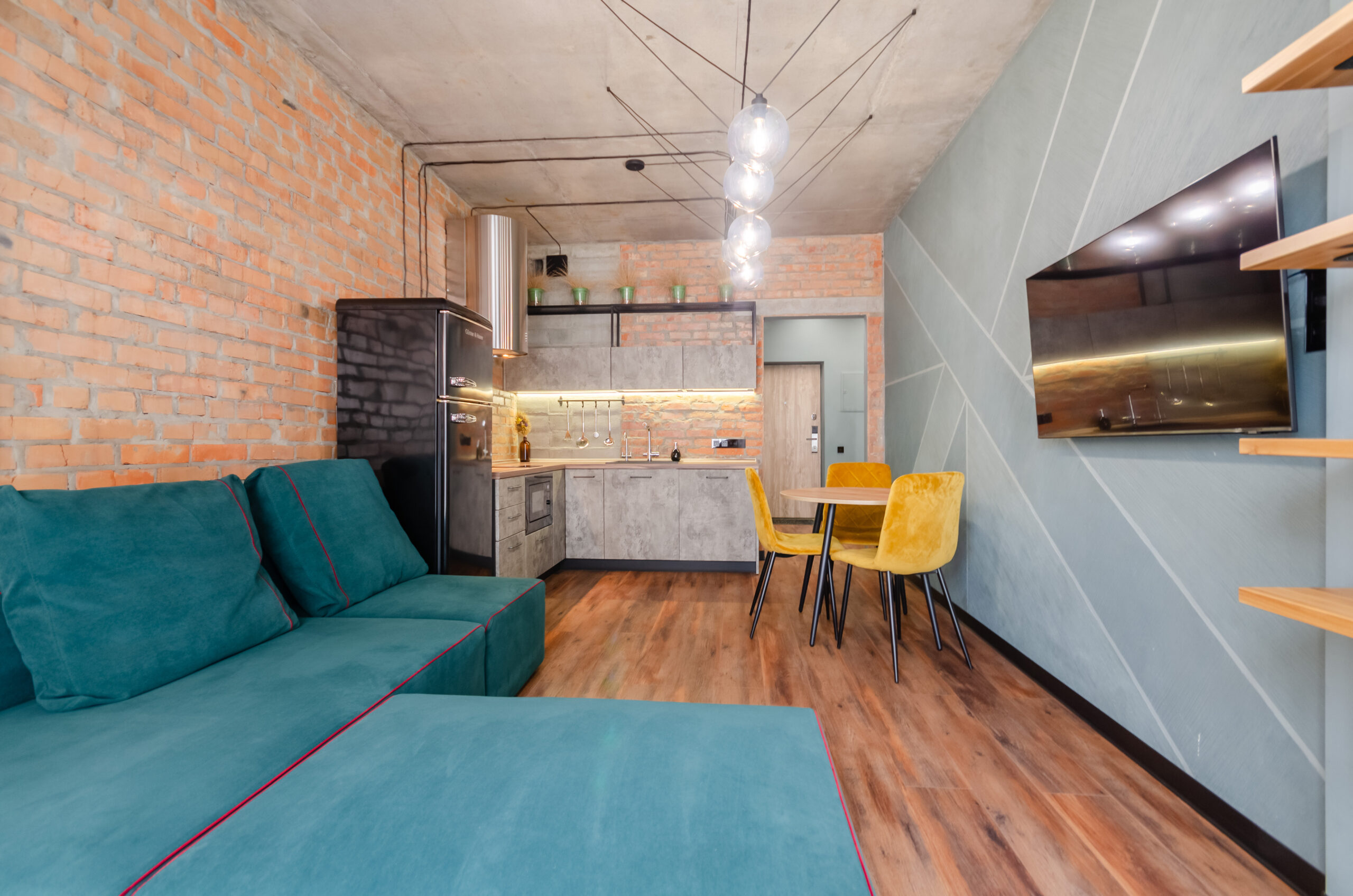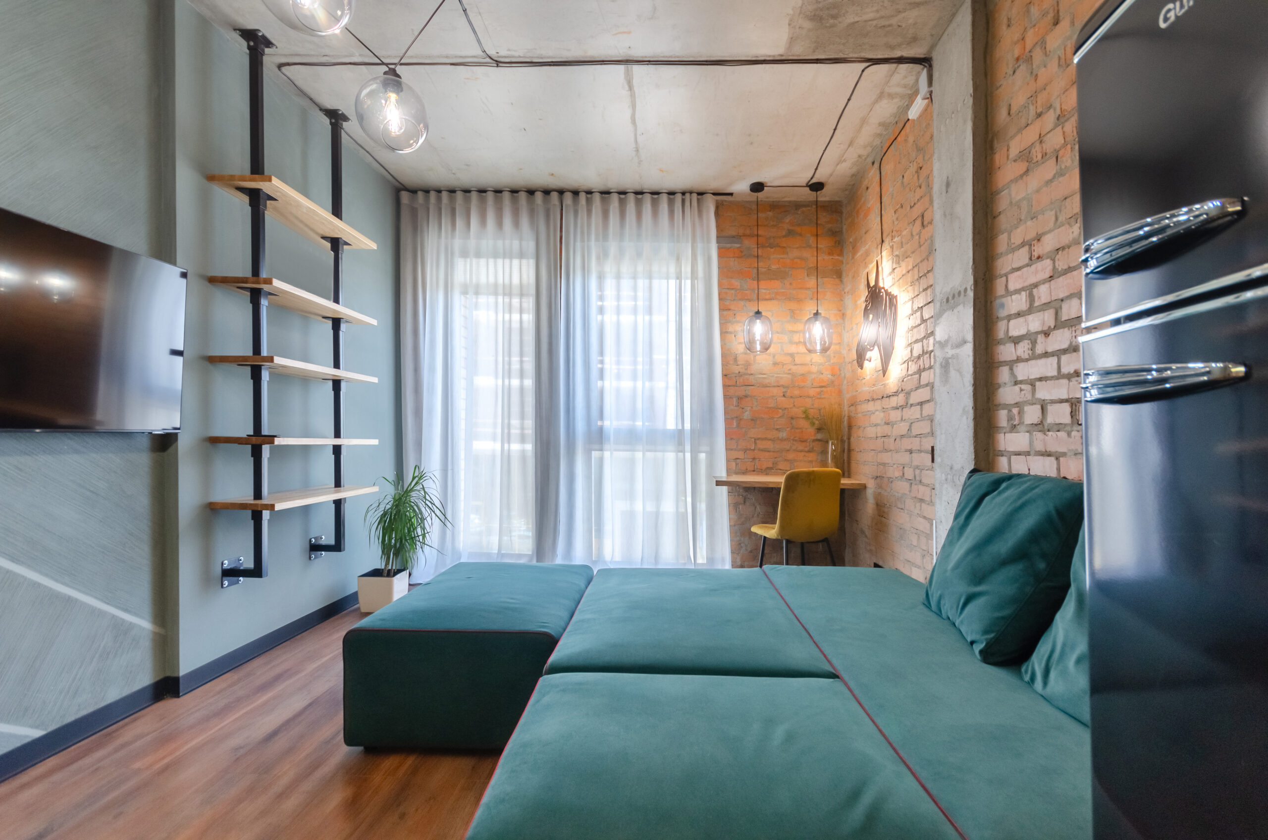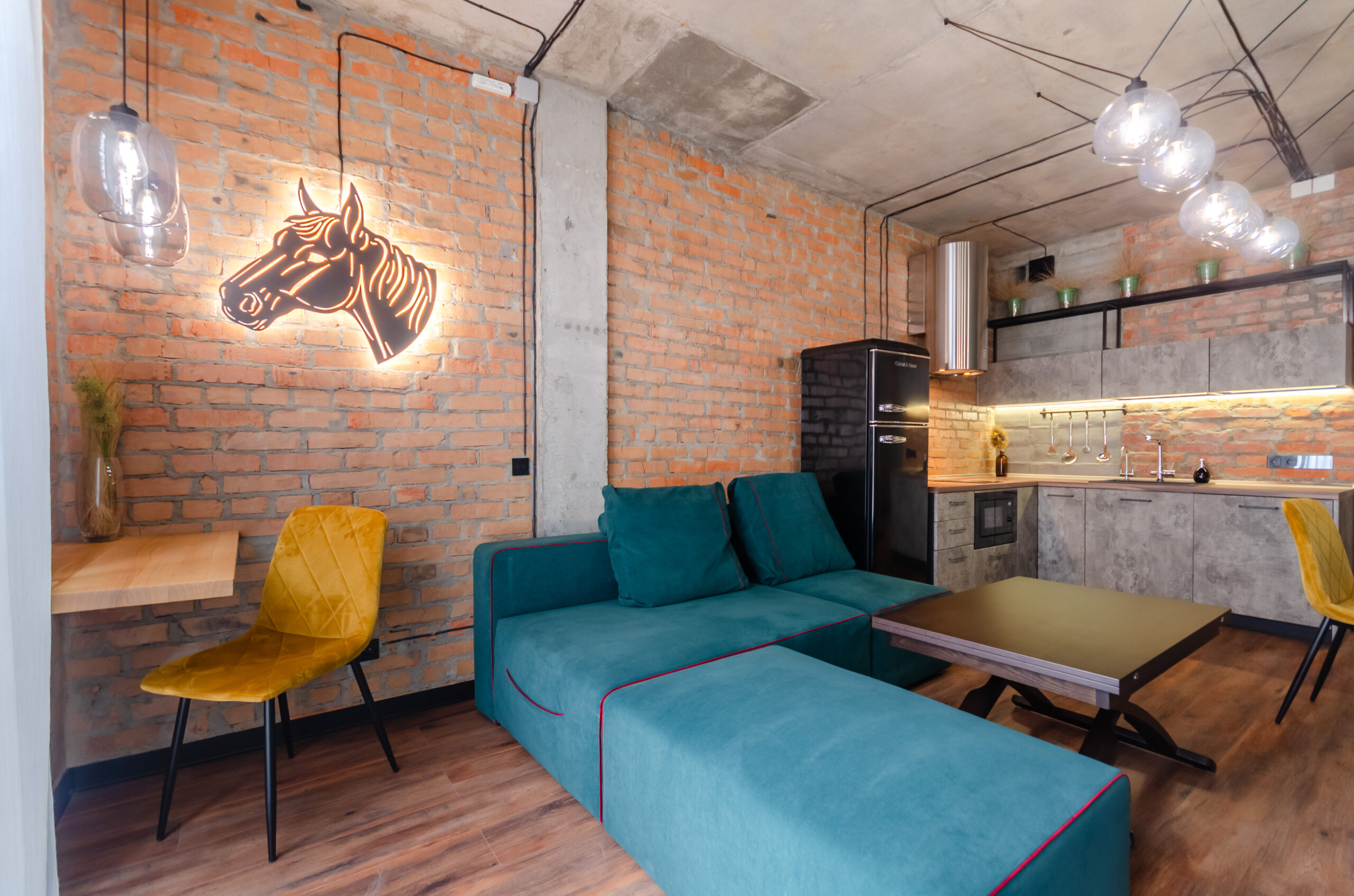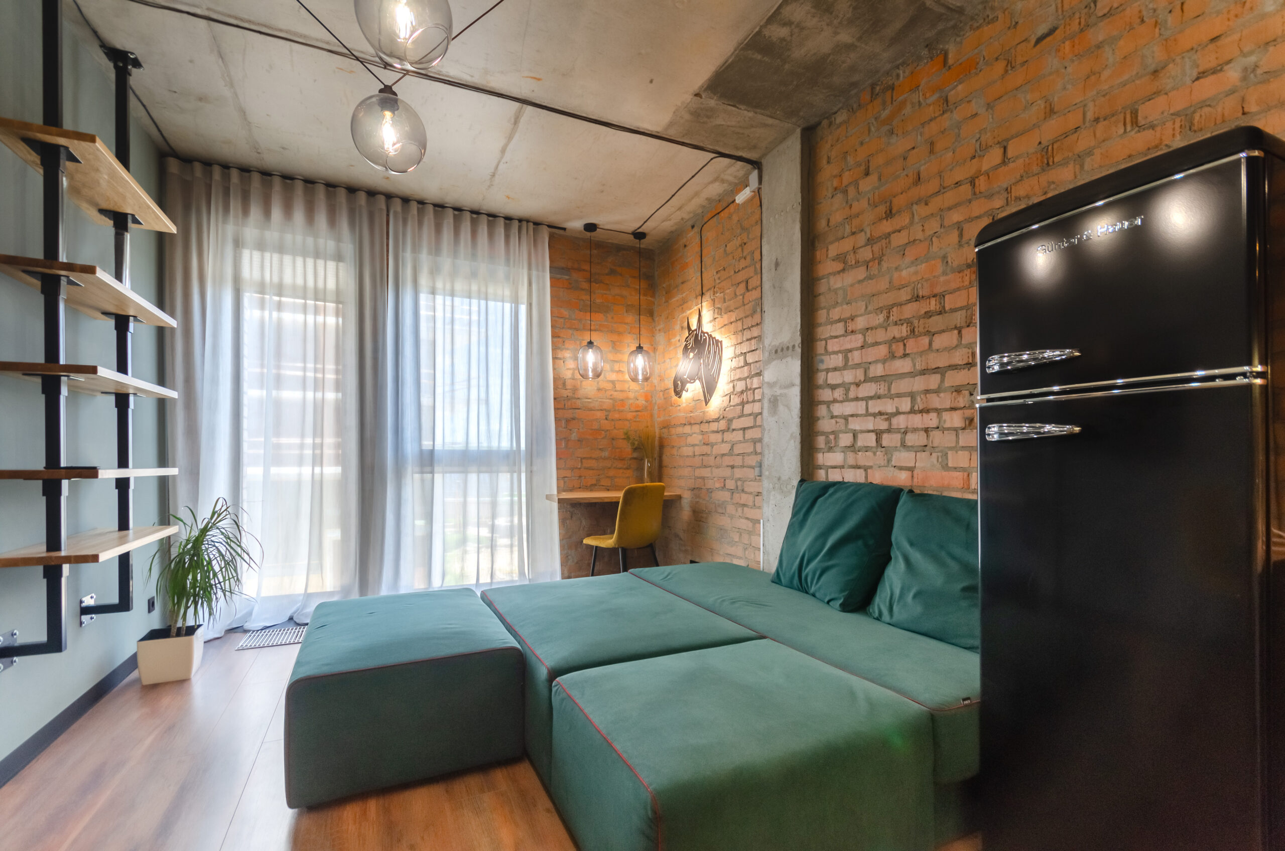 *Living room (divided into zones, including kitchen): sofa bed 160*200 cm, flat screen Smart TV, separate workplace.