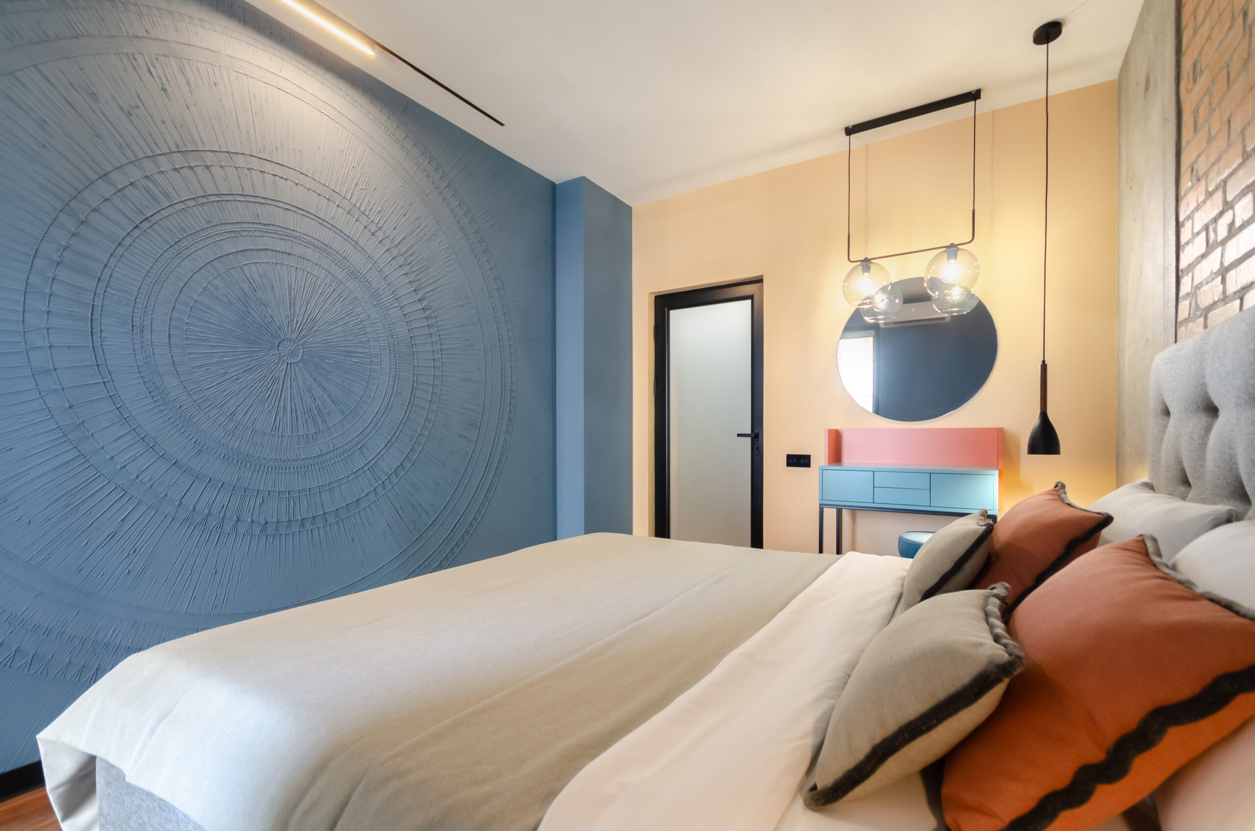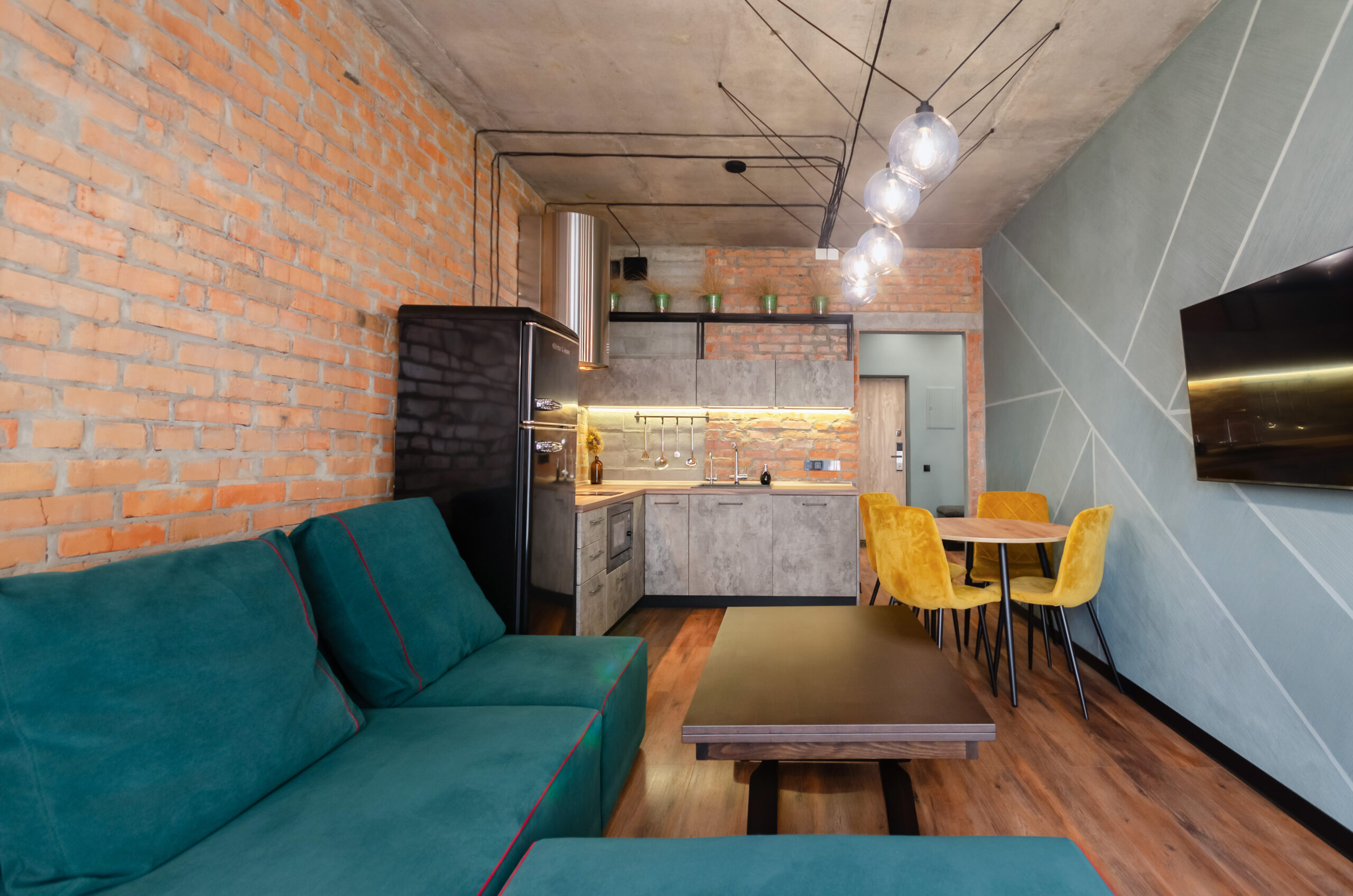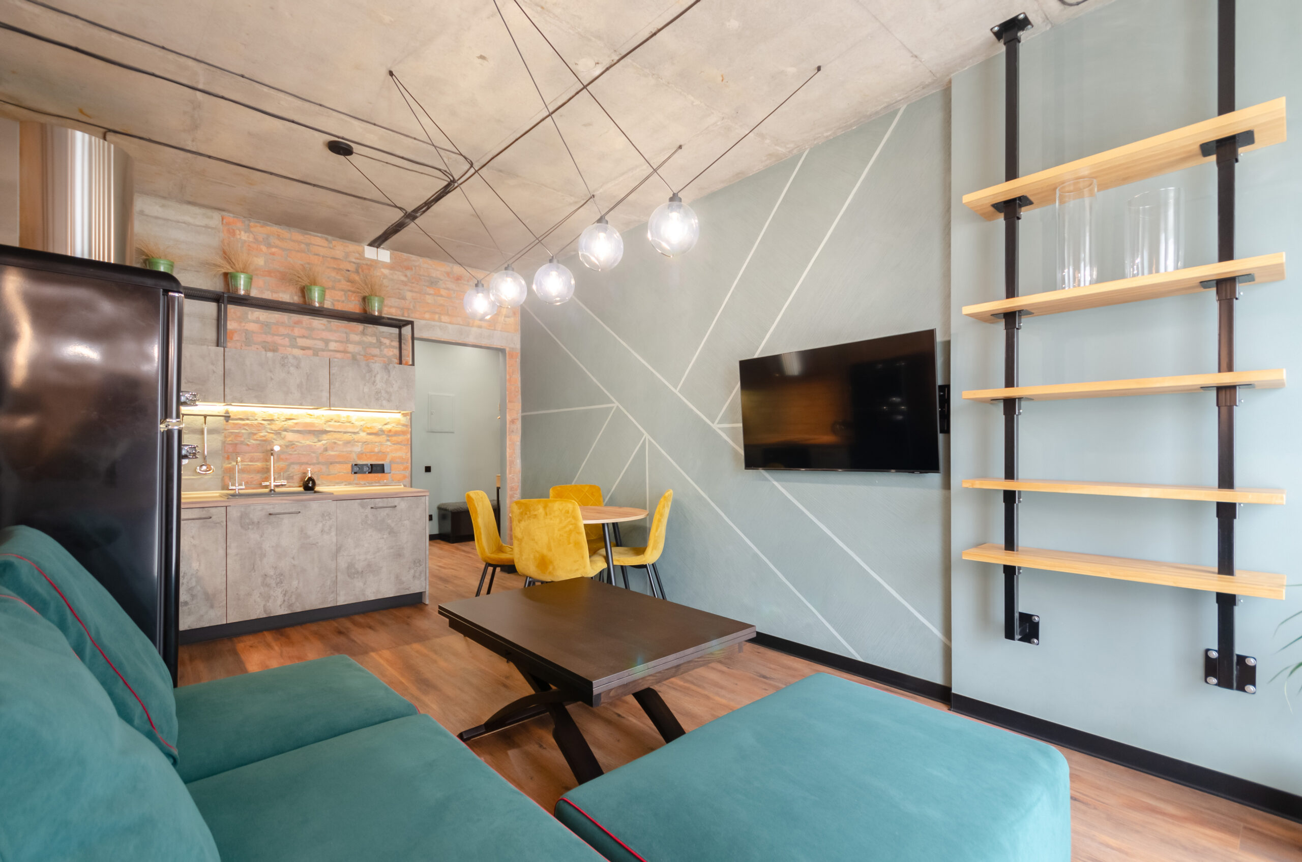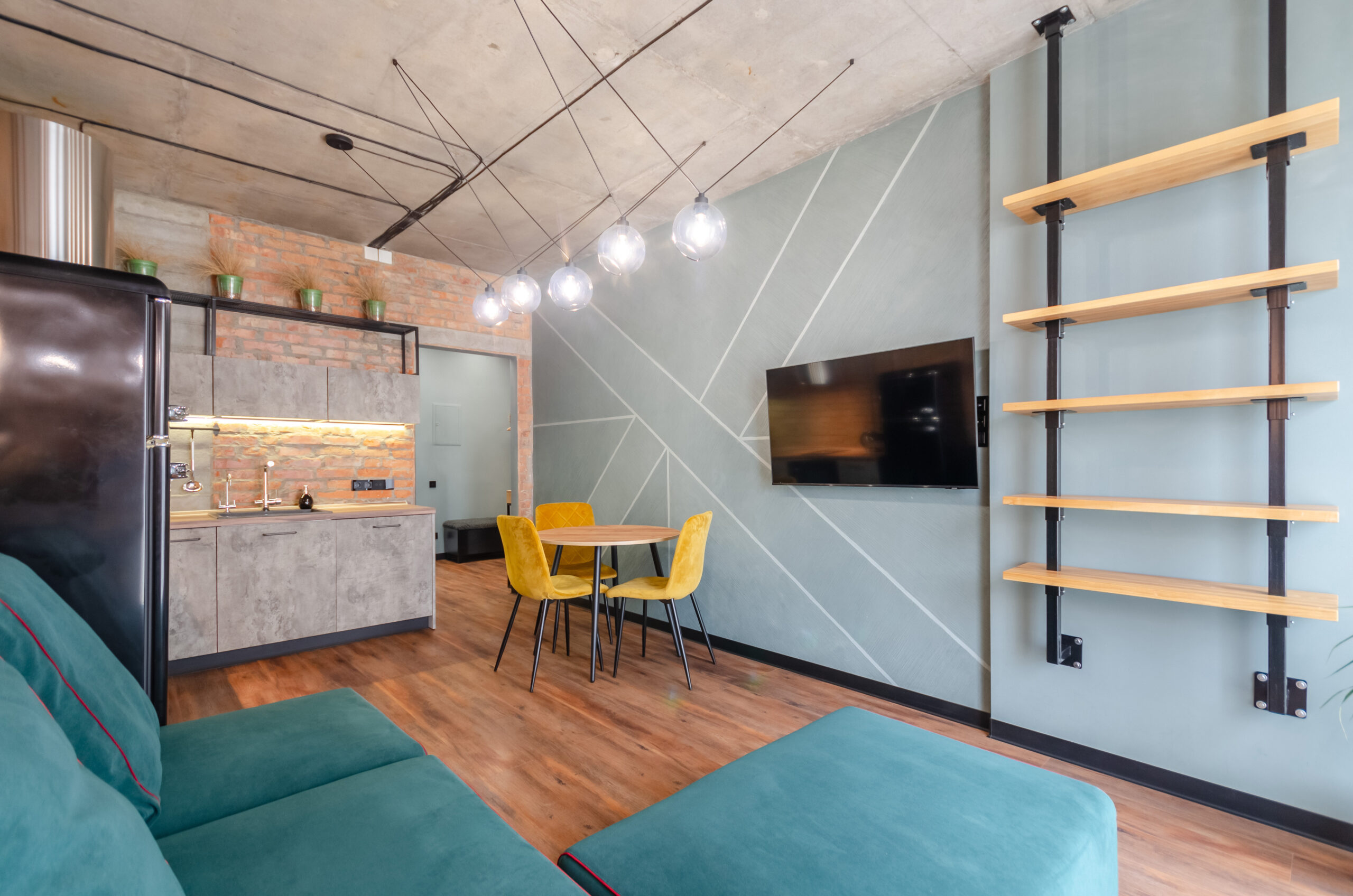 *Living room (divided into zones, including kitchen): sofa bed 160*200 cm, flat screen Smart TV, separate workplace.