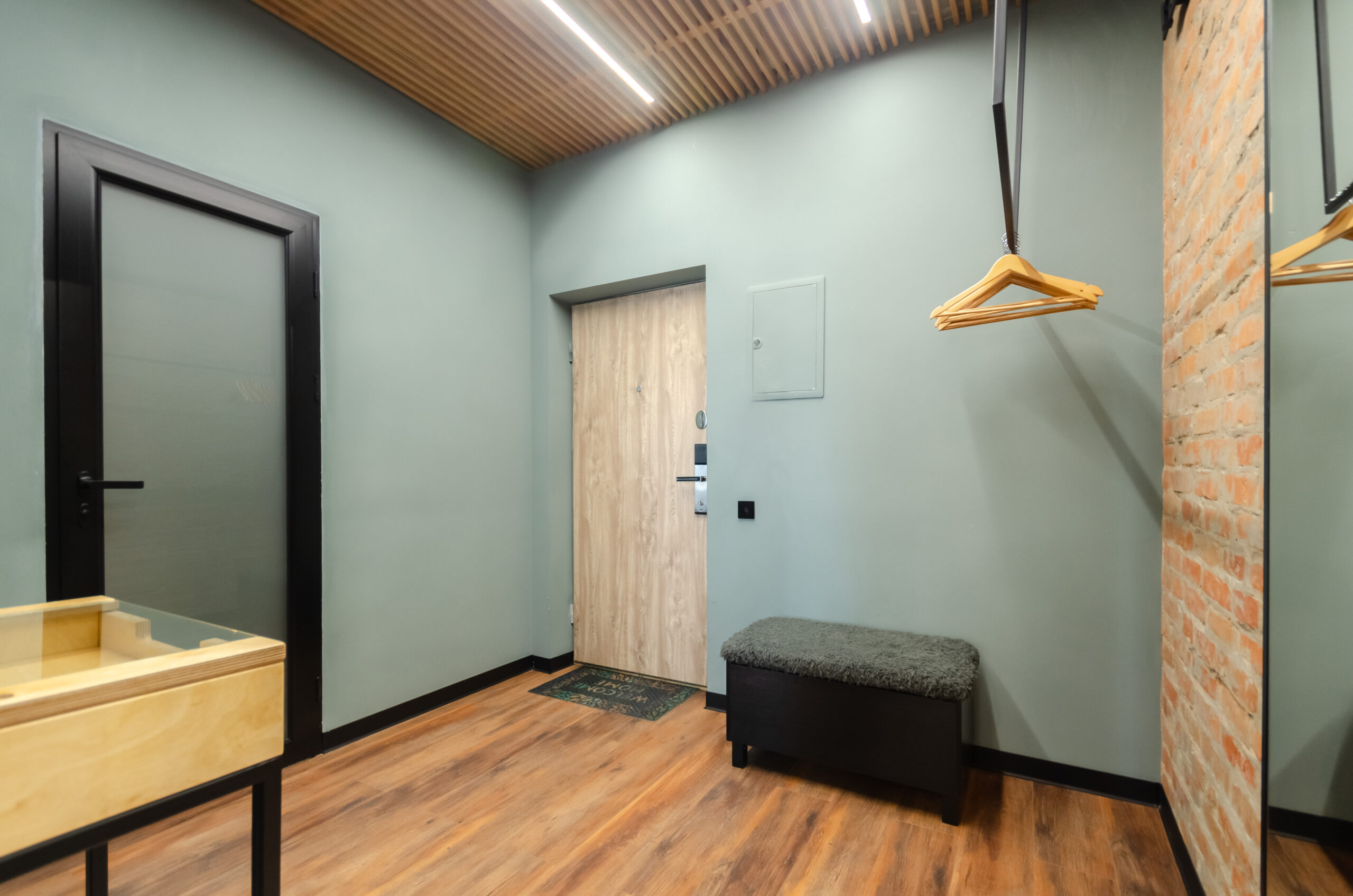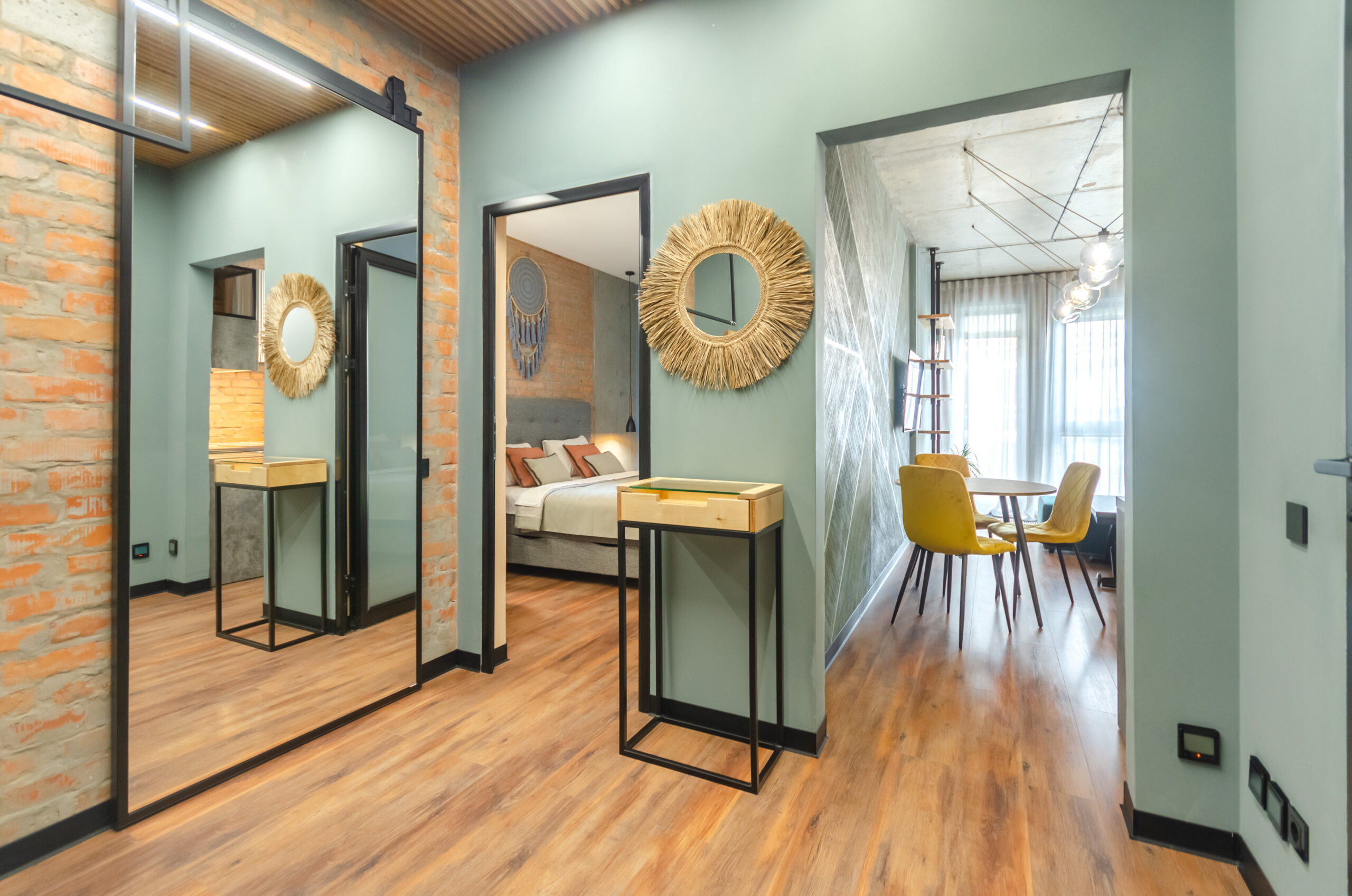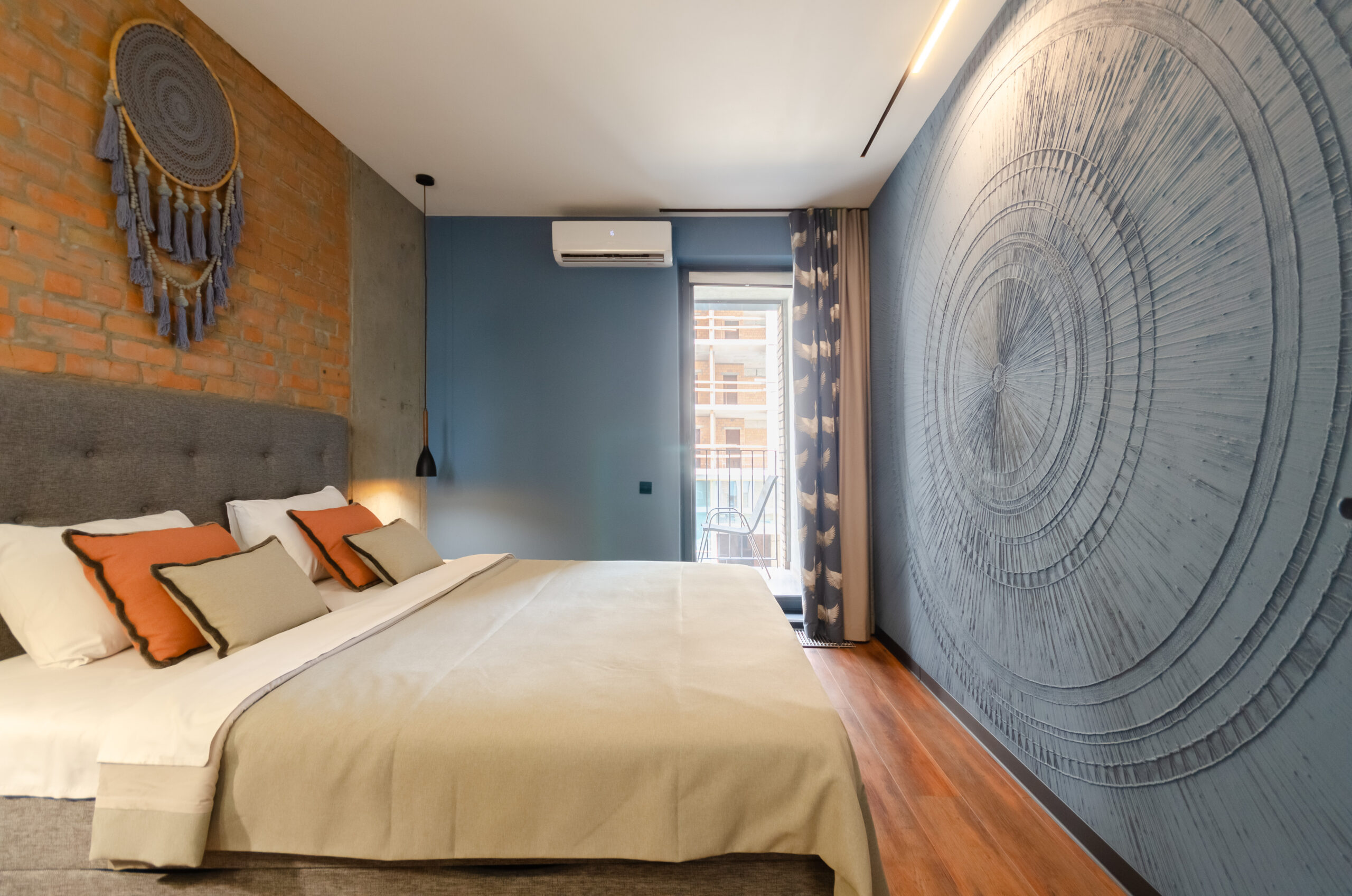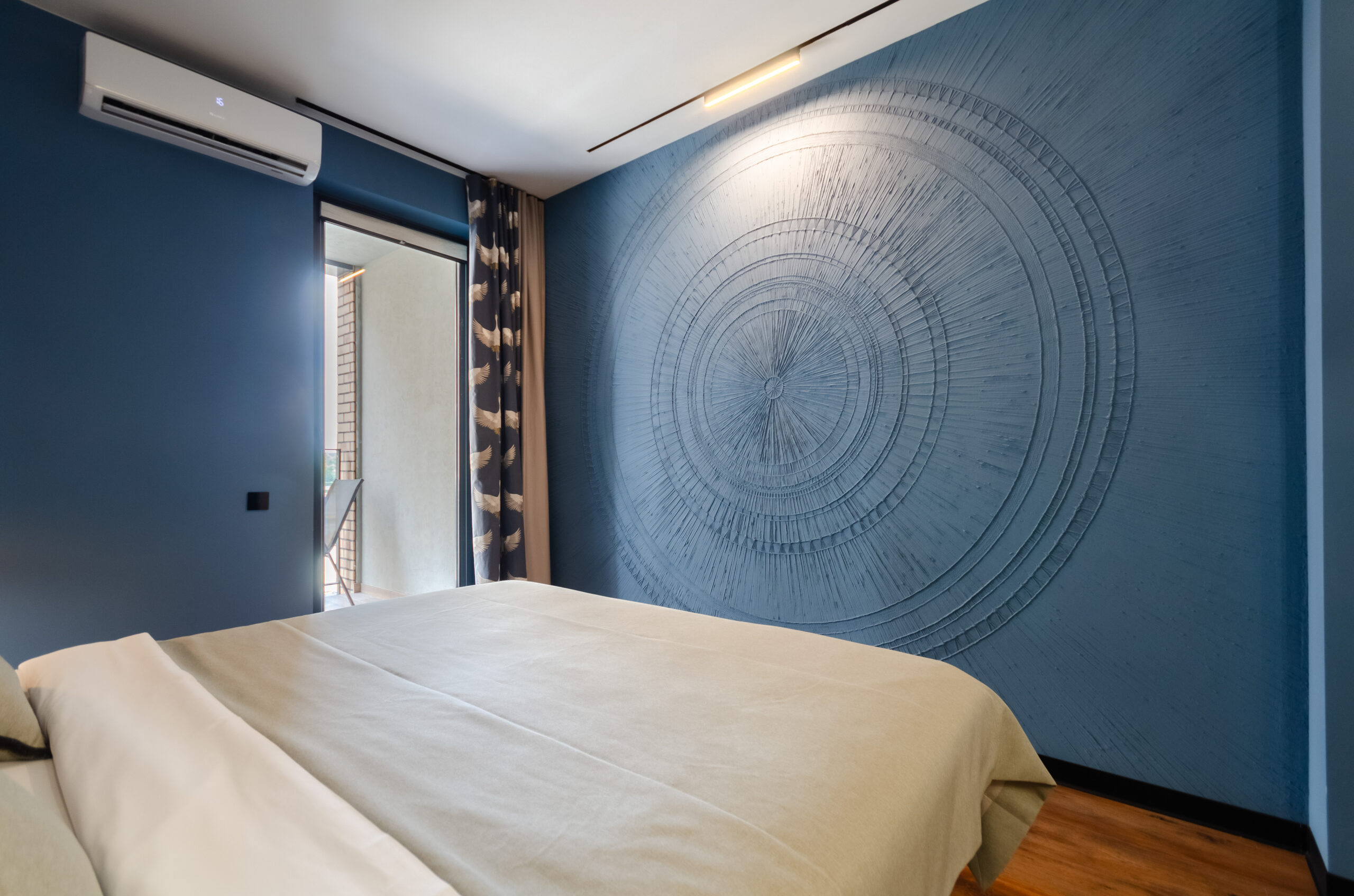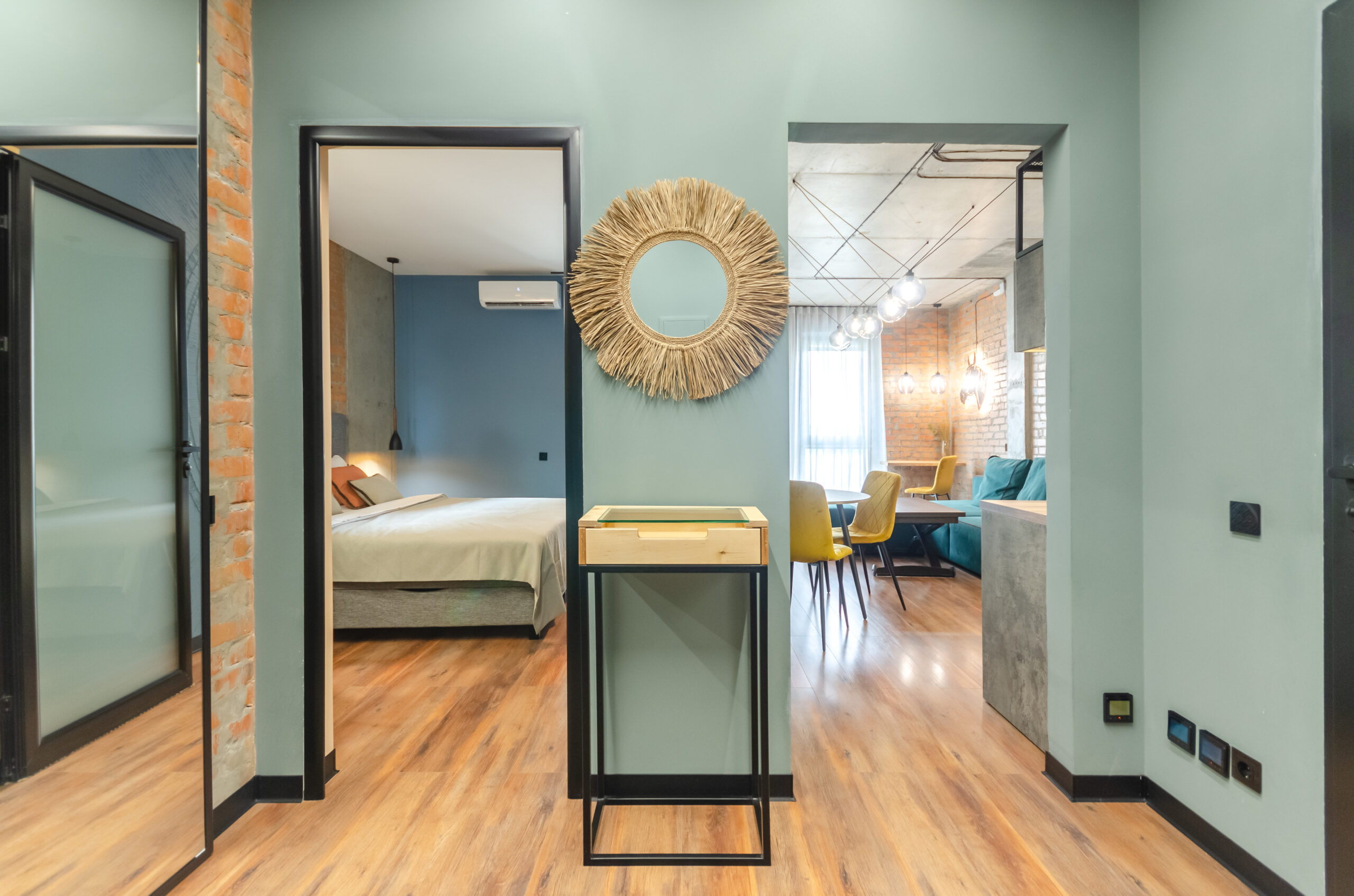 *Living room (divided into zones, including kitchen): sofa bed 160*200 cm, flat screen Smart TV, separate workplace.