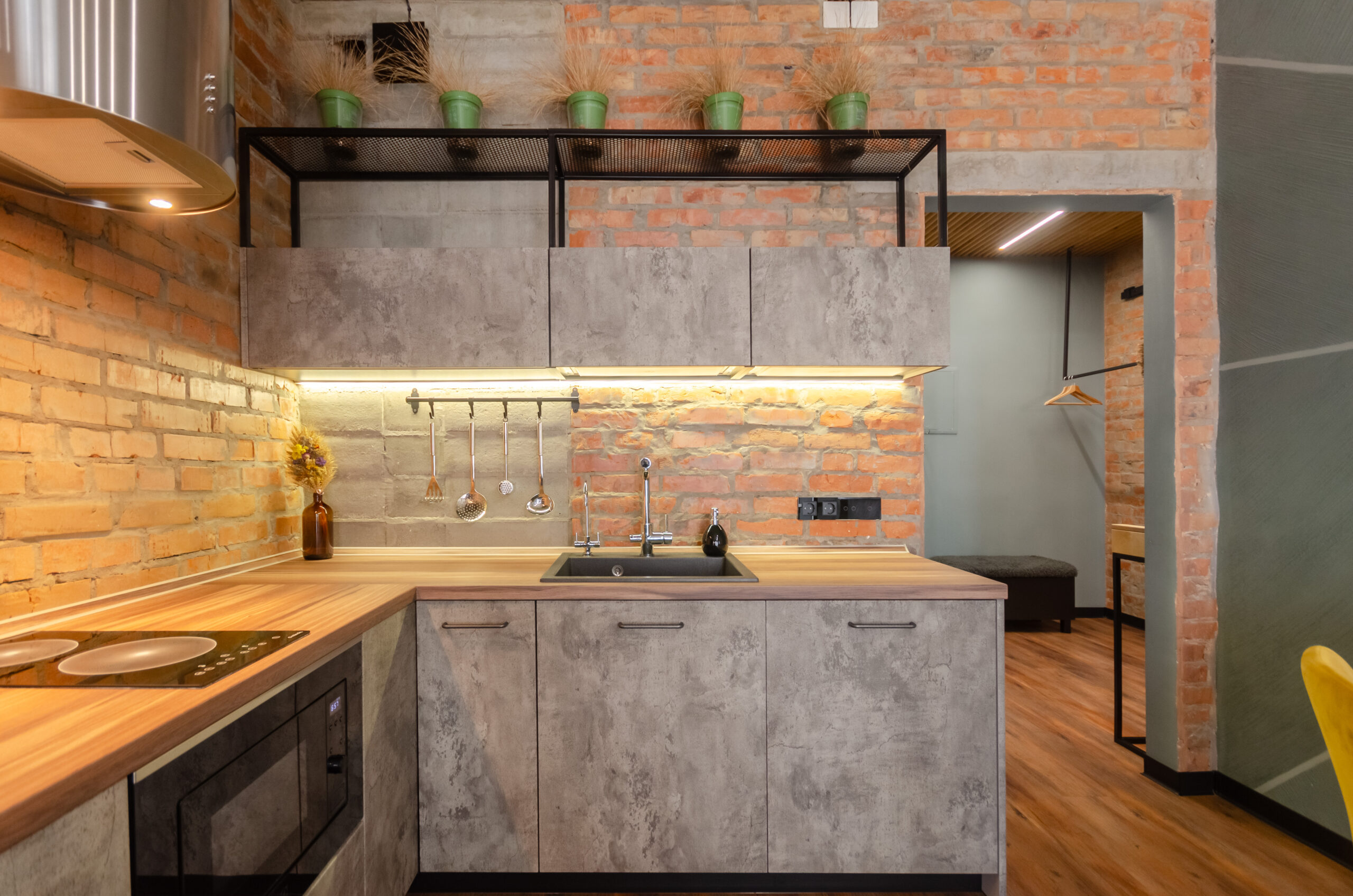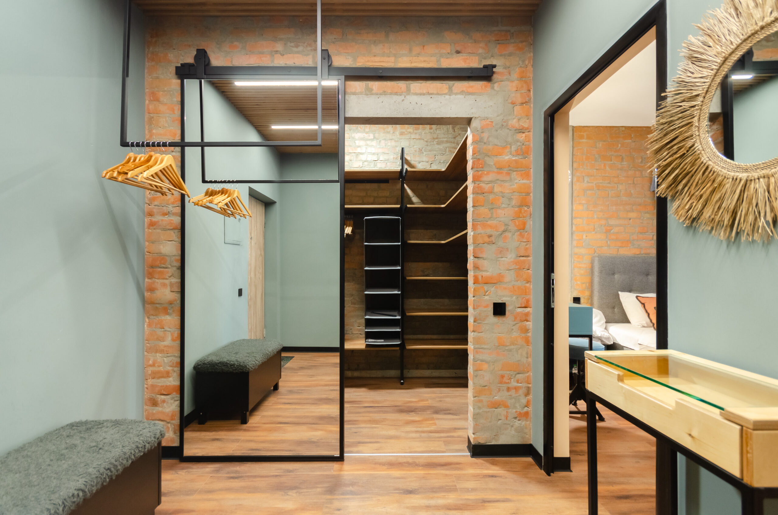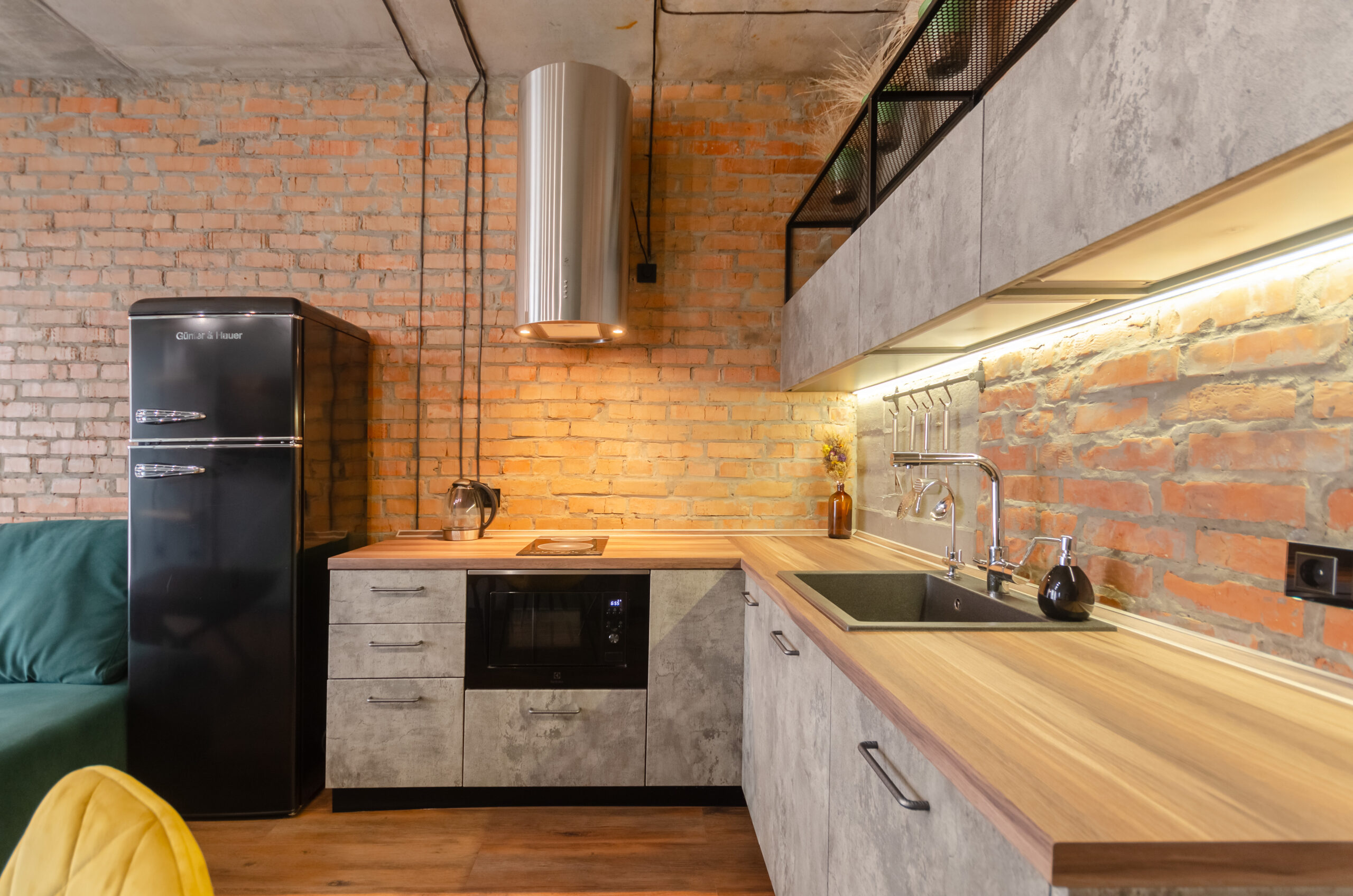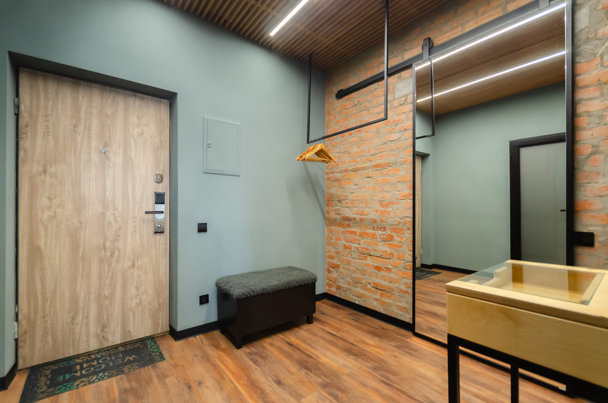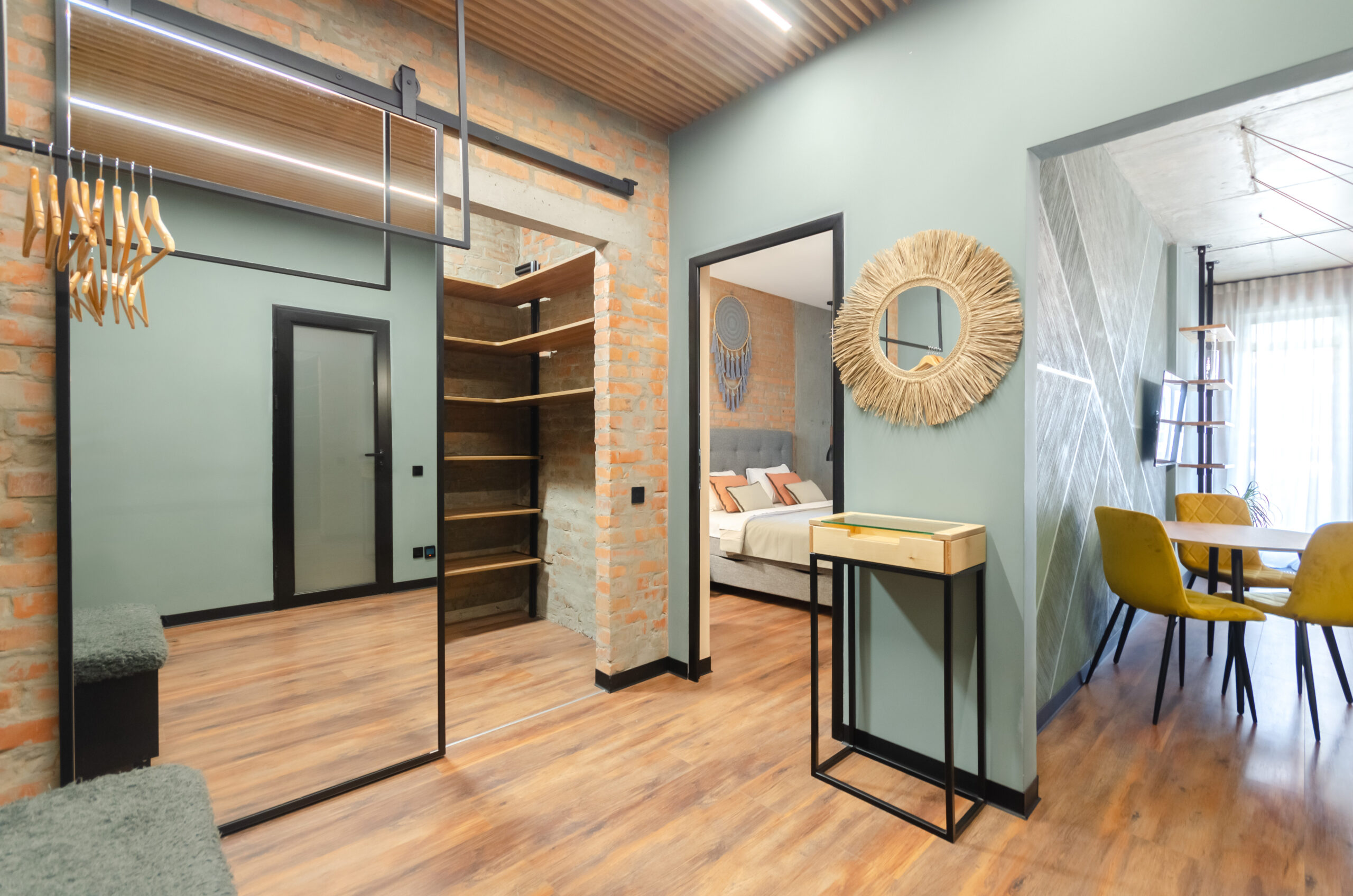 *Living room (divided into zones, including kitchen): sofa bed 160*200 cm, flat screen Smart TV, separate workplace.