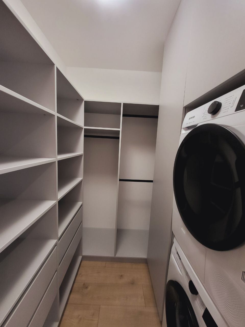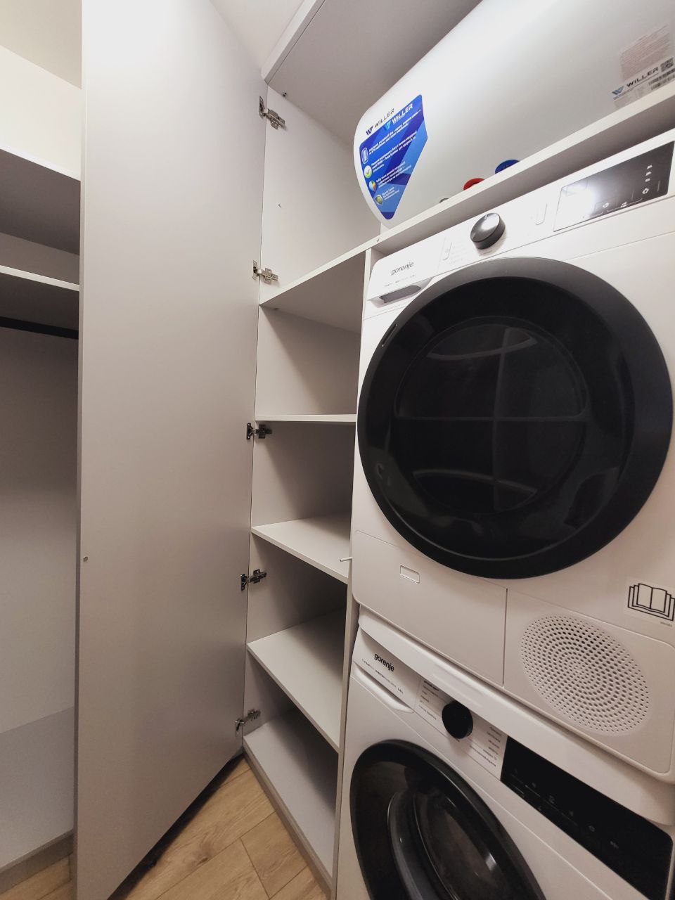 Bathroom: shower cabin, toiletries, towels, hair dryer, washing machine, and dryer.