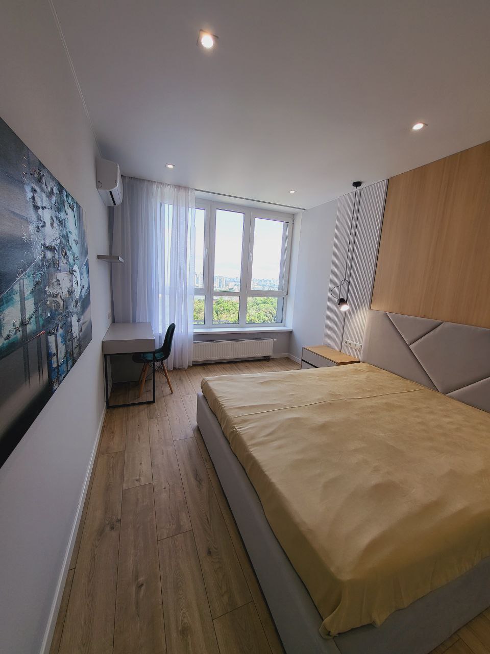 Separate bedroom: bed 1800 × 2000 mm, desk, wardrobe, air conditioner.