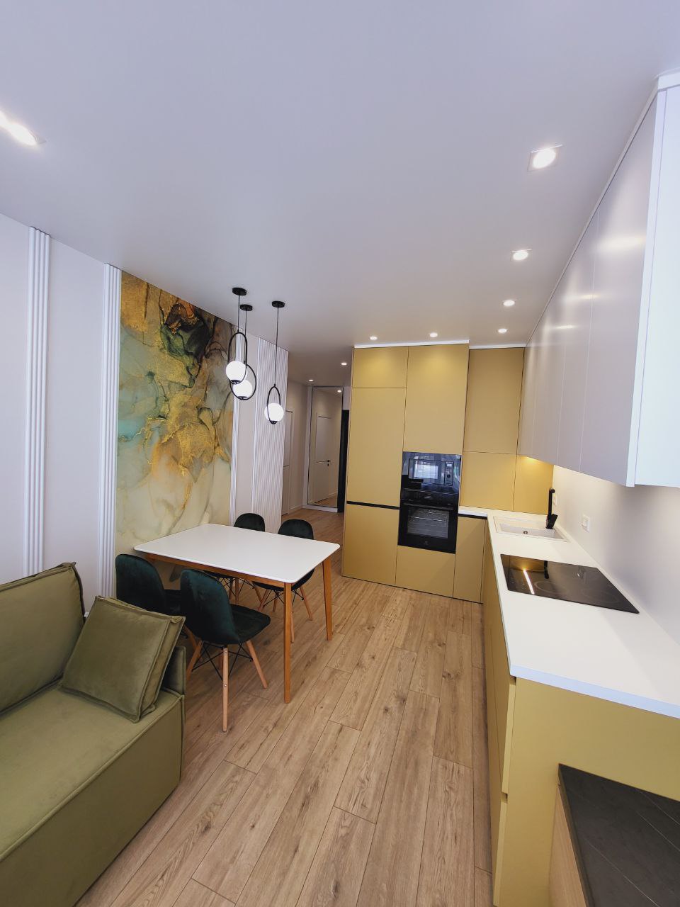Living room (divided into zones, combined with the kitchen): double sofa, flat-screen TV with Smart-TV, air conditioner, kitchen (refrigerator, dishwasher, microwave, electric kettle, electric stove, oven, all necessary utensils, dining table).