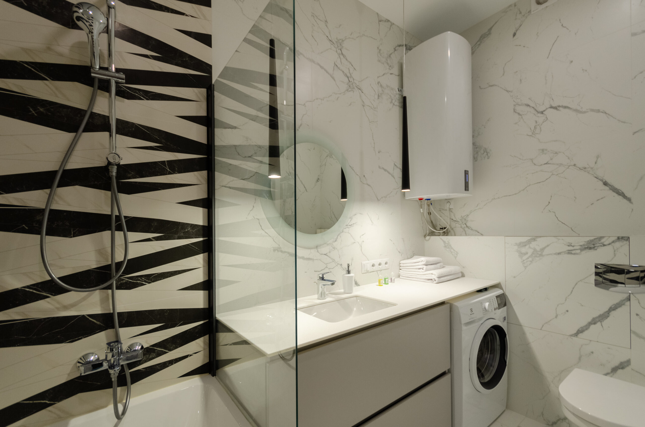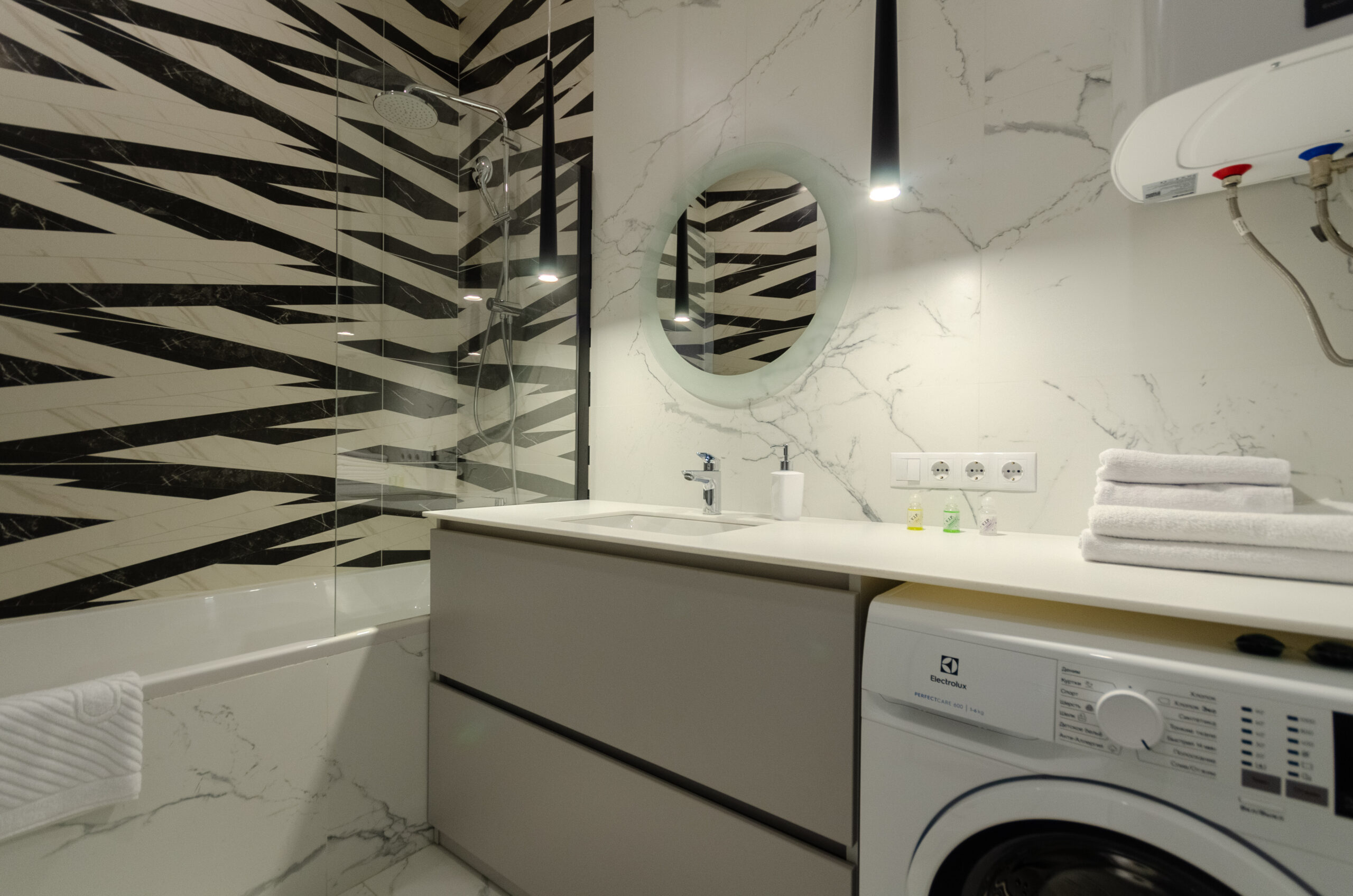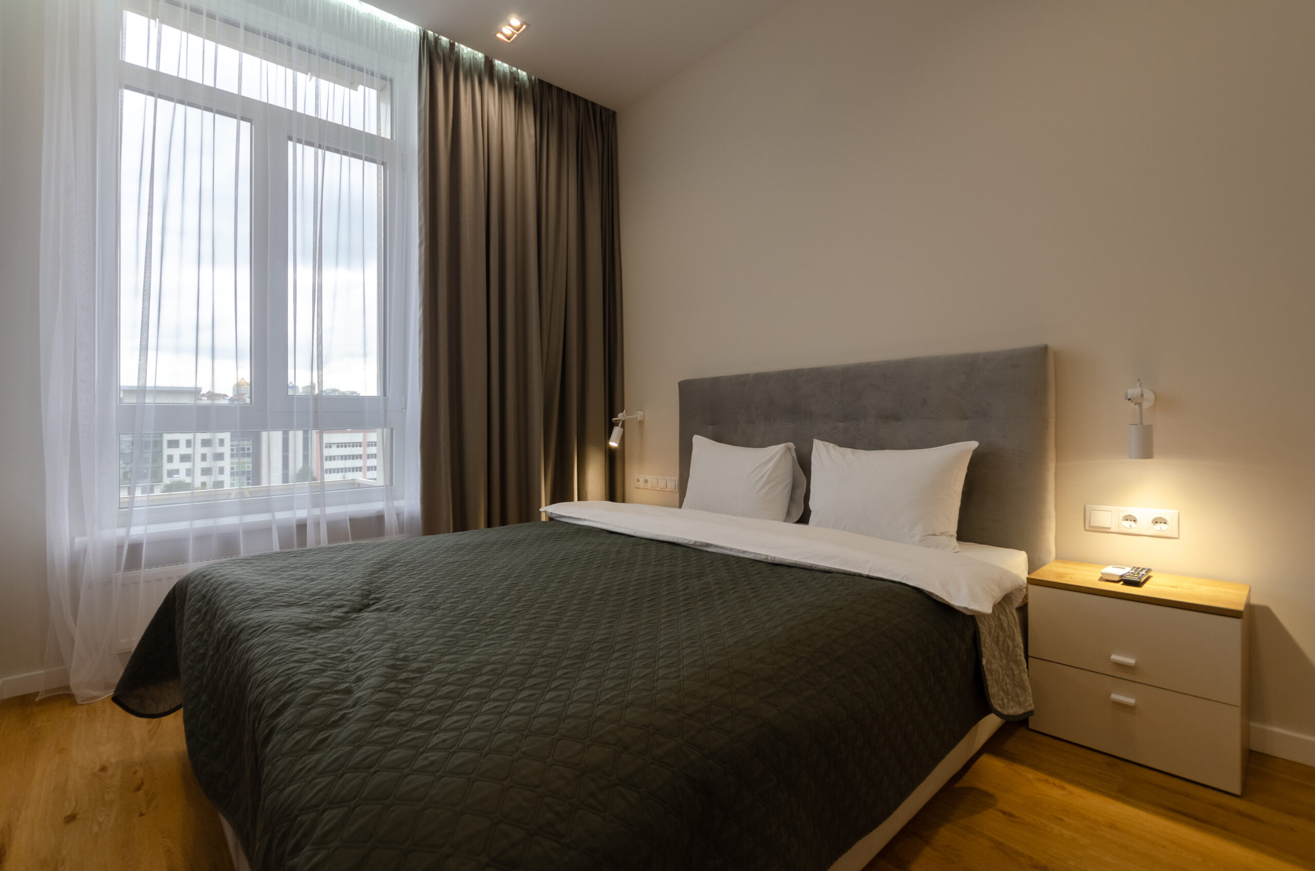 The stylish apartment is located in the city center at 38 Zhemchuzhina residential complex, 68 Zhilyanska Street. The complex has 24-hour security. One of the best houses in Kyiv. The city center, a beautiful elite area. Great view from the window. There is an underground parking lot in the building. Free parking on the street and in the yard.