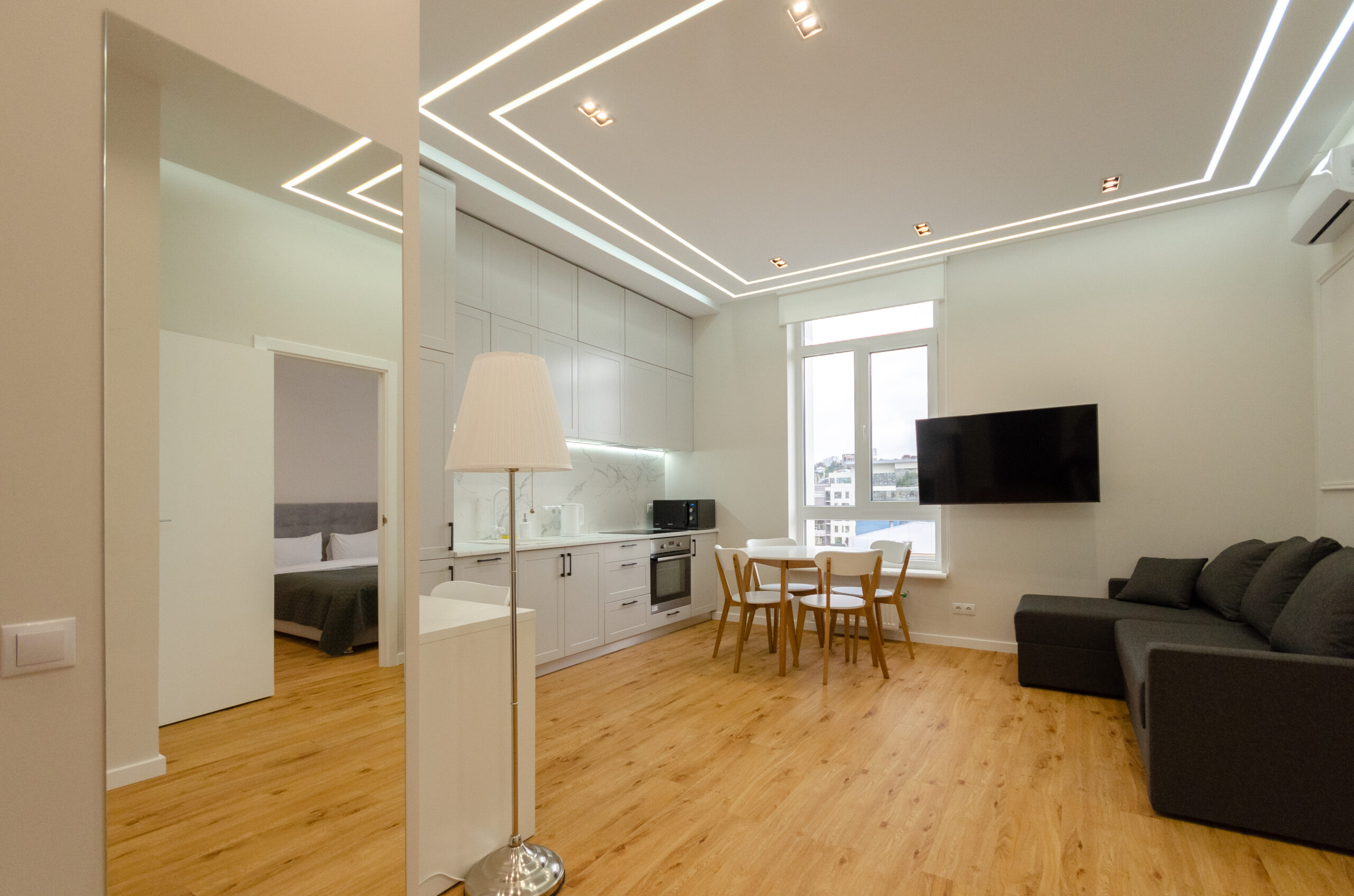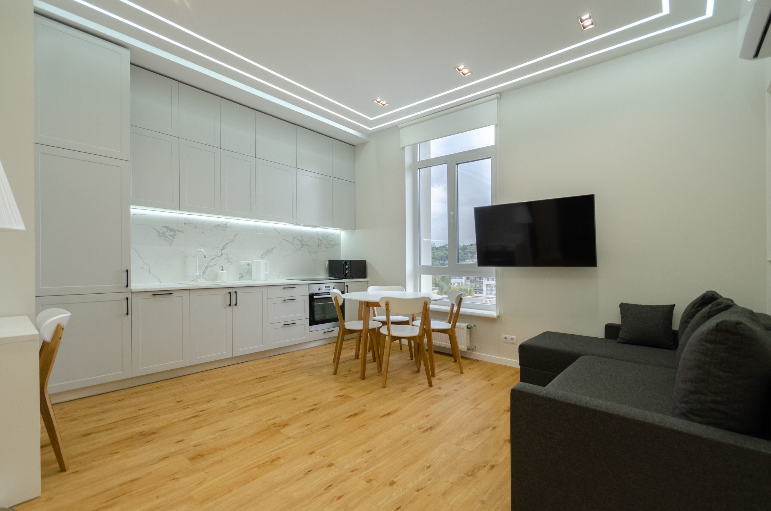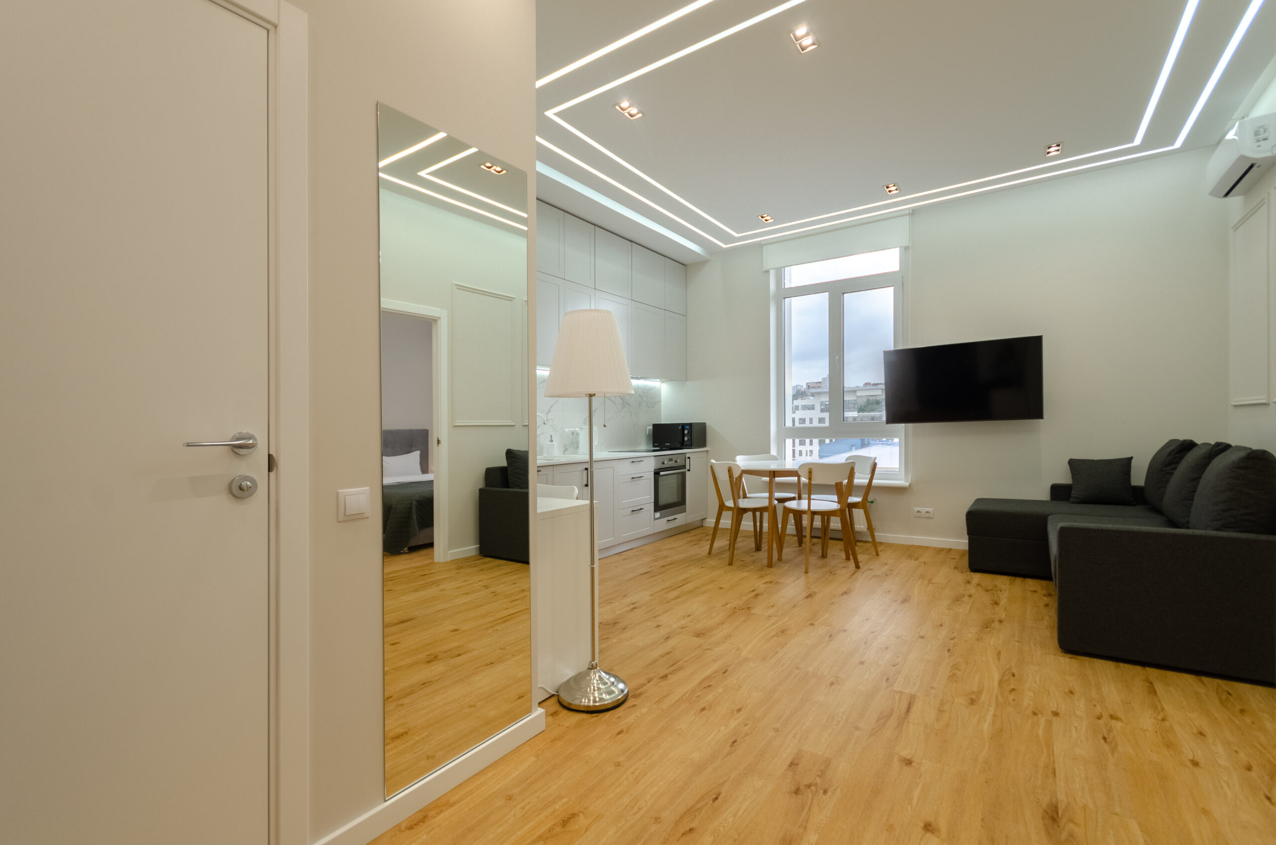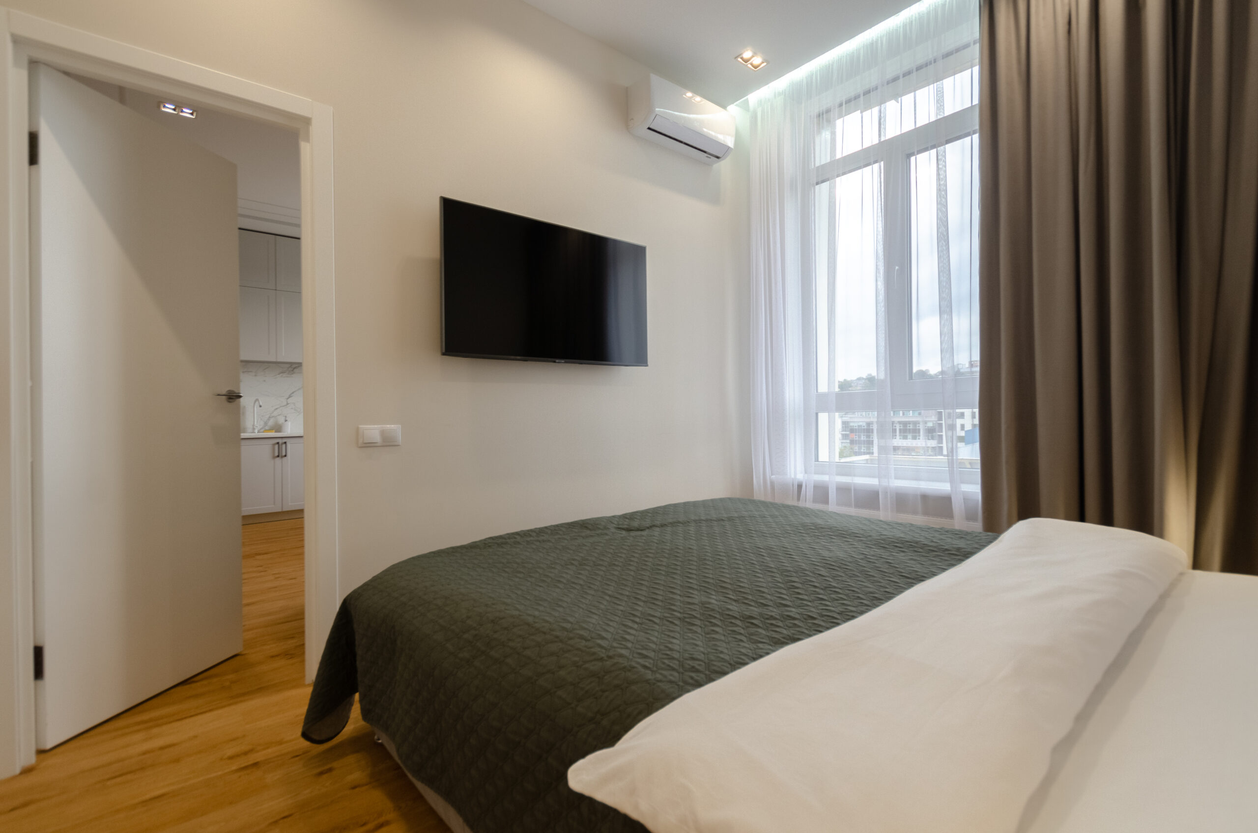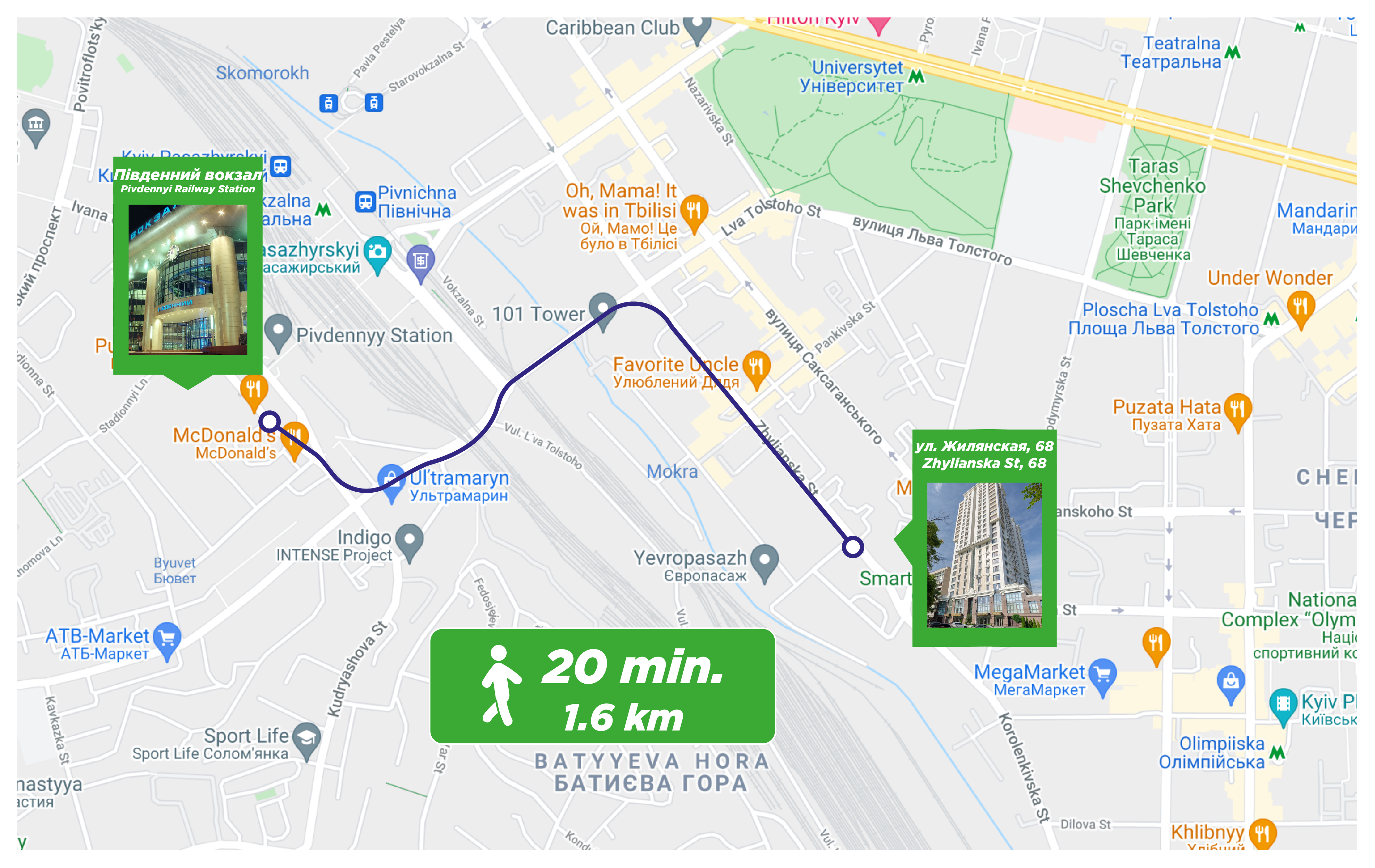 To all necessary infrastructure – only 4 minutes of wakk (350 m): restaurants, cafes, bars, food delivery, banks, pharmacies, boutiques. There are many boutiques, restaurants, banks, shops, entertainment venues and attractions nearby. Gulliver Shopping Center and Mega Market, Botanical Garden and KNU Square.