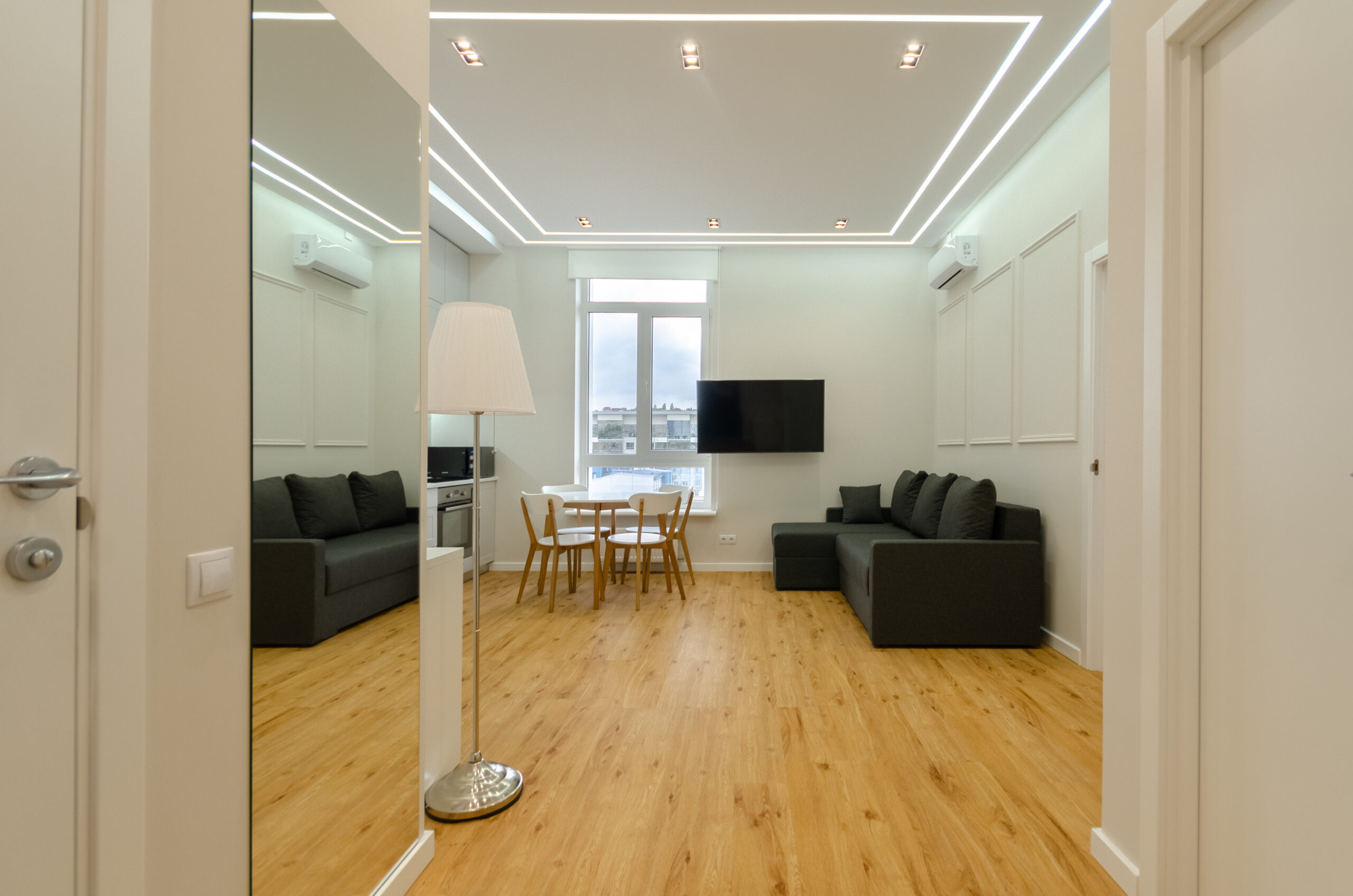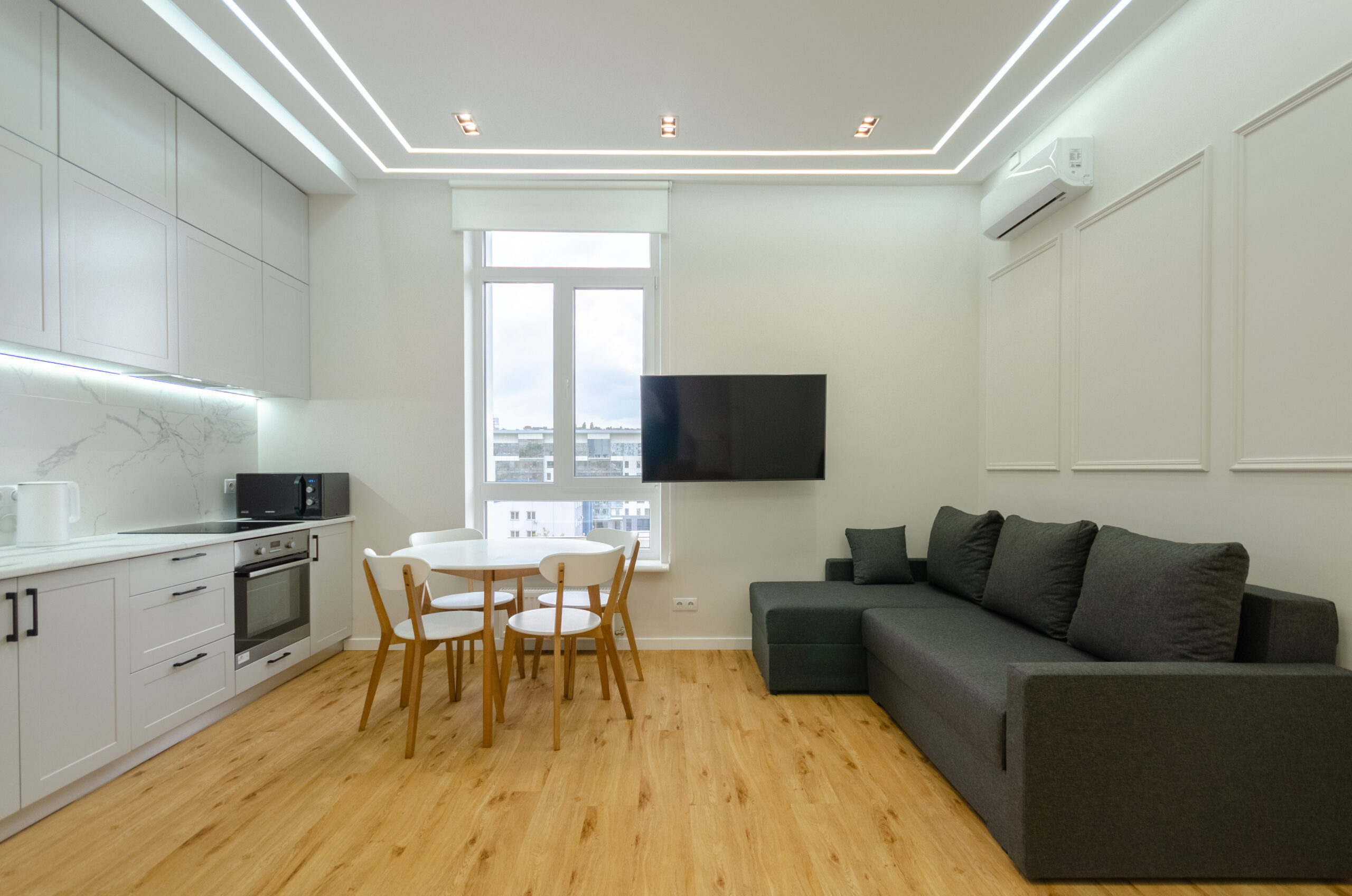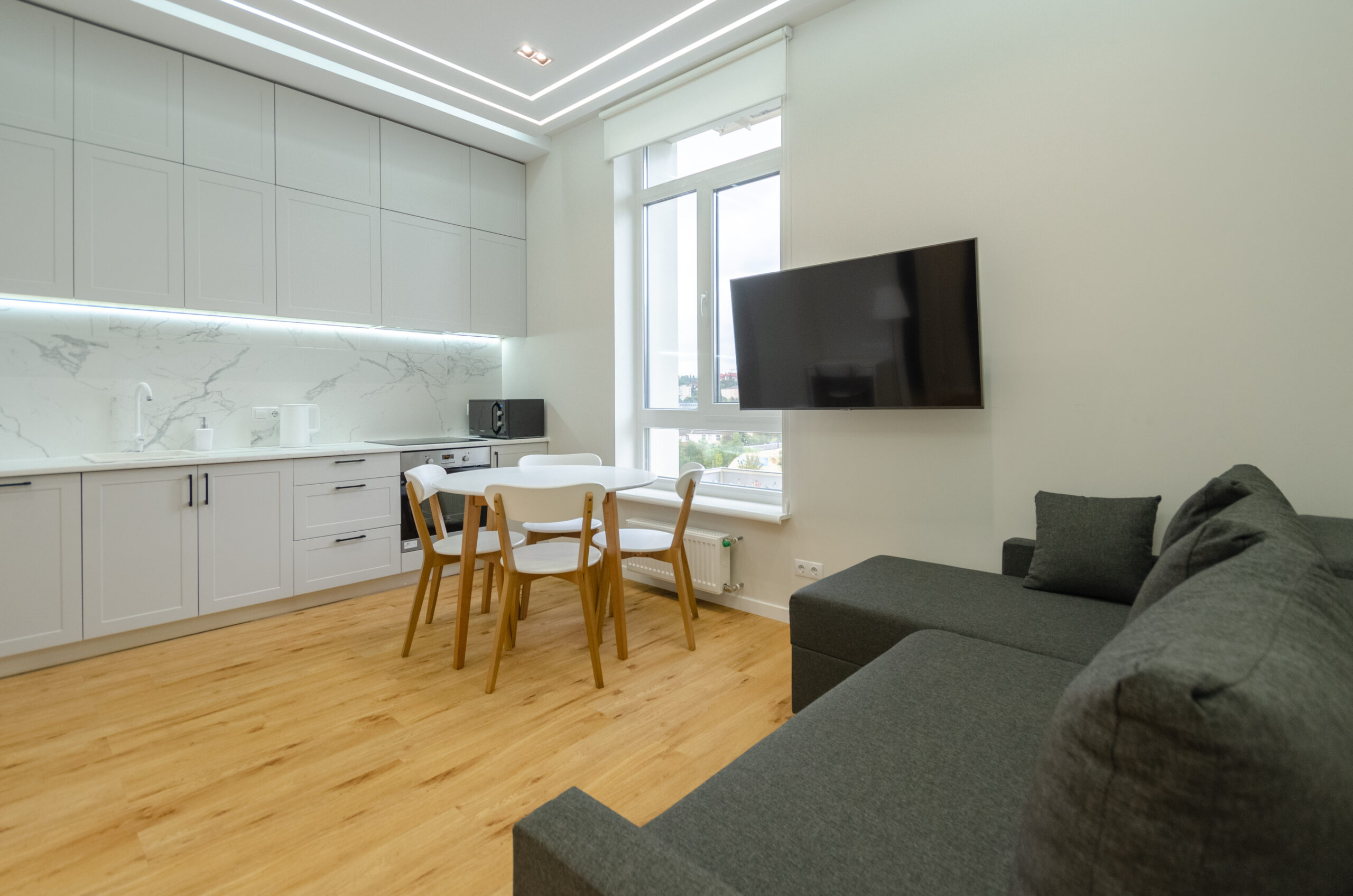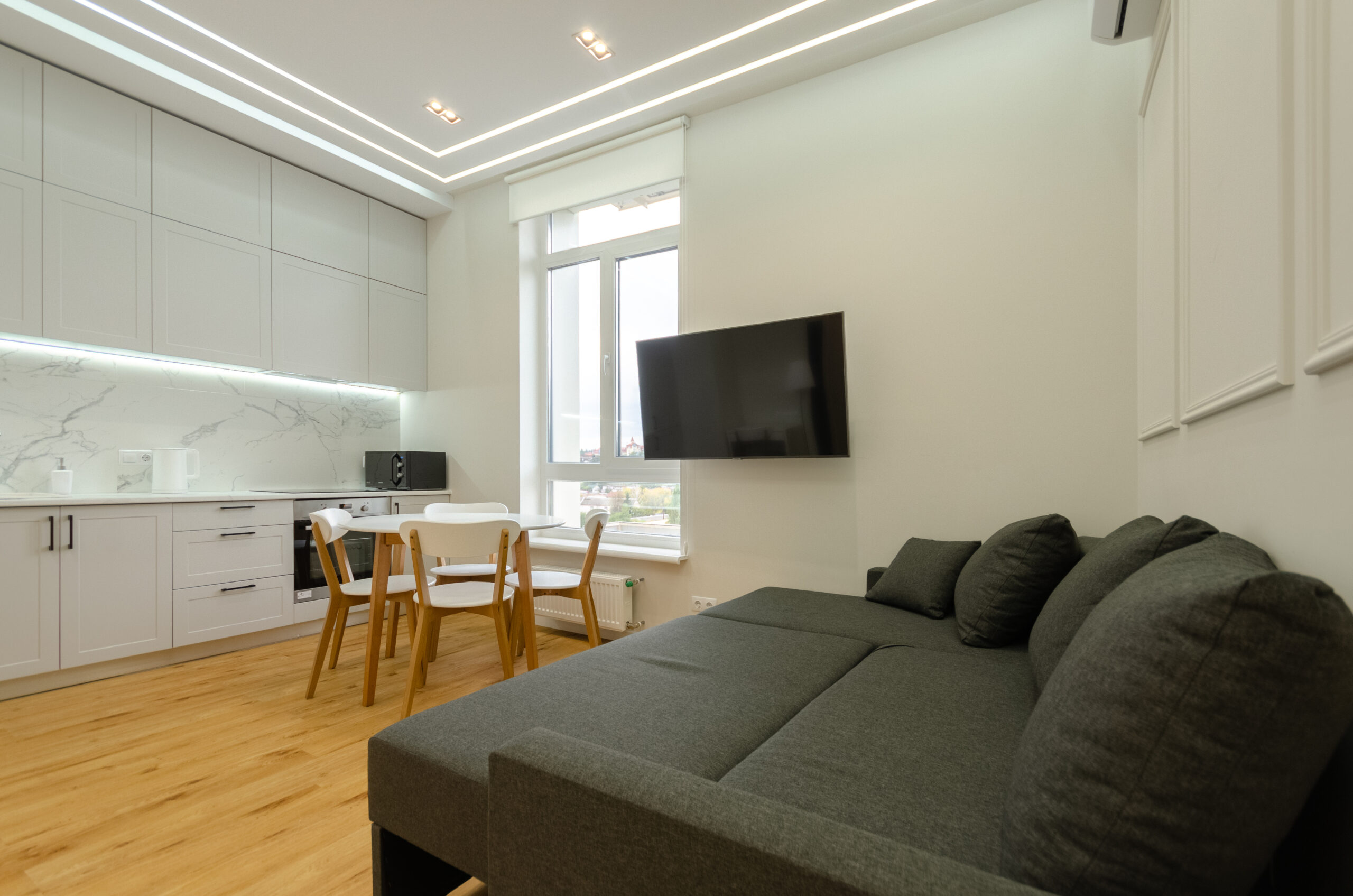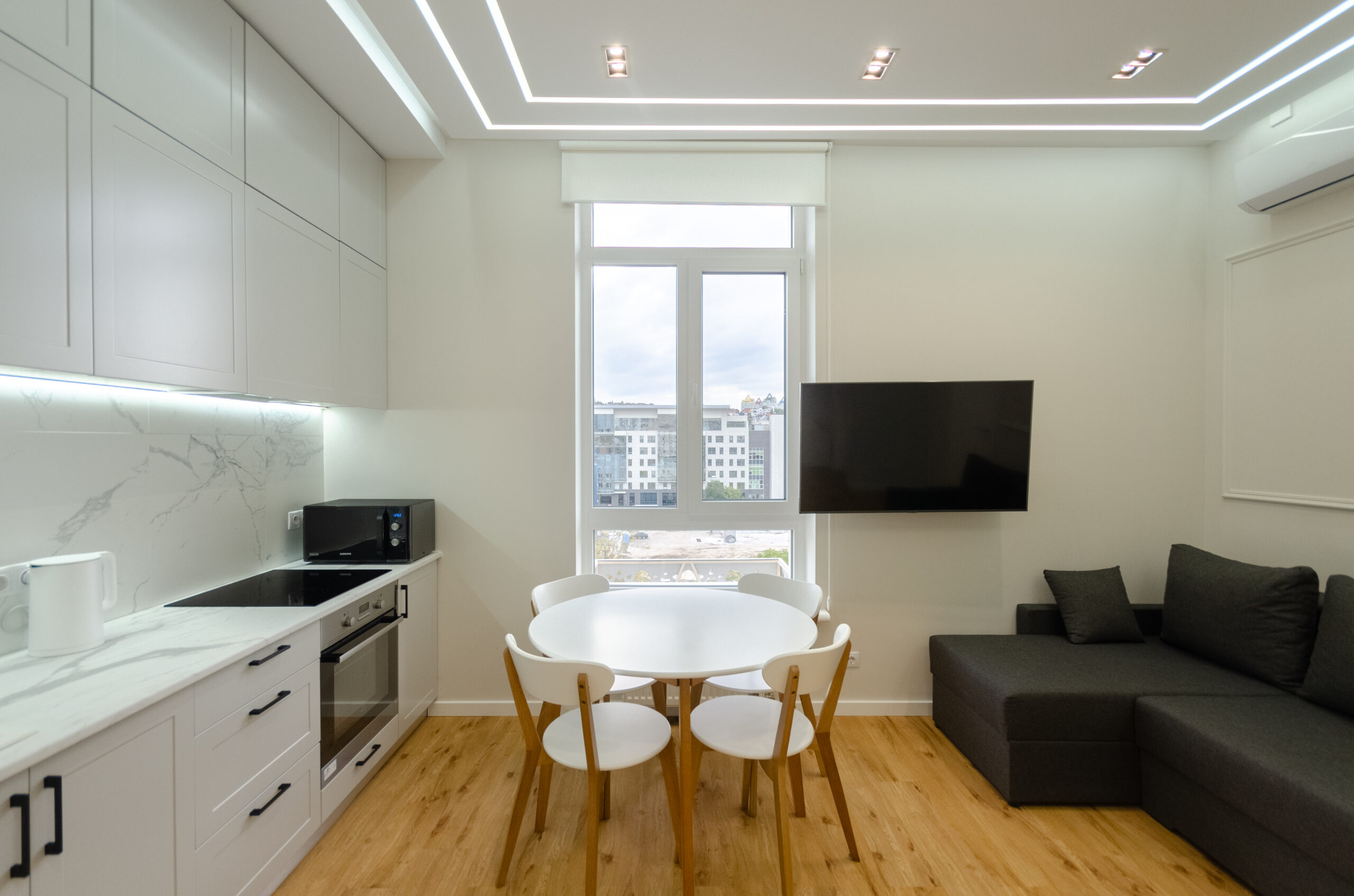 To all necessary infrastructure – only 4 minutes of wakk (350 m): restaurants, cafes, bars, food delivery, banks, pharmacies, boutiques. There are many boutiques, restaurants, banks, shops, entertainment venues and attractions nearby. Gulliver Shopping Center and Mega Market, Botanical Garden and KNU Square.