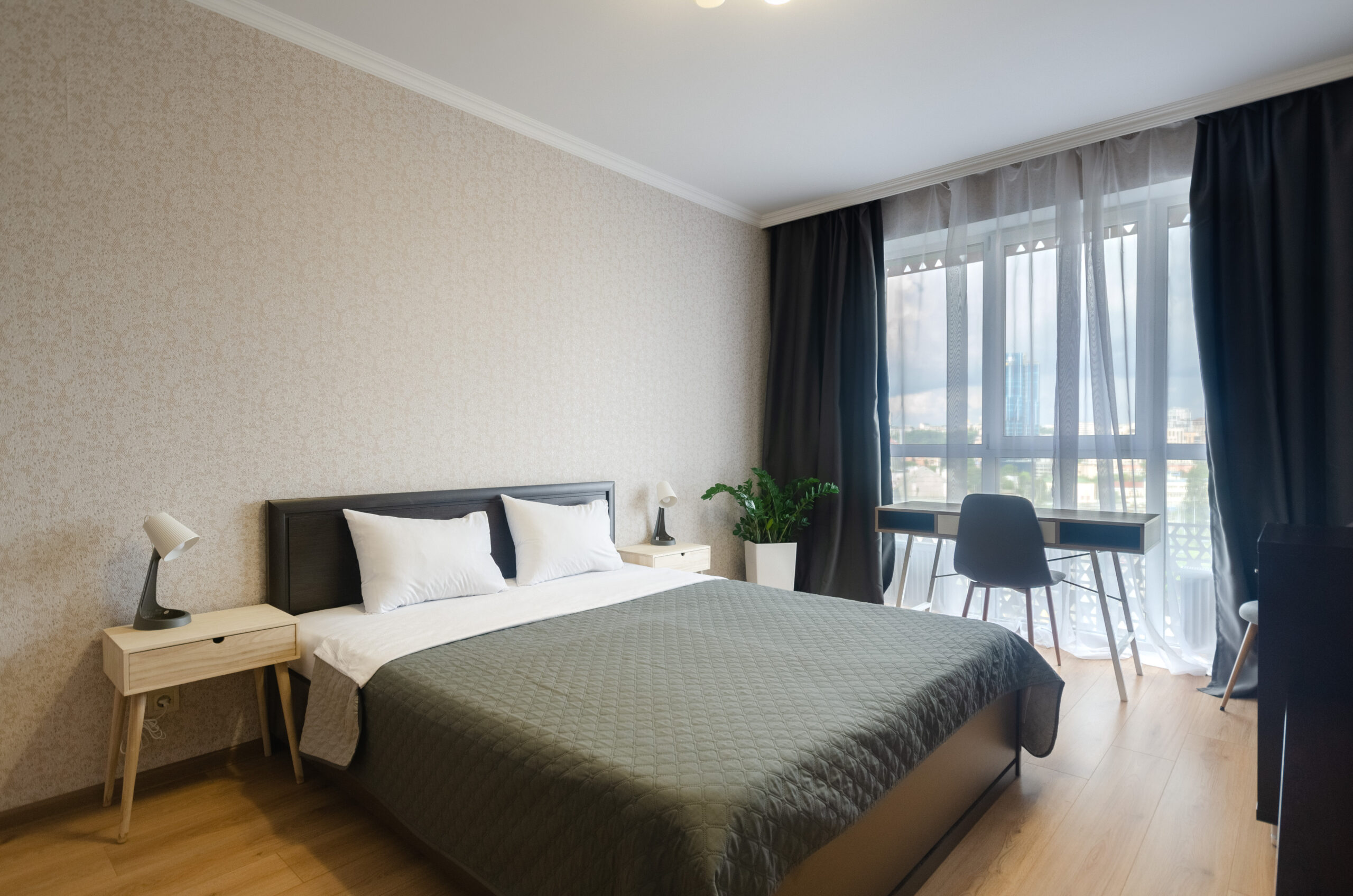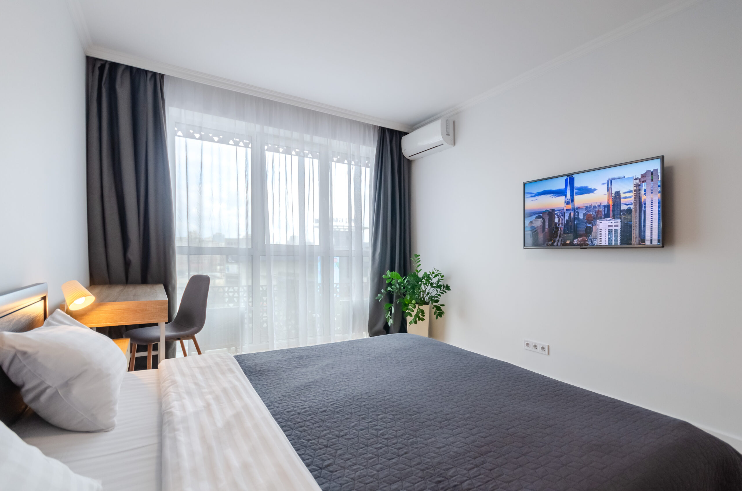 The apartment is located on the 7th floor, has an area of 55 m2, has a separate bedroom with a panoramic view, a living room with a small kitchen and a bathroom.It is fully equipped with everything necessary for a comfortable stay for any period.