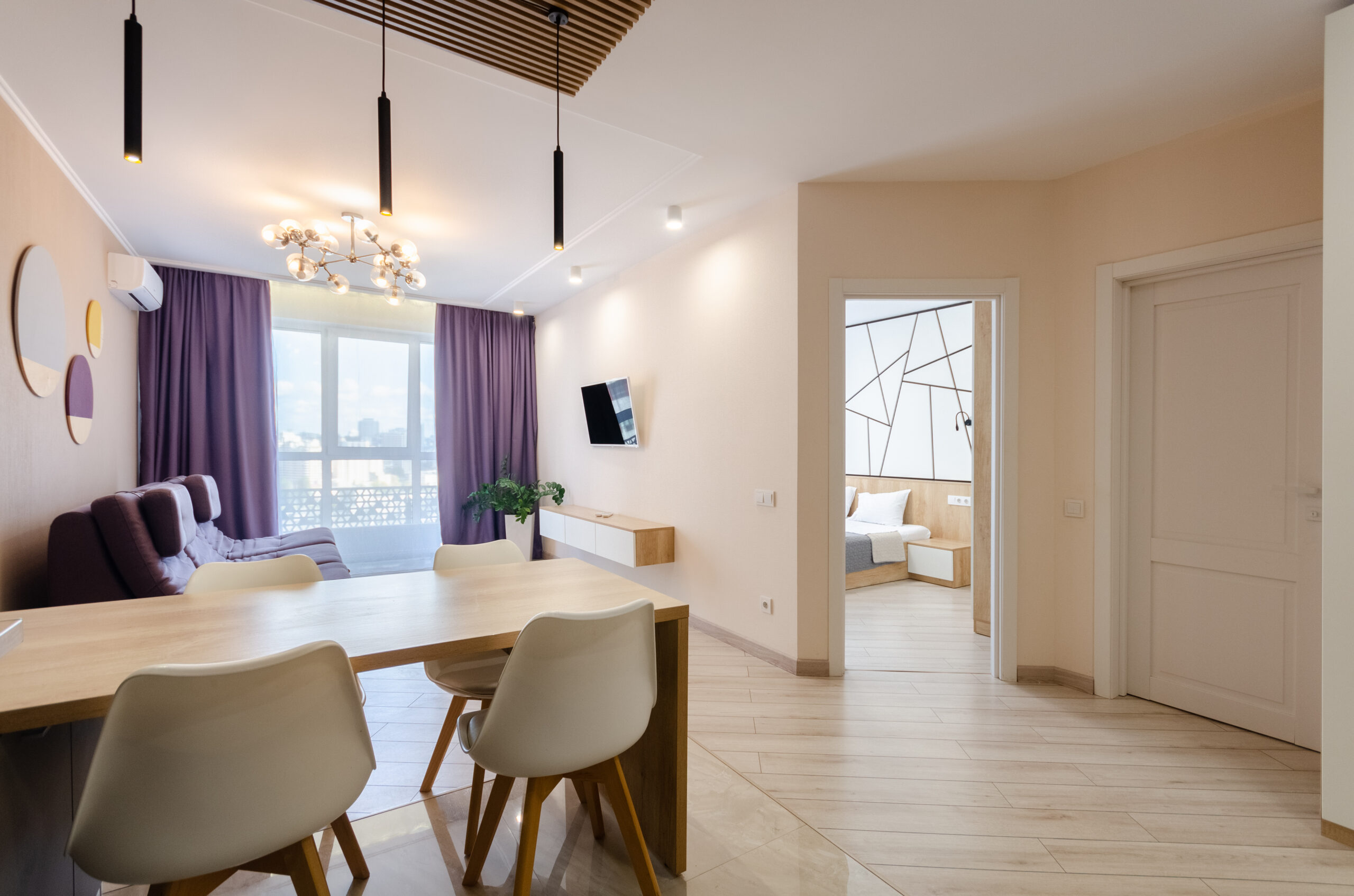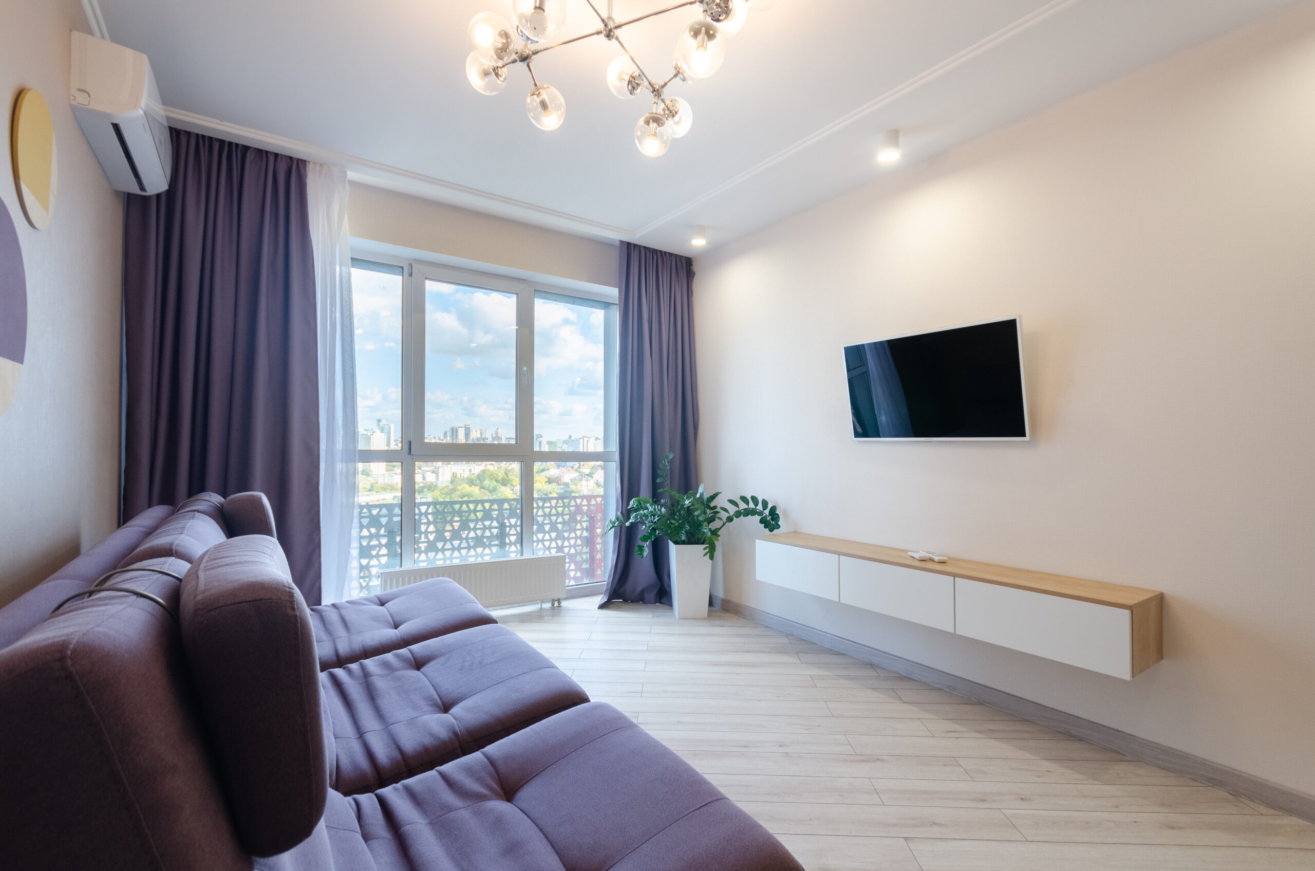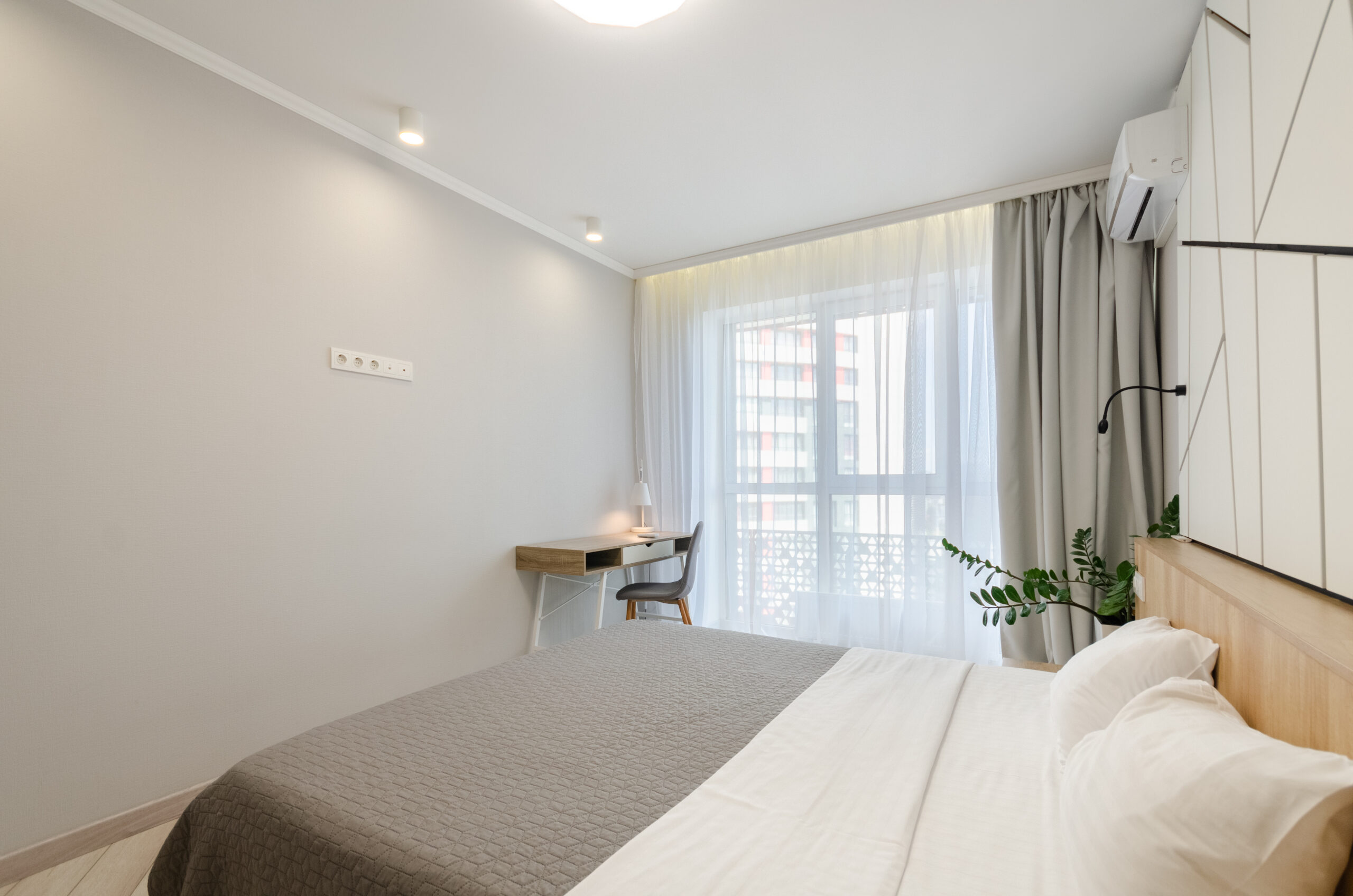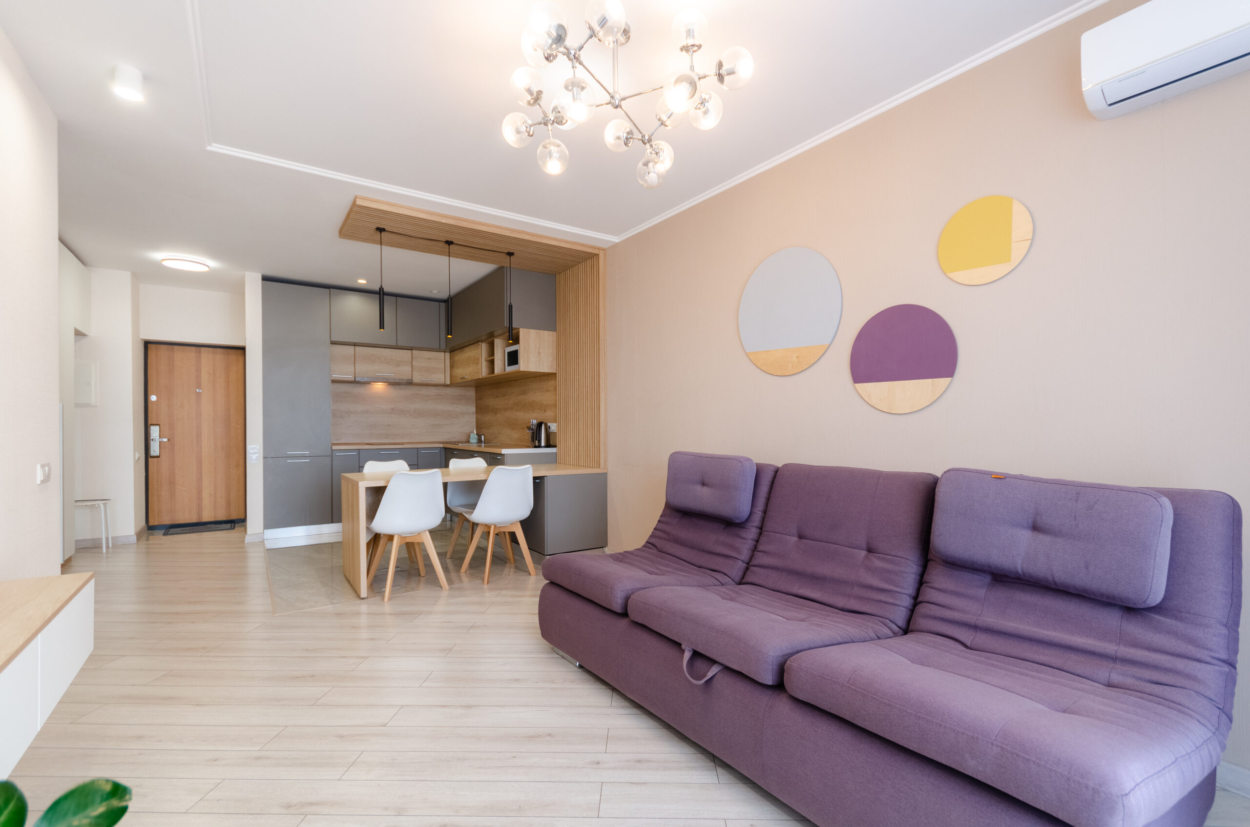 Stylish and modern apartment in the center of Kyiv in the business-class Kvartet residential complex with a view of Kyiv. The complex has round-the-clock security. There is an underground parking lot in the building. Convenient planning. A large, beautiful reception area, access system based on IP cards.