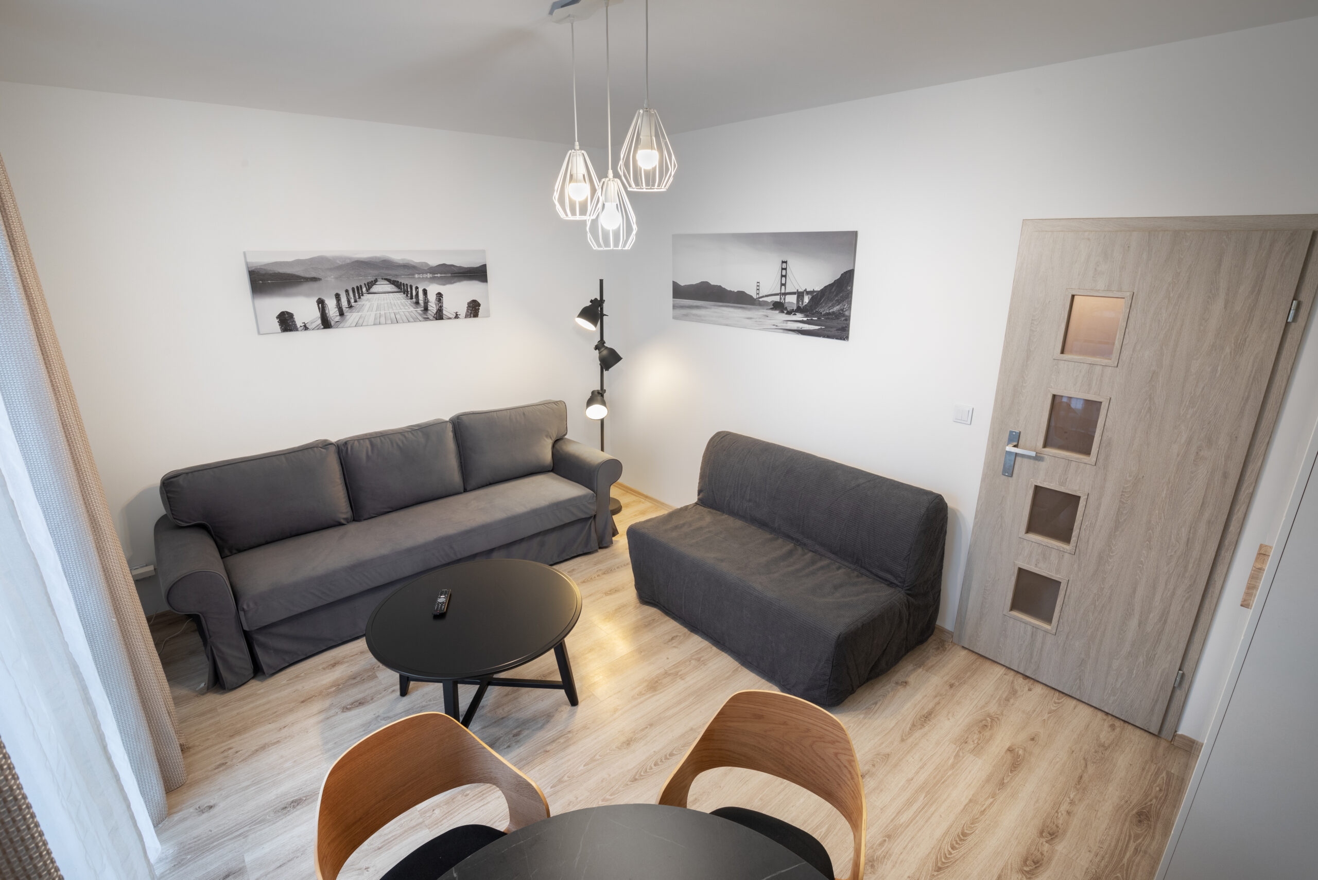 *living room (2 sofas 1600 x 2000 mm, table with 4 comfortable chairs, smart TV, coffee table, wardrobe);