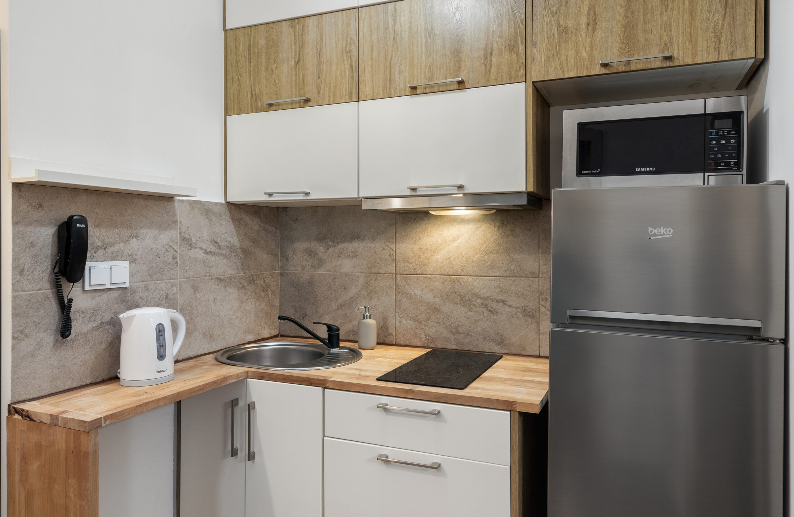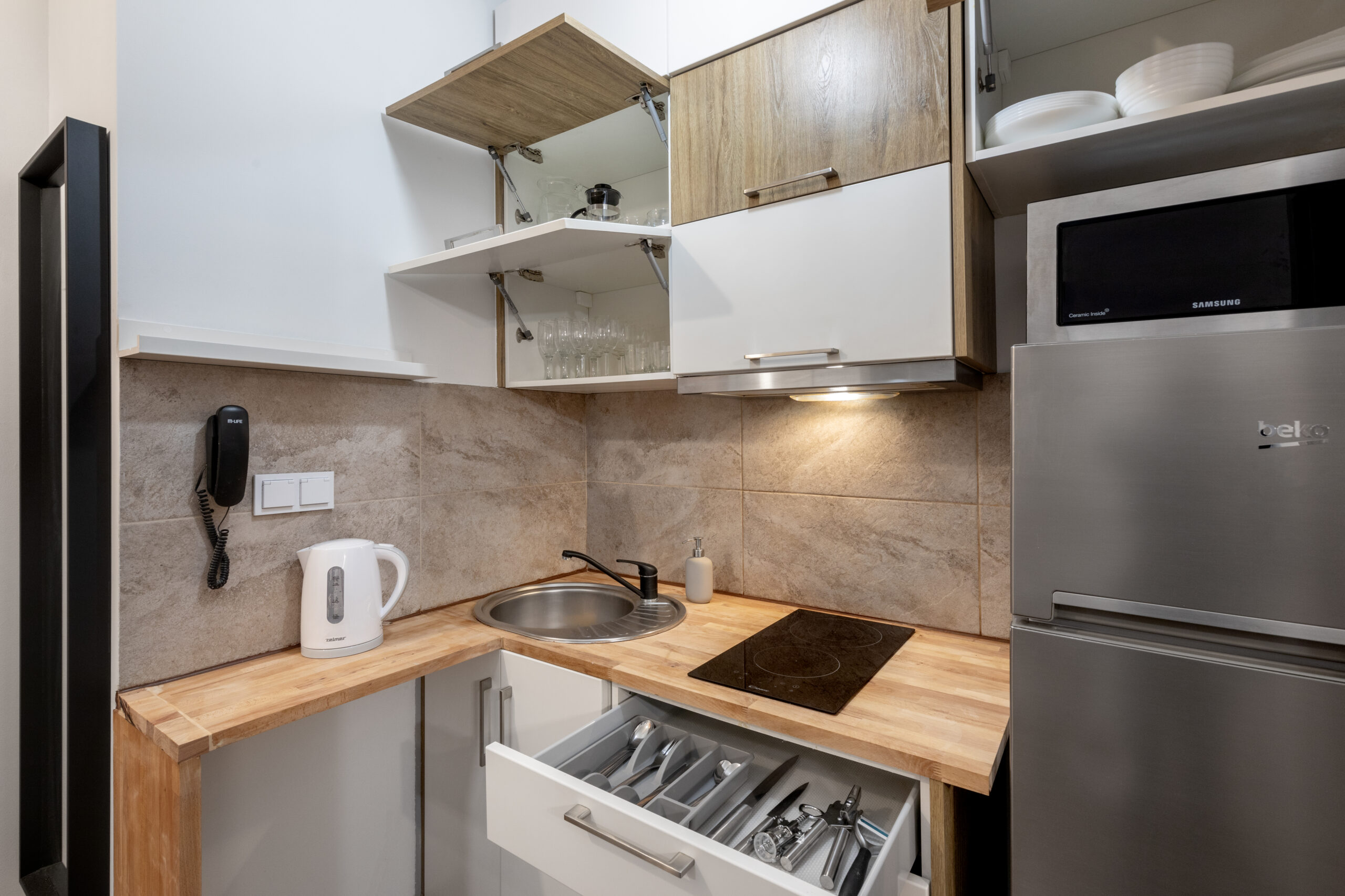 *kitchen area: (refrigerator, microwave oven, kettle, electric stove, pots, pans, all necessary dishes, cups, glasses).