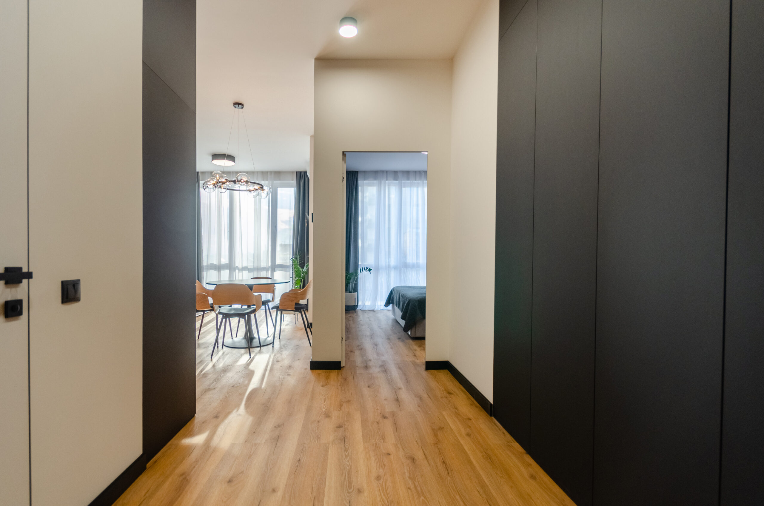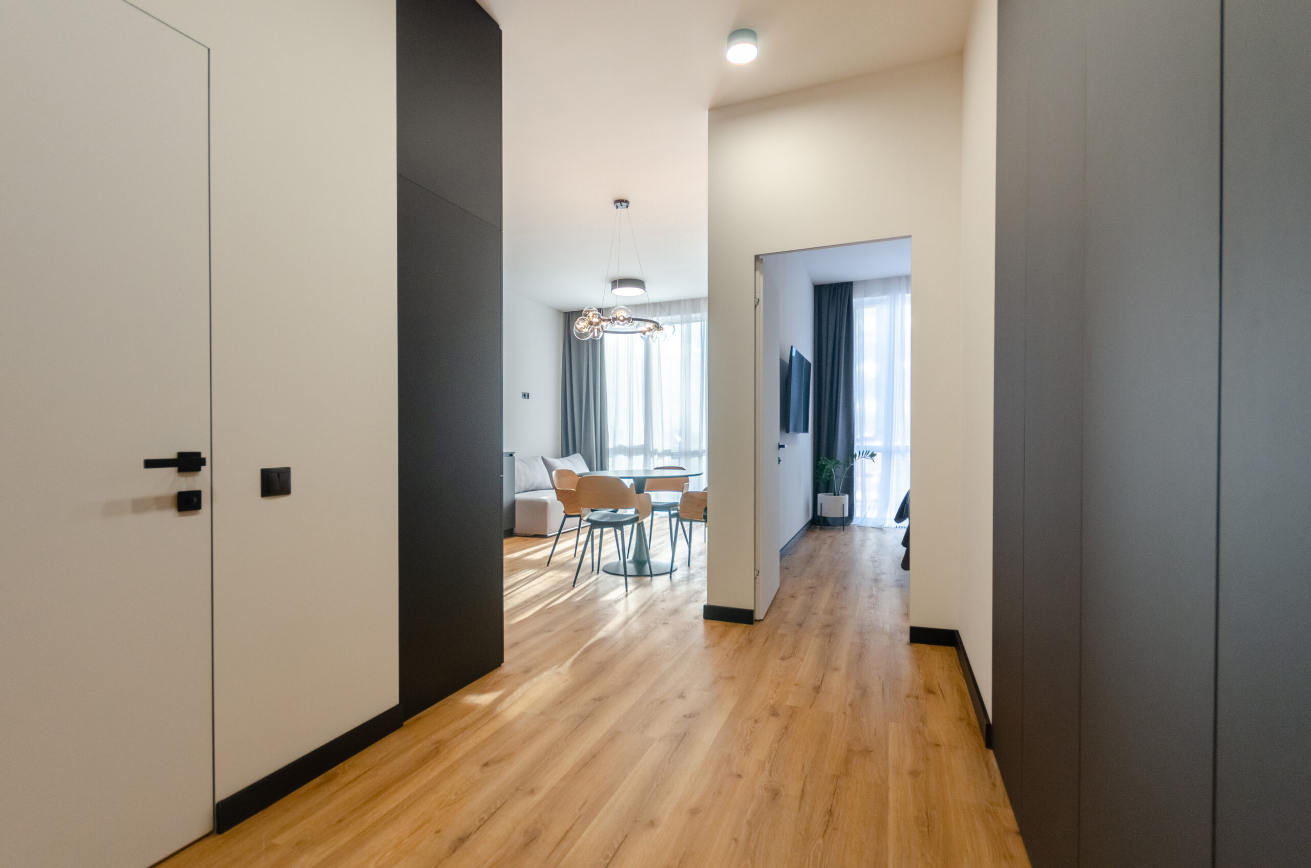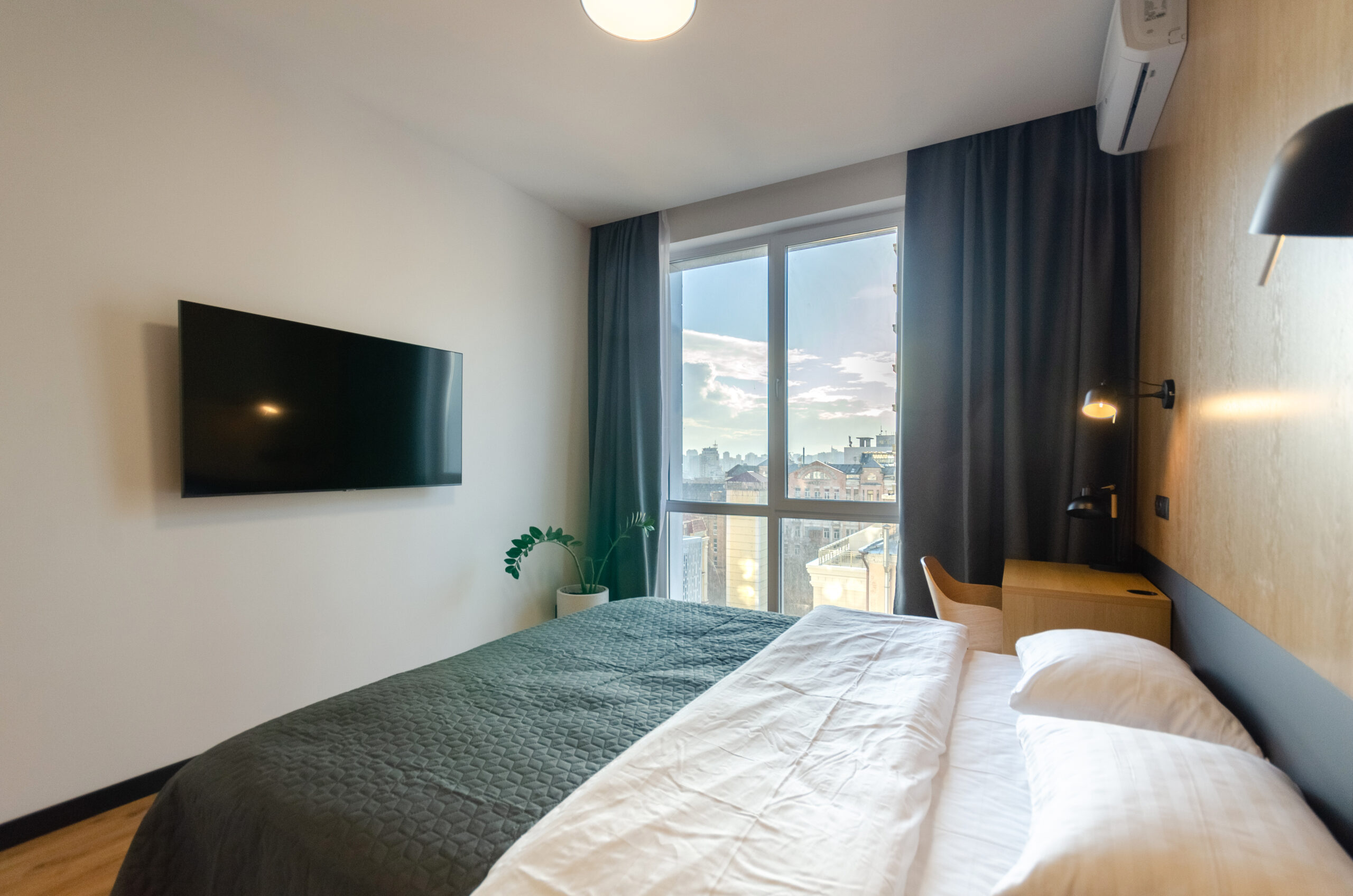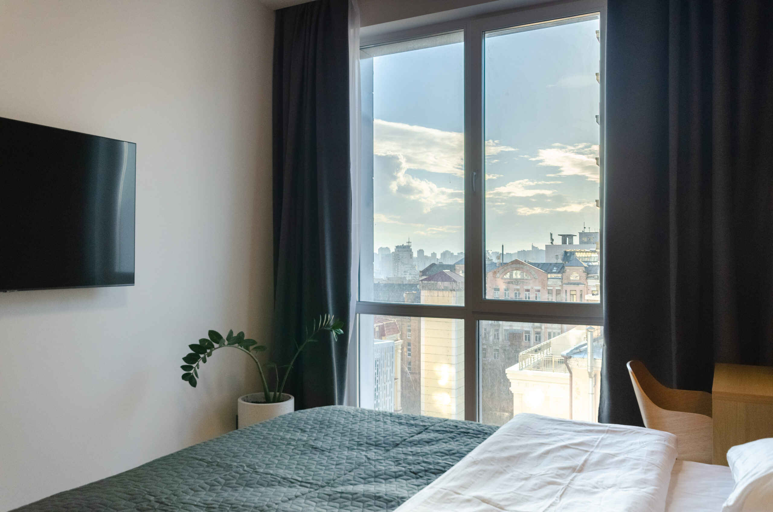 The apartment is located on the 6th floor, has an area of 50 m2, has a separate bedroom, a living room-kitchen with a panoramic view of Kyiv and a bathroom.