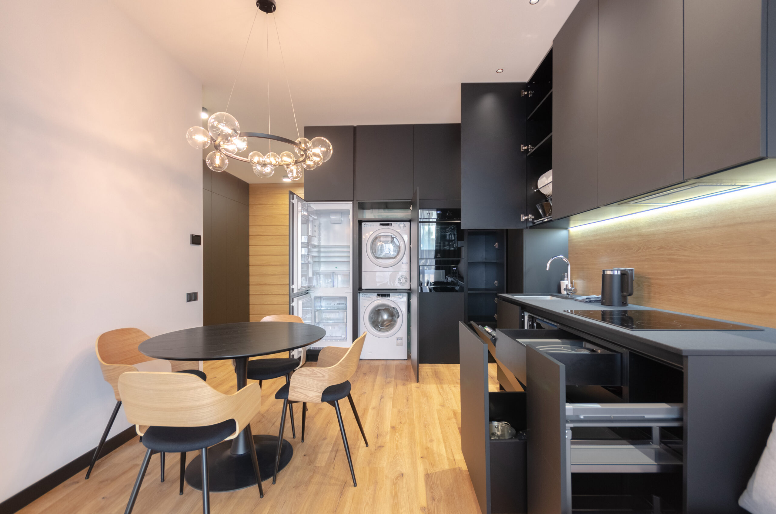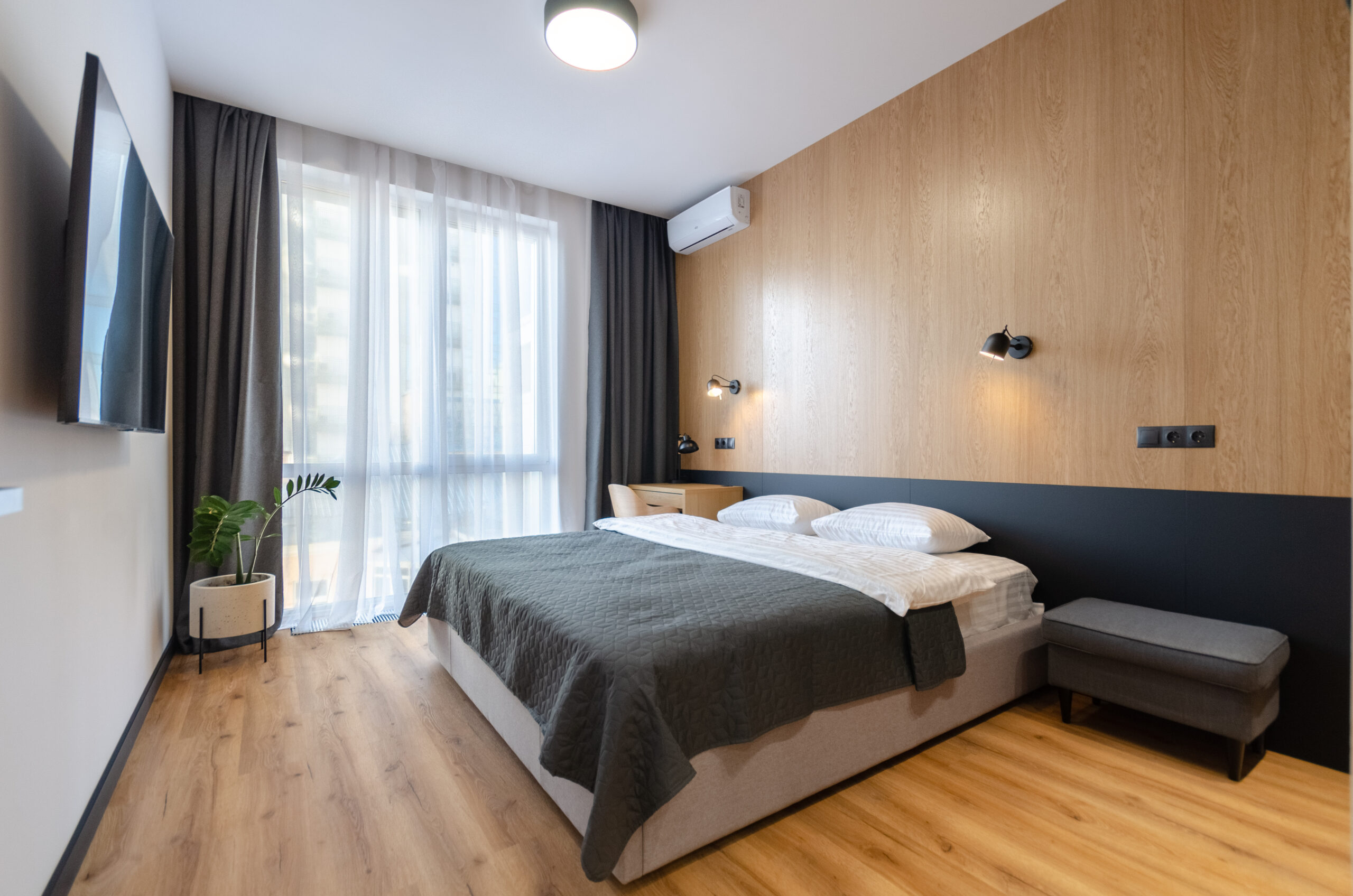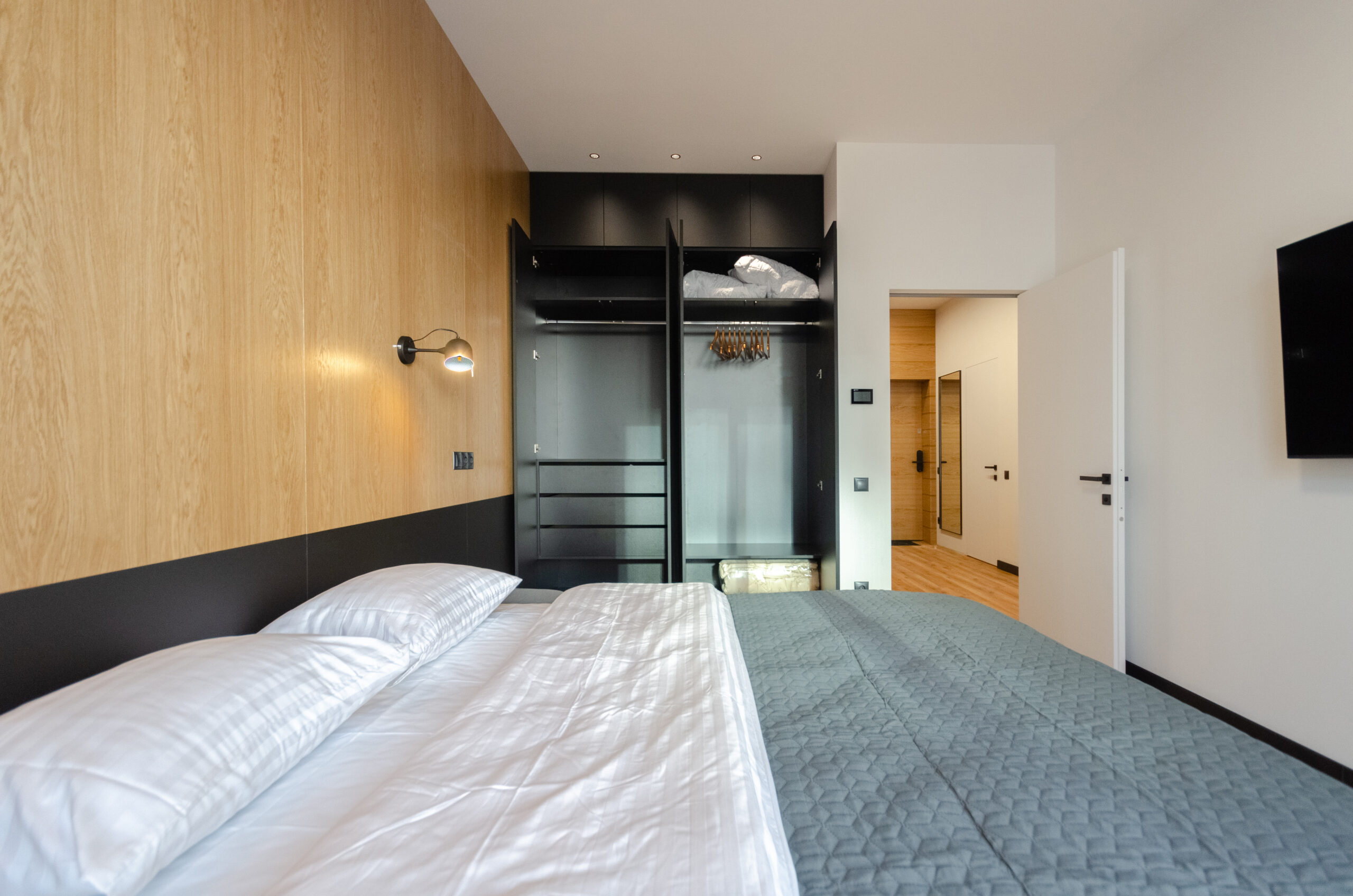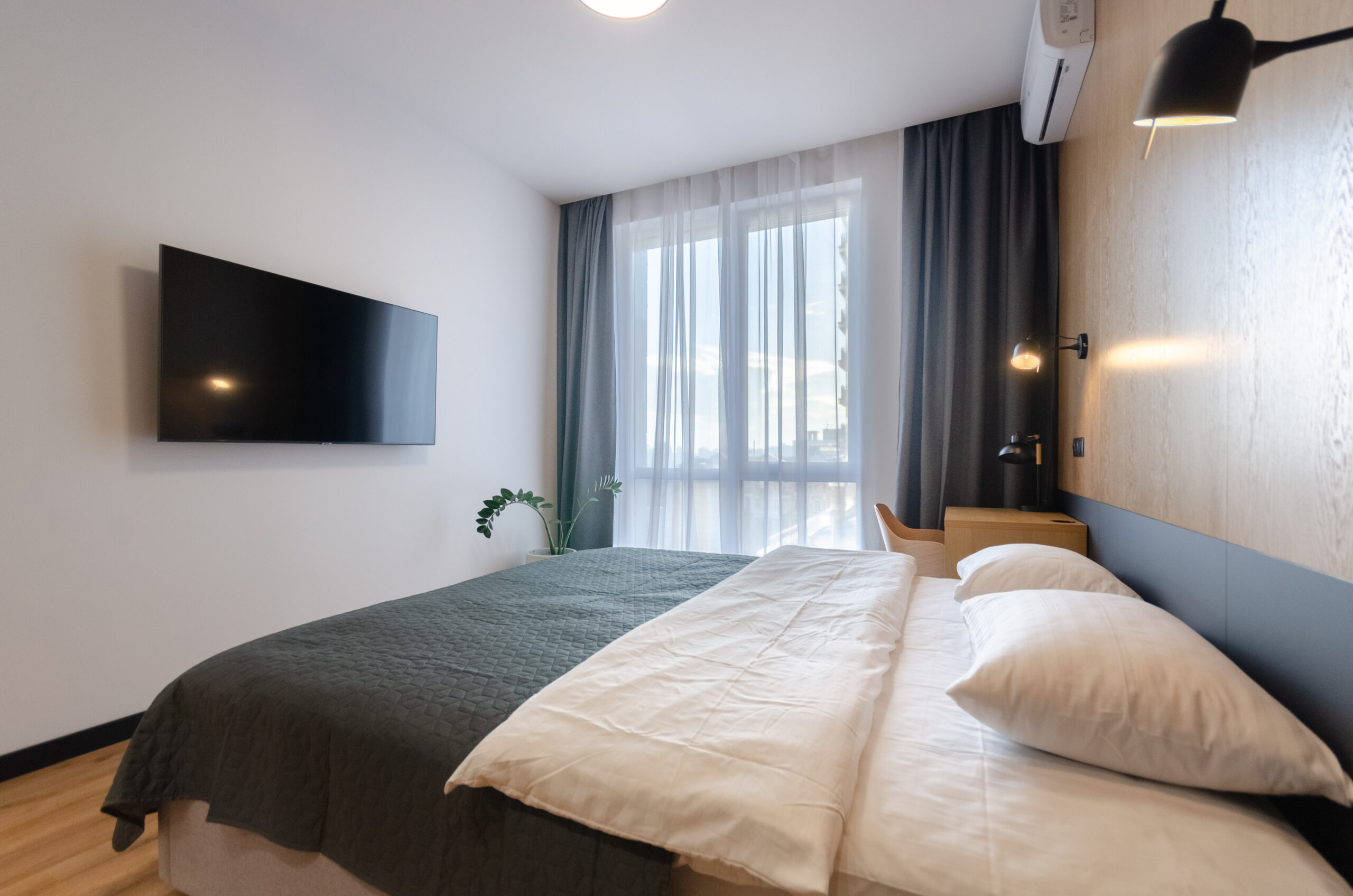 The apartment has bedding, all the necessary dishes, small household appliances – everything for a comfortable stay for any period.