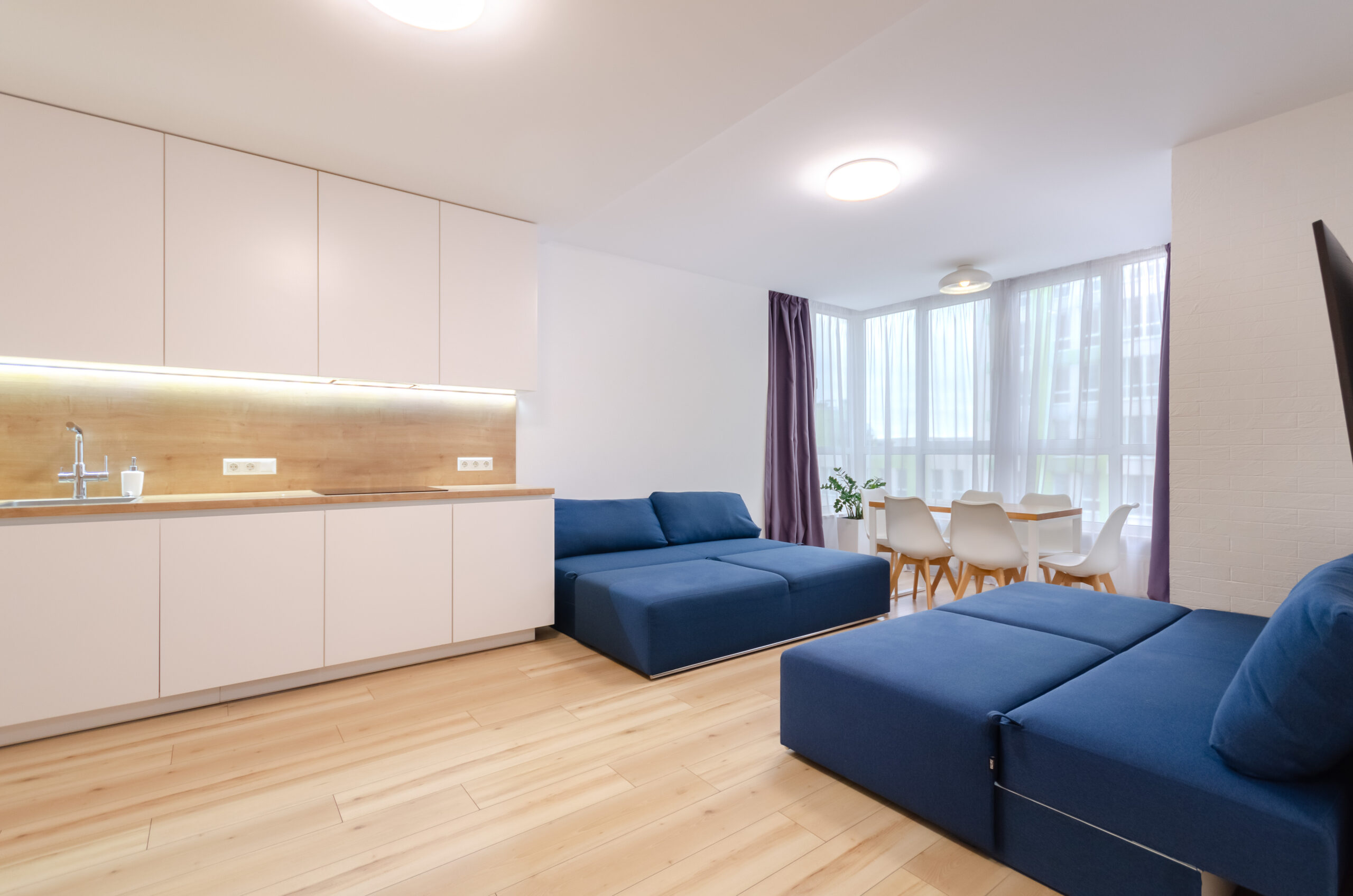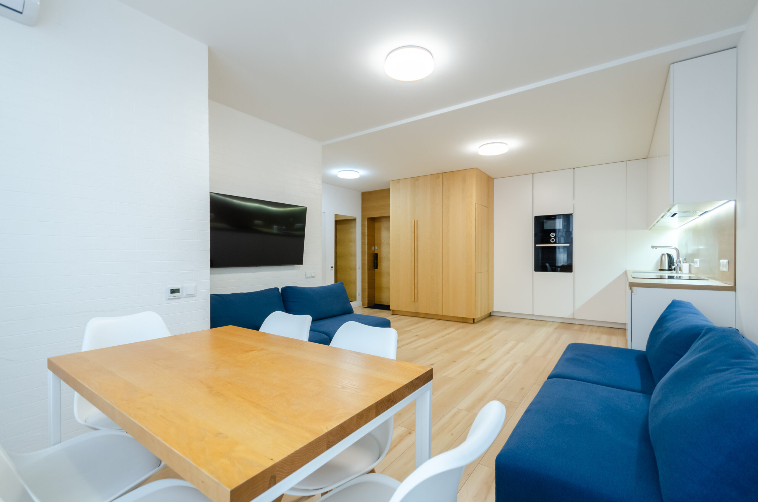 The apartment is located on the 11 th floor, with an area of 54 m2 with a separate bedroom with a workplace, a spacious living room-kitchen and a bathroom. It is fully equipped with everything necessary for a comfortable stay.