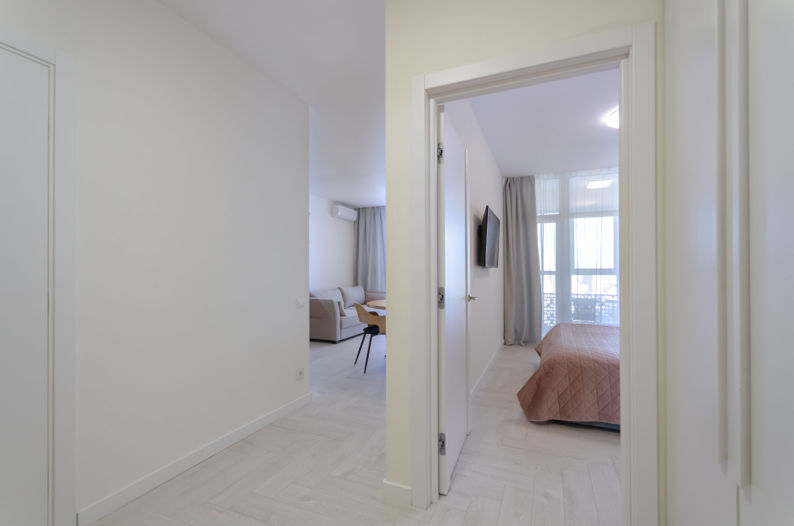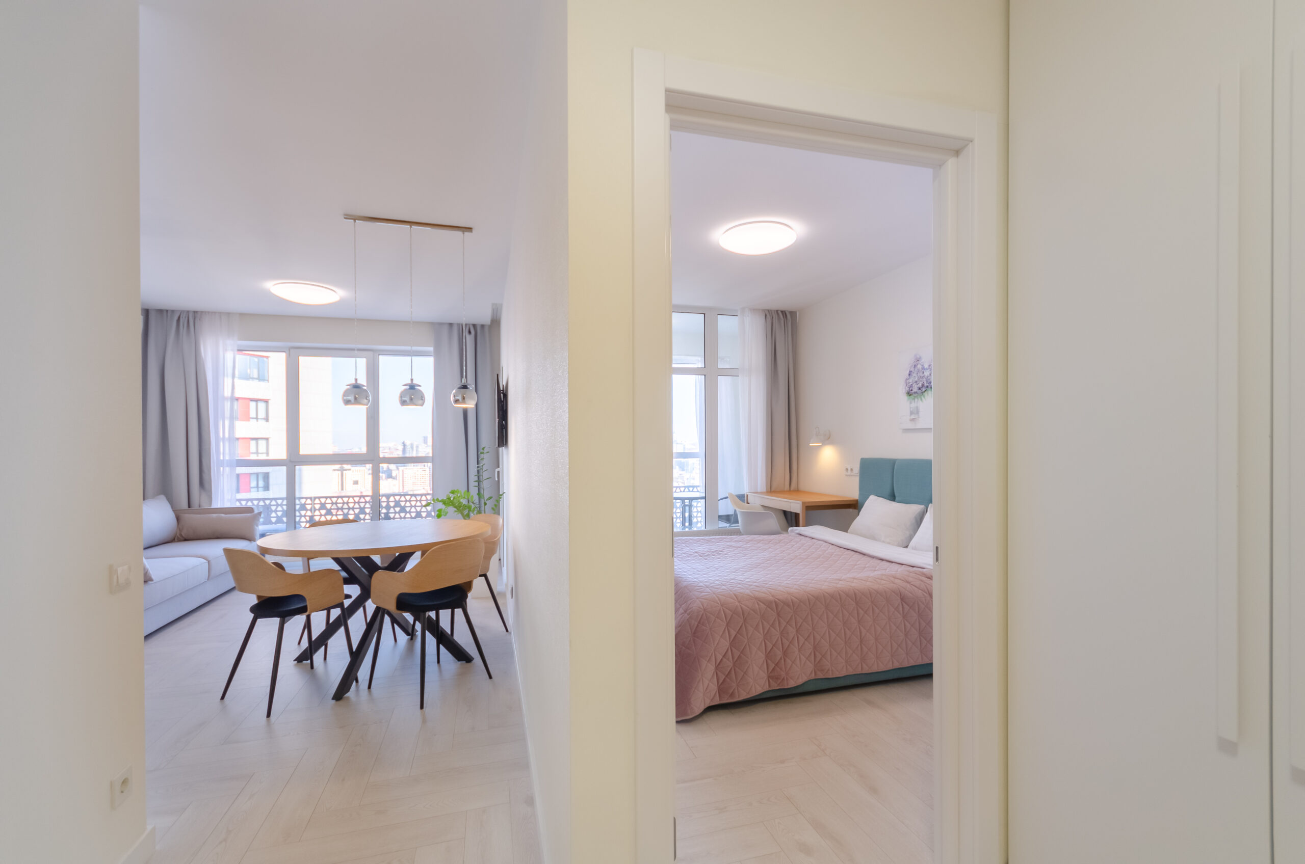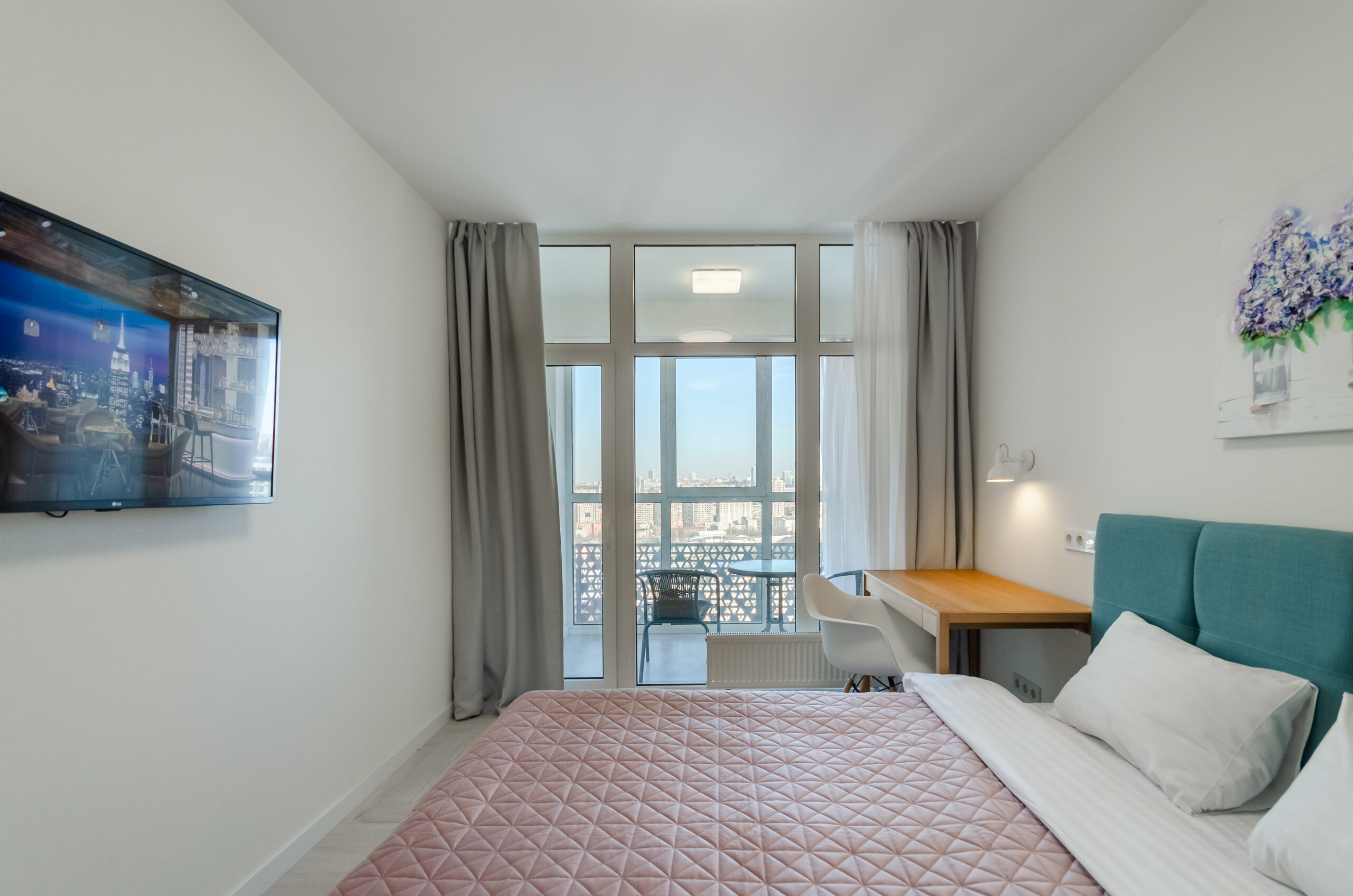 The apartment is located on the 19th floor, has an area of 47 m2, has a separate bright bedroom, a spacious living room – a kitchen with a panoramic view, and a bathroom.