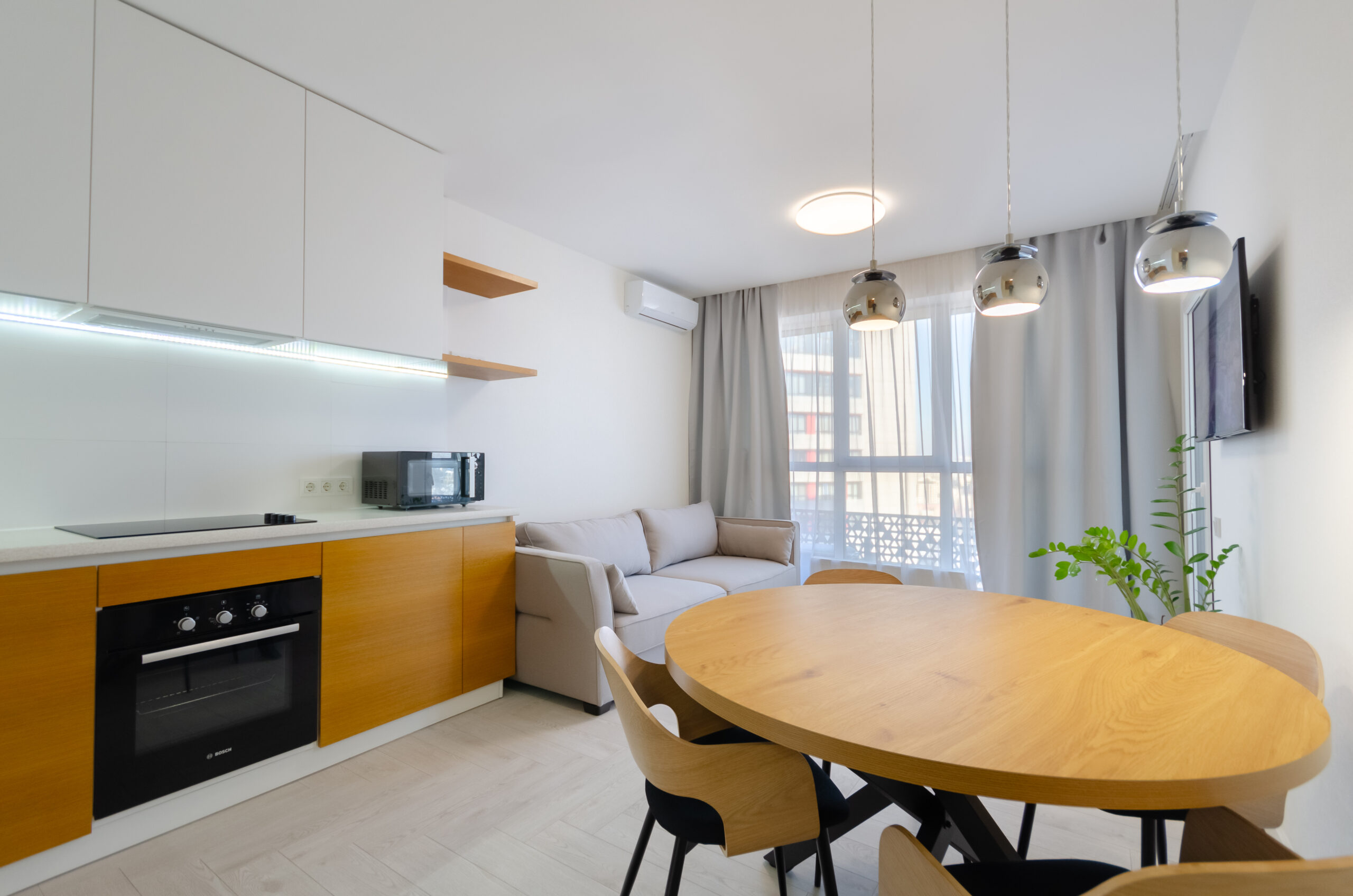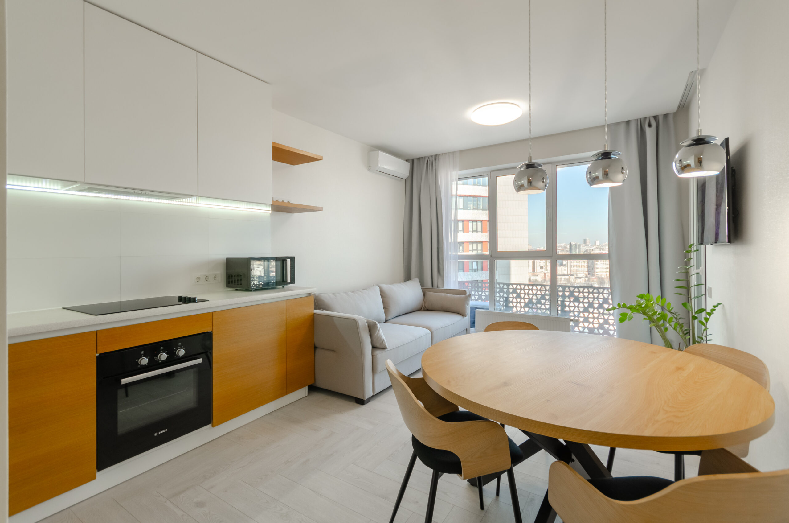 Within walking distance – Railway station, Lev Tolstoy, Zhylyanska, Ultramarin shopping center, 101 Tower, Stadium, Kudryashova, Saksaganskogo, Solomensky park. Novus supermarket, KFC McDonald’s Velyka Kyshenya. Metro station “Vokzalna” is a 7-minute walk away, across the street is the shopping and entertainment center “Ultramarine”. There are 3 large supermarkets, restaurants, and a convenient transport interchange nearby.
