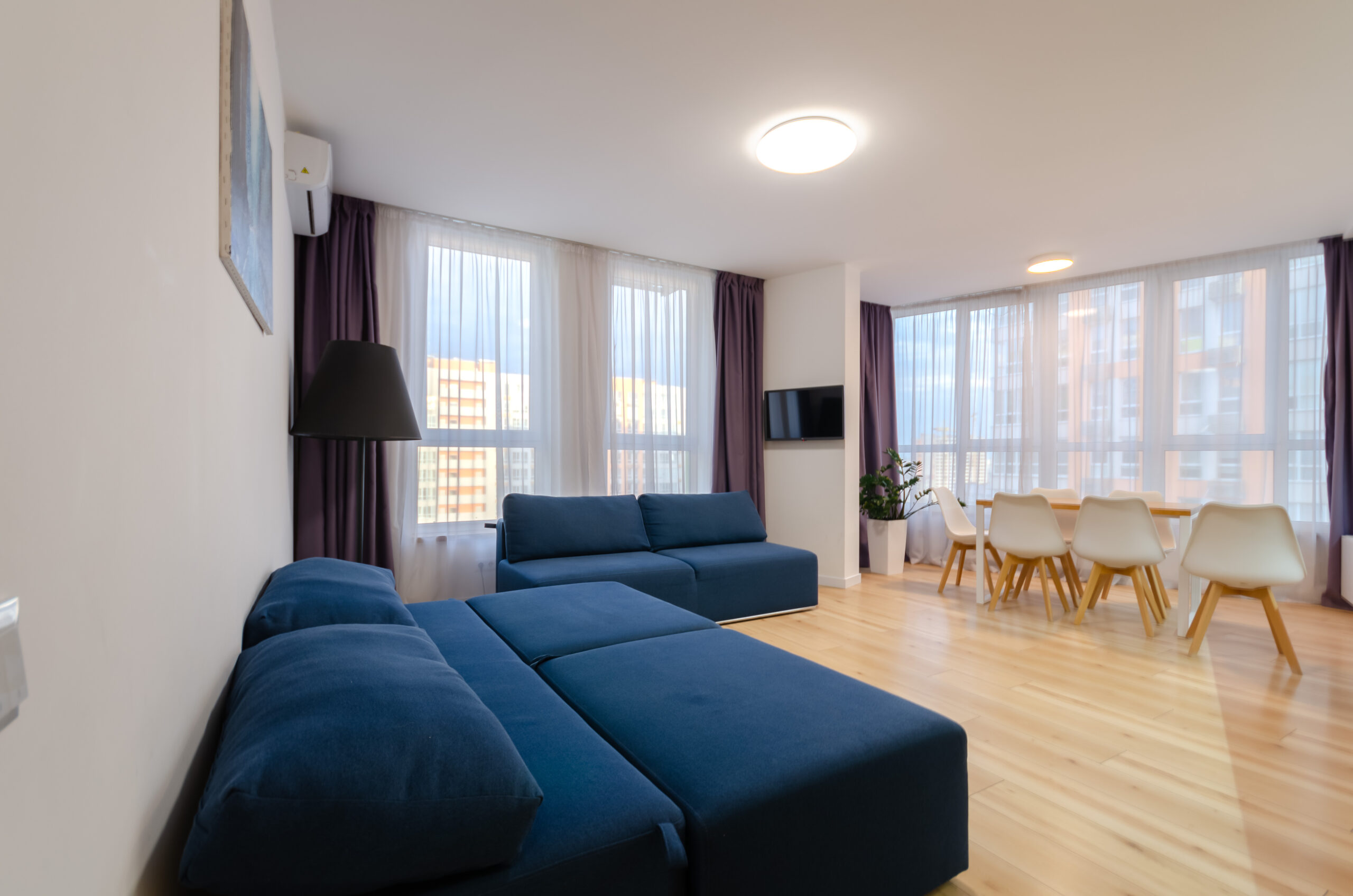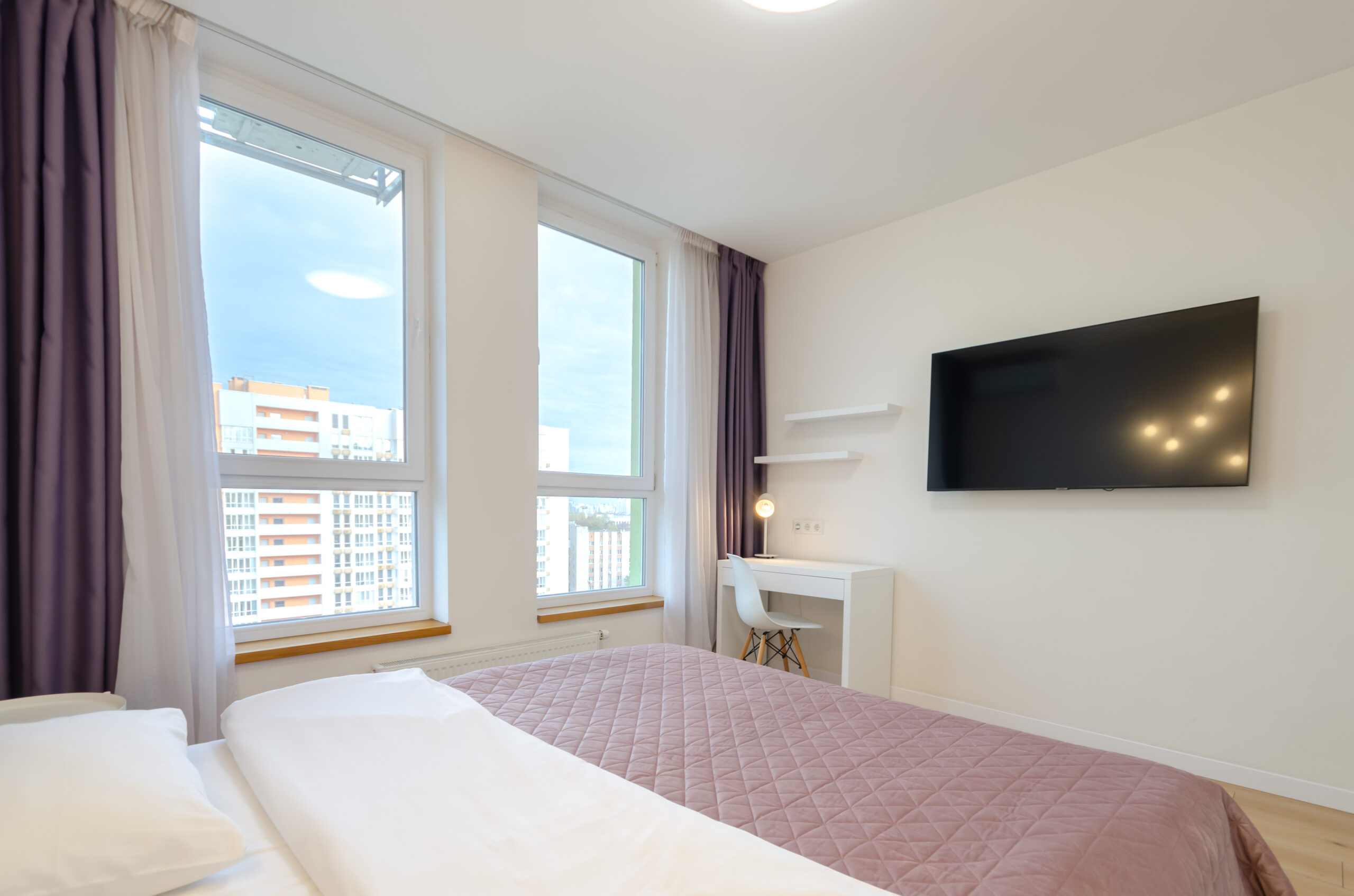 The apartment is located on the 13th floor, has an area of 60 m2, has a separate bedroom, a bright living room-kitchen with two comfortable sofas and a bathroom.The apartment is fully equipped with everything necessary for a comfortable stay (there is bedding, all the necessary dishes, household appliances).