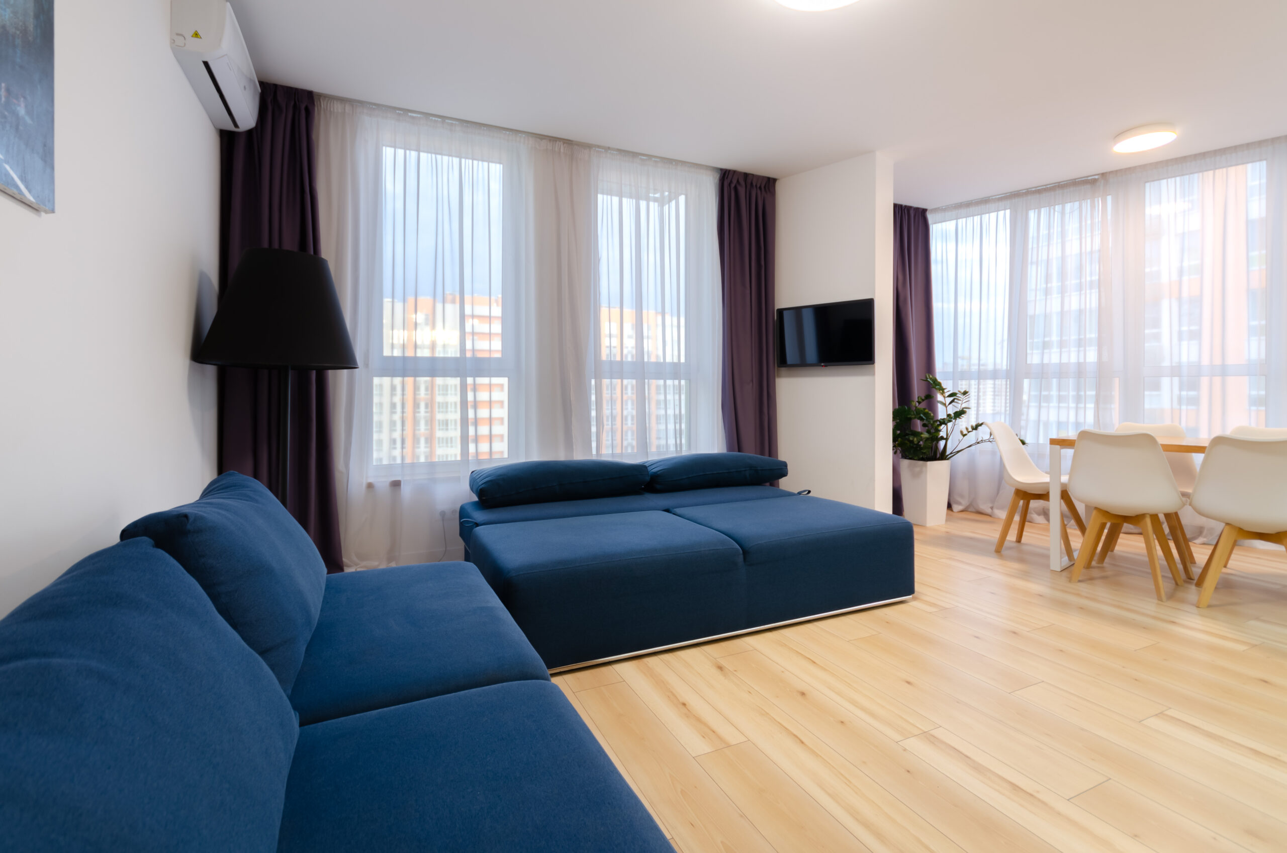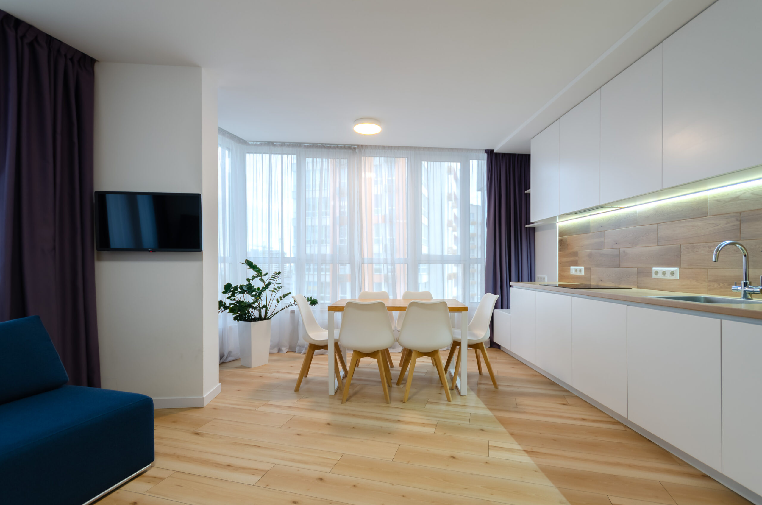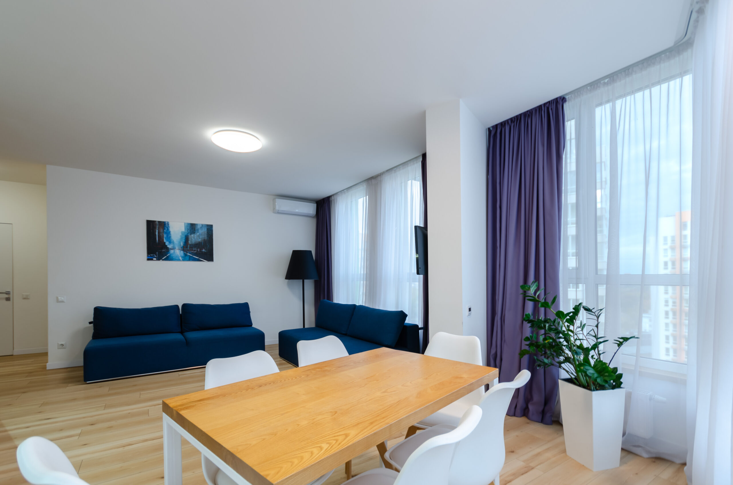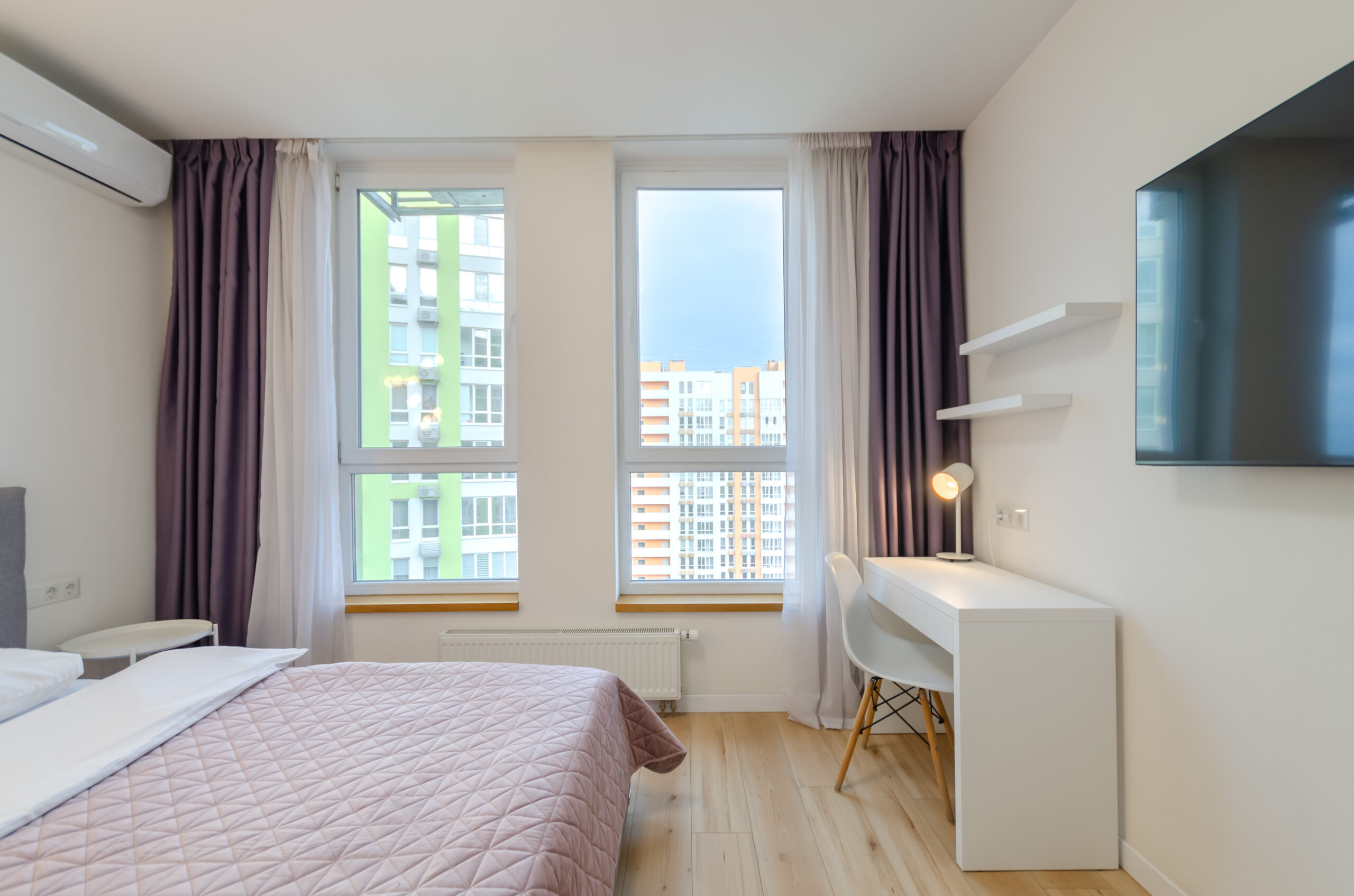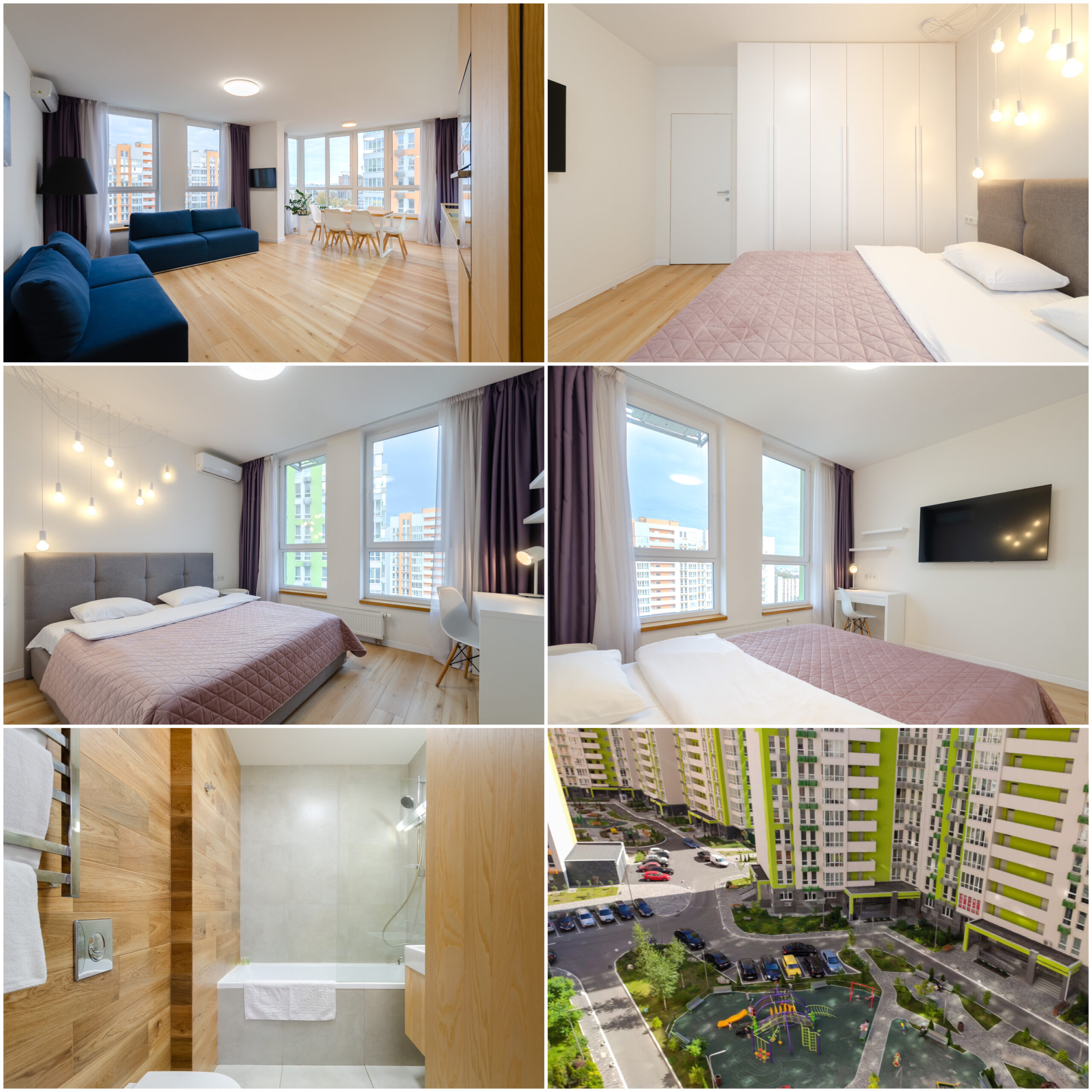 A new, cozy apartment in the Nyvky Park residential complex with a beautiful view from the window.
