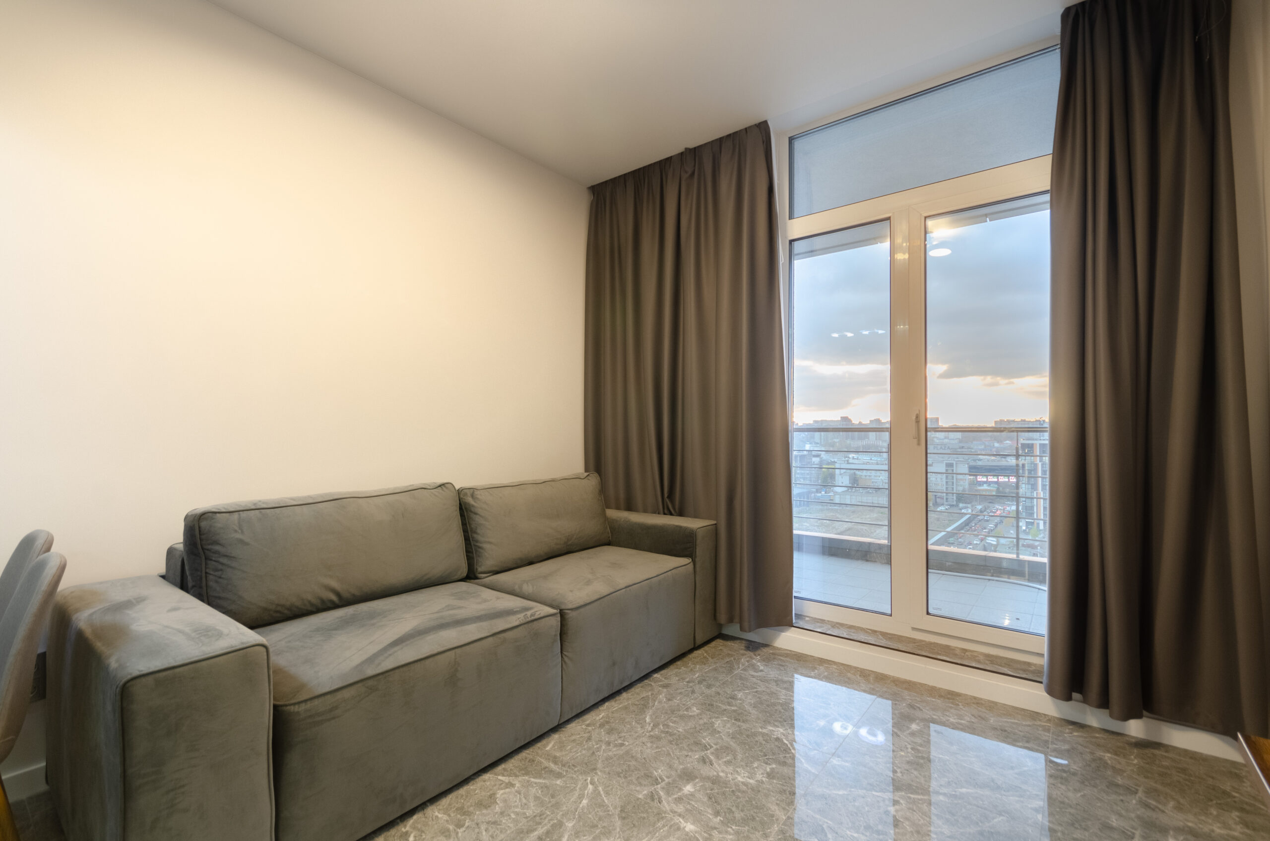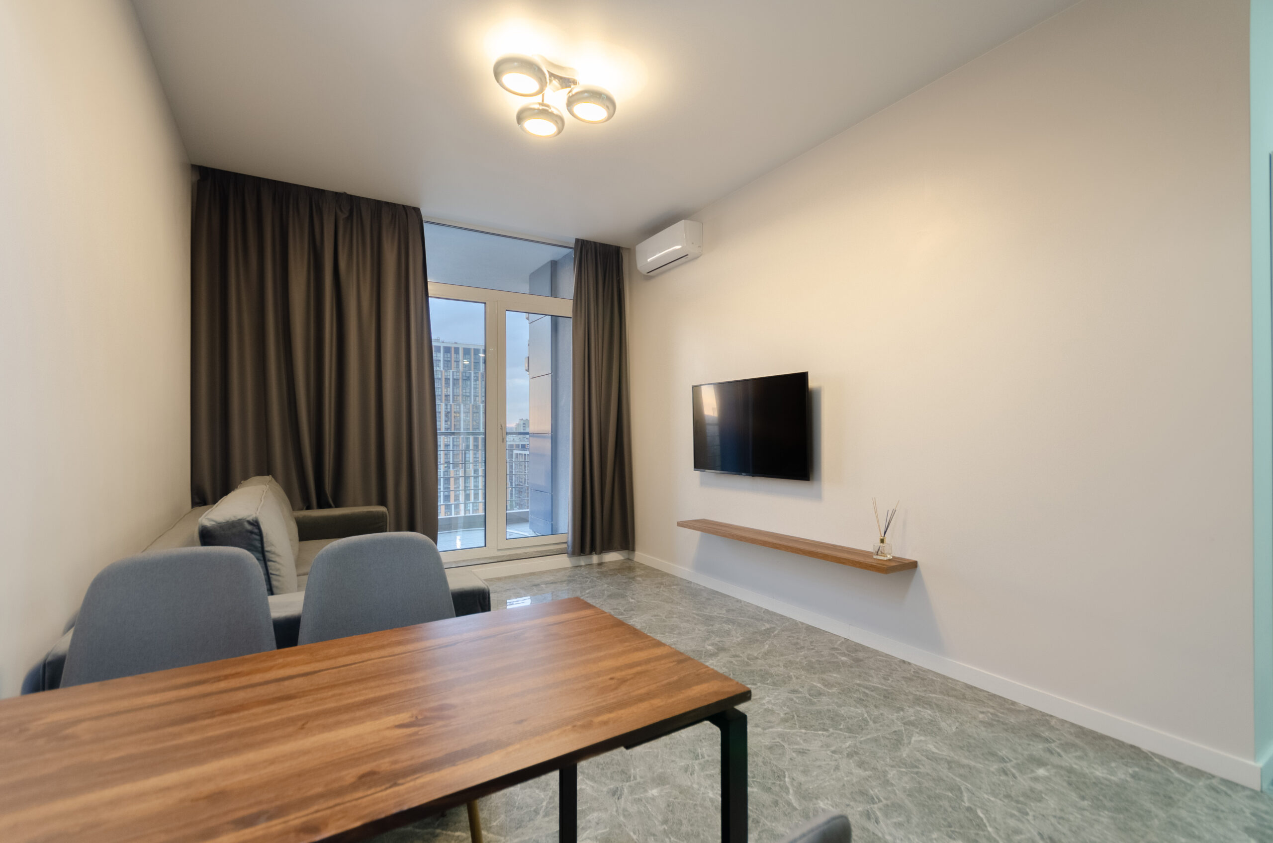 The apartment is located on the 11th floor, has an area of 55 m2, has a separate bedroom, a living room with a kitchen, a bathroom, a balcony with a view of Kyiv.