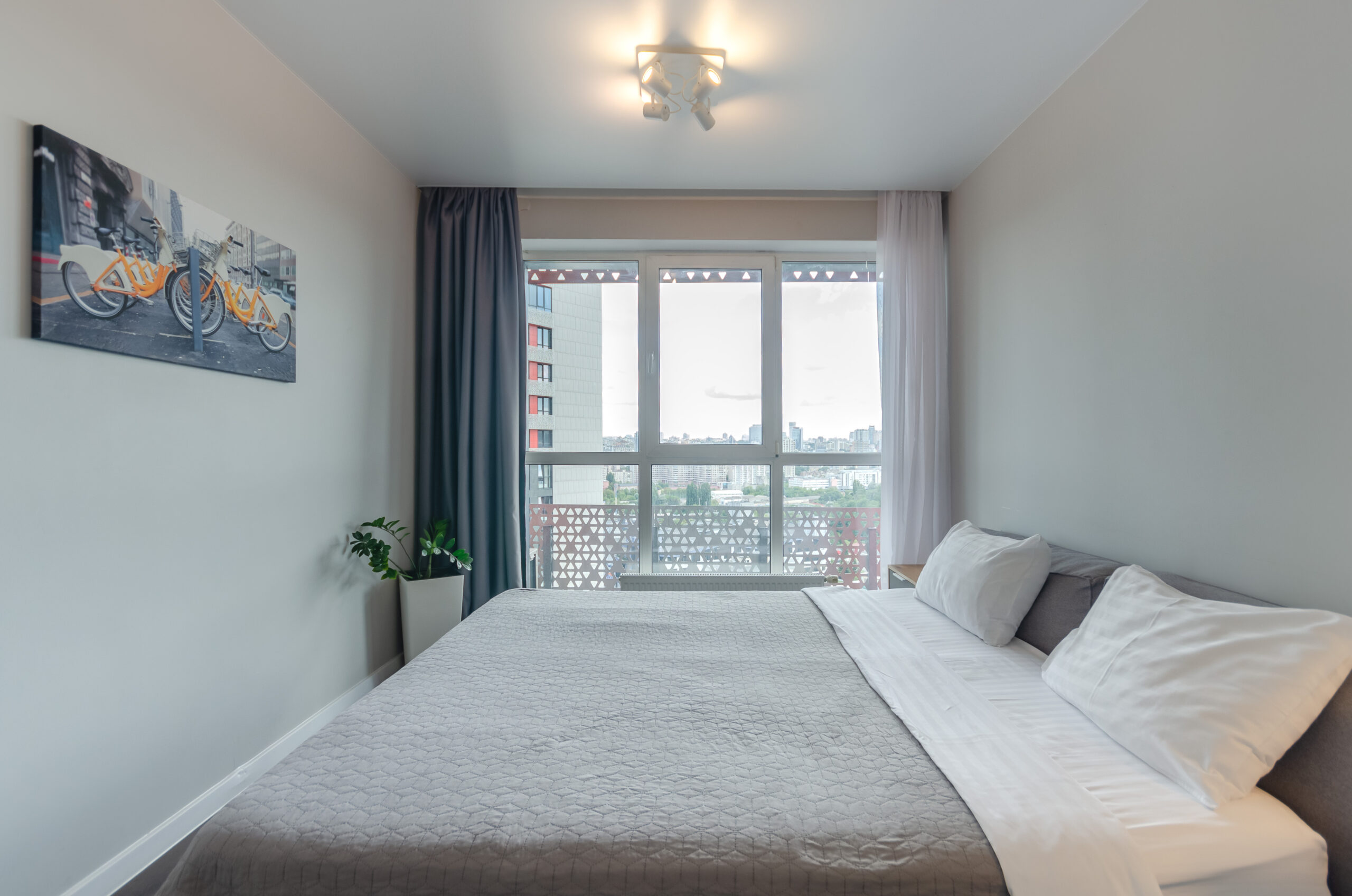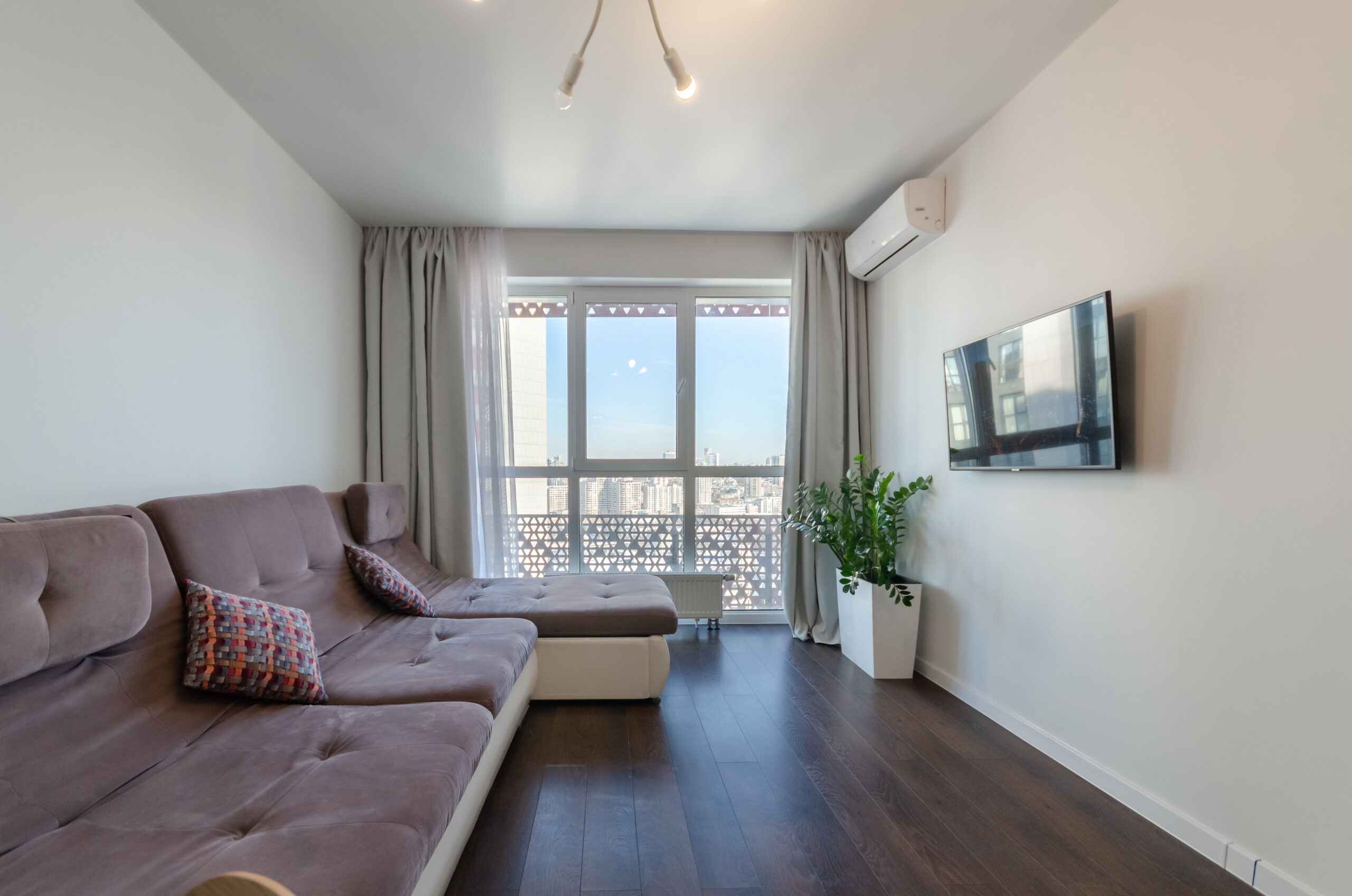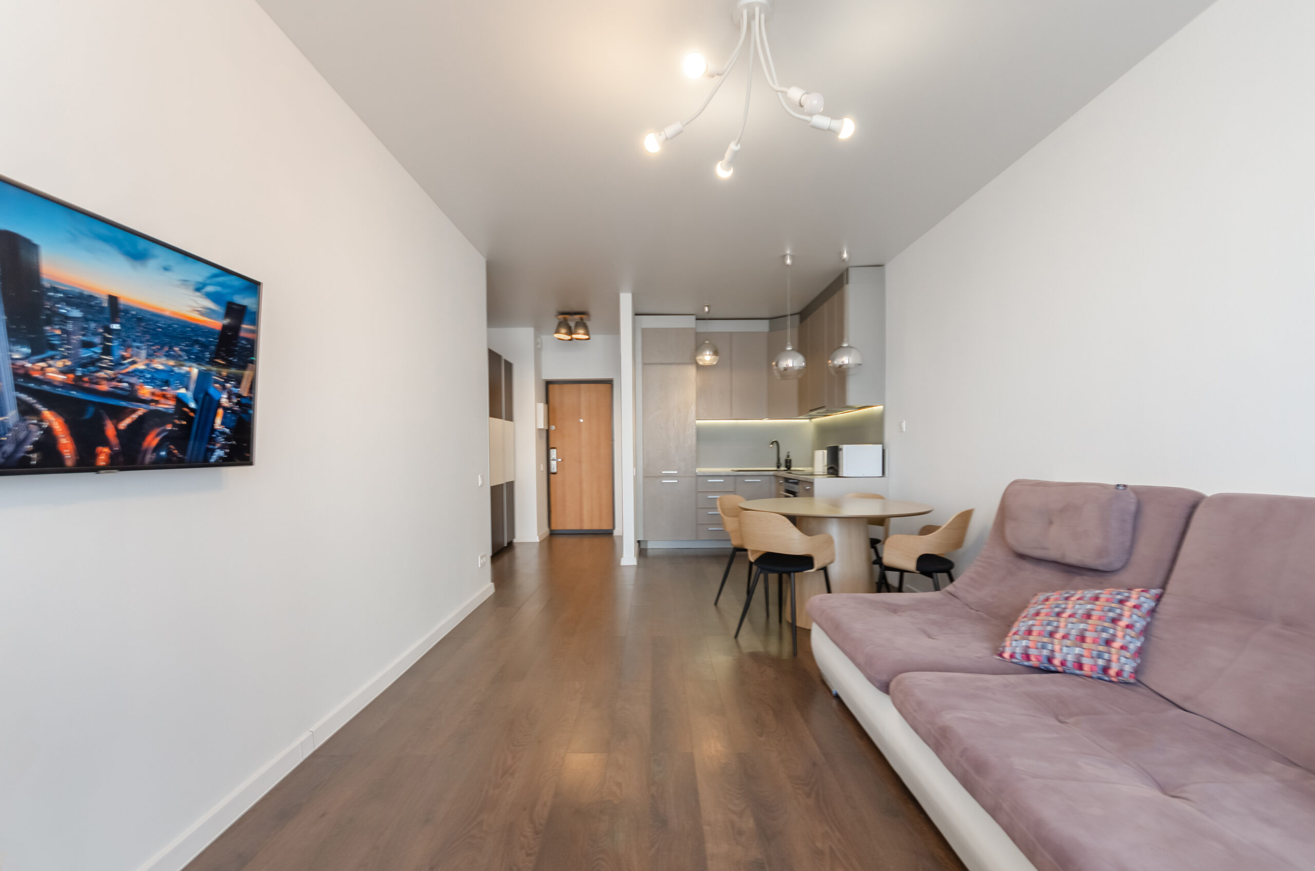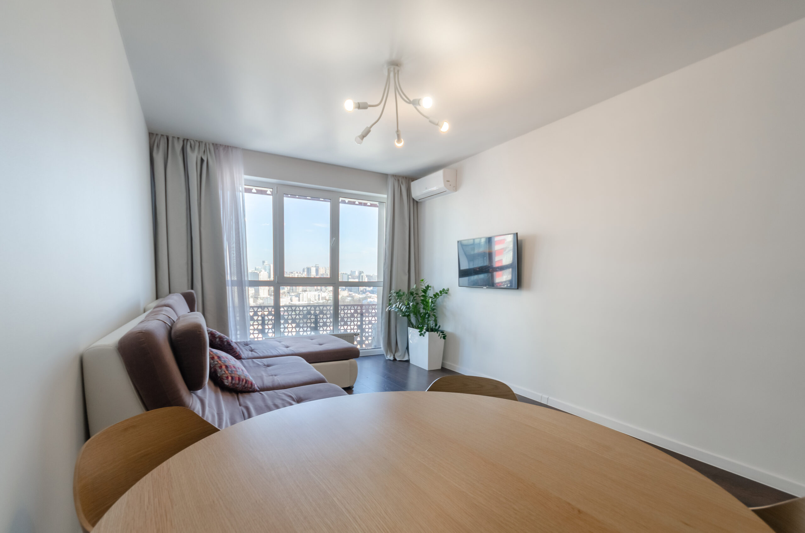 The apartment is located on the 16th floor, has an area of 50m2, has a separate bedroom with a wide bed 180*200, a spacious living room, kitchen with a view of Kyiv and a bathroom.