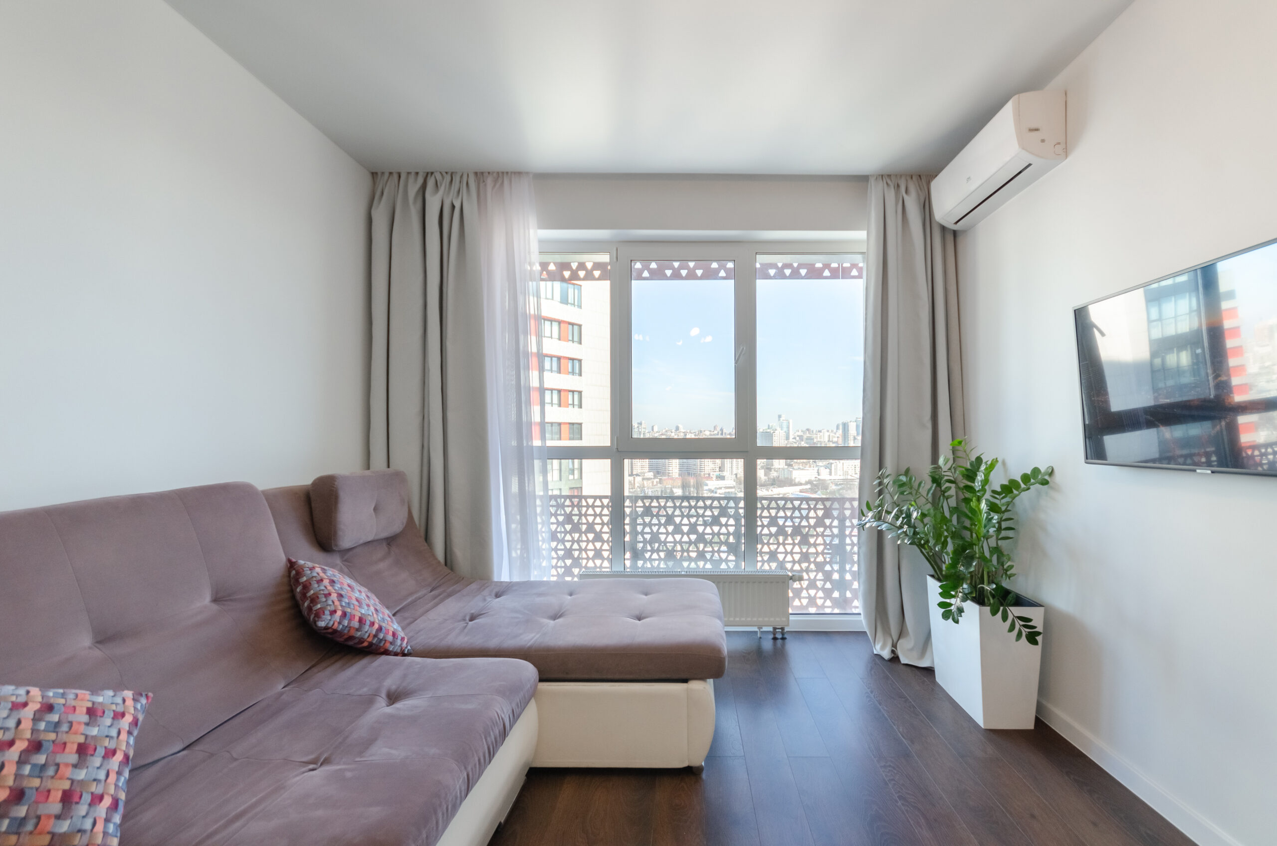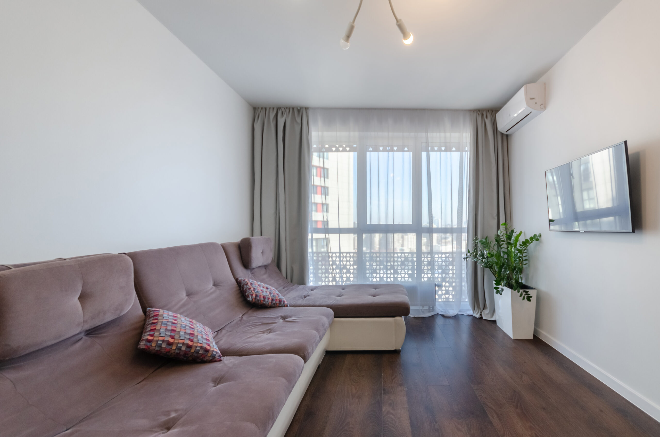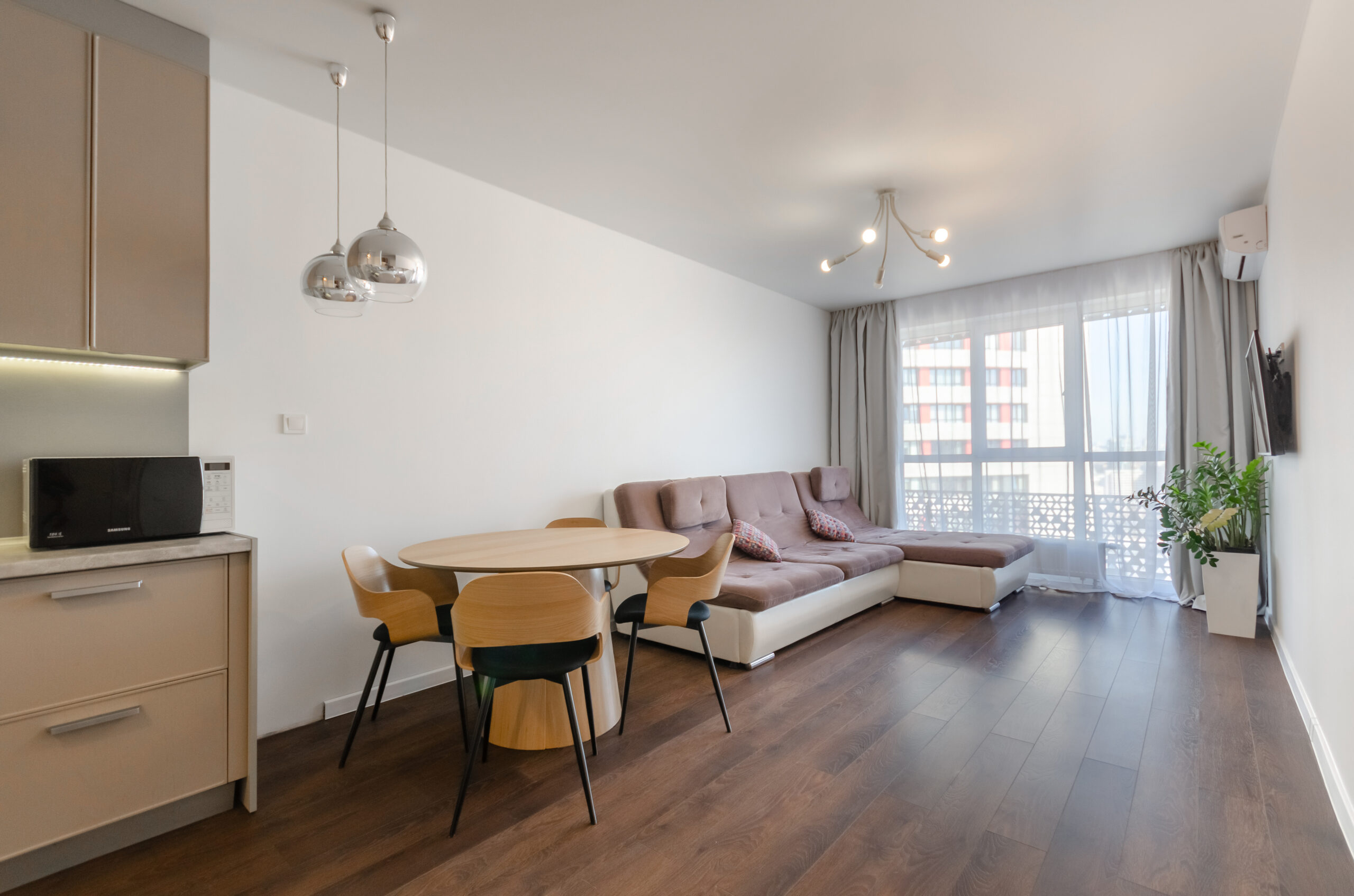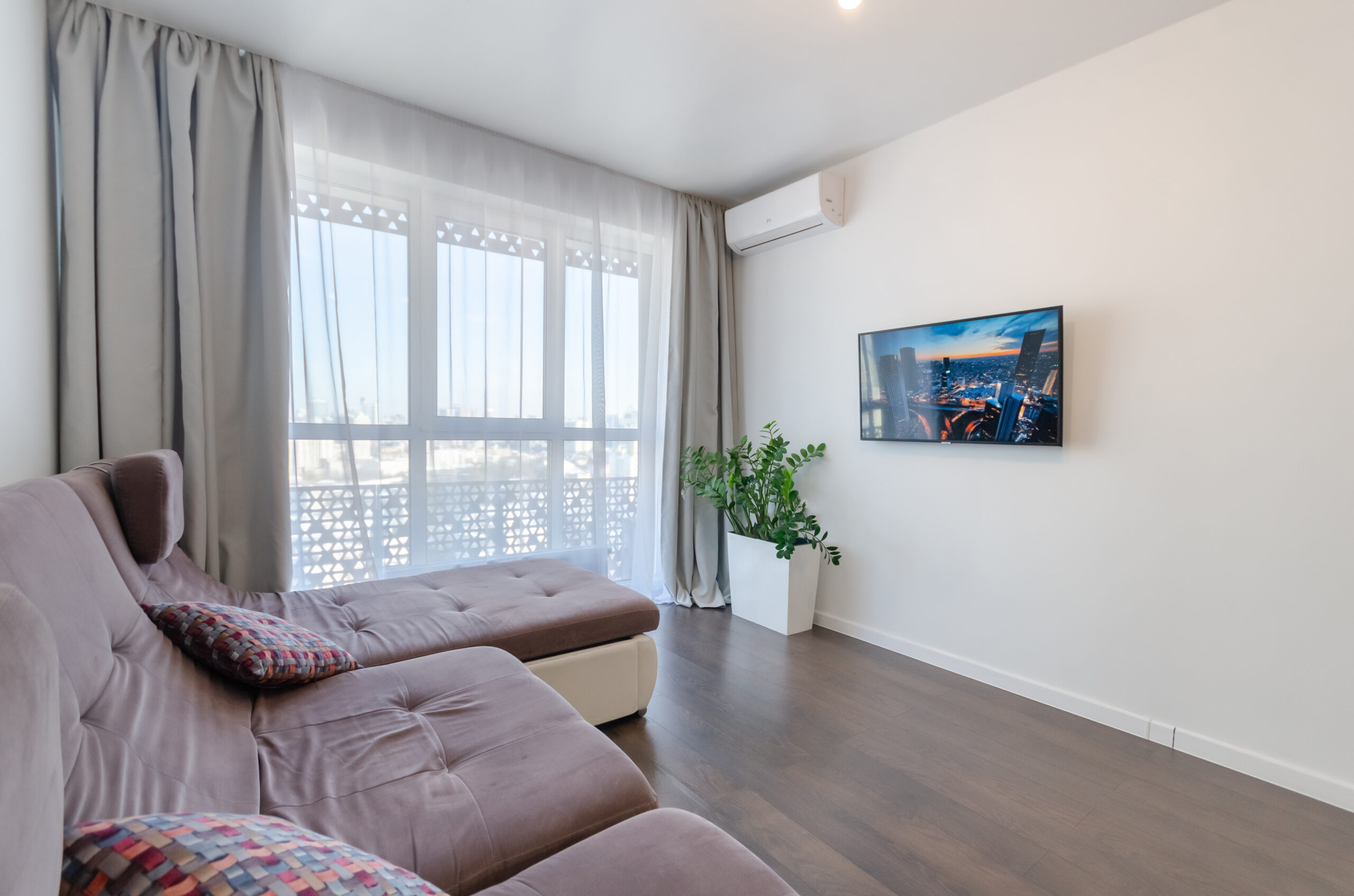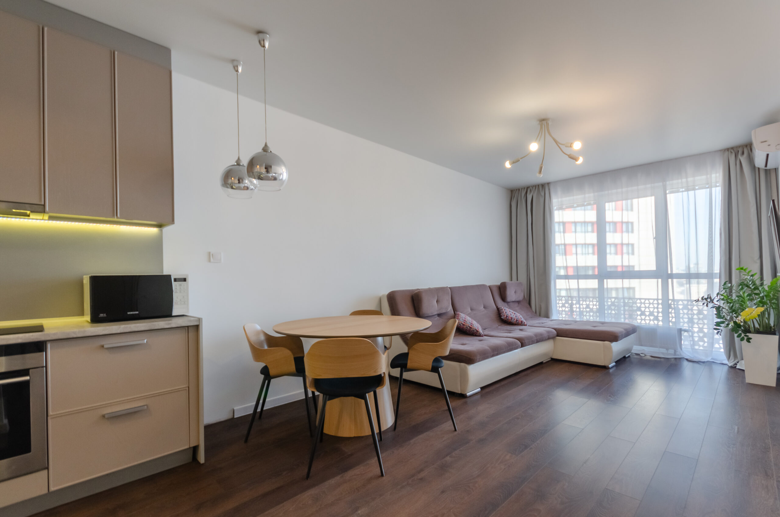 The apartment is located on the 16th floor, has an area of 50m2, has a separate bedroom with a wide bed 180*200, a spacious living room, kitchen with a view of Kyiv and a bathroom.