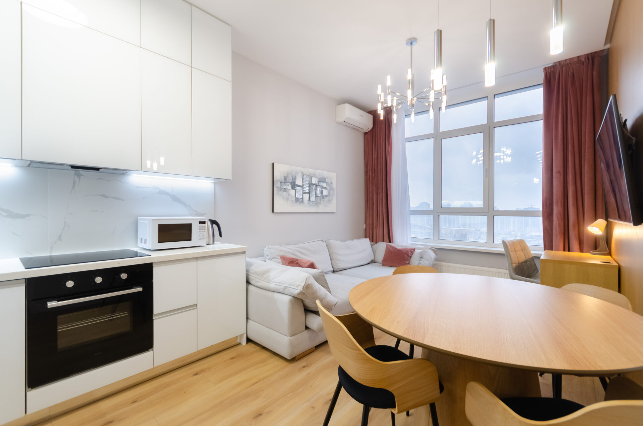 Within walking distance – Railway station, Lev Tolstoy square, Zhilyanska streer, Ultramarin shopping center, 101 Tower, Stadiona Street, Kudryashova Street, Saksaganskogo Street, Solomyanskiy Park, Novus Supermarket, KFC McDonald’s, Velika Kishenya. Metro station “Vokzalna” is a 7-minute walk away, across the street is the shopping and entertainment center “Ultramarine”. There are 3 large supermarkets, restaurants, and a convenient transport interchange nearby.