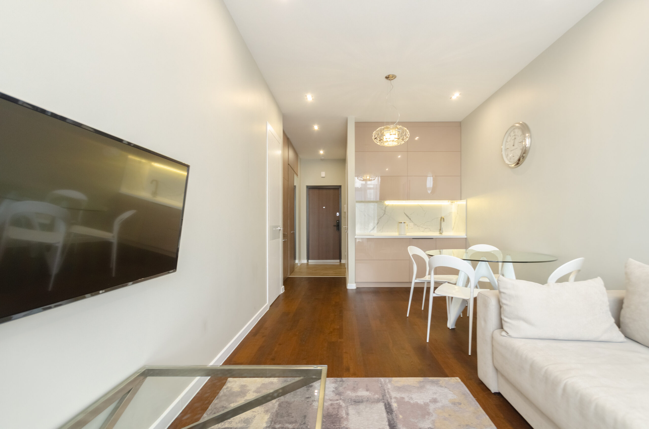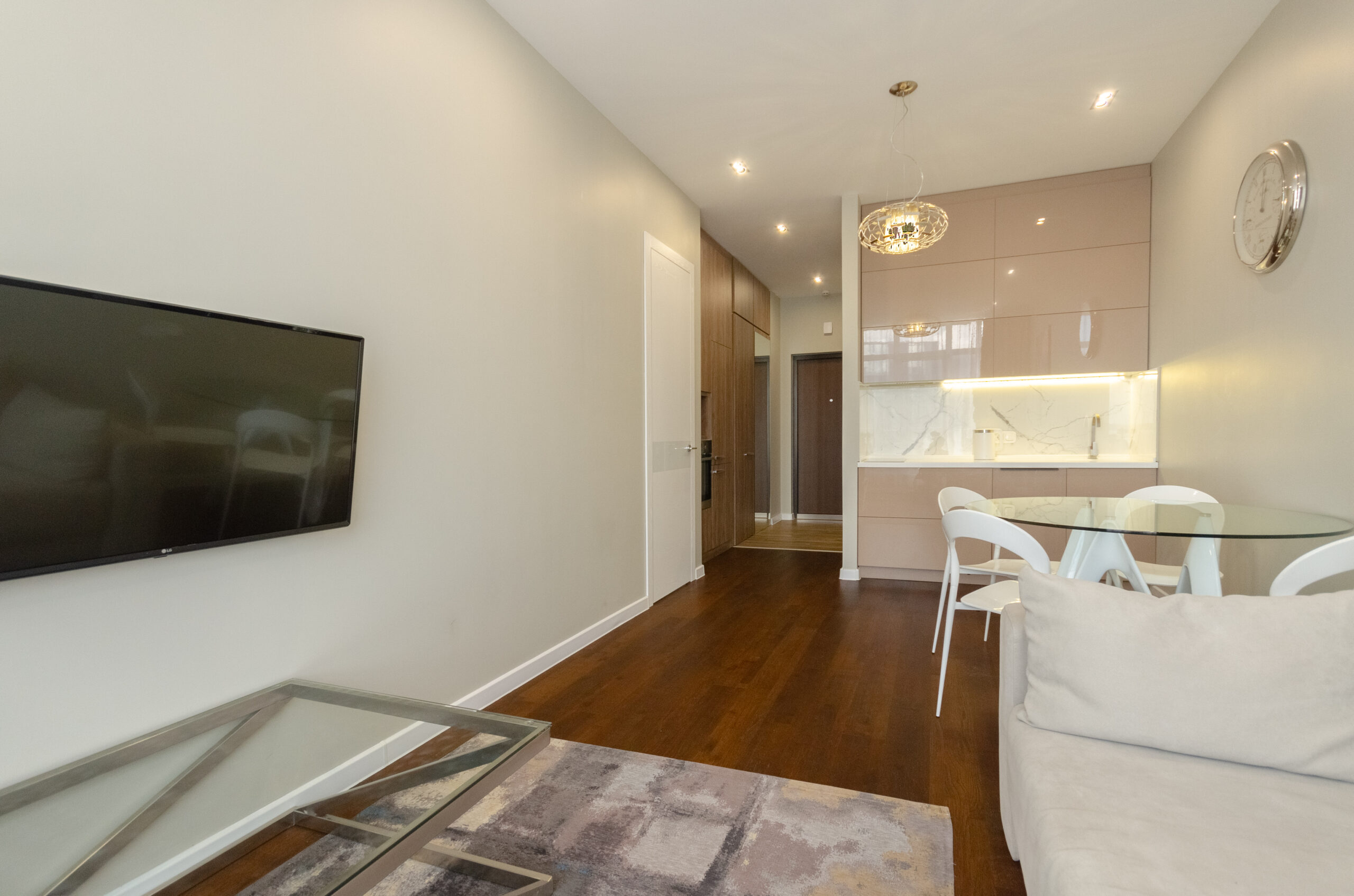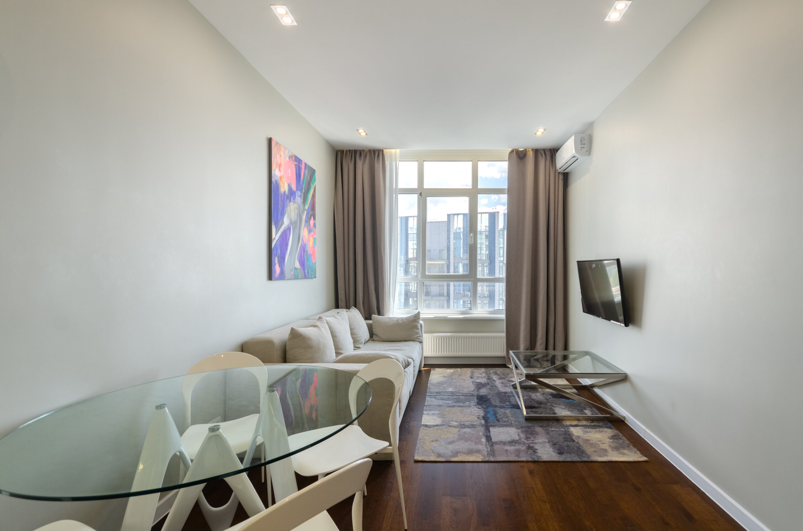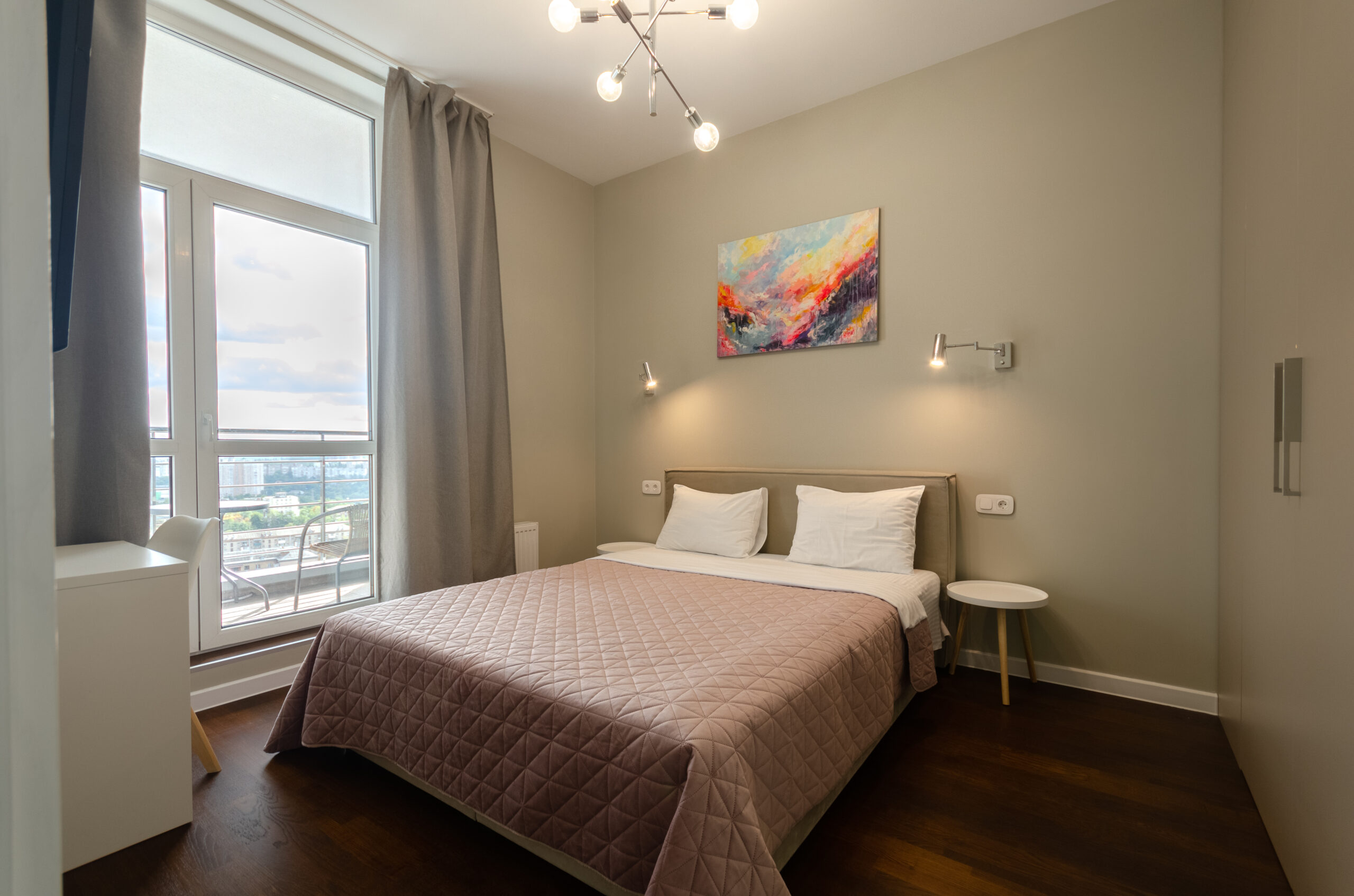 The apartment is located on the 20th floor, has an area of 50 m2, has a separate bedroom with balcony, a living room with a kitchen and a bathroom. The apartment is fully equipped with everything necessary for a comfortable stay.