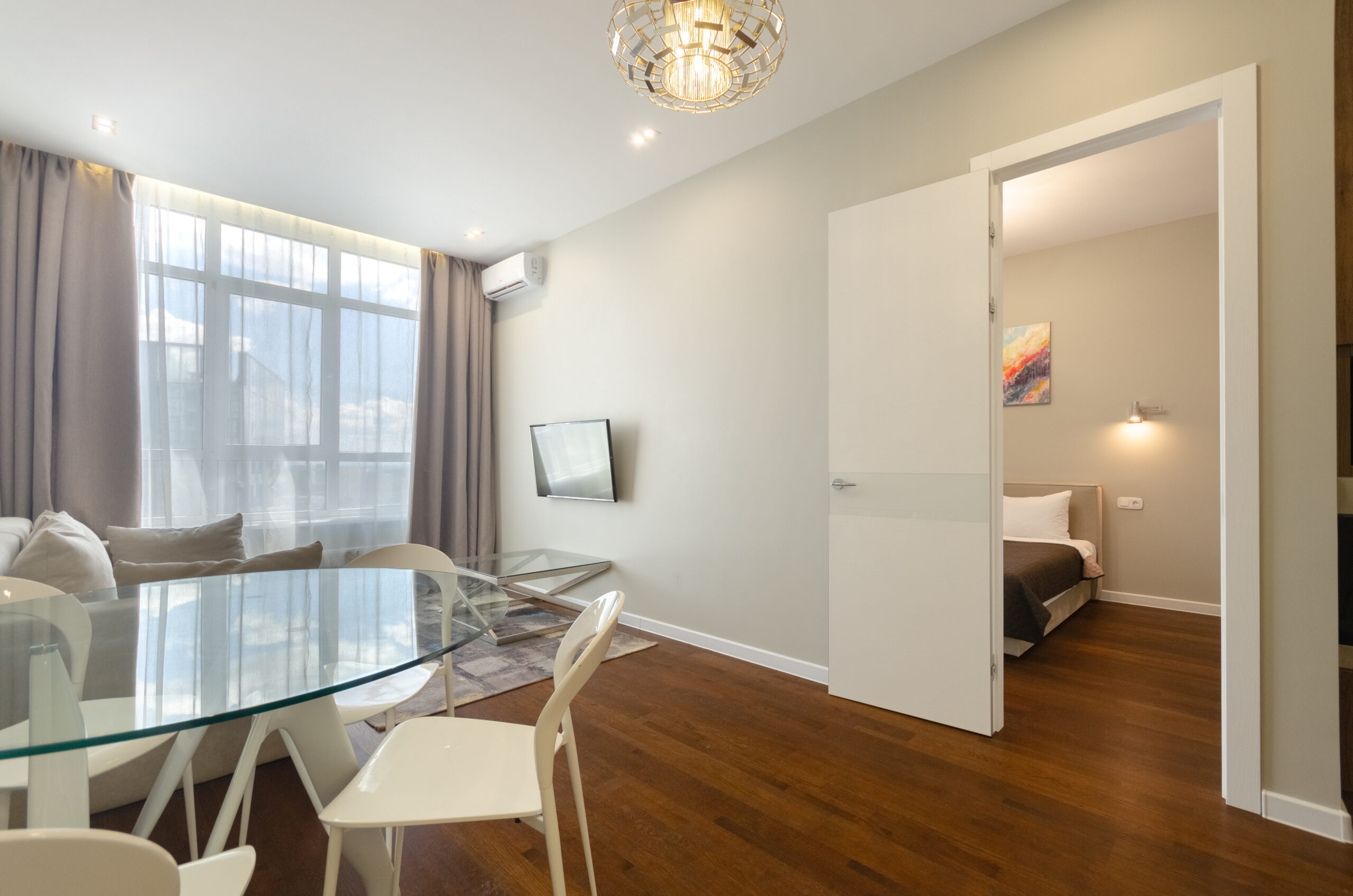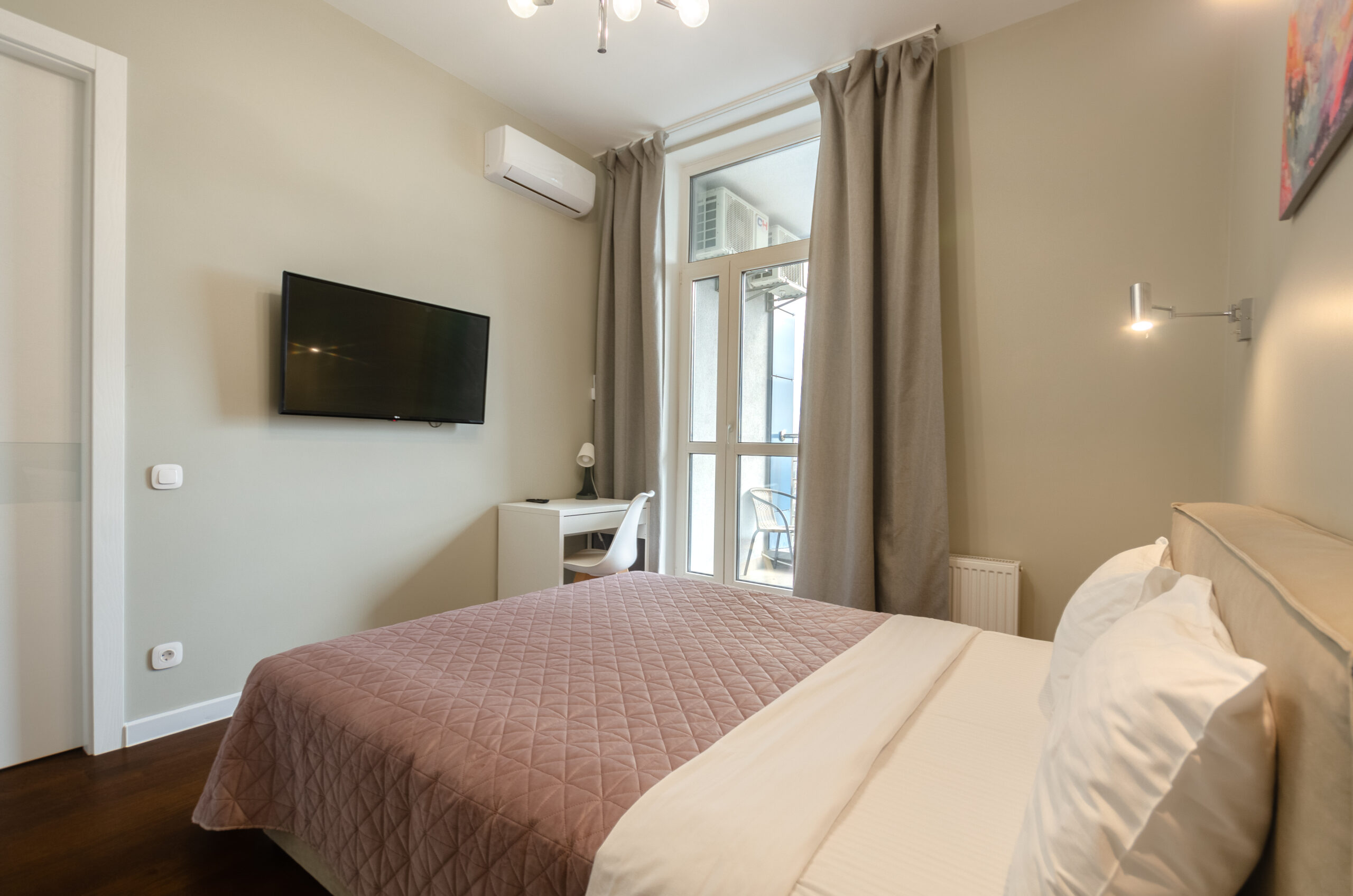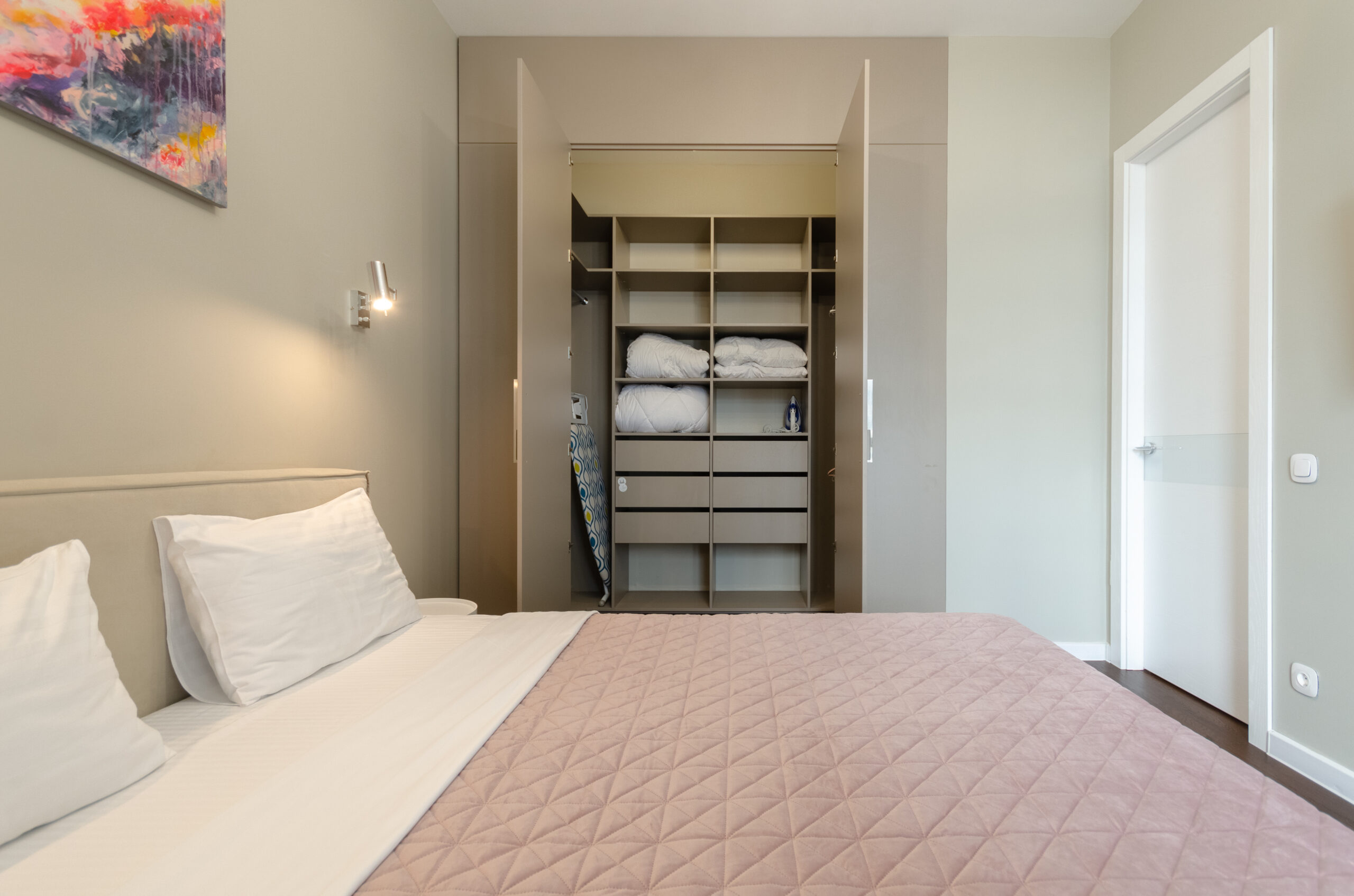 The apartment is located on the 20th floor, has an area of 50 m2, has a separate bedroom with balcony, a living room with a kitchen and a bathroom. The apartment is fully equipped with everything necessary for a comfortable stay.