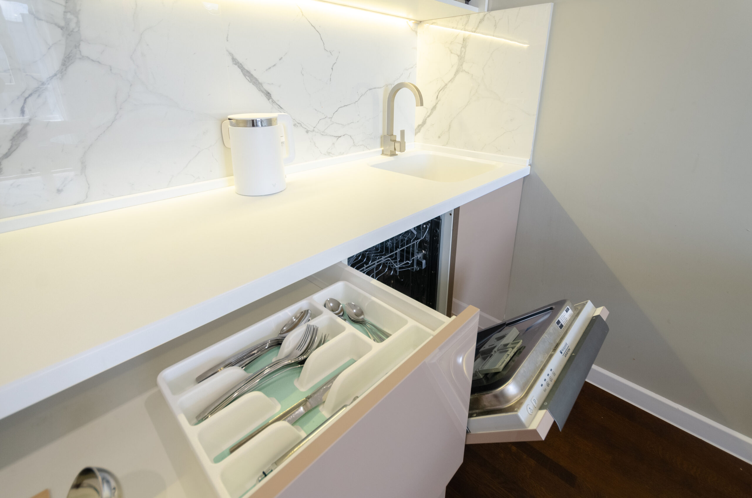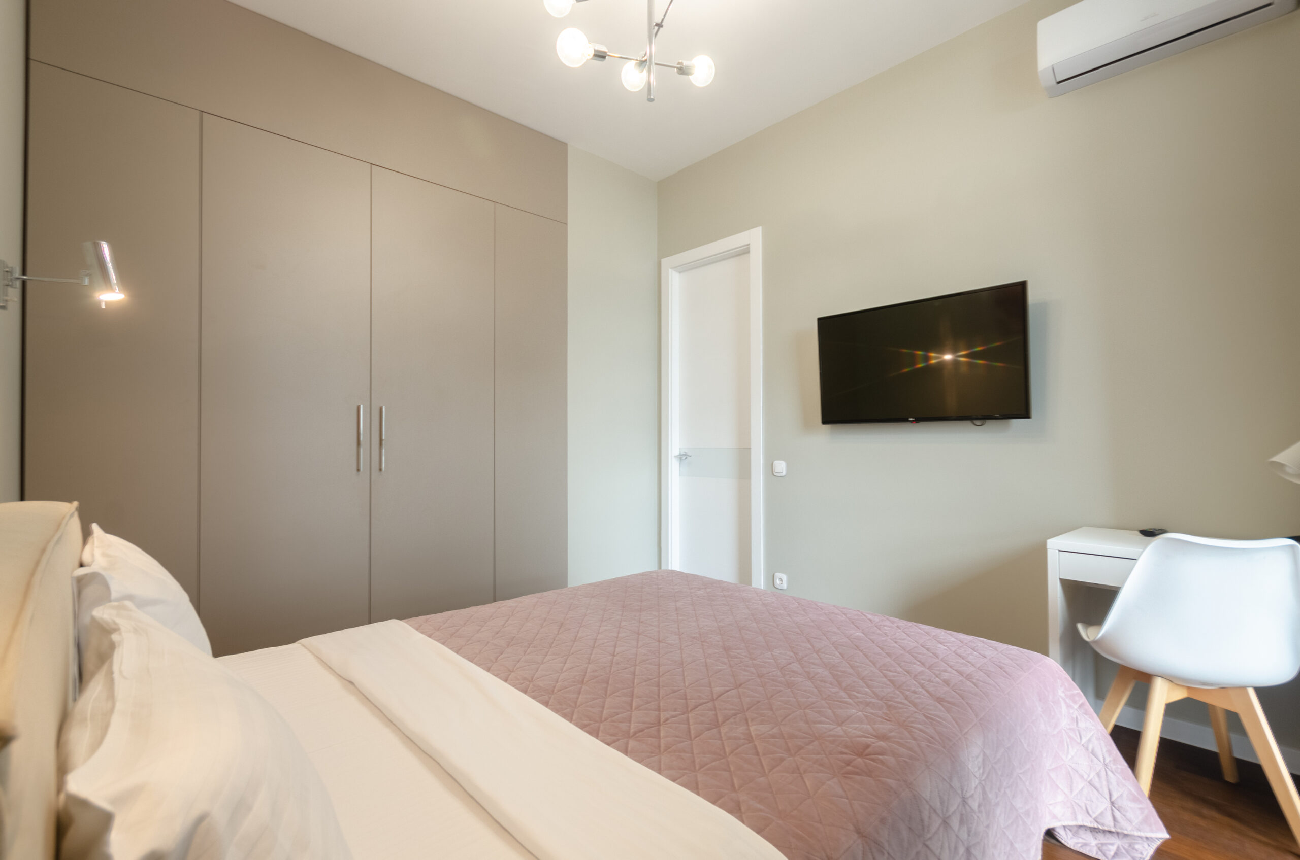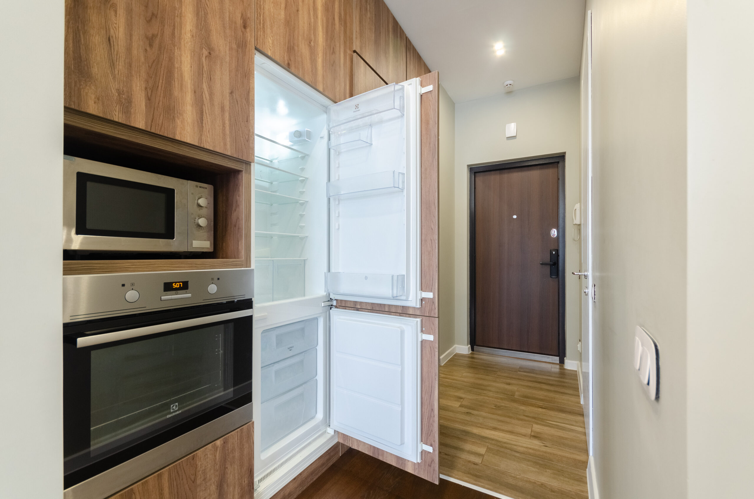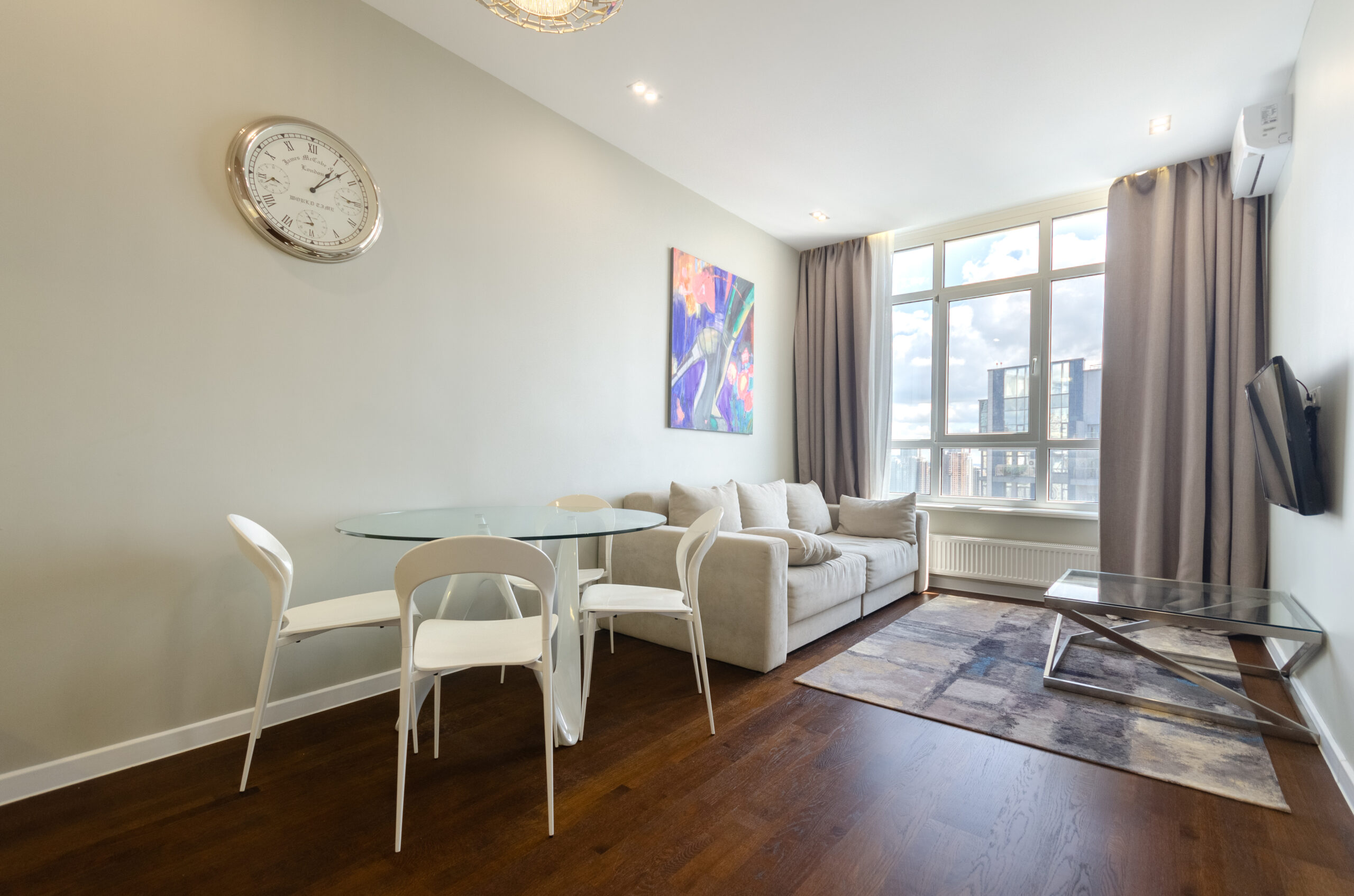 The apartment is located on the 20th floor, has an area of 50 m2, has a separate bedroom with balcony, a living room with a kitchen and a bathroom. The apartment is fully equipped with everything necessary for a comfortable stay.