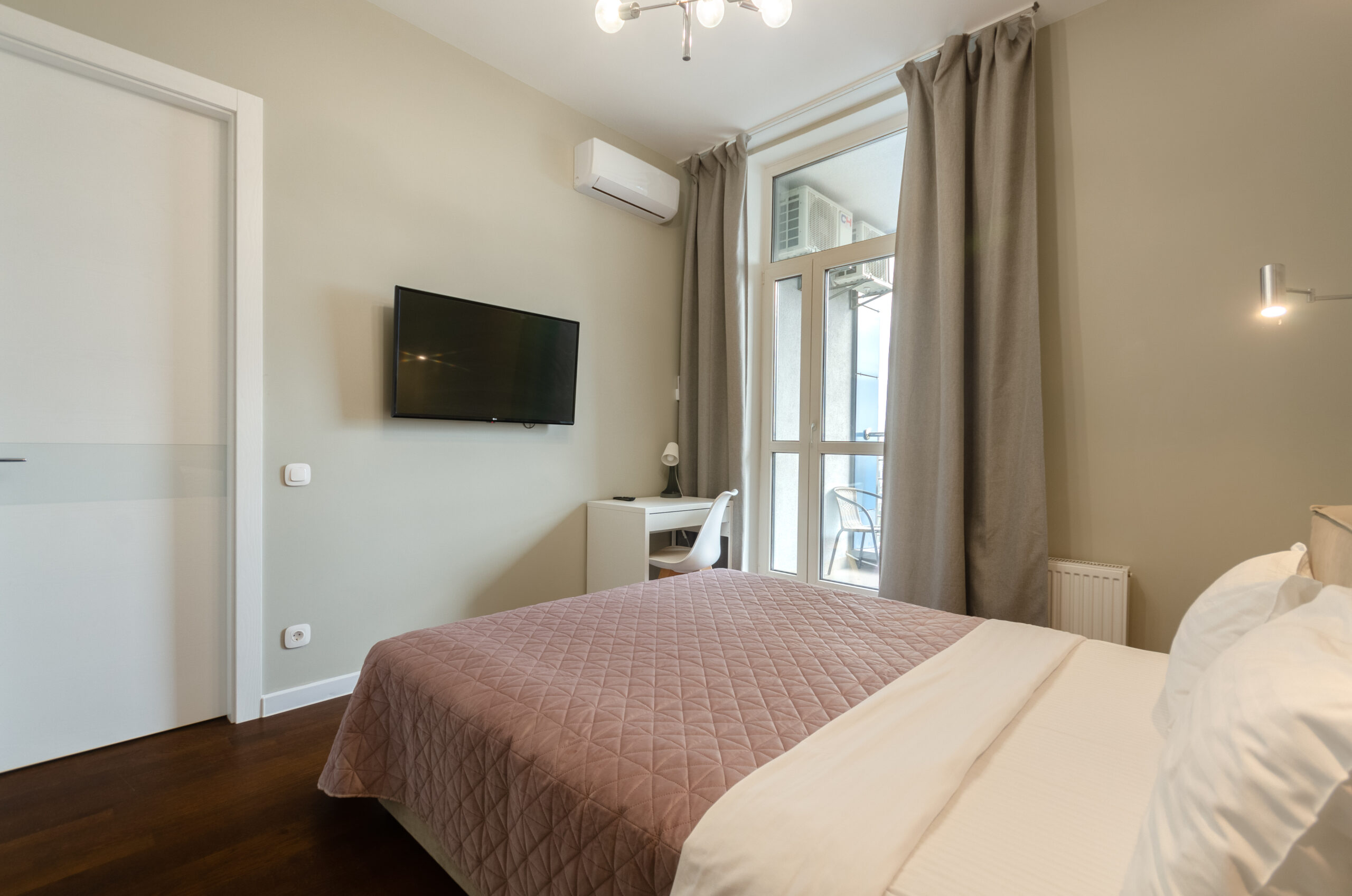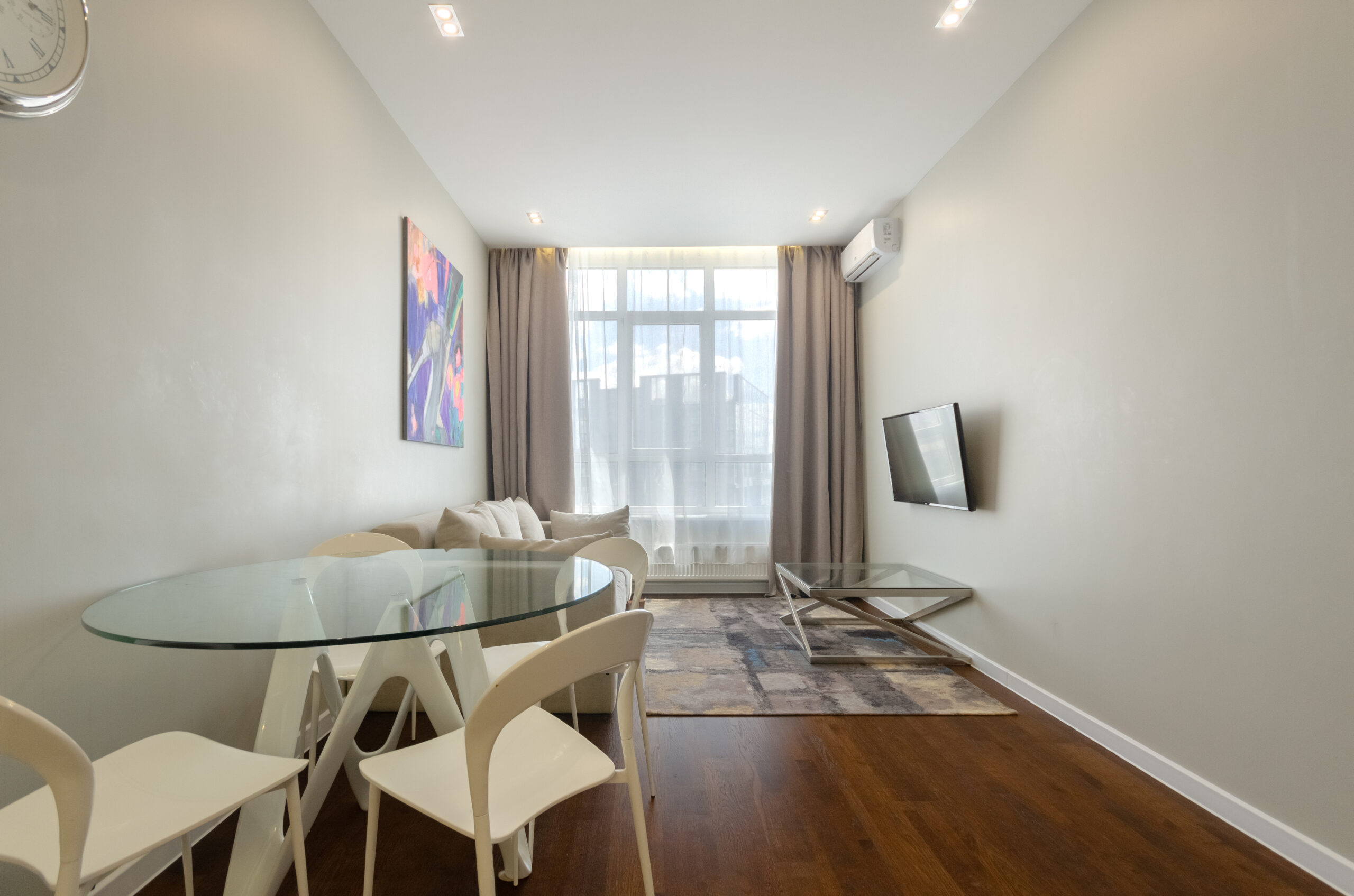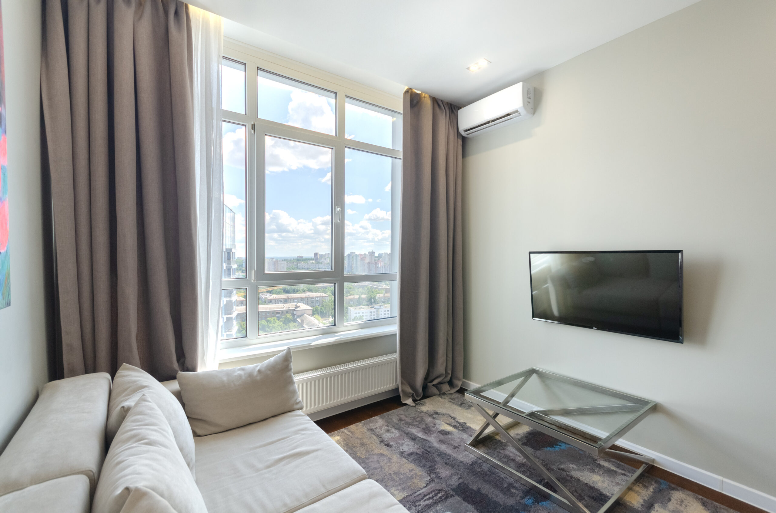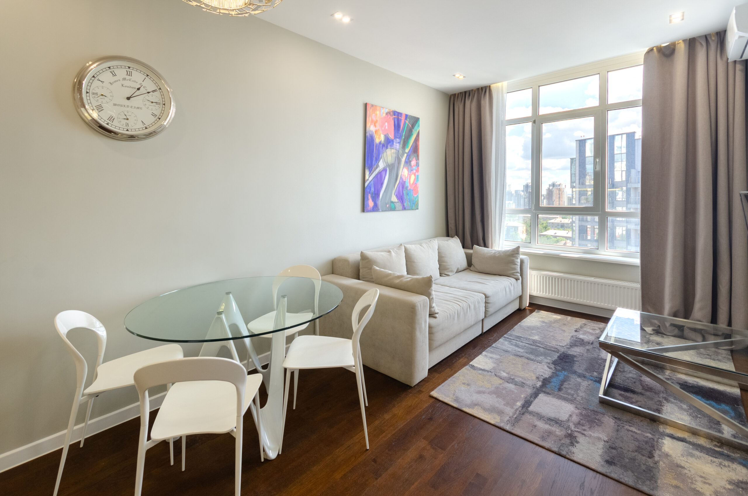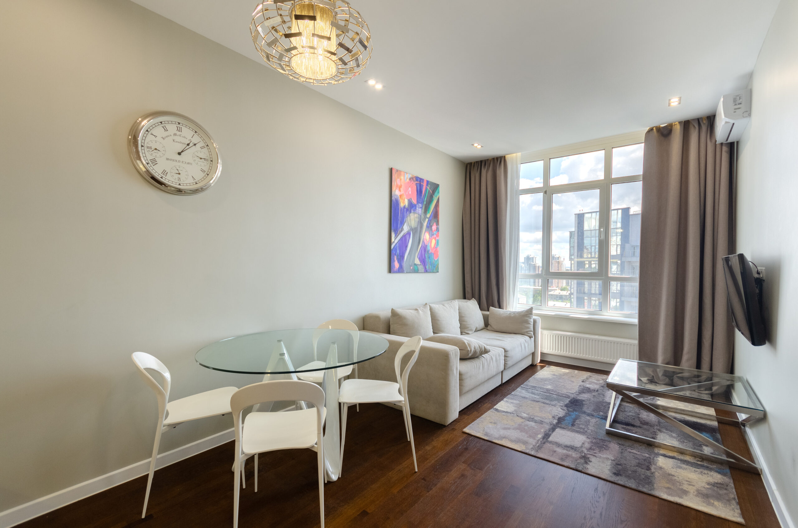 Cozy apartment with modern renovation is located in the center of the city, in the Central Park residential complex on John McCain (Kudry) Street. A wonderful elite area. The complex has round-the-clock security. One of the best houses in Kyiv. There is an underground parking lot in the building, which can be used as shelter.