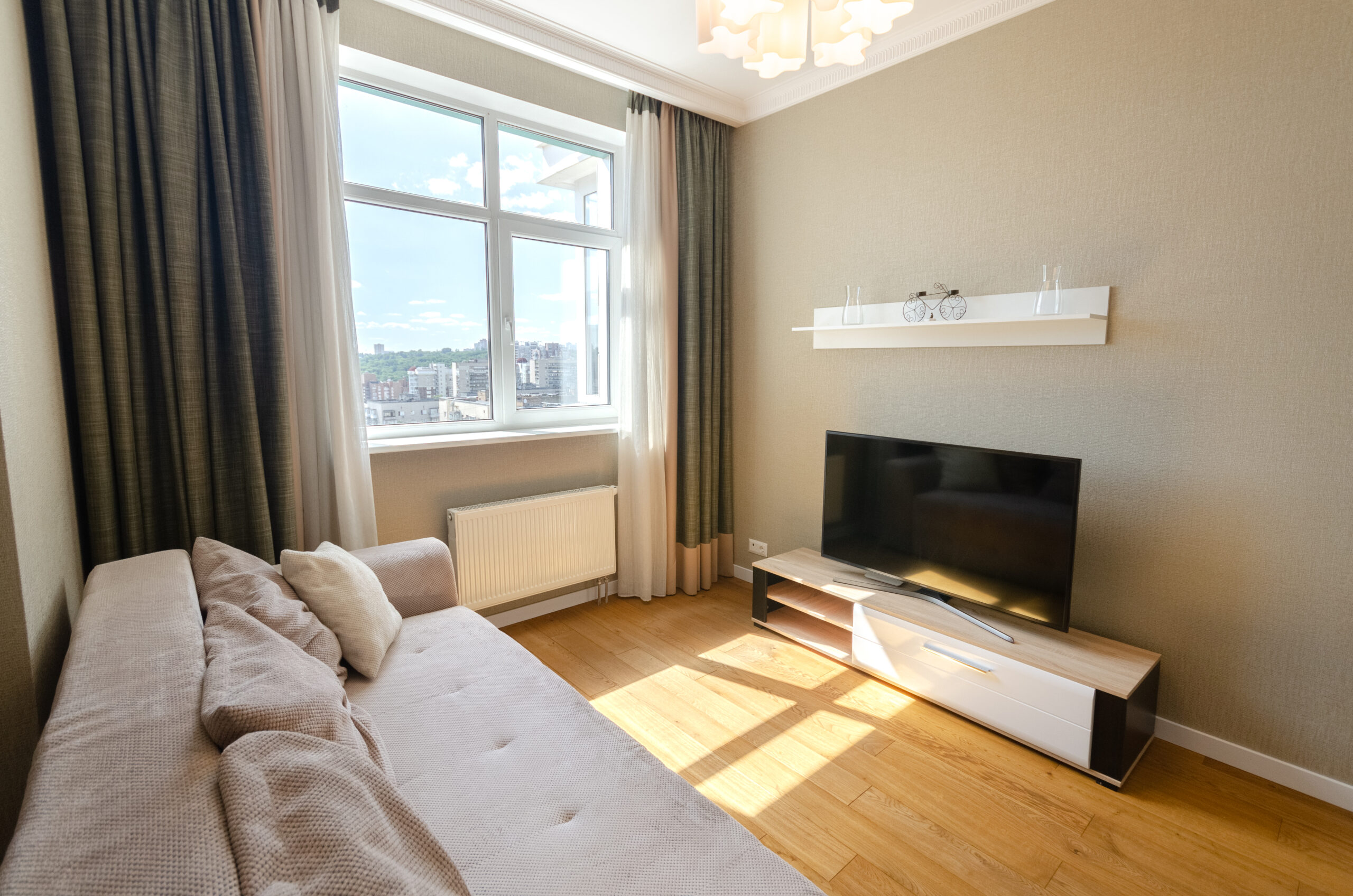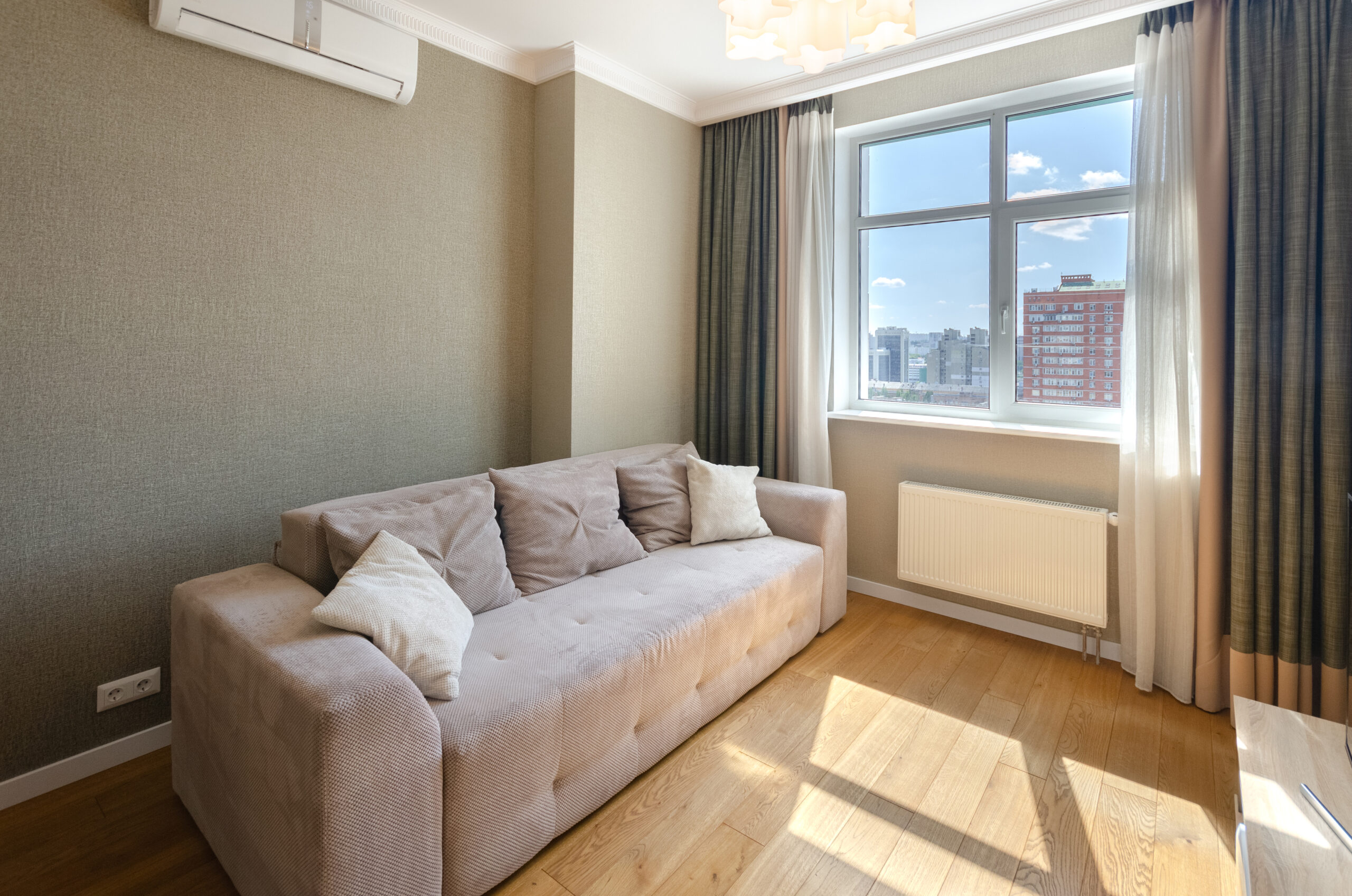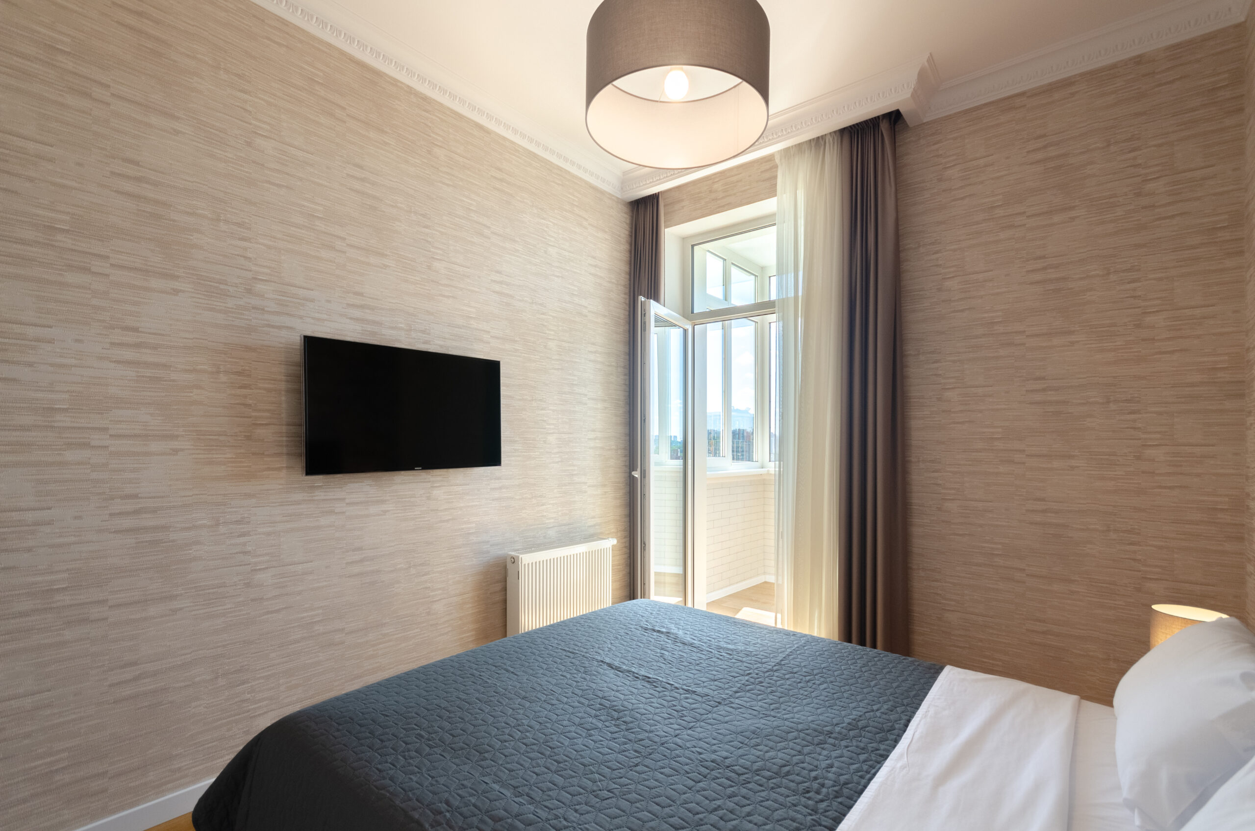The apartment is located on the 10th floor, with an area of 45 m2, has a cozy bedroom with access to a balcony with an incredible view of Kyiv, a living room with kitchen equipped with everything necessary for cooking, and a bathroom.