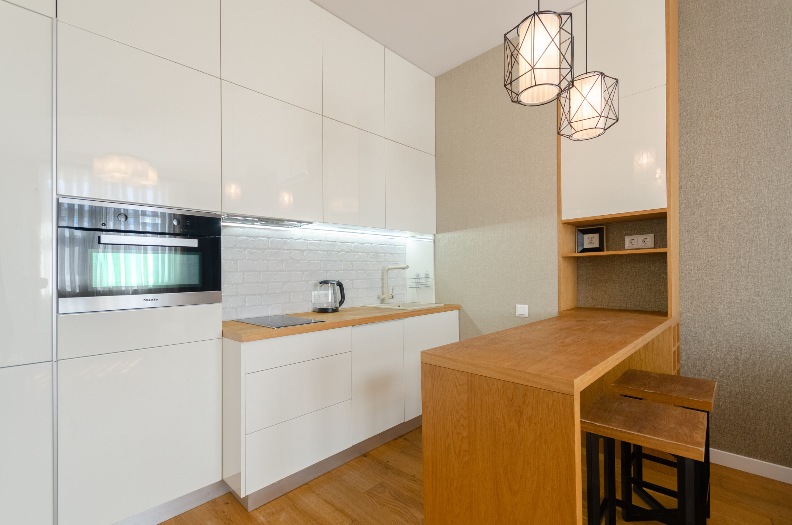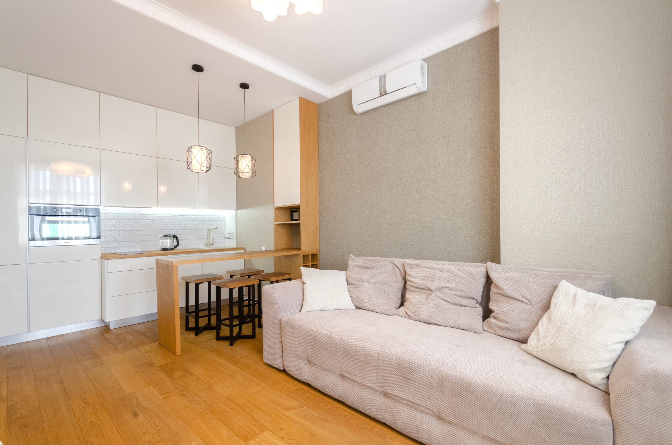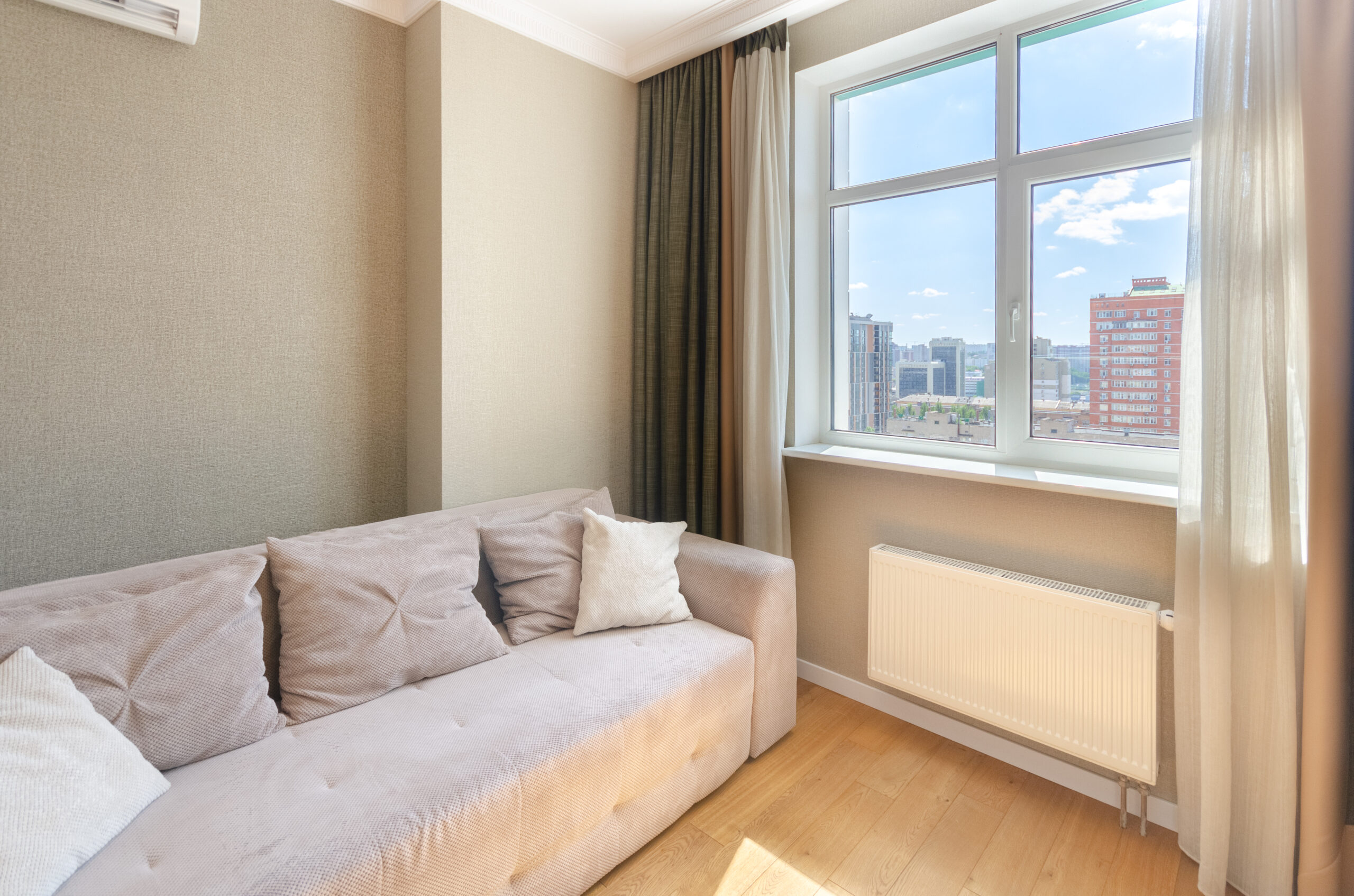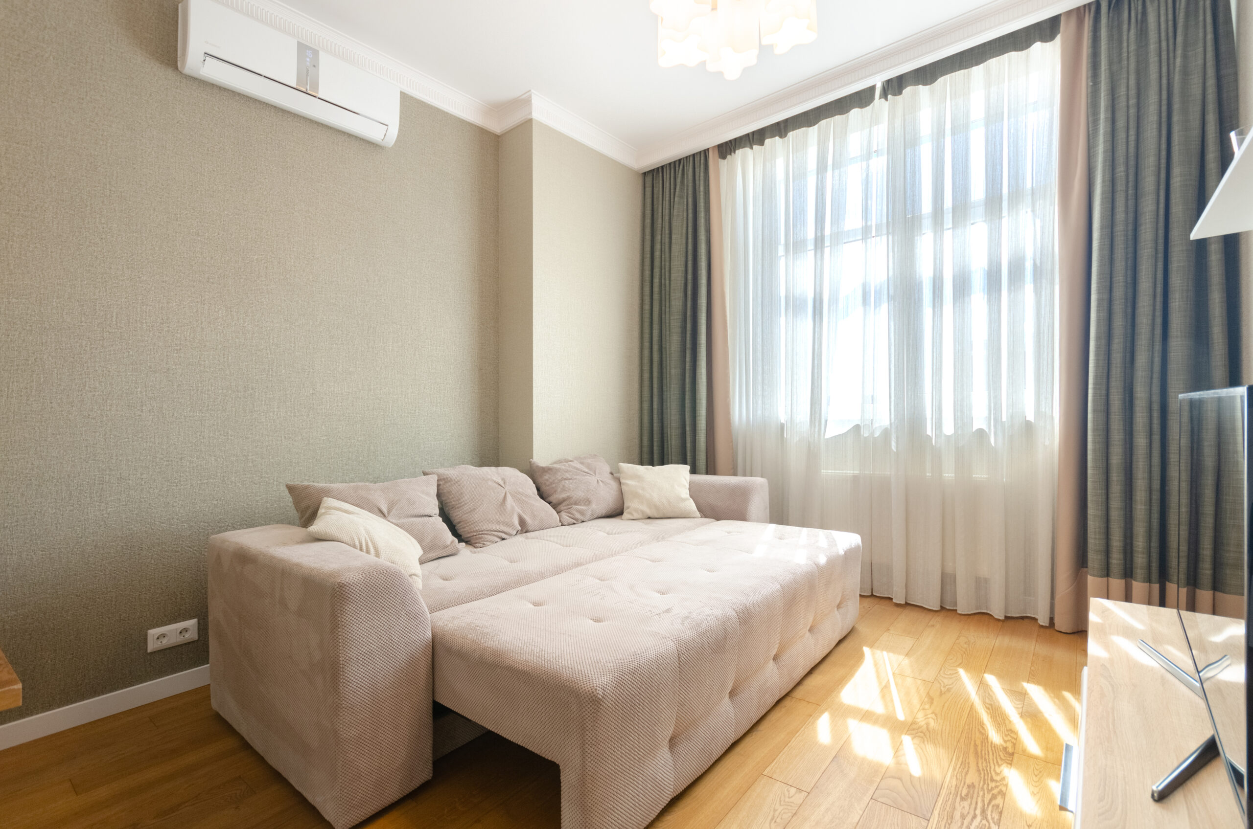 The apartment is located on the 10th floor, with an area of 45 m2, has a cozy bedroom with access to a balcony with an incredible view of Kyiv, a living room with kitchen equipped with everything necessary for cooking, and a bathroom.