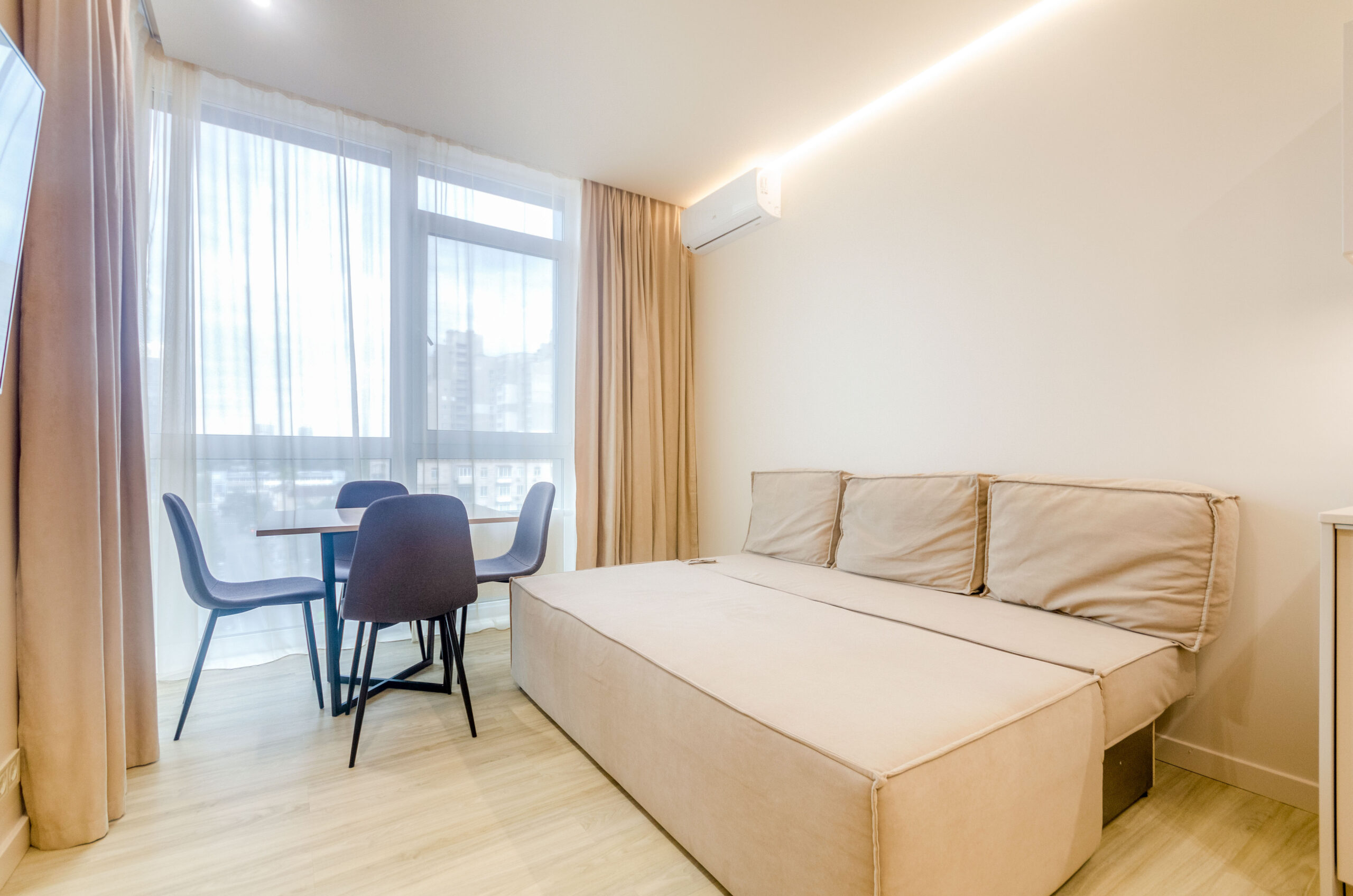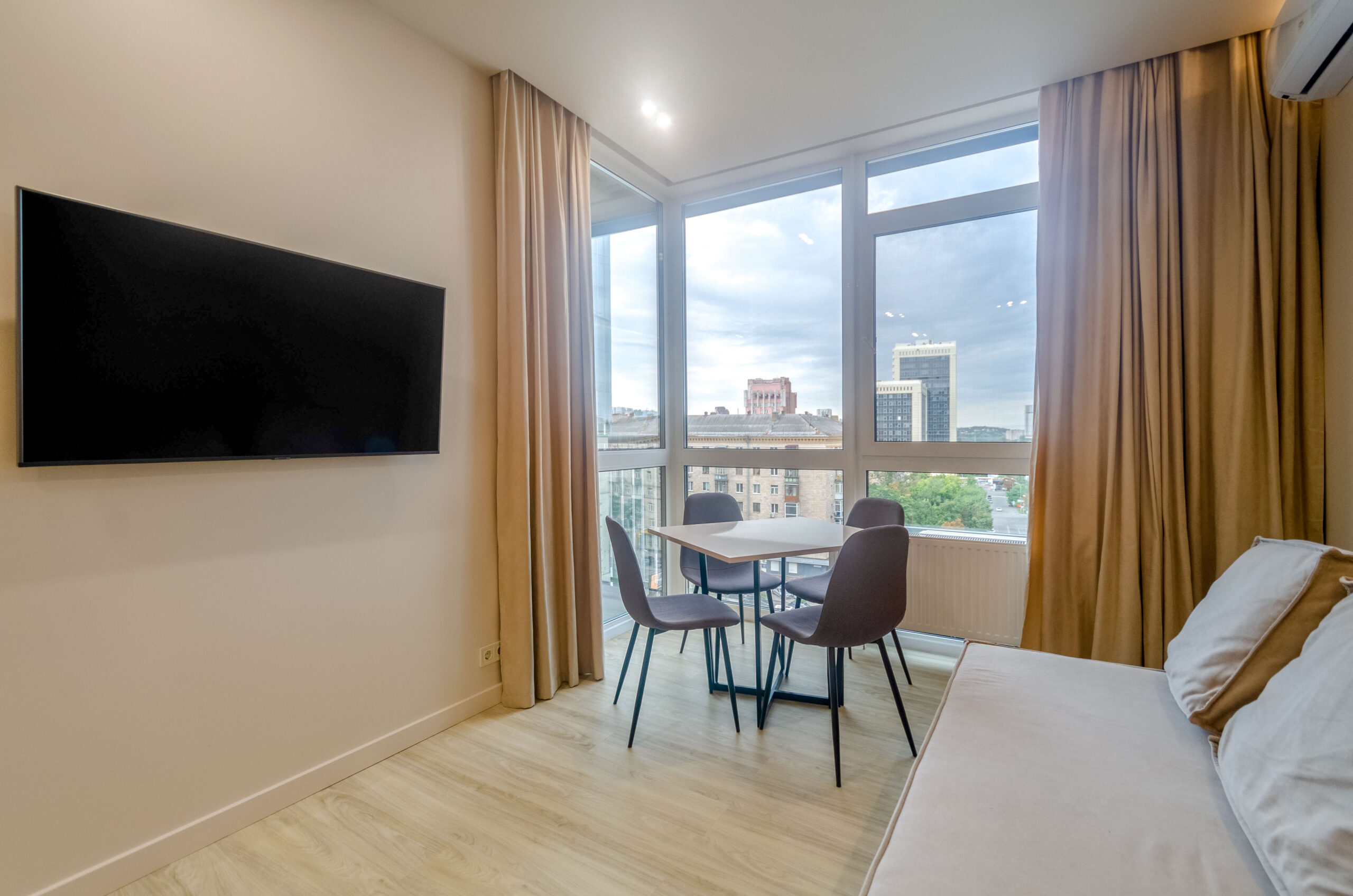 The apartment is located on the 6th floor, with an area of 45 m2, has a cozy bedroom with access to a balcony with an incredible view of Kyiv, a living room with kitchen equipped with everything necessary for cooking, and a bathroom.The apartment is fully equipped with everything necessary for a comfortable stay (there is bedding, all the necessary dishes, household appliances)