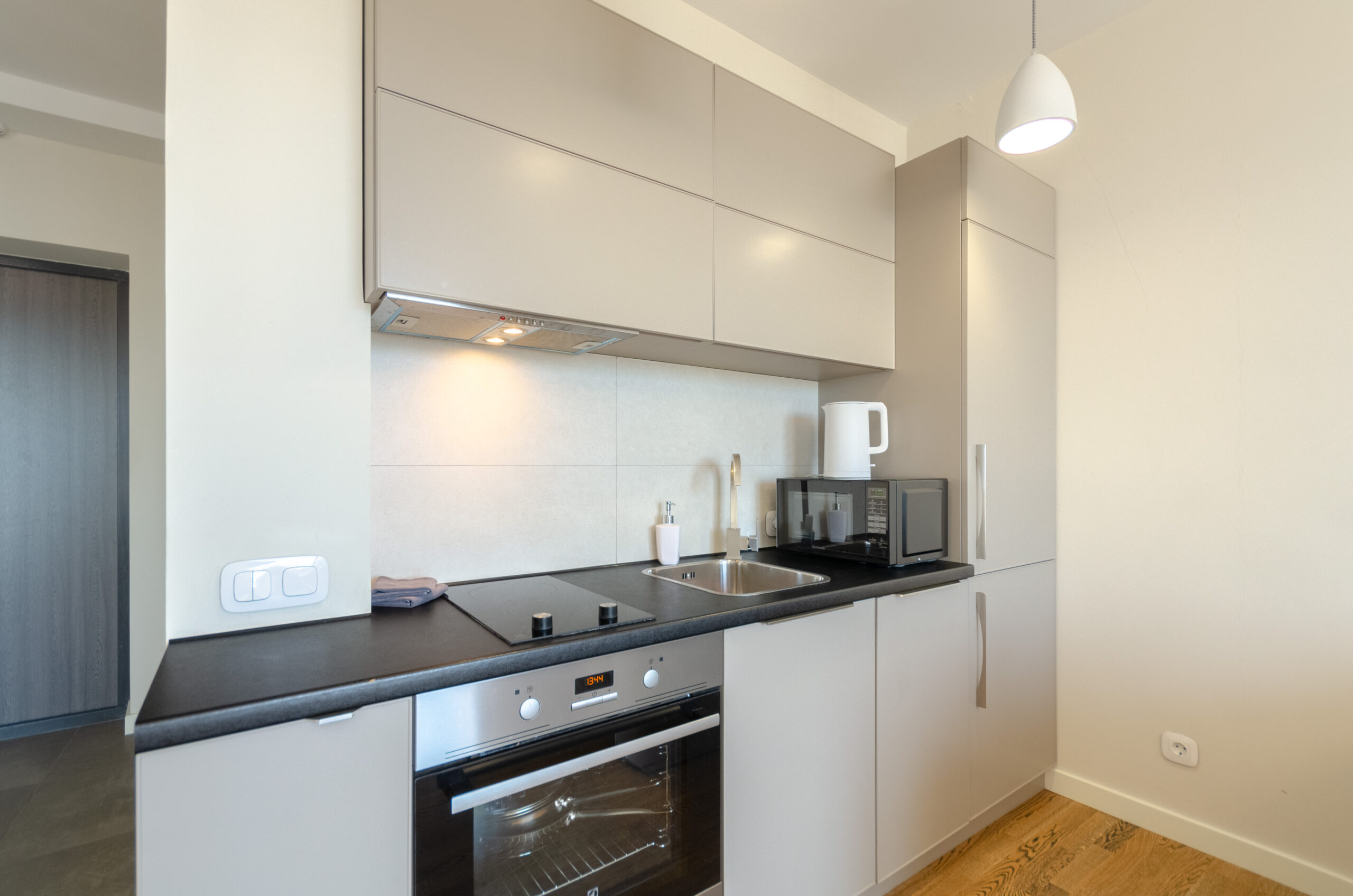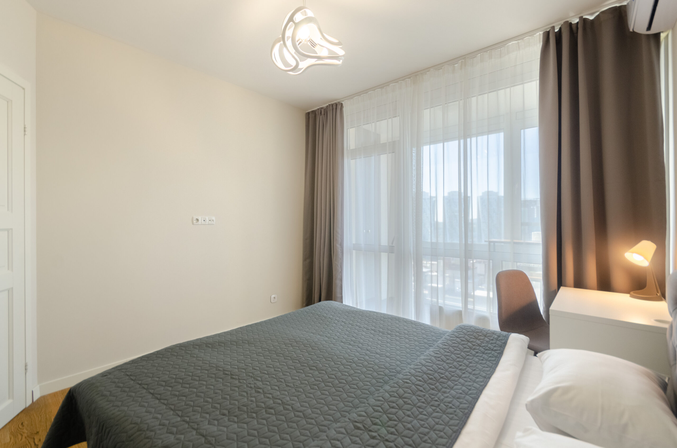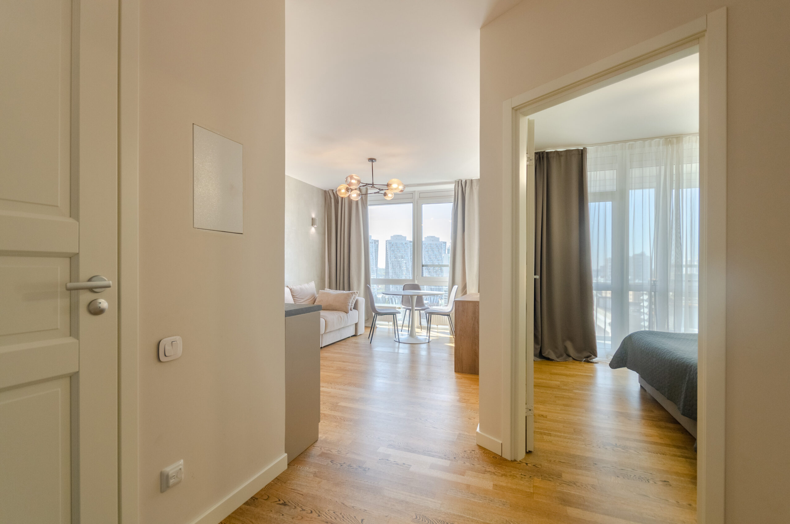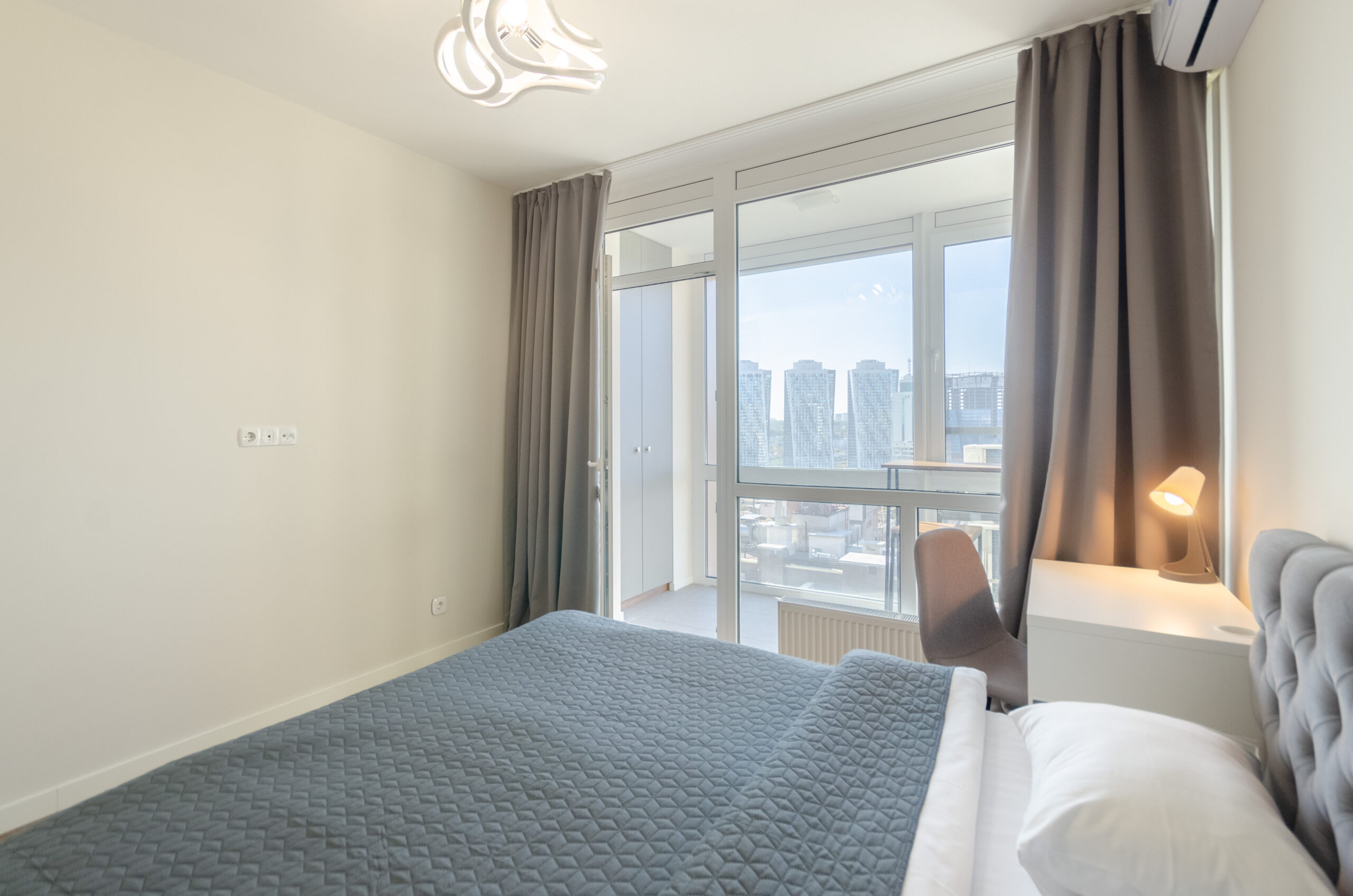 The apartment is located on the 19th floor, with an area of 50 m2, with a separate bedroom, a living room with kitchen and a bathroom with a bathtub and a shower. It is equipped with everything you need for a comfortable stay.