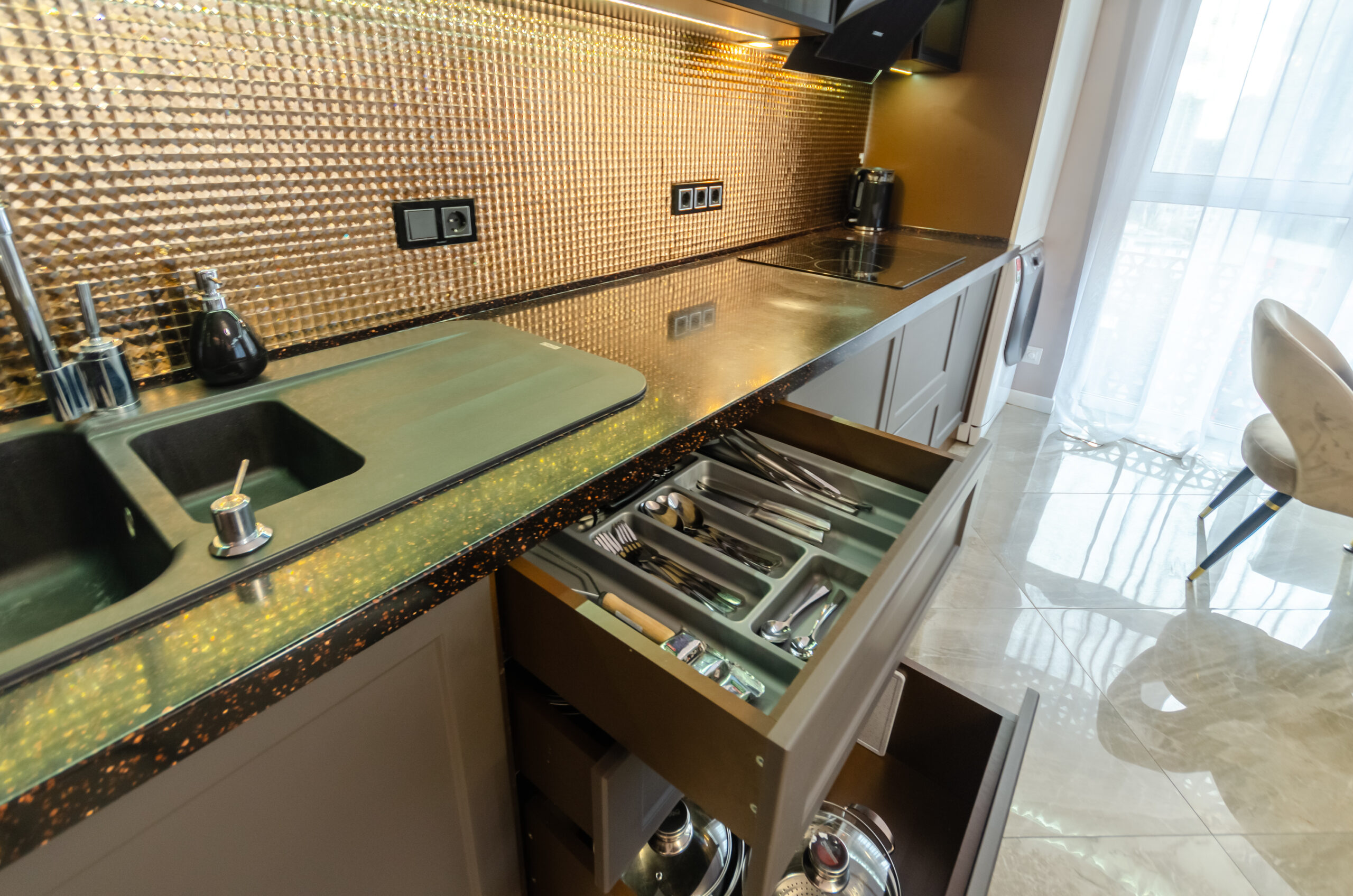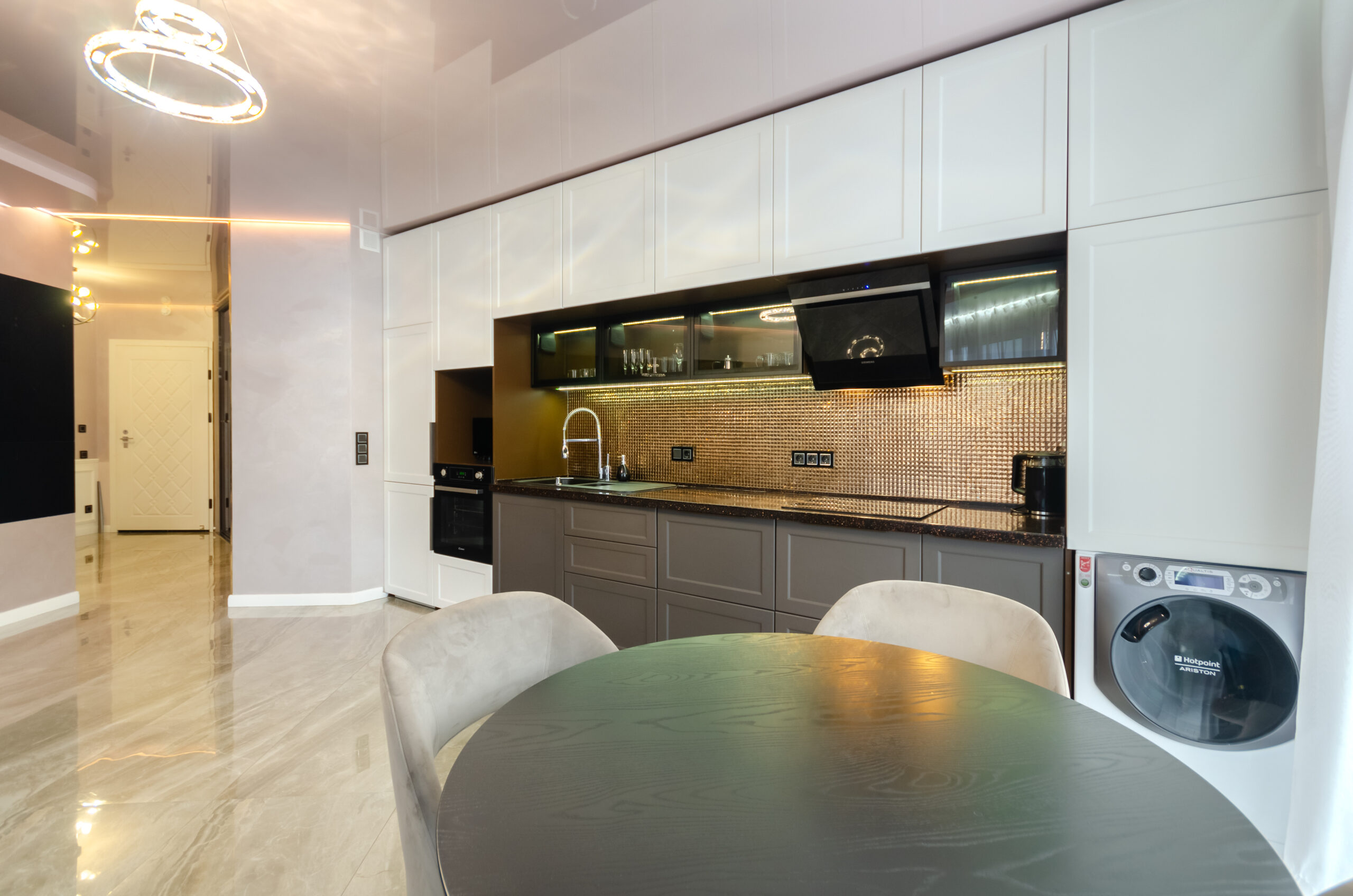 *living room (divided into zones, includes kitchen): double sofa 160*200 cm, flat screen Smart-TV, air conditioner, kitchen (refrigerator, dishwasher, washing machine, microwave oven, kettle, electric stove, oven, pots, pans, all necessary dishes, cups, glasses, wine glasses, dining table).