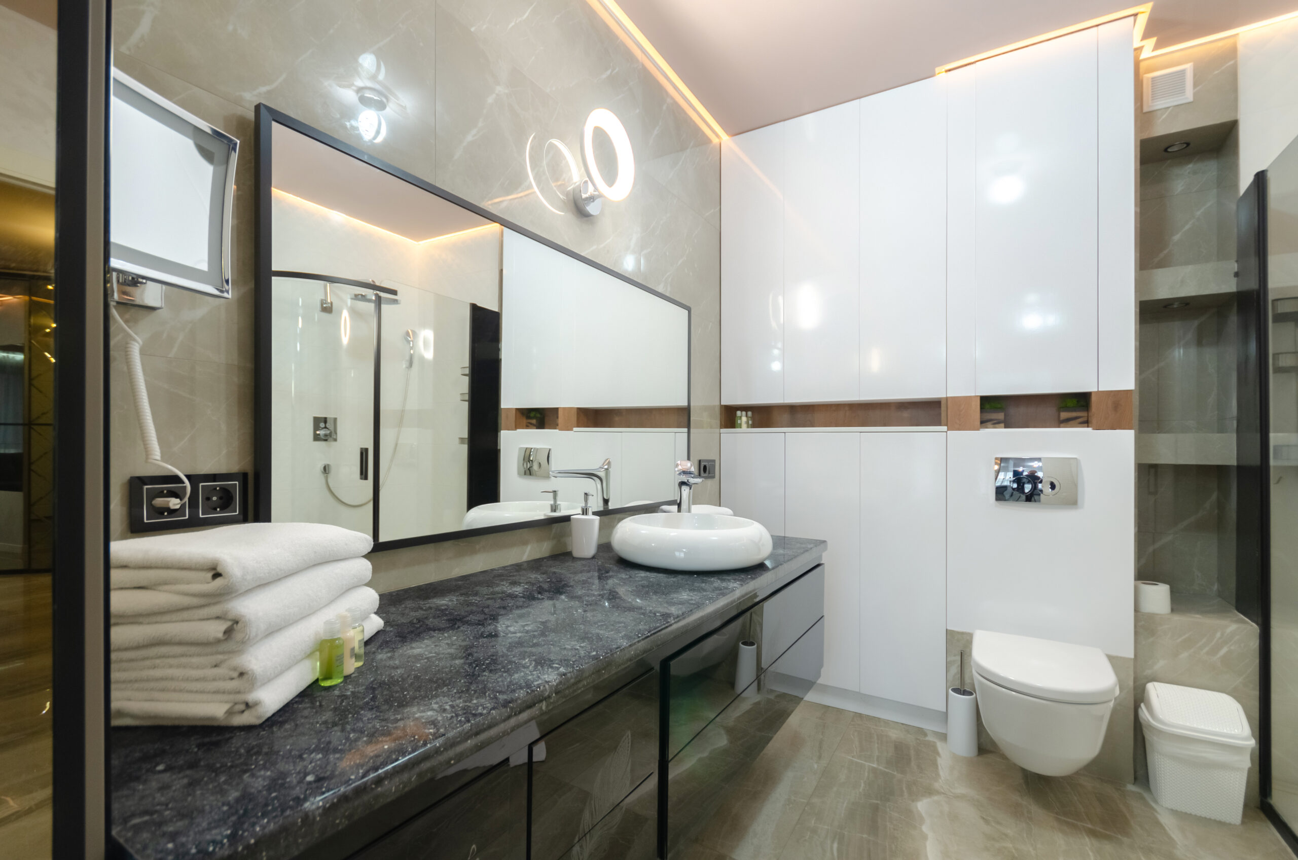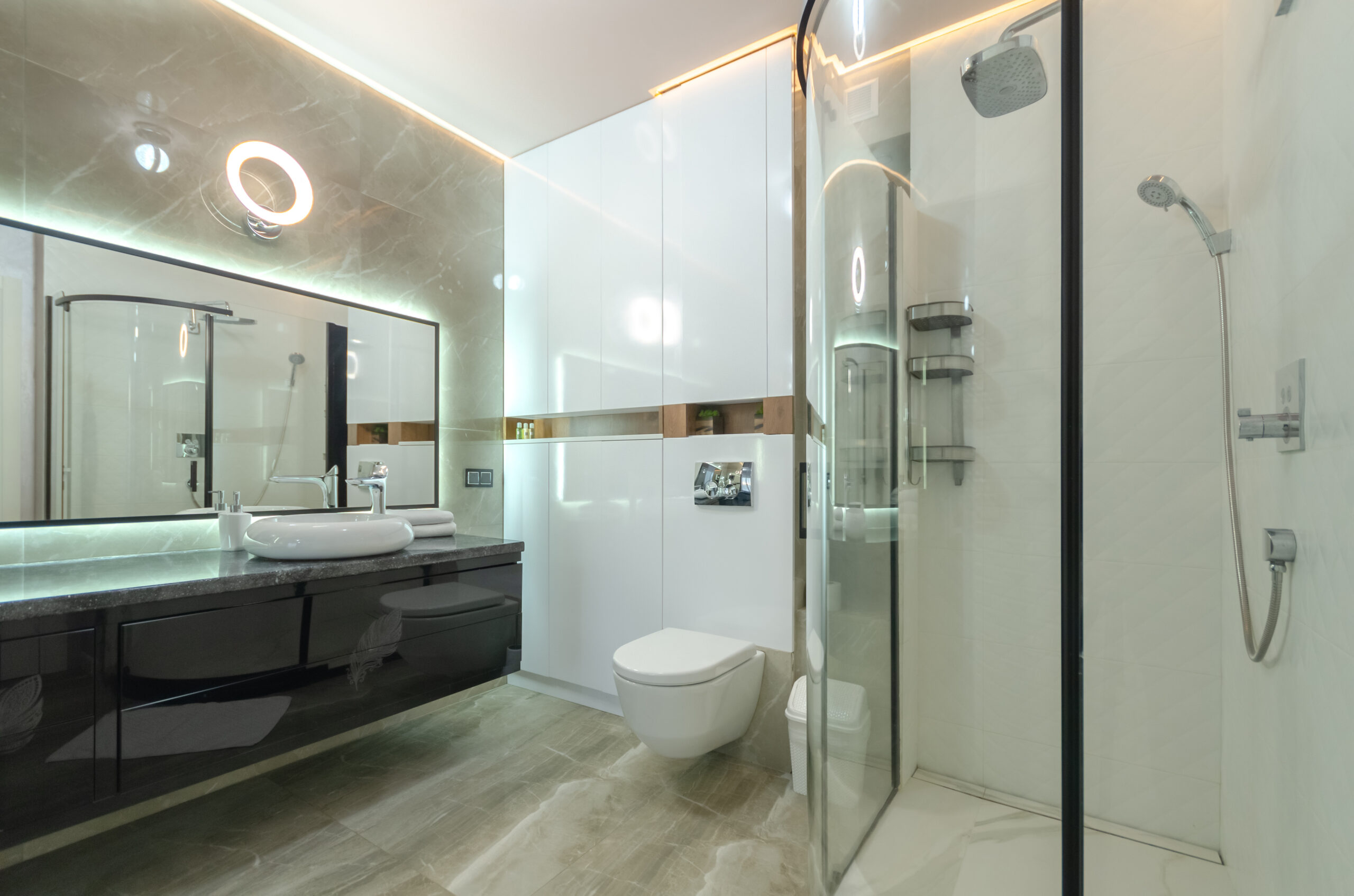 *bathroom: shower, washbasin, toiletries, hair dryer, towels