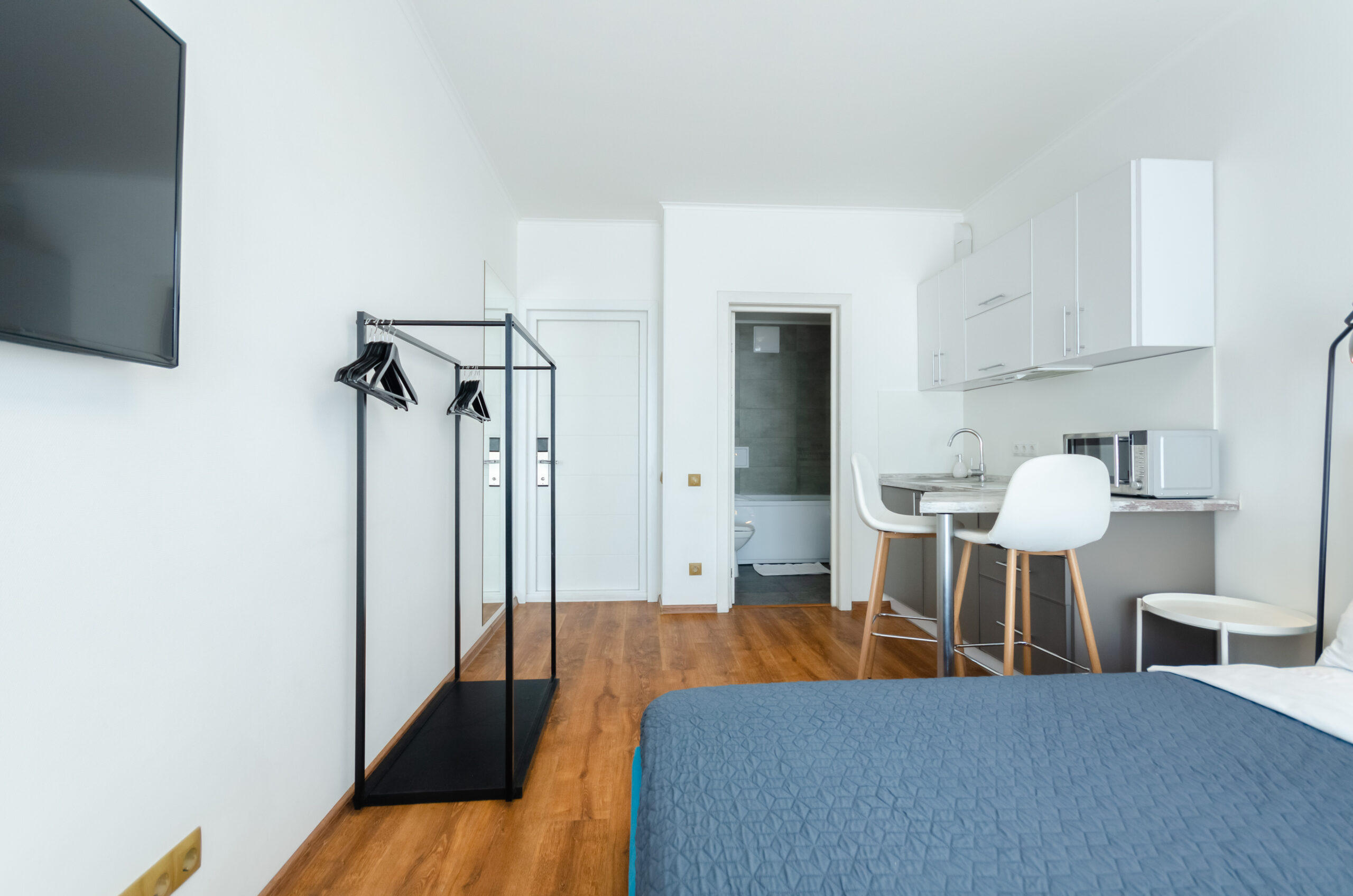 The apartment is located on the 20th floor, with an area of 25 m2, the one-bedroom apartment includes a bedroom with a wide comfortable bed, a small kitchen and a bathroom with a full bath and shower.