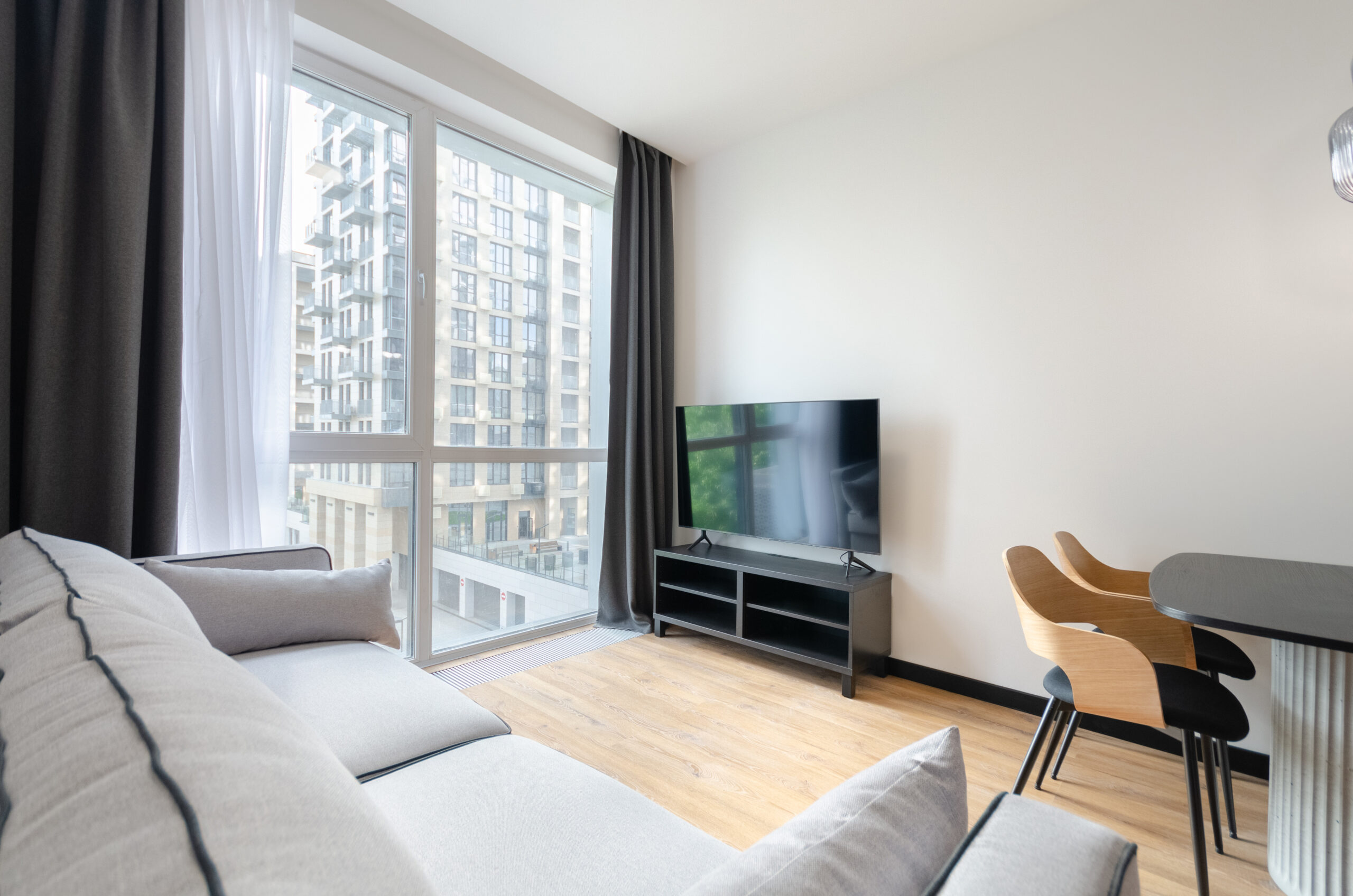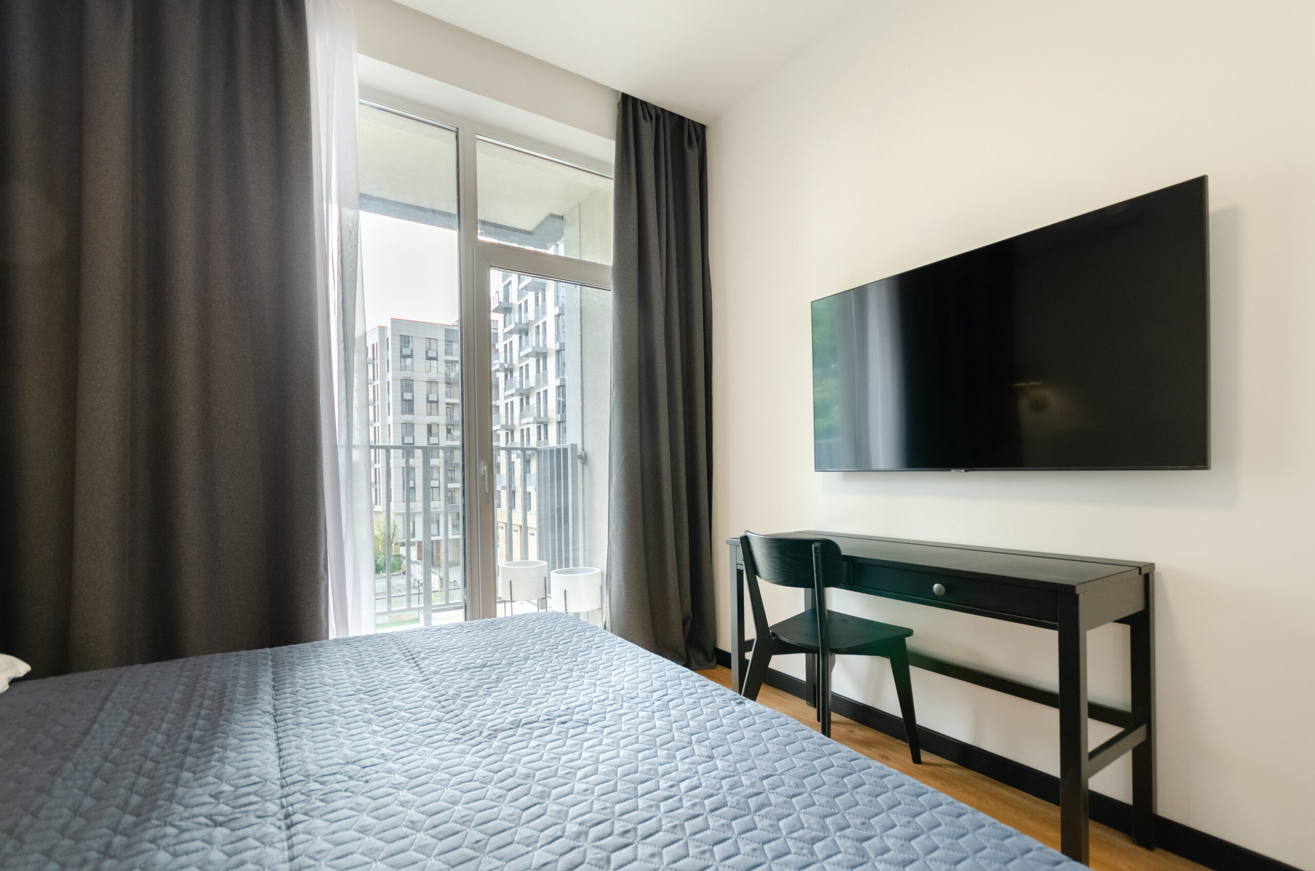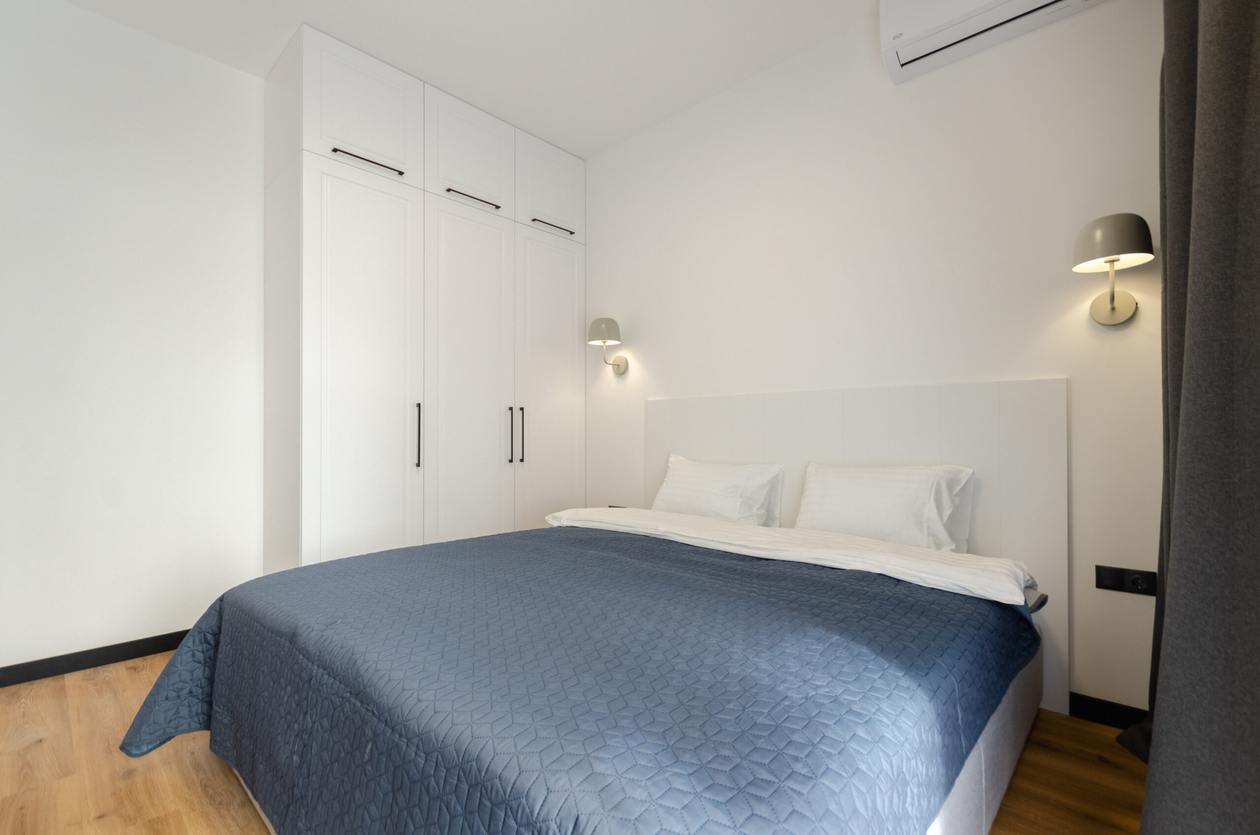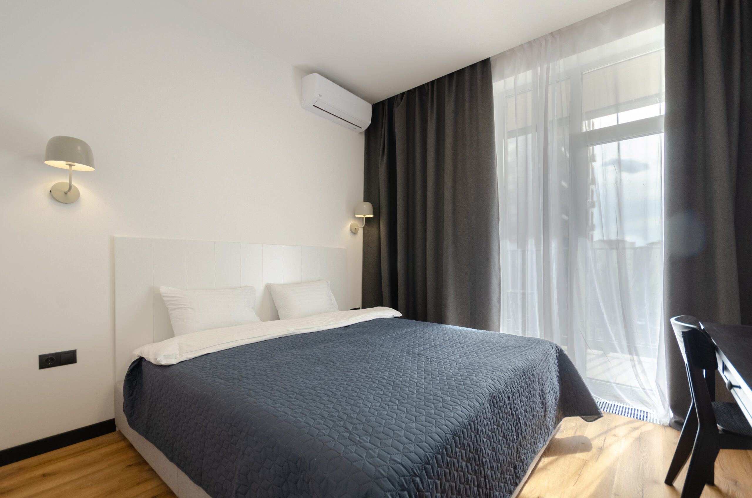 The apartment is located on the 4th floor with an area of 50 m2, has a living room-kitchen with panoramic windows, a separate bedroom with a balcony and a bathroom. The apartment has bedding, all the necessary dishes, small household appliances – everything for a comfortable stay for any period.