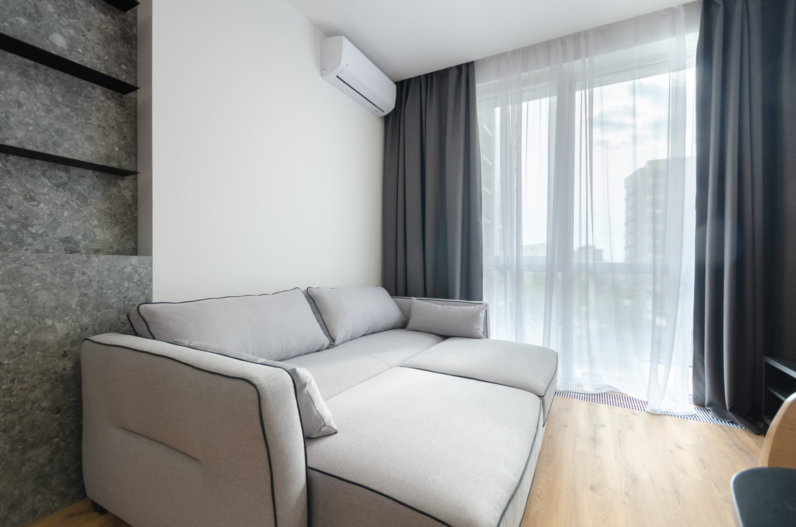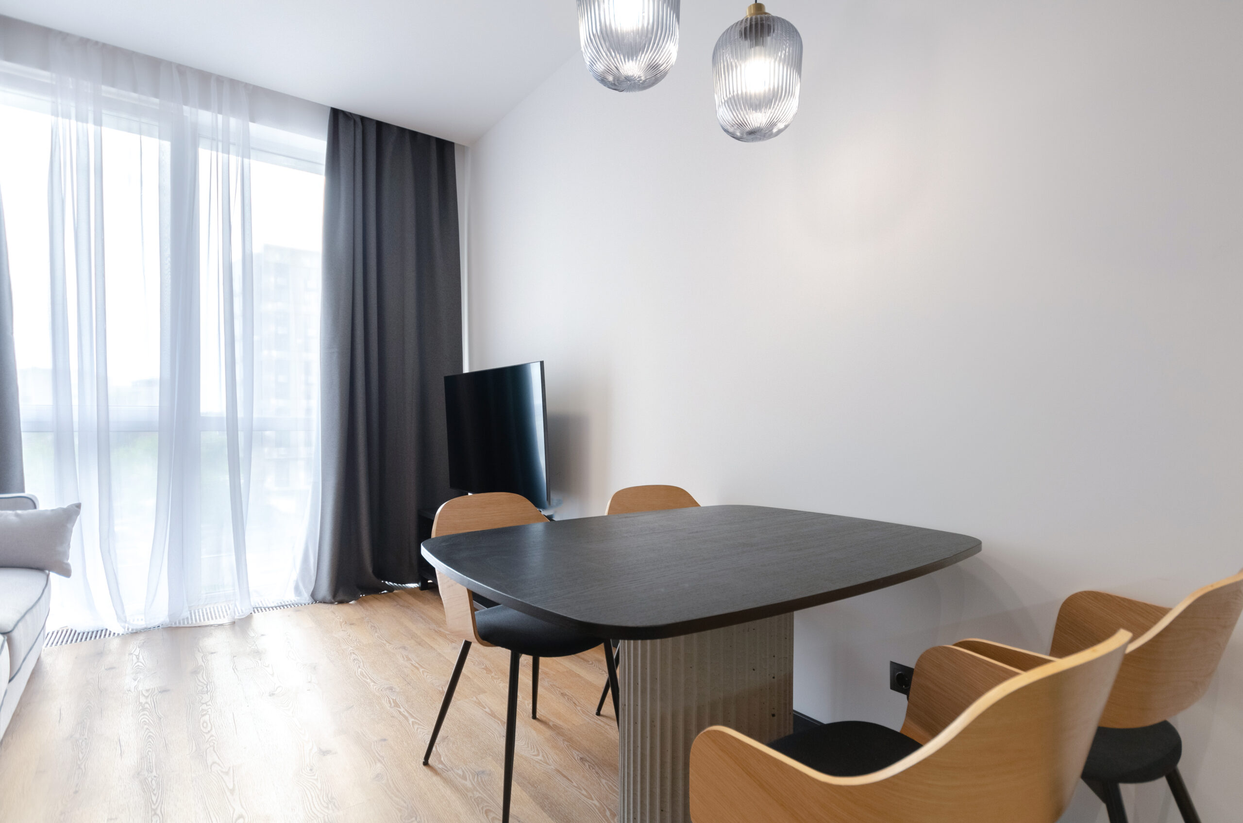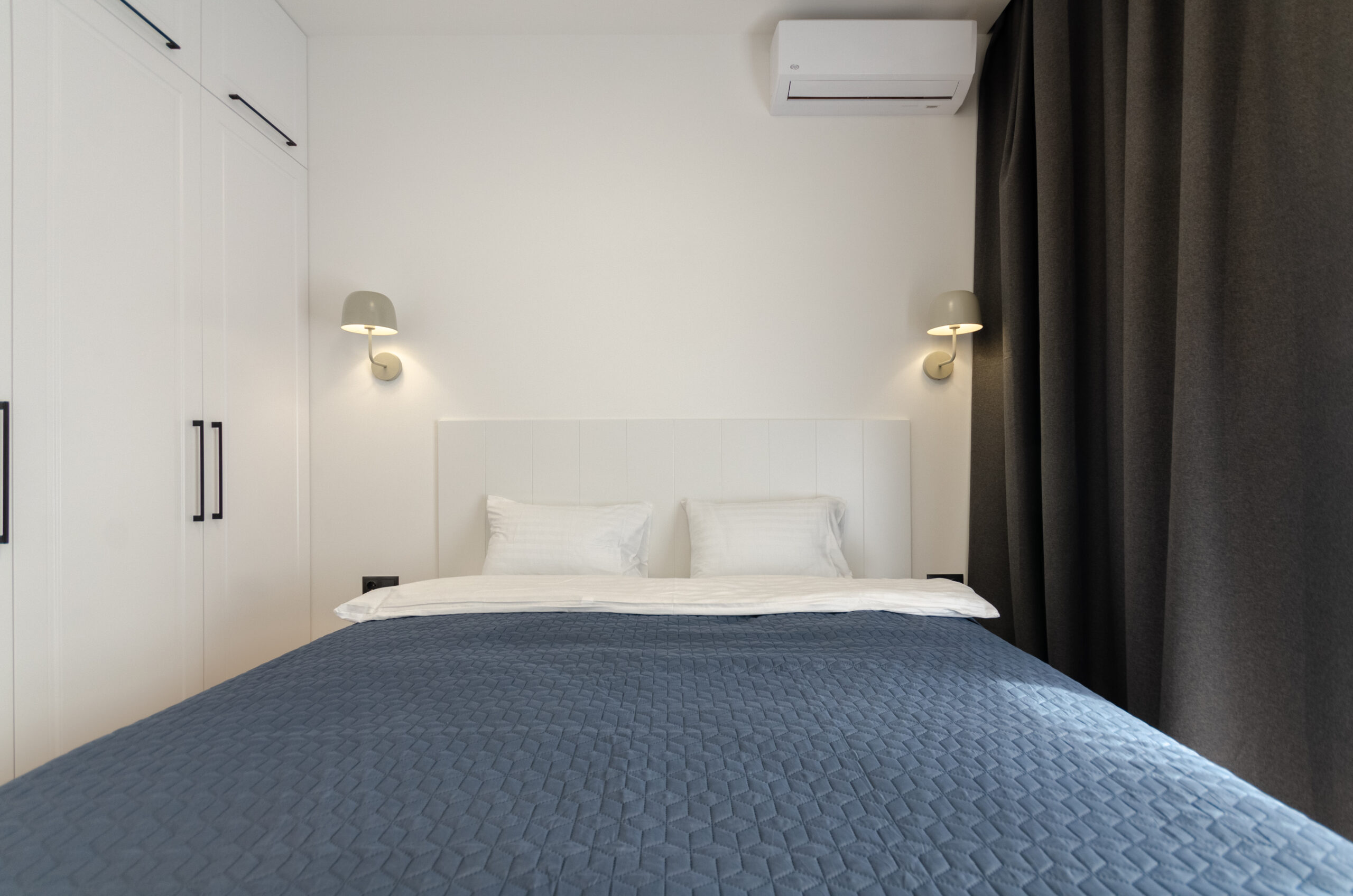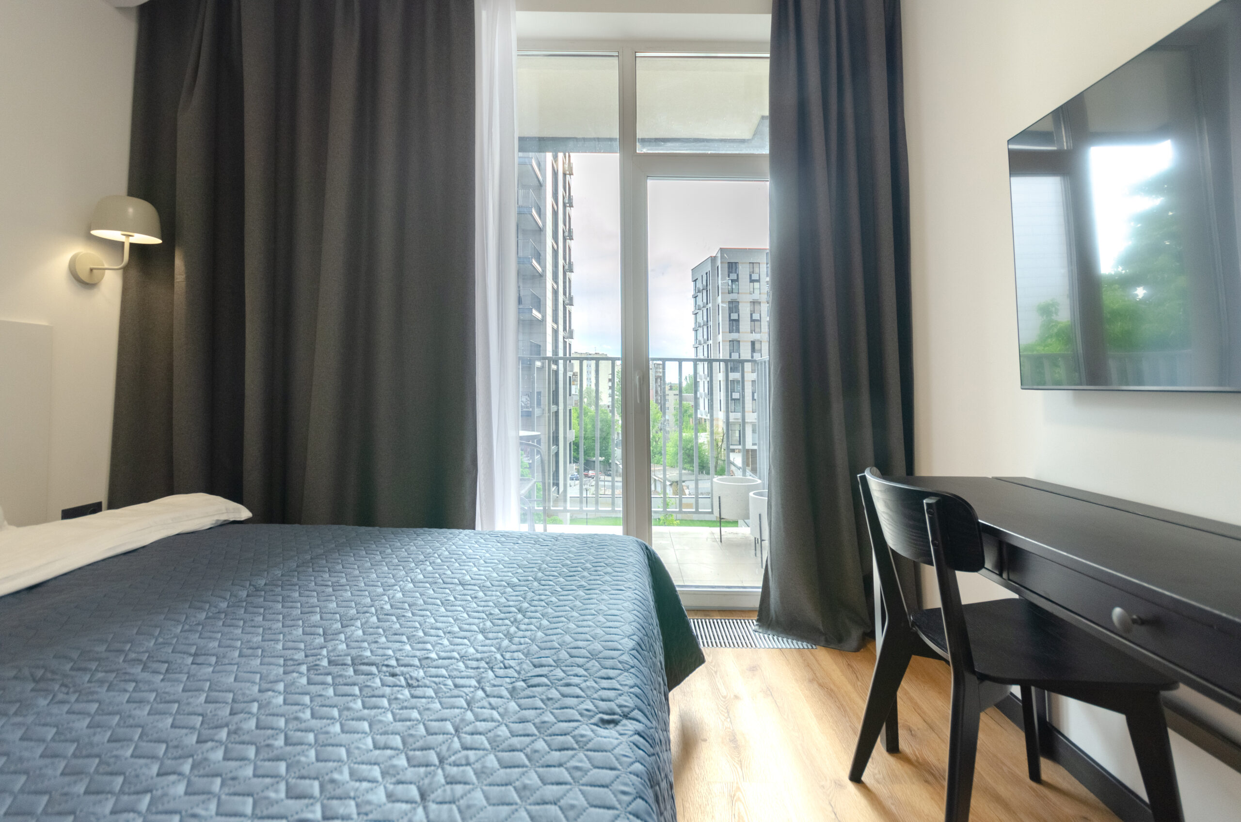 The apartment is located on the 4th floor with an area of 50 m2, has a living room-kitchen with panoramic windows, a separate bedroom with a balcony and a bathroom. The apartment has bedding, all the necessary dishes, small household appliances – everything for a comfortable stay for any period.