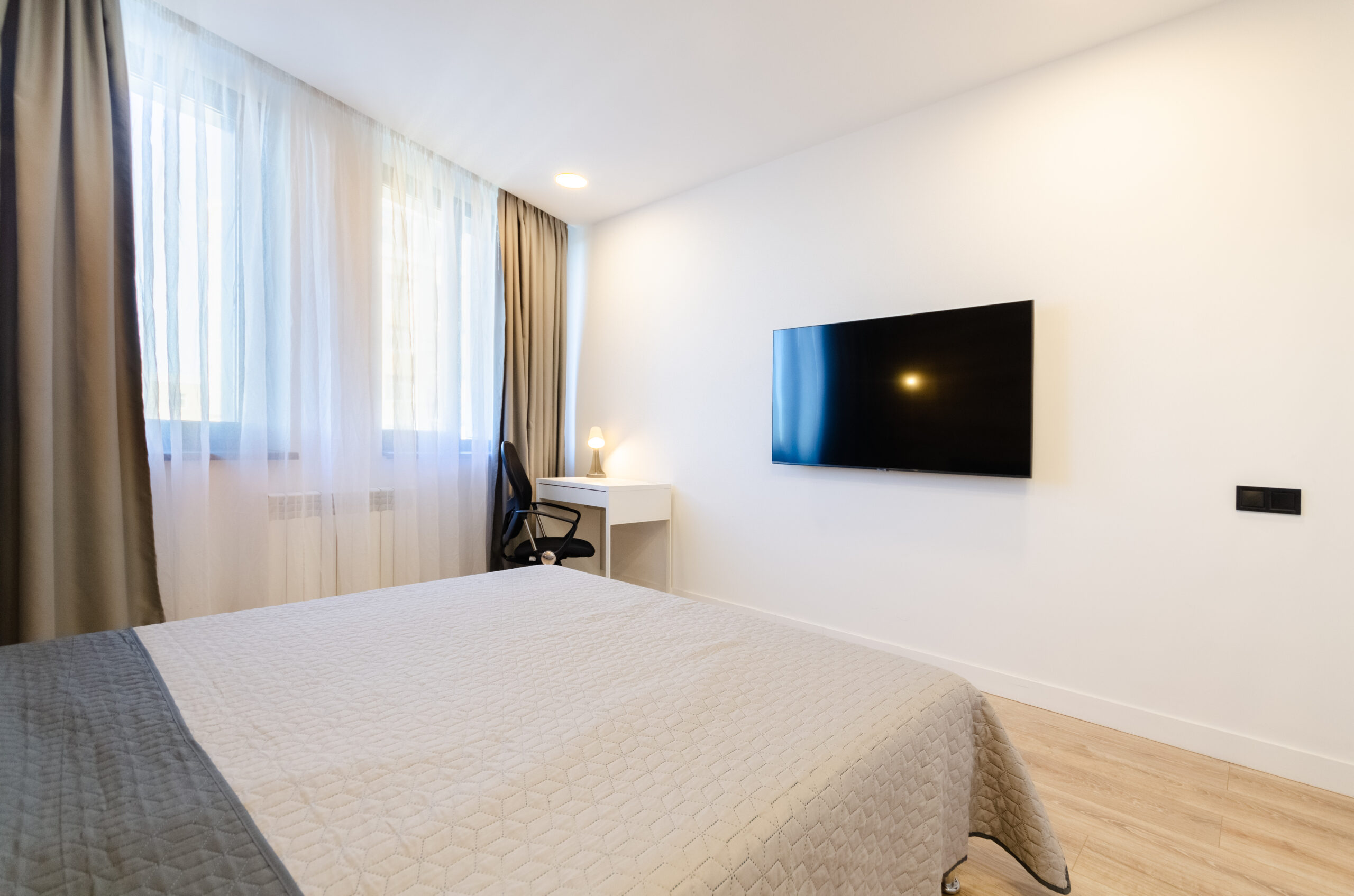 It is located on the 17th floor, the total area is 60 m2, a living room with a stylish kitchen, a separate bedroom, a bathroom. The apartment is equipped with everything necessary for a comfortable stay.