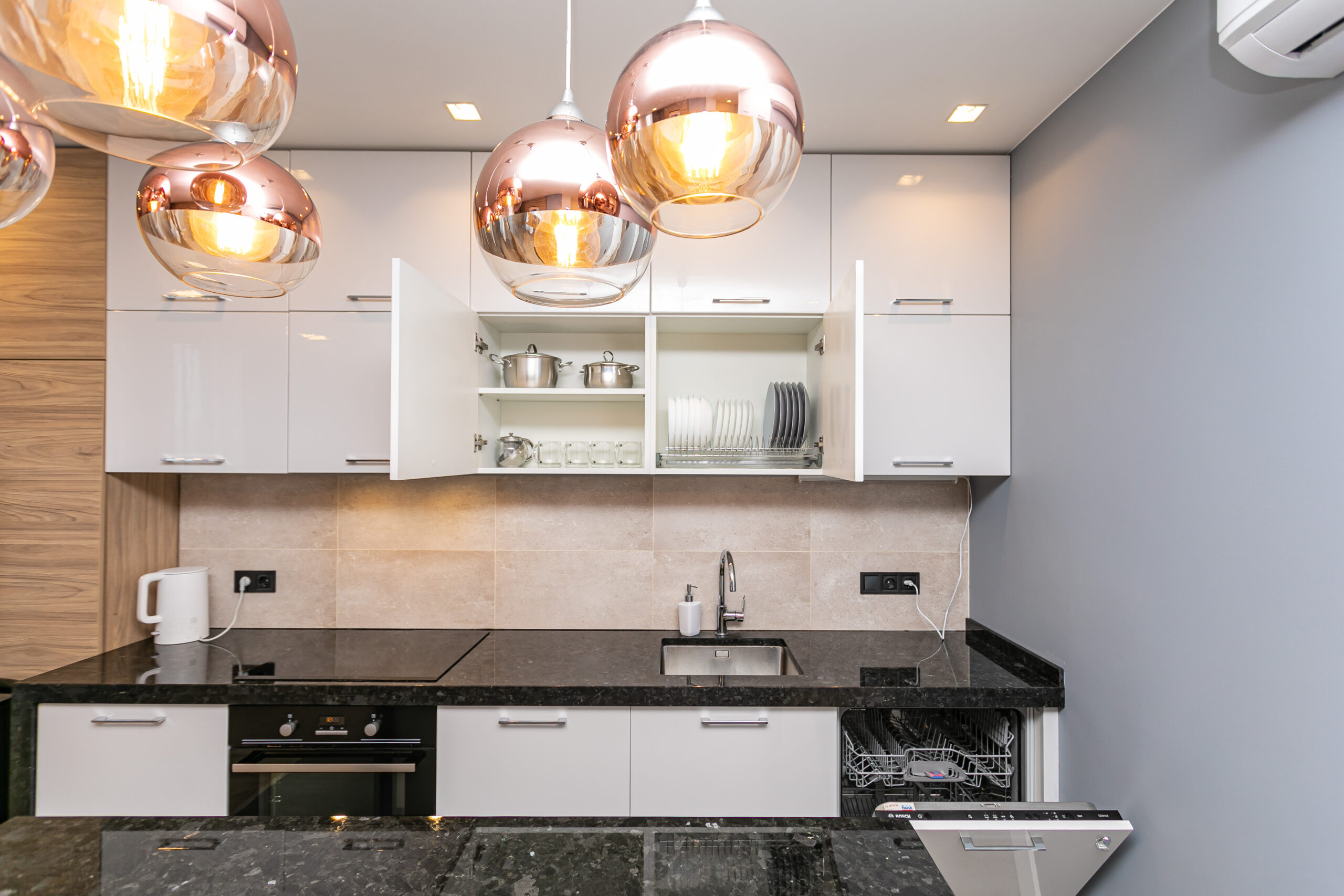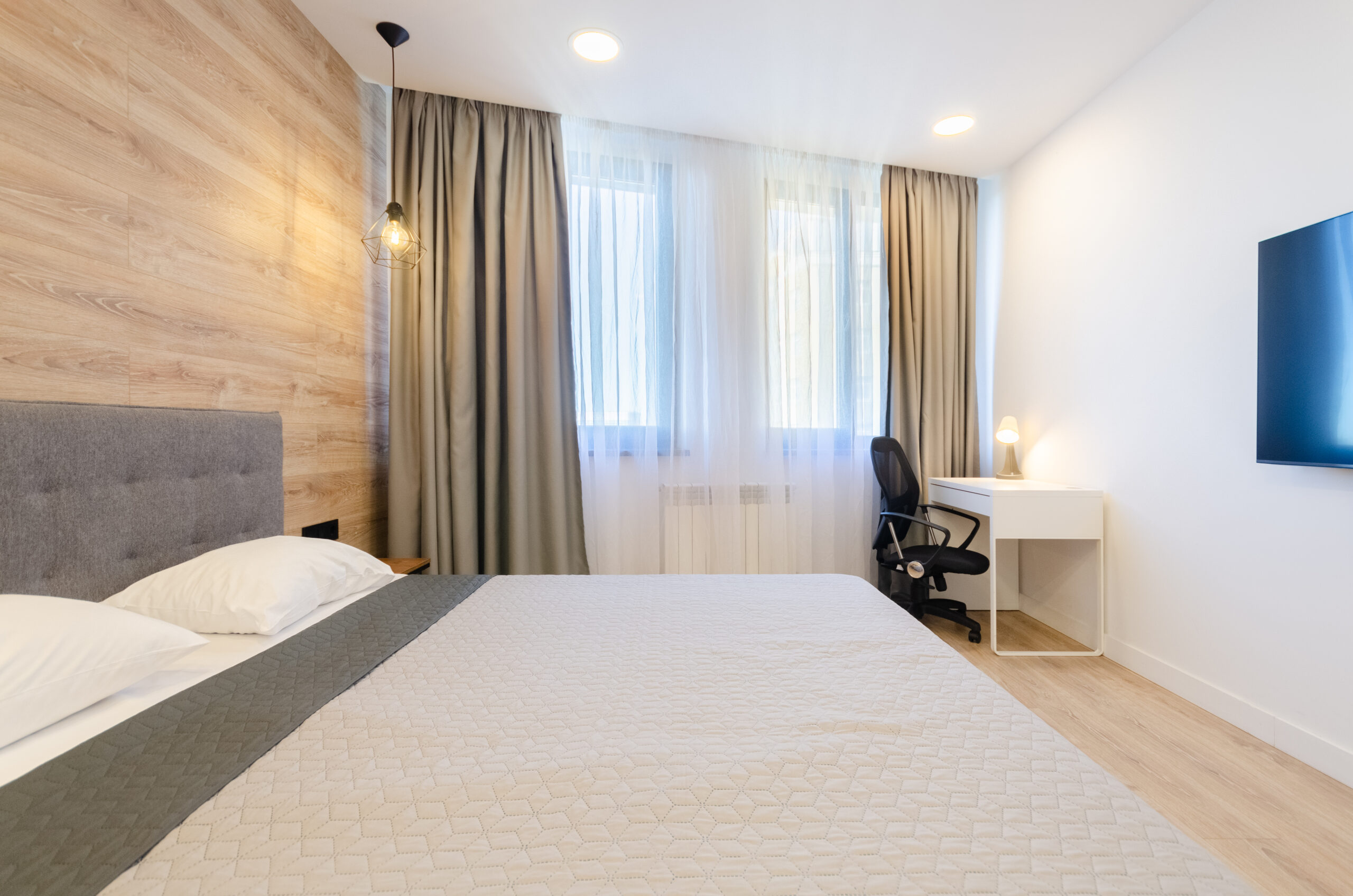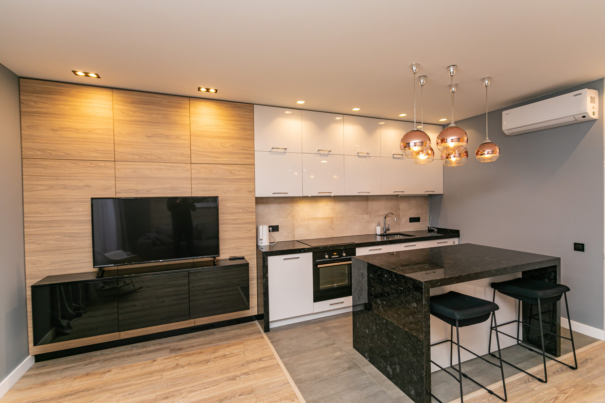 It is located on the 19th floor, the total area is 60 m2, a living room with a stylish kitchen, a separate bedroom, a bathroom. The apartment is equipped with everything necessary for a comfortable stay.