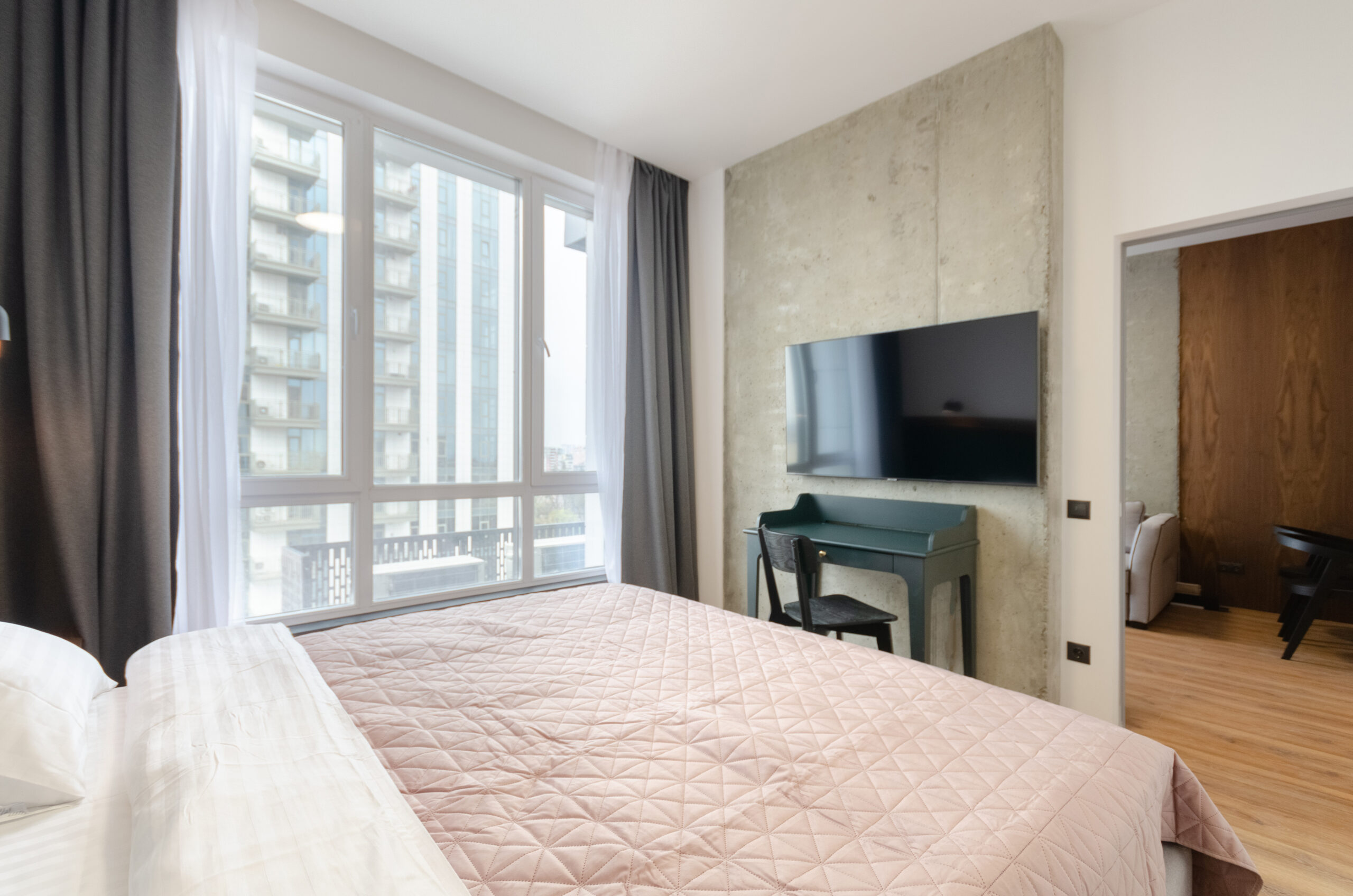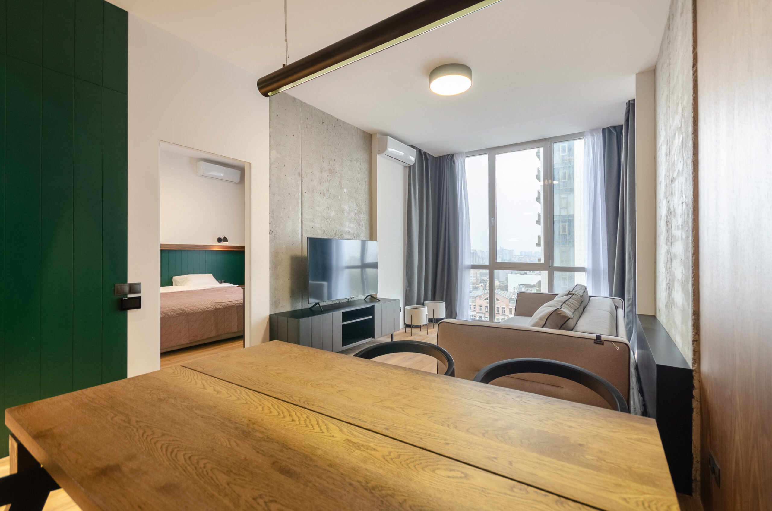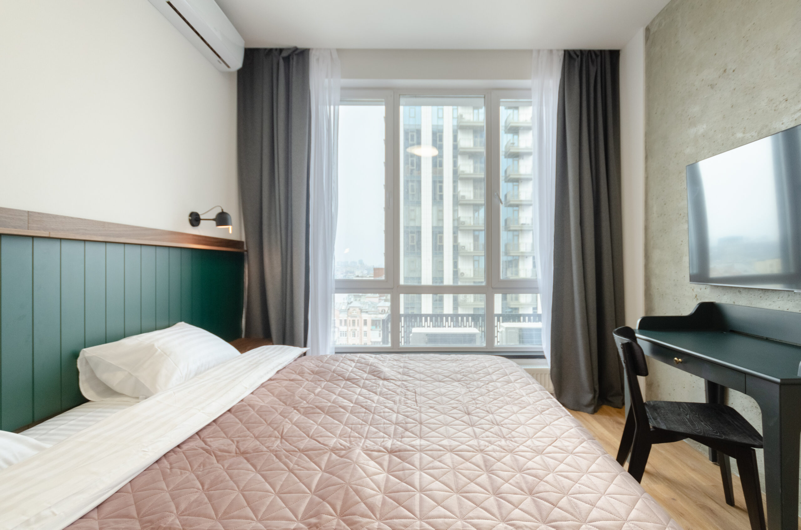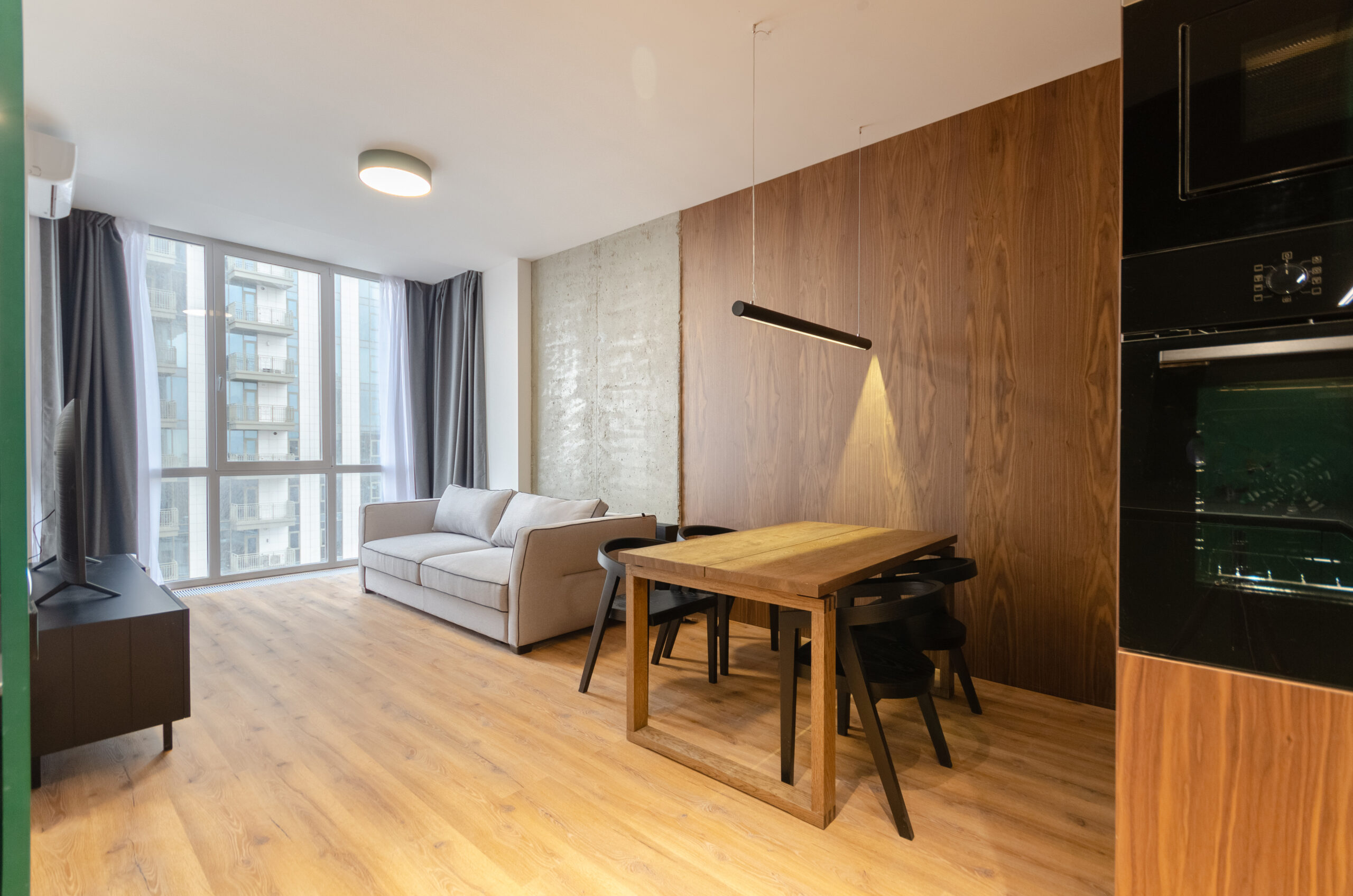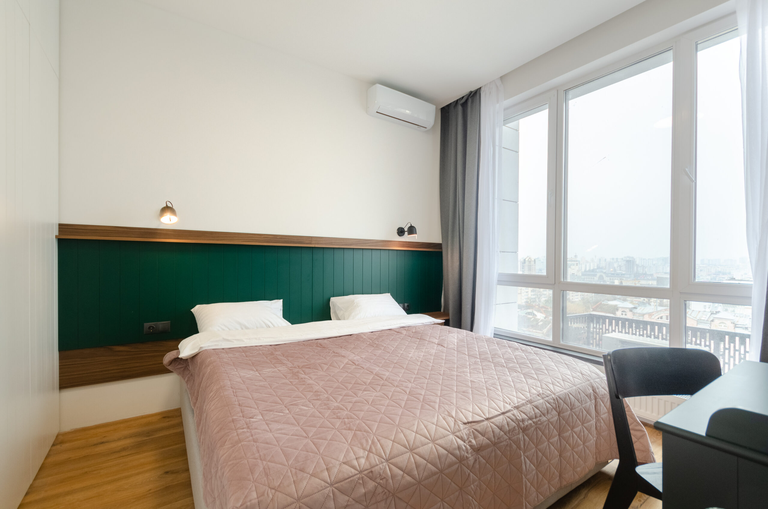 The apartment is located on the 10th floor, has an area of 55 m2, has a separate bedroom, a living room-kitchen with a panoramic view of Kyiv and a bathroom.The apartment has bedding, all the necessary dishes, small household appliances – everything for a comfortable stay for any period.
