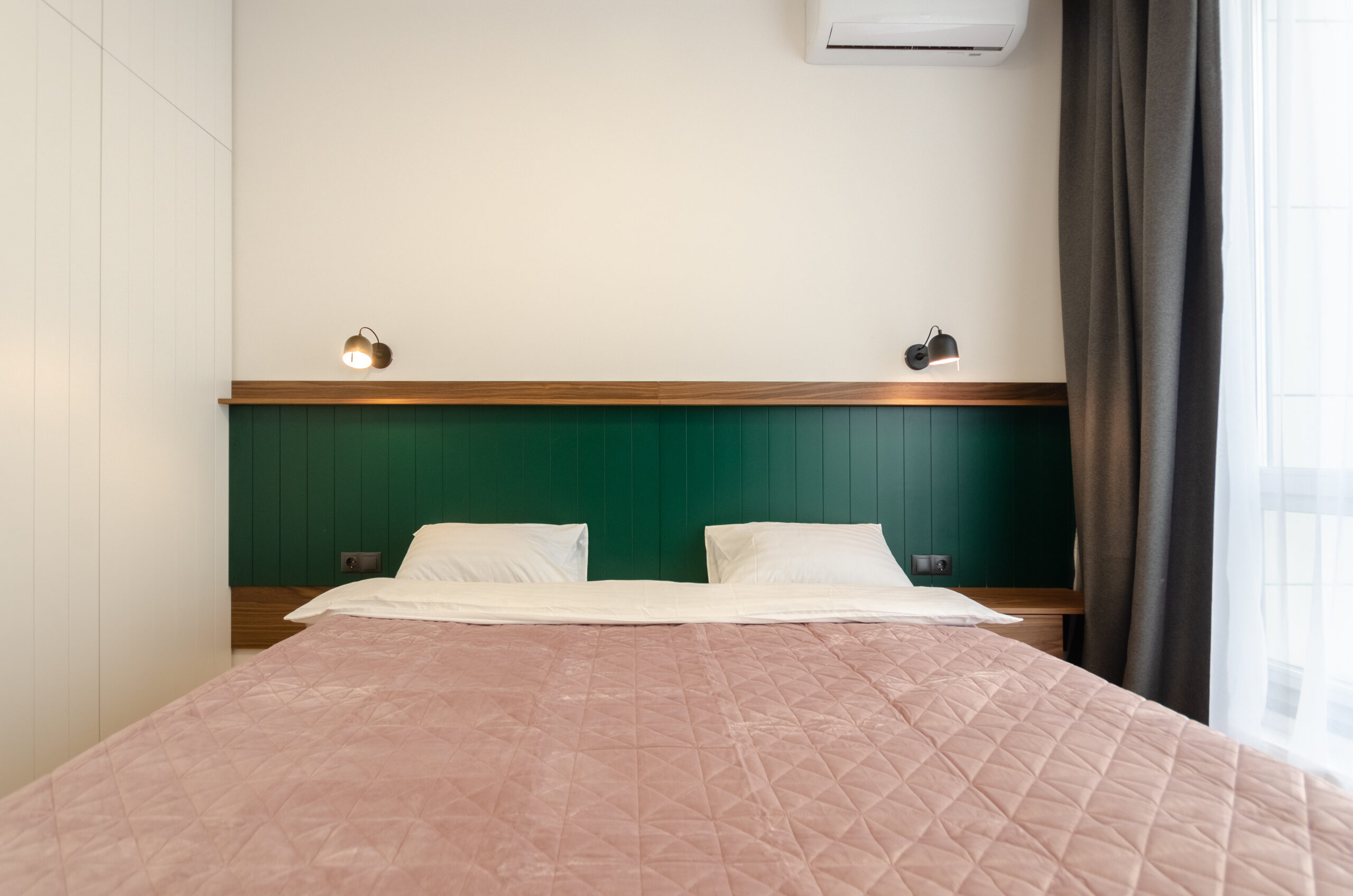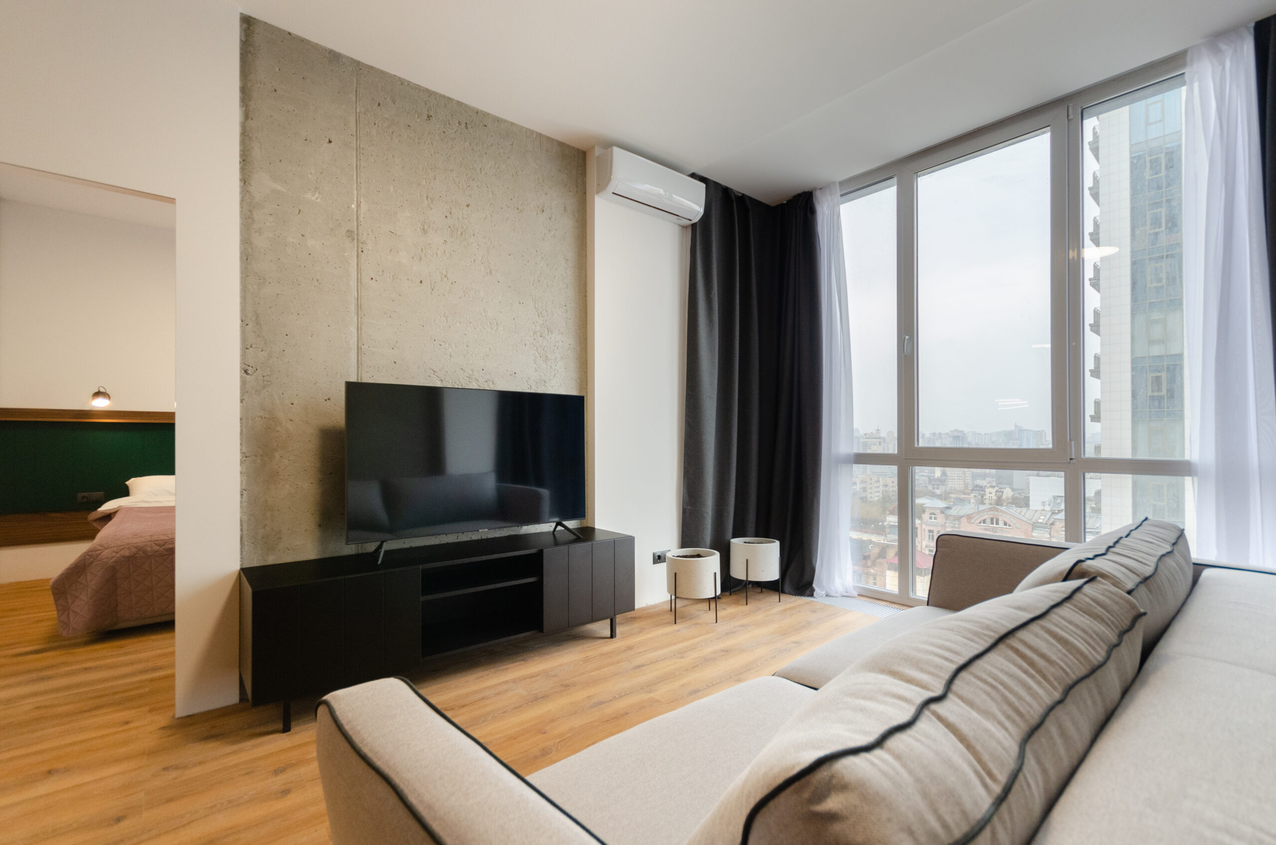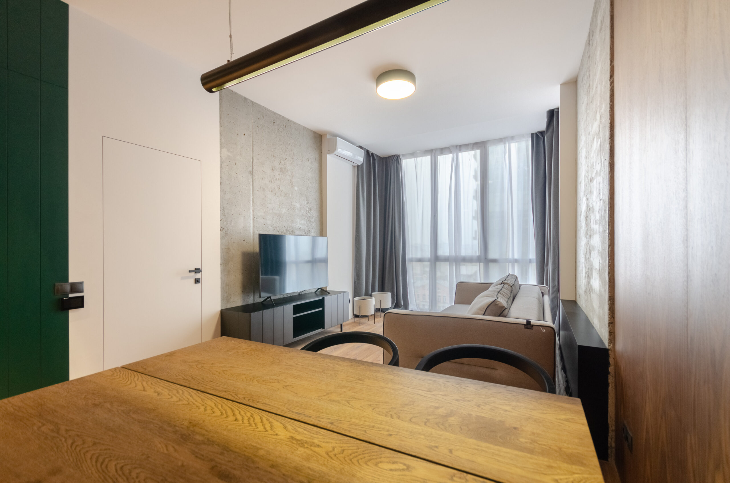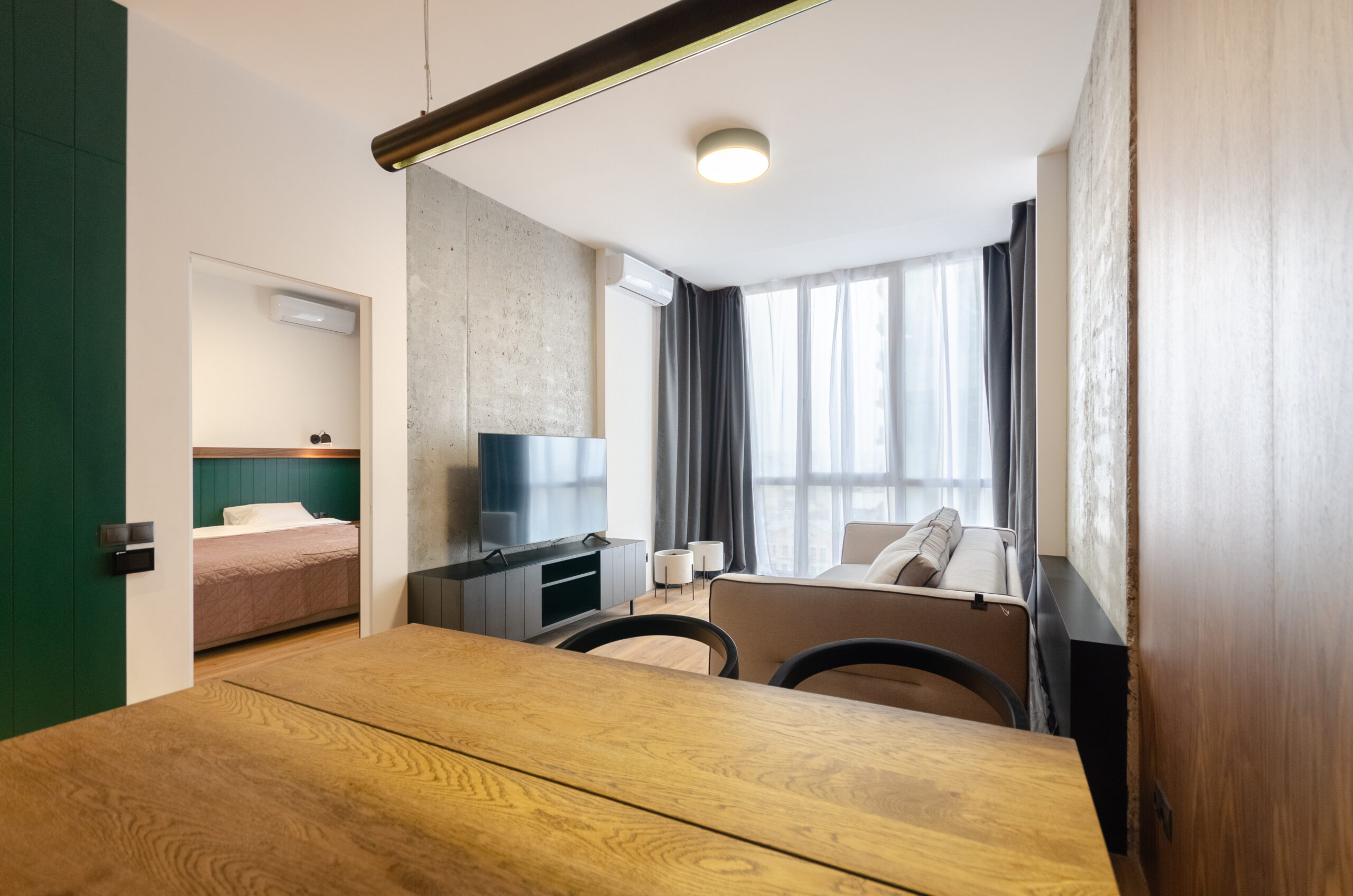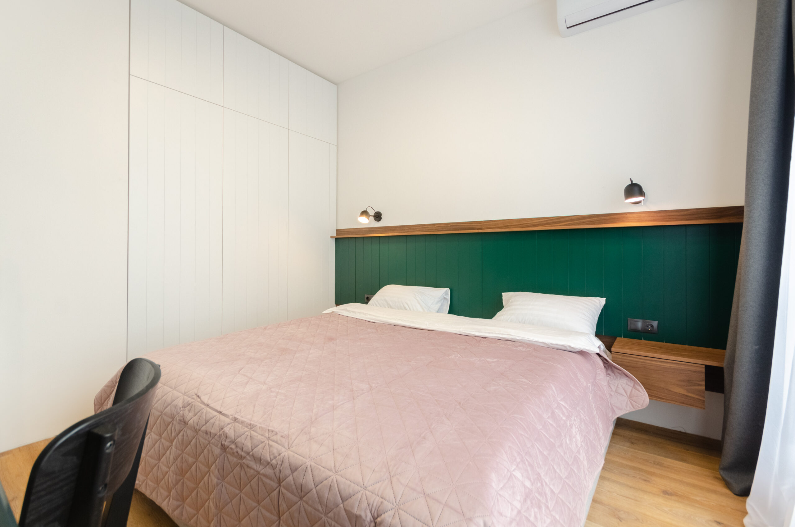 The apartment is located on the 10th floor, has an area of 55 m2, has a separate bedroom, a living room-kitchen with a panoramic view of Kyiv and a bathroom.The apartment has bedding, all the necessary dishes, small household appliances – everything for a comfortable stay for any period.