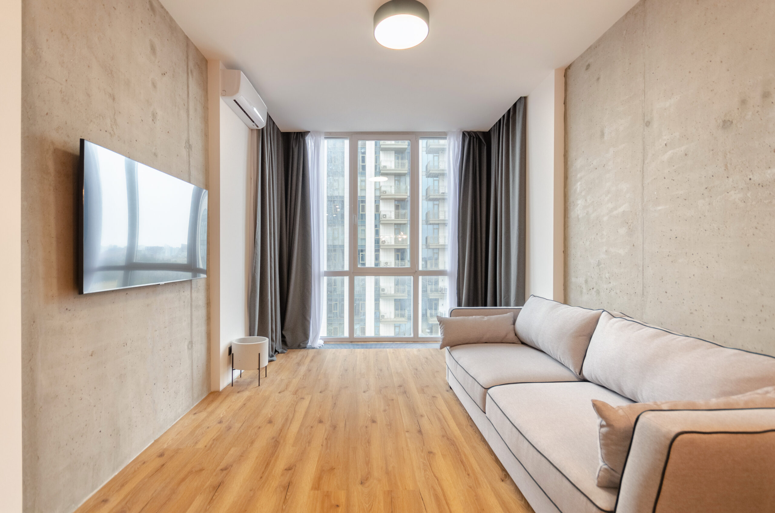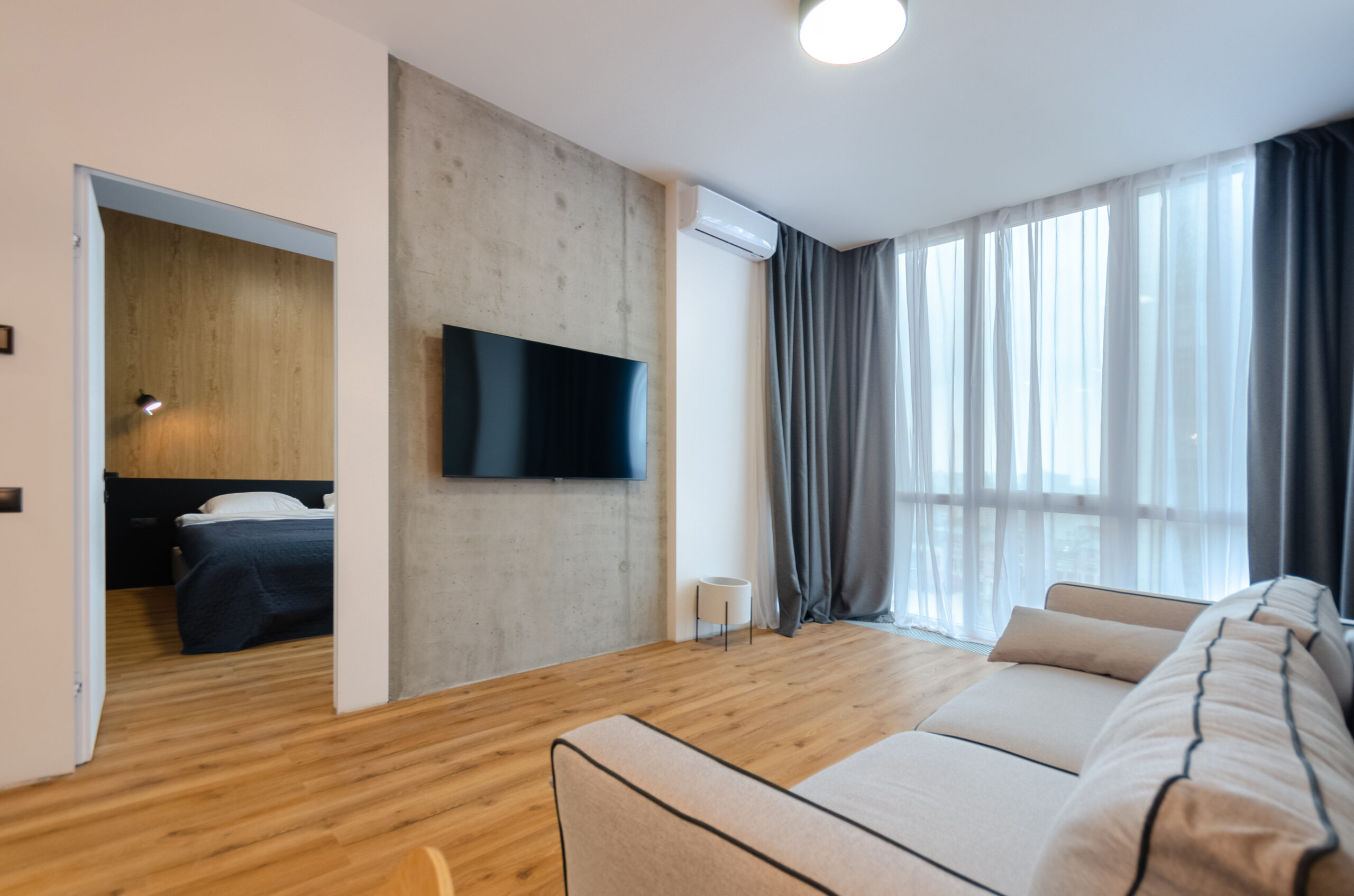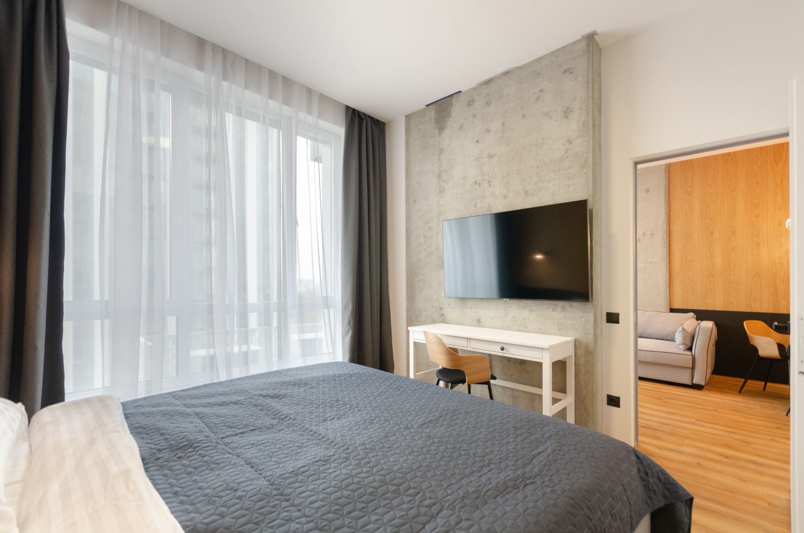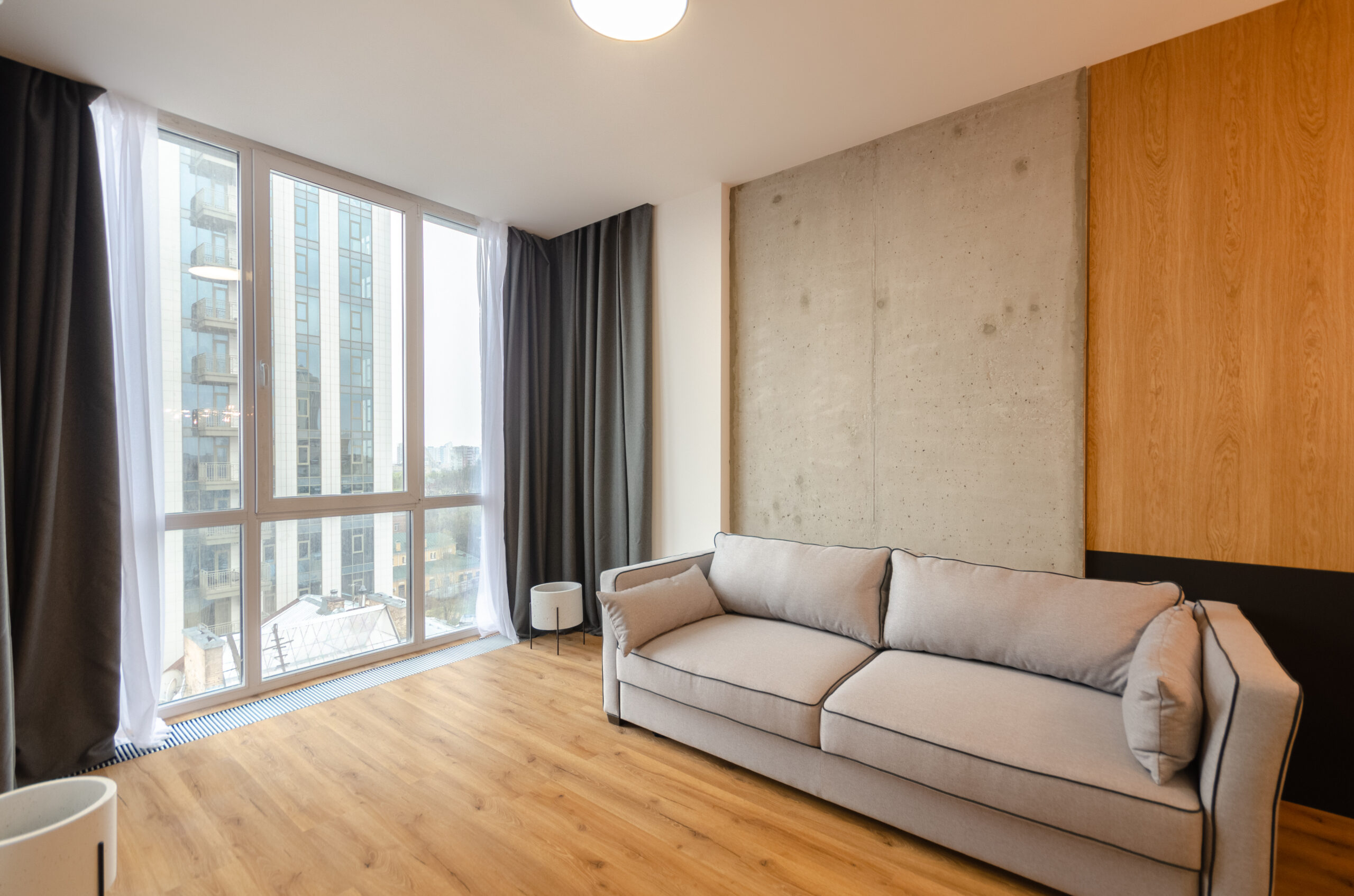 The apartment is located on the 9th floor, has an area of 55 m2, has a separate bedroom, a living room-kitchen with a panoramic view of Kyiv and a bathroom.